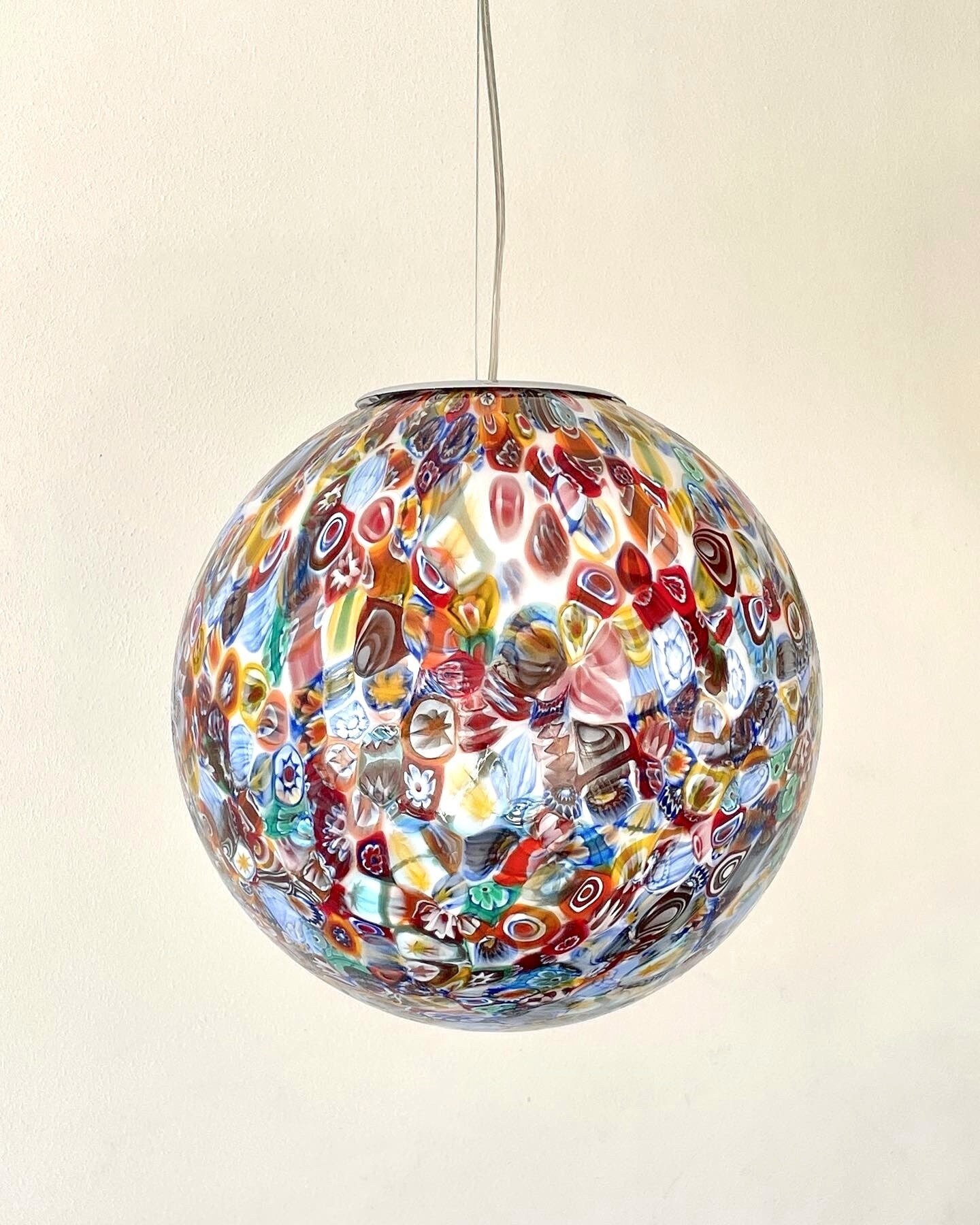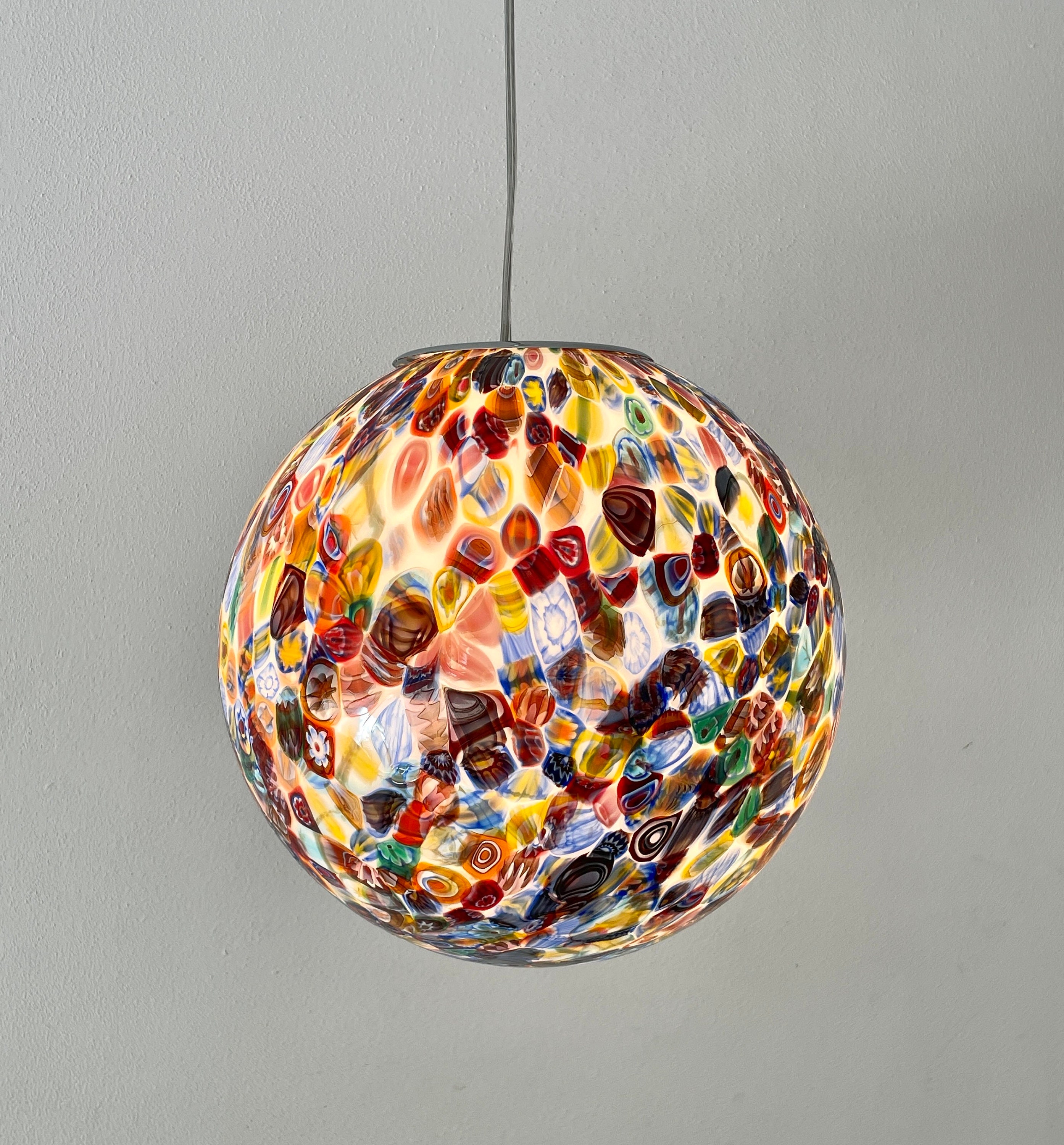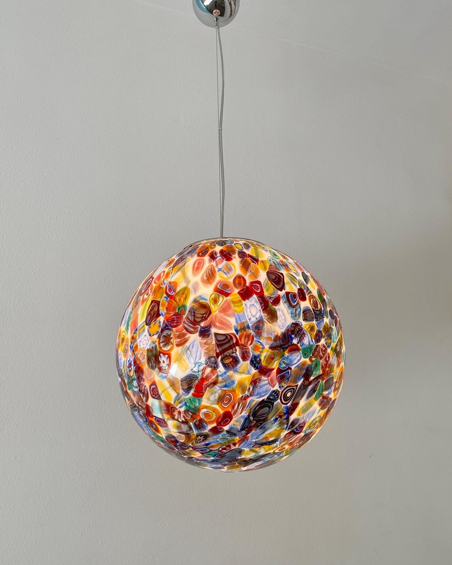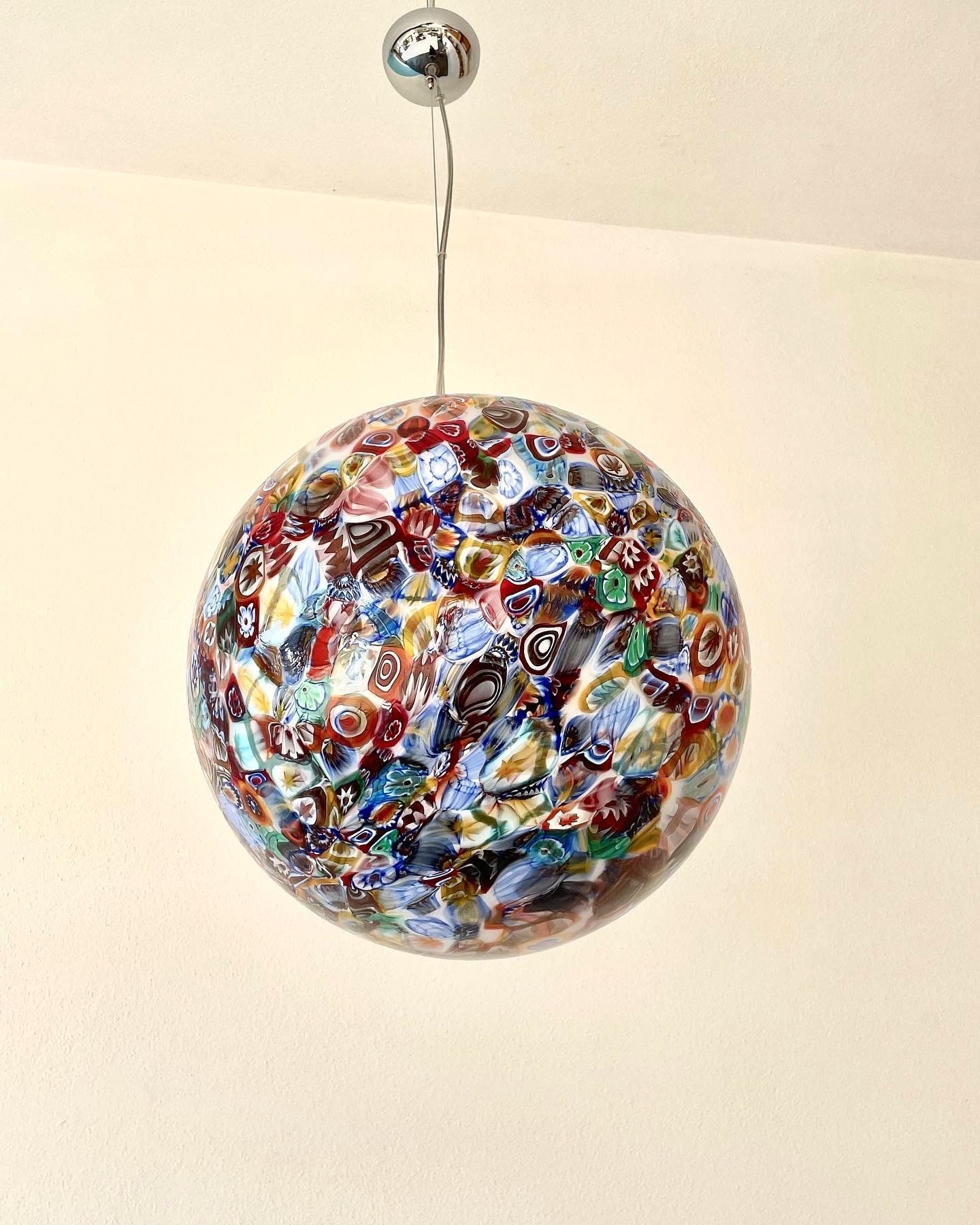 It is handmade with infinite glass tiles called "MURRINE", each single murrina has different patterns and colors, these are expertly fused, by the master glassmaker, on a mass of milk glass, then, through blowing, it will take the spherical shape of this stunning large chandelier.