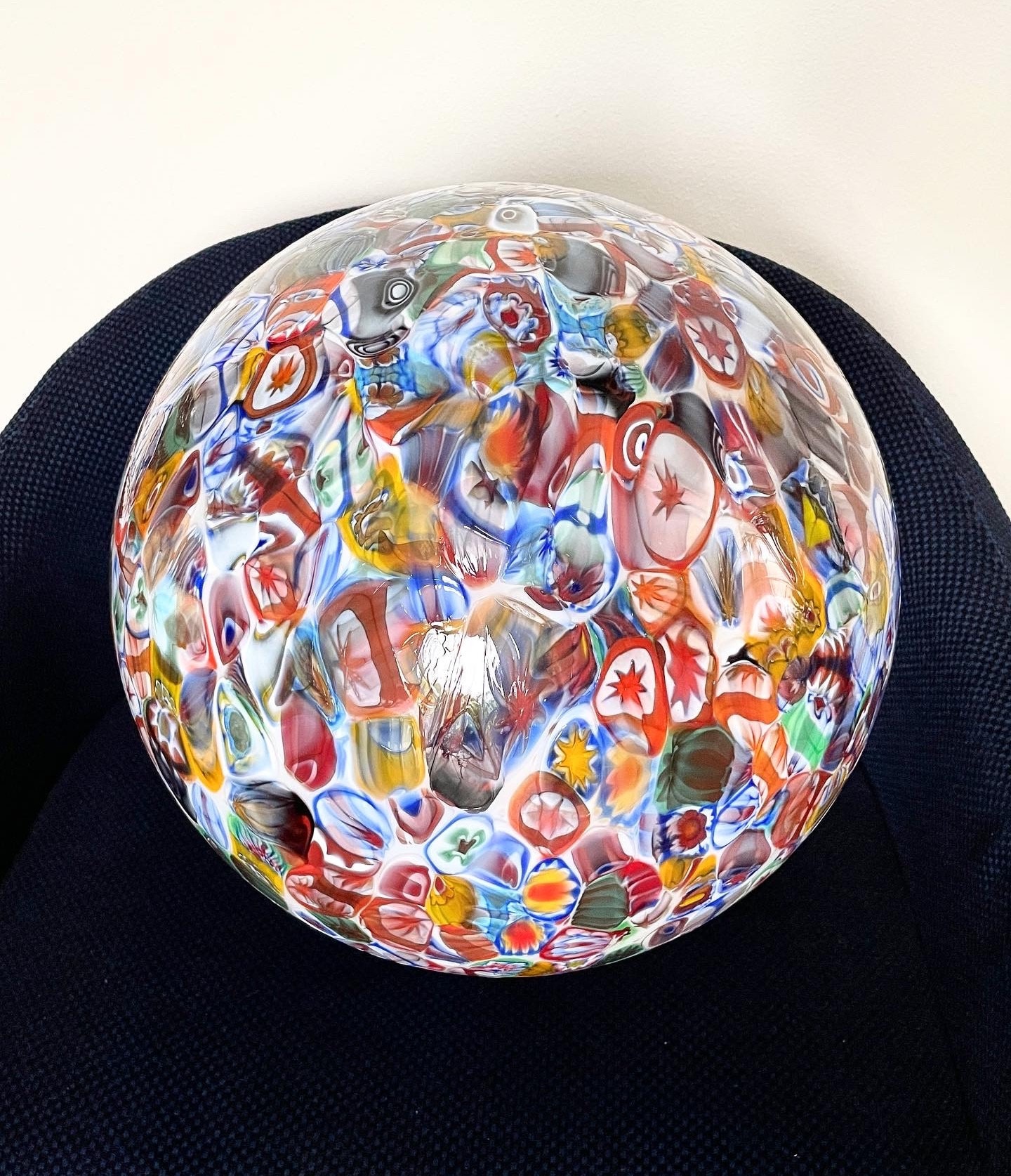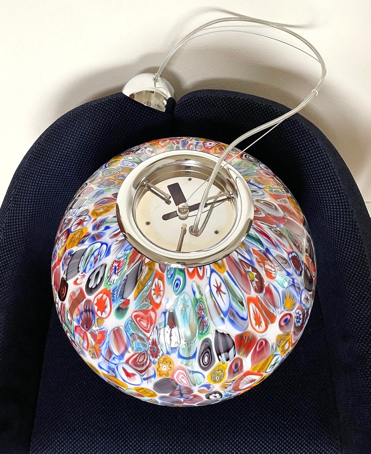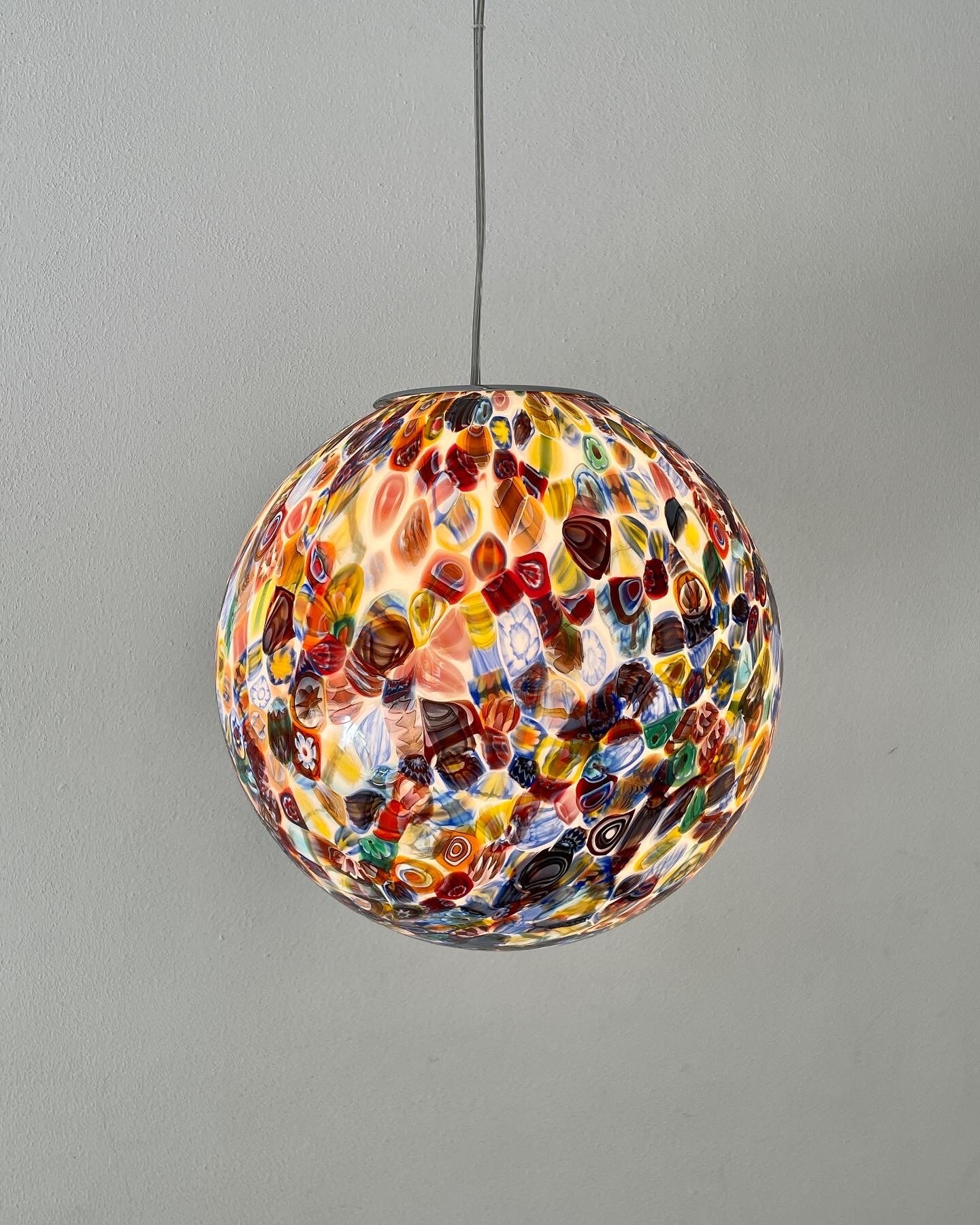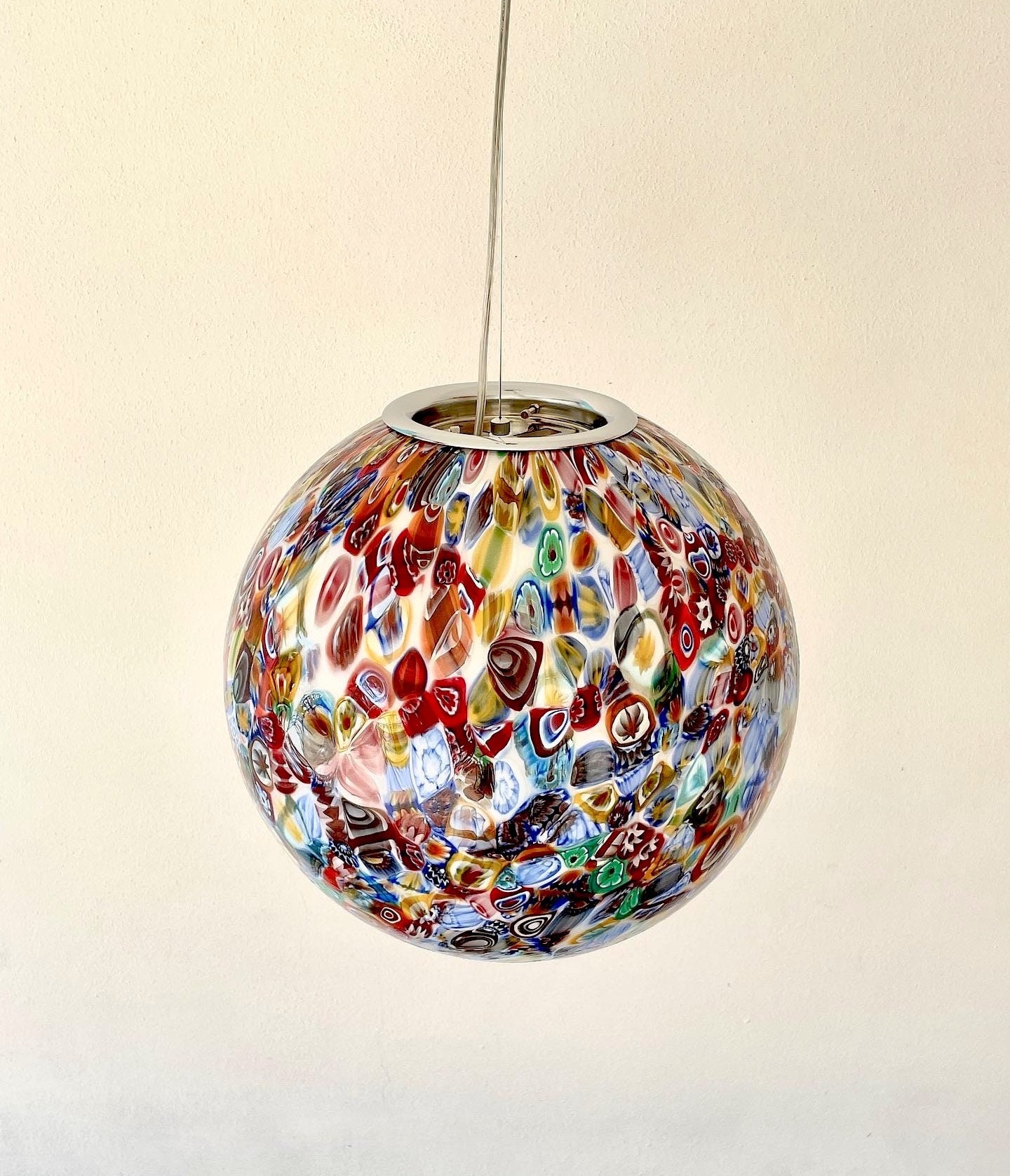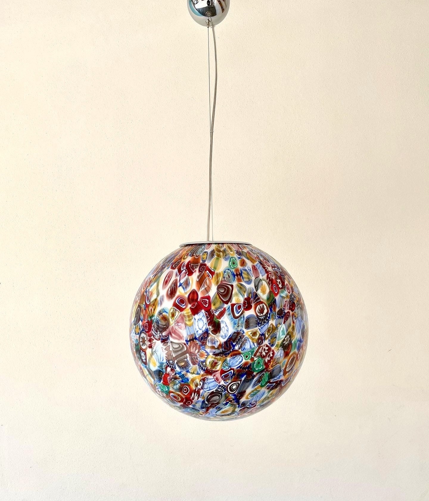 It is handmade with infinite glass tiles called "MURRINE", each single murrina has different patterns and colors, these are expertly fused, by the master glassmaker, on a mass of milk glass, then, through blowing, it will take the spherical shape of this stunning large chandelier.