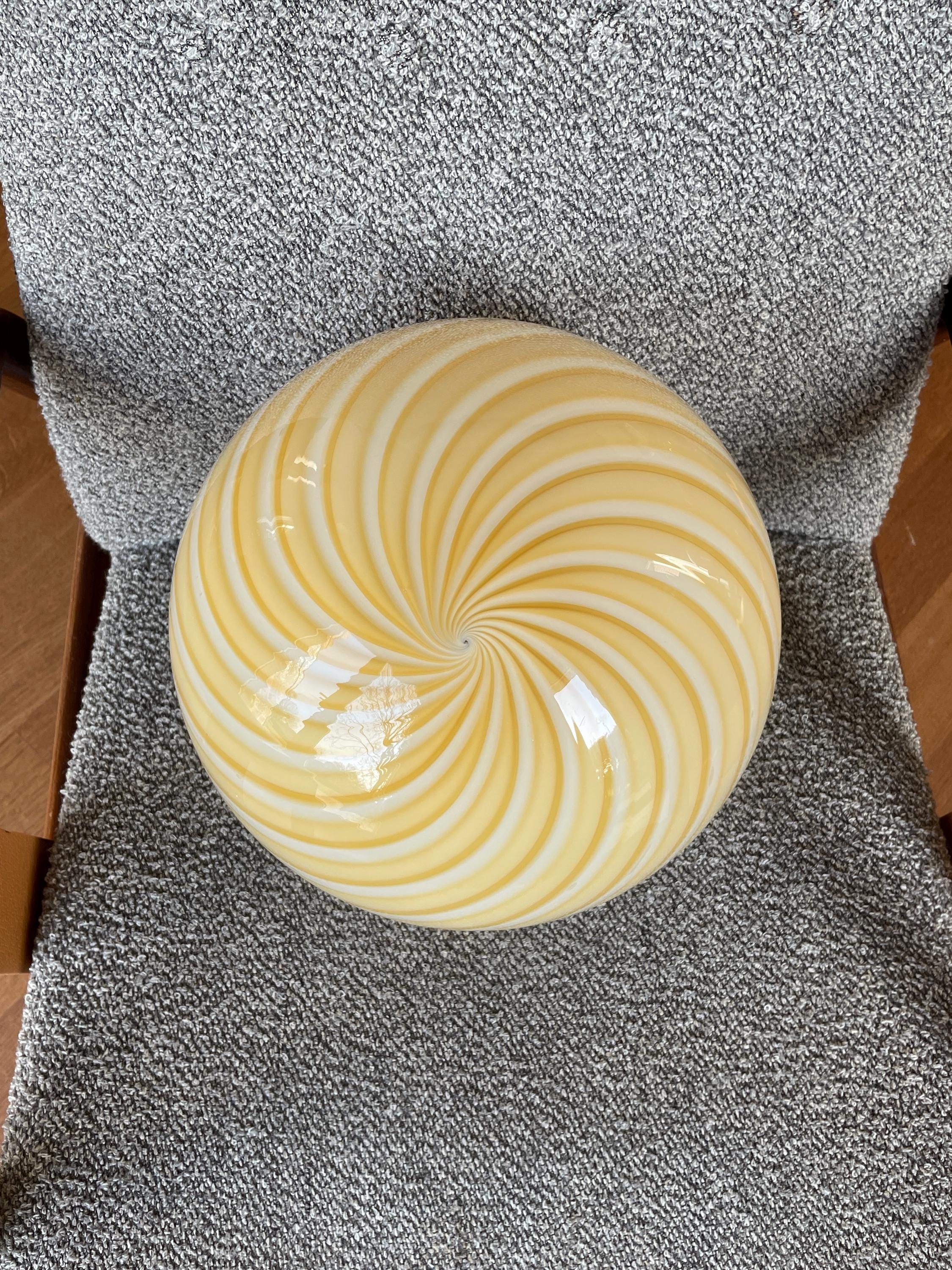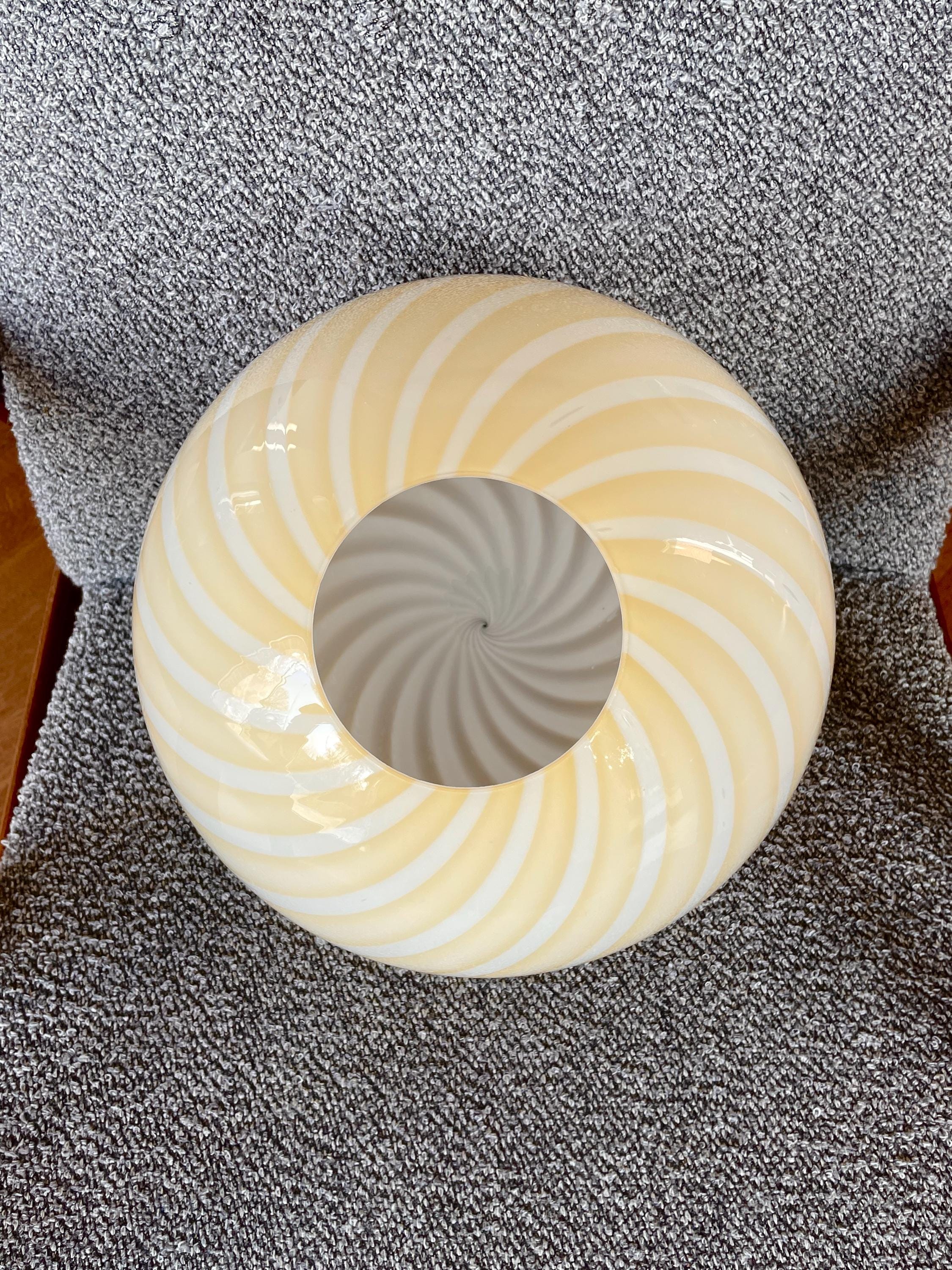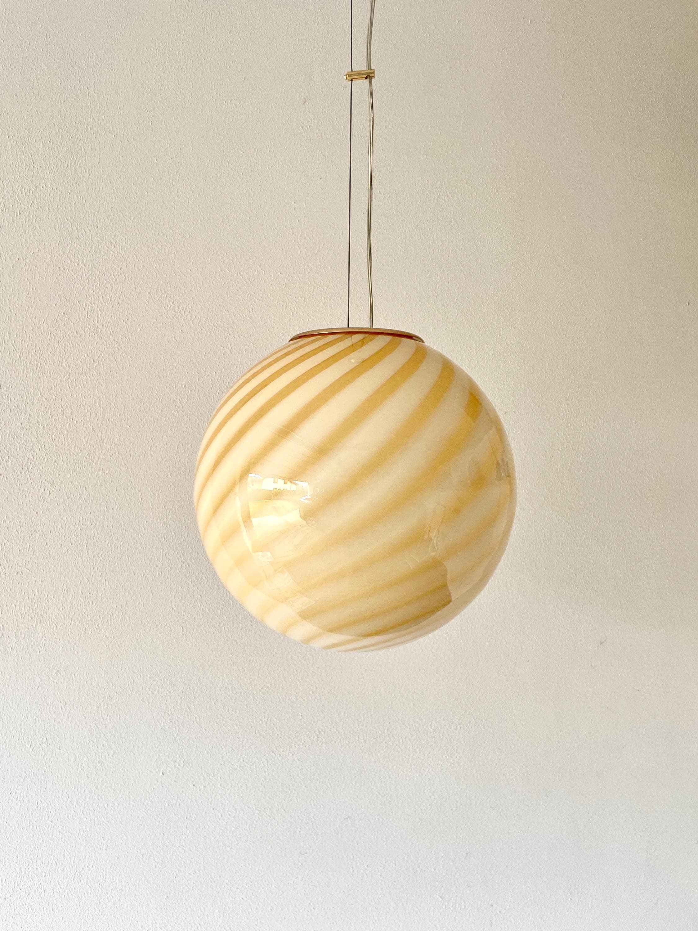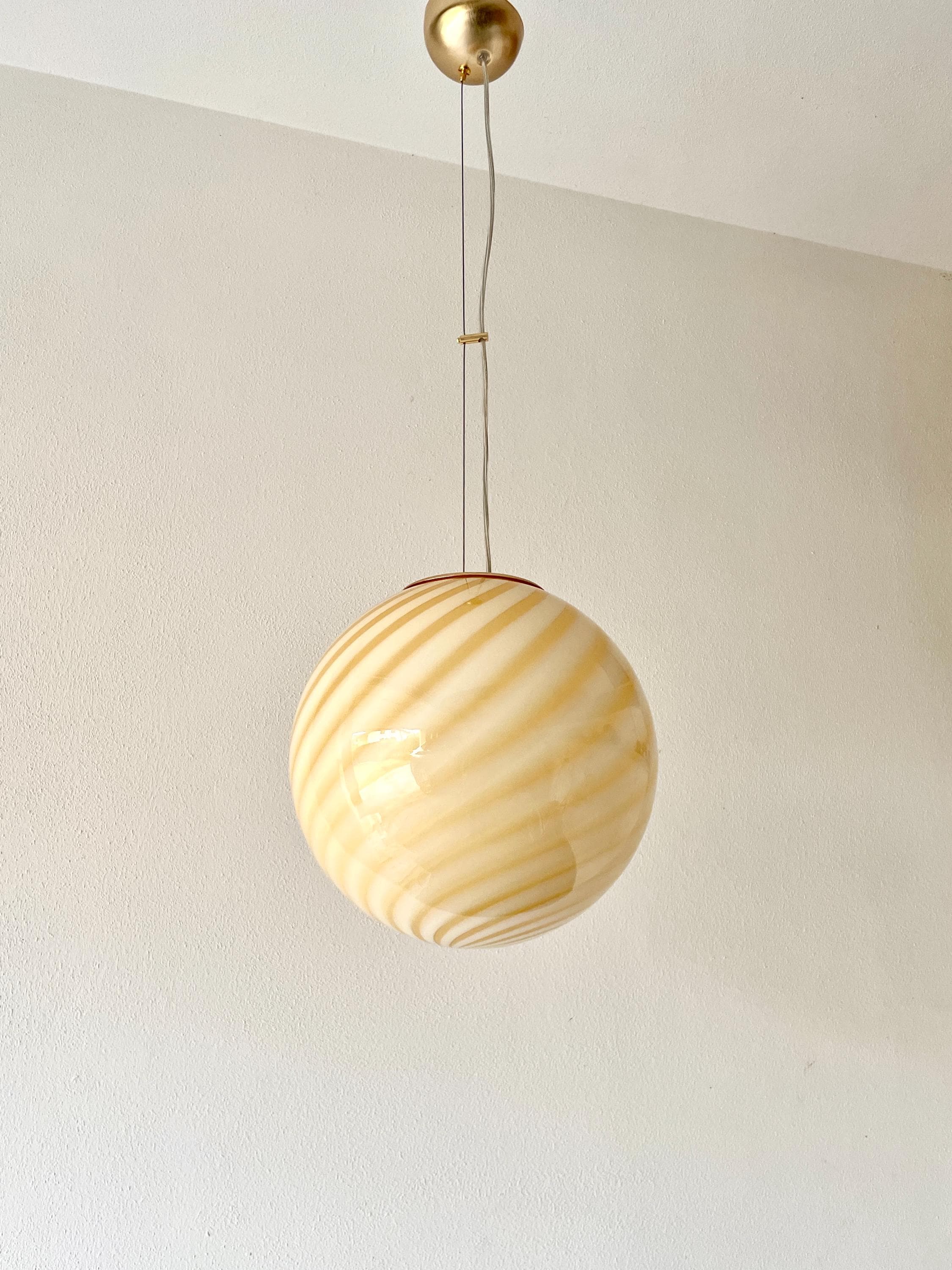 Splendid chandelier in mouth-blown Murano glass, made using the ancient Murano technique of twisted "rigadin" (spiral). The beautiful cased glass is amber-colored on the outside and white on the inside. The frame has a satin gold finish.