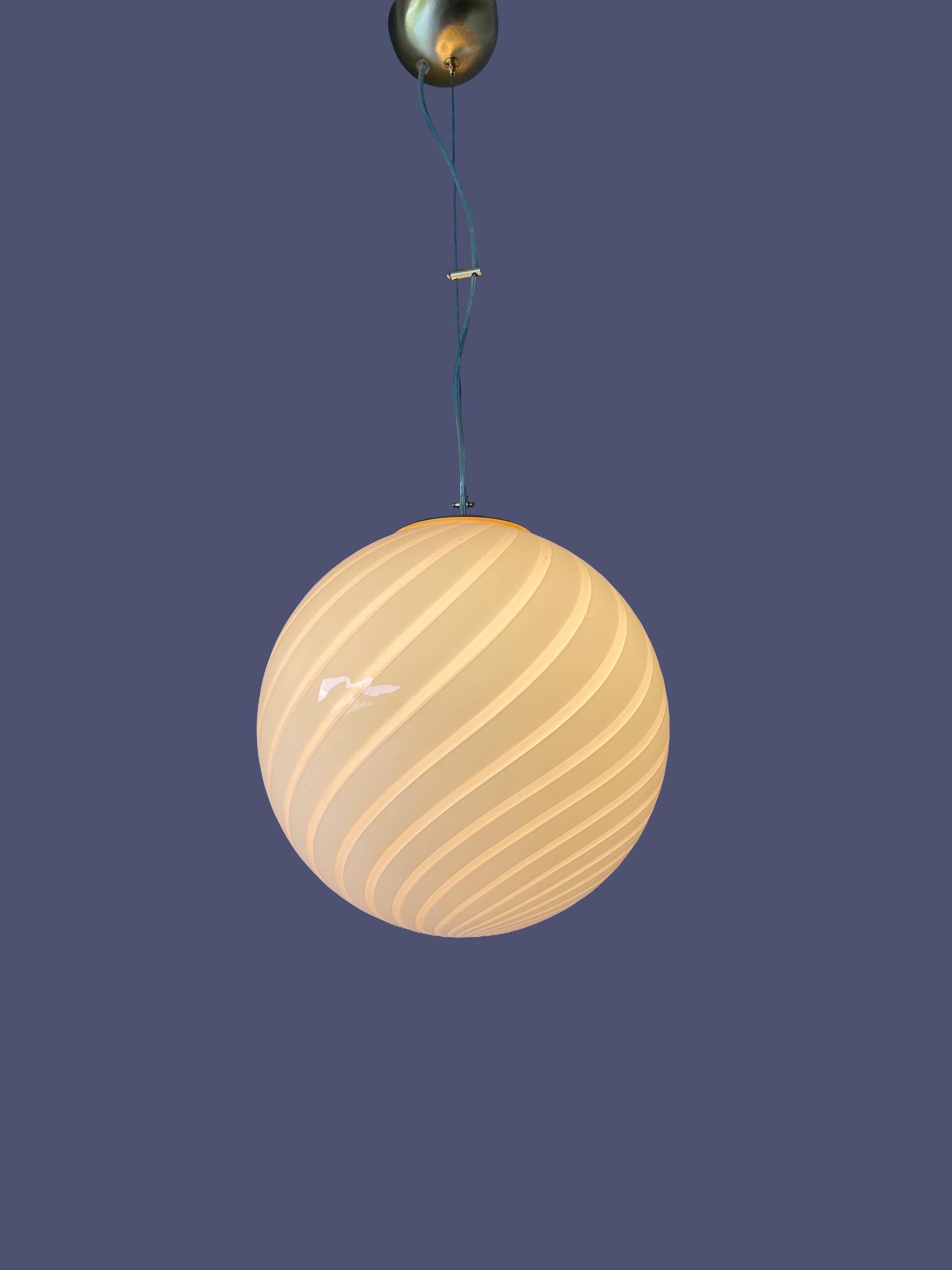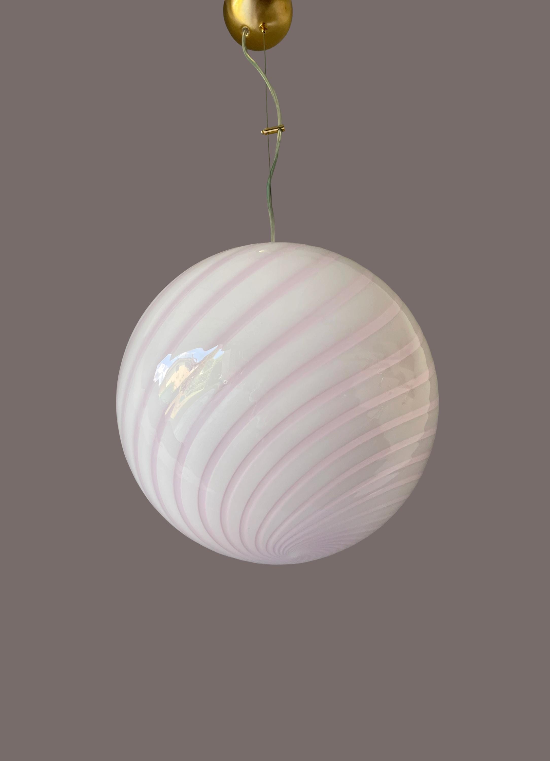 Splendid Murano glass chandelier, mouth-blown using the ancient Murano technique of twisted "rigadin". The beautiful cased glass is pink and white on the inside, and the frame has a gold finish.