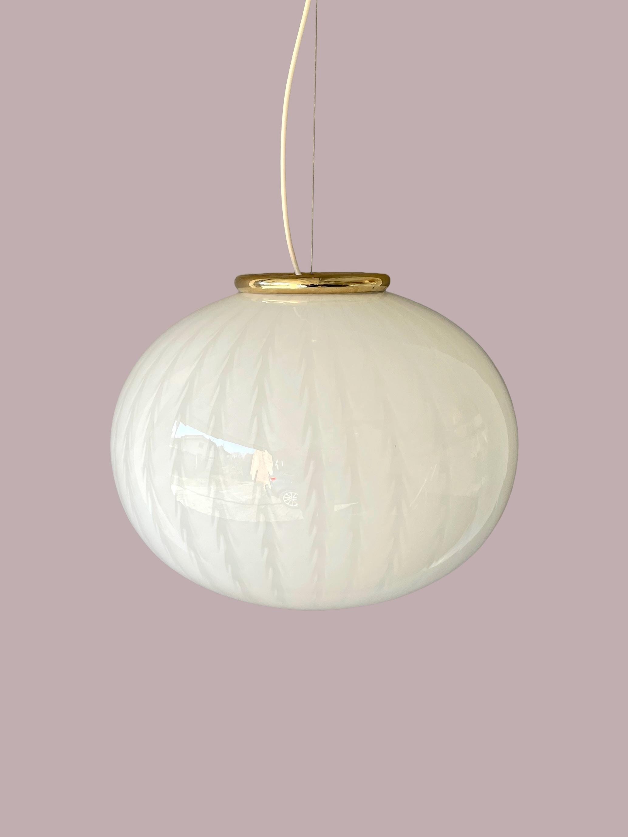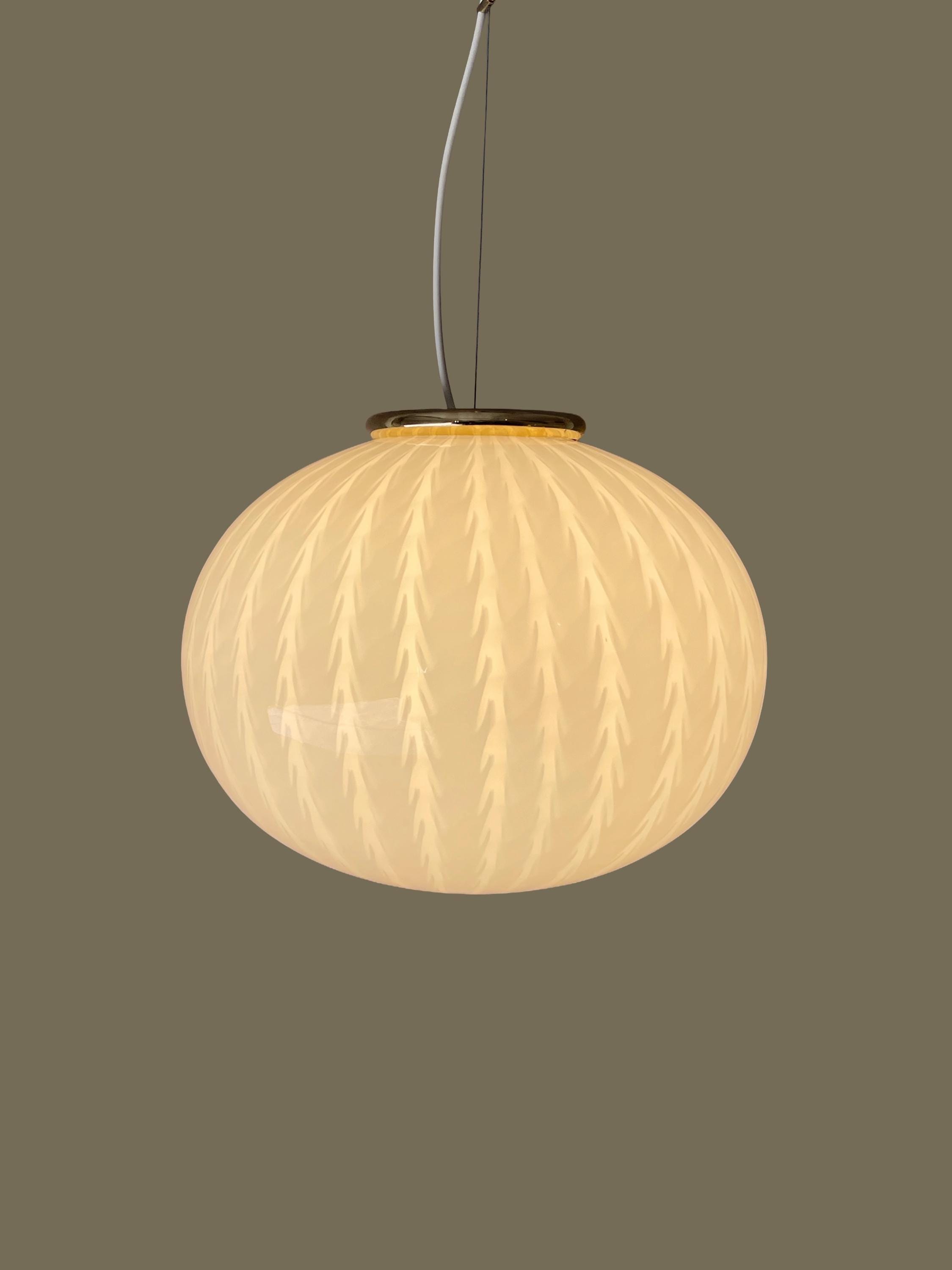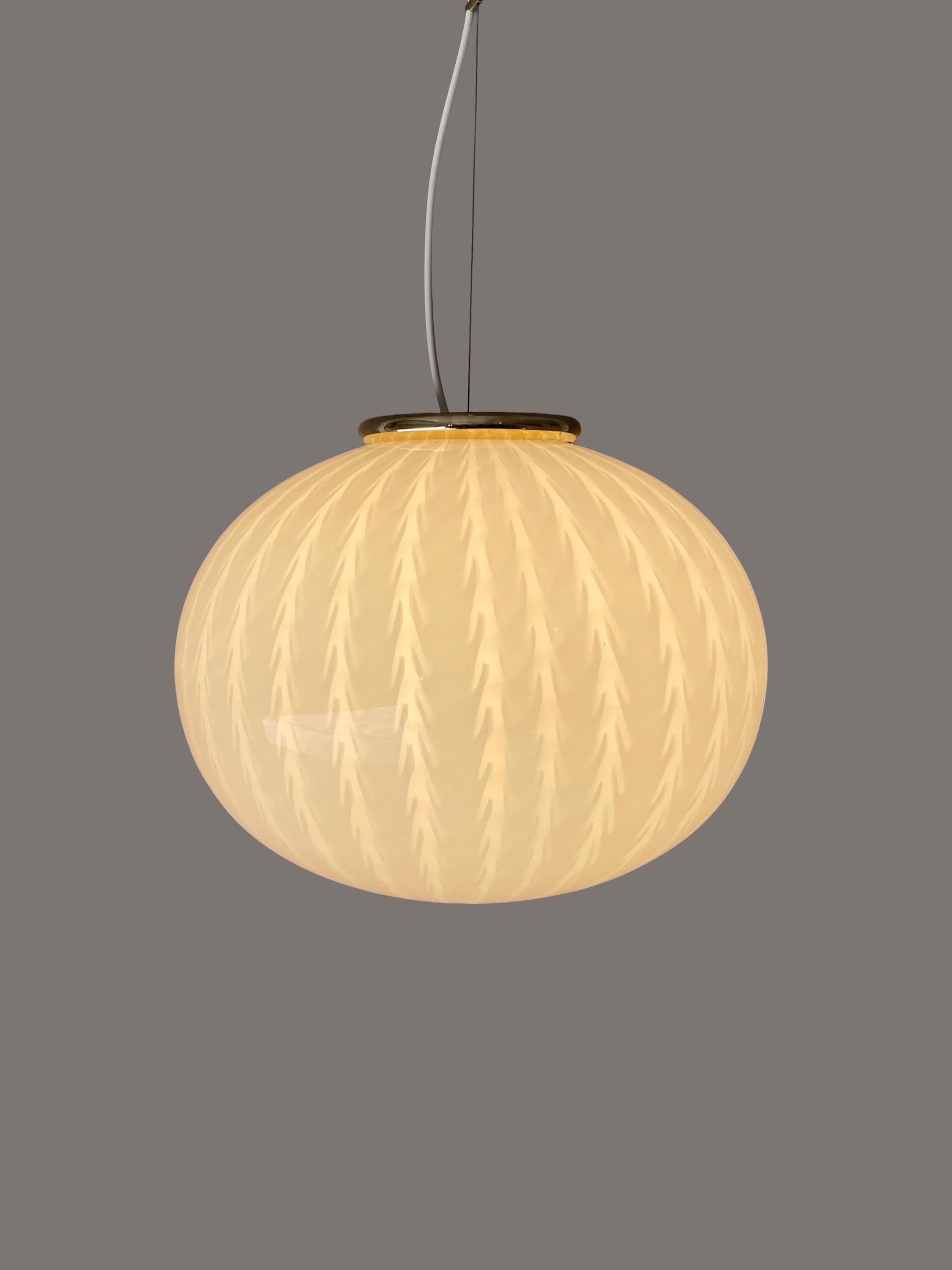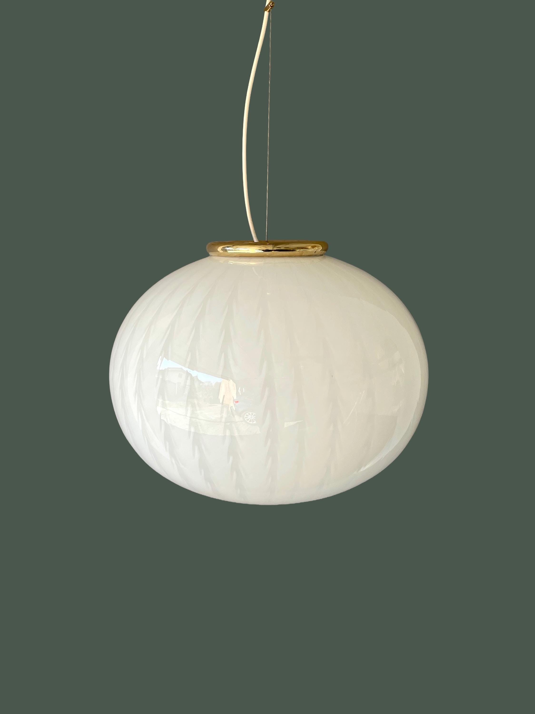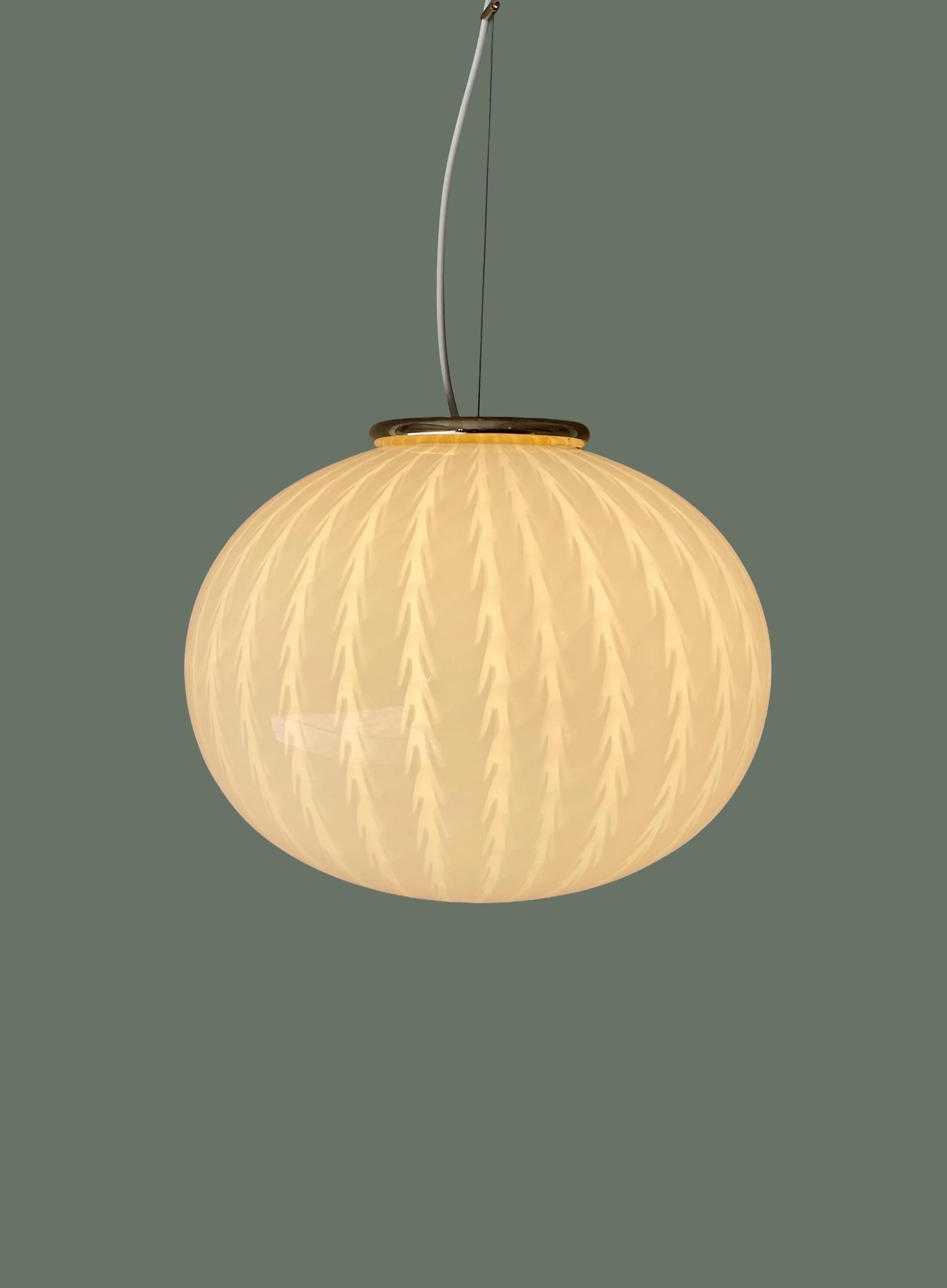 Stunning large MURANO CEILING LAMP, vintage from the 1970s, with beautiful white mouth-blown glass with spinato rigadin motif, the frame is in brass.