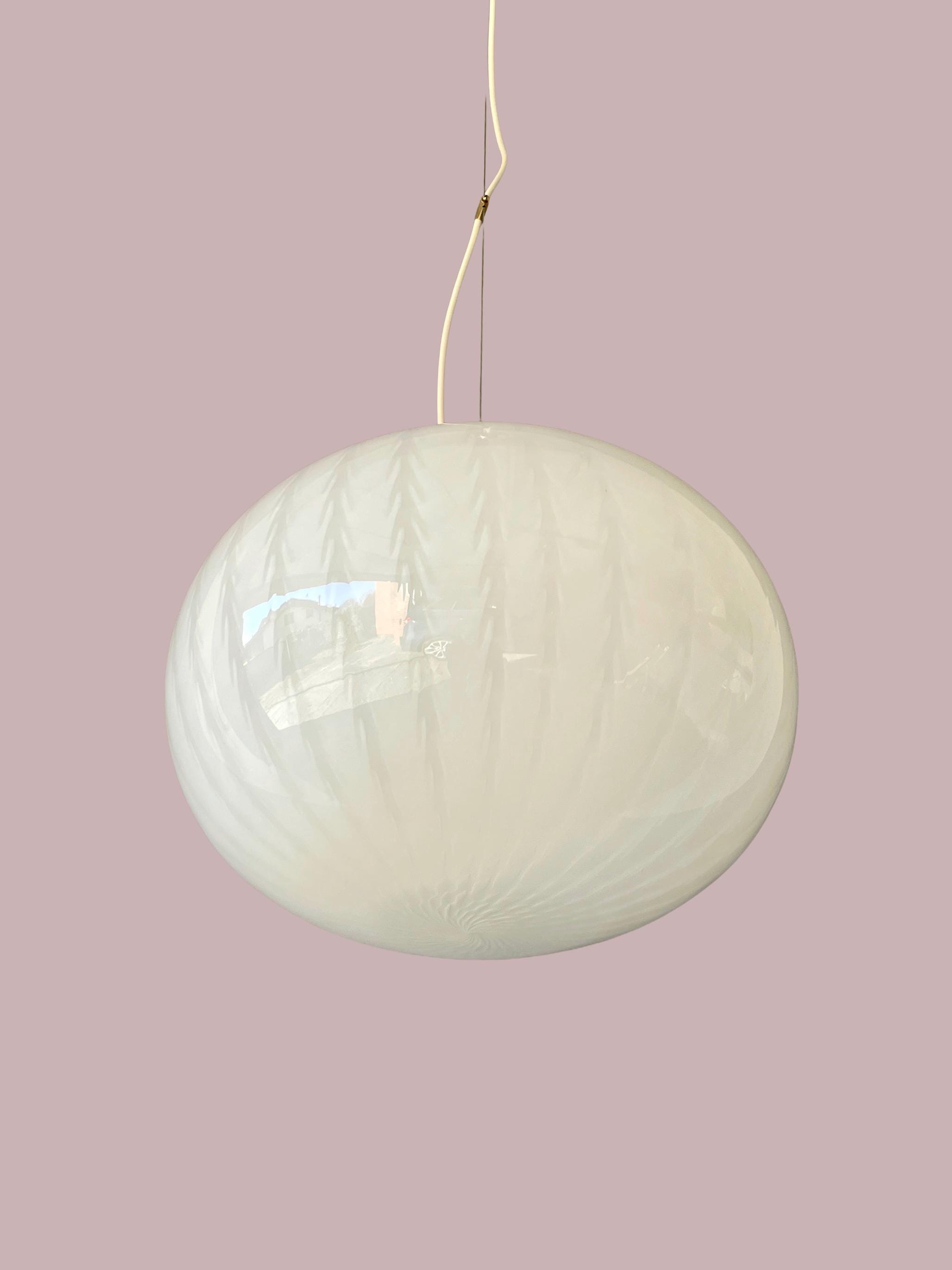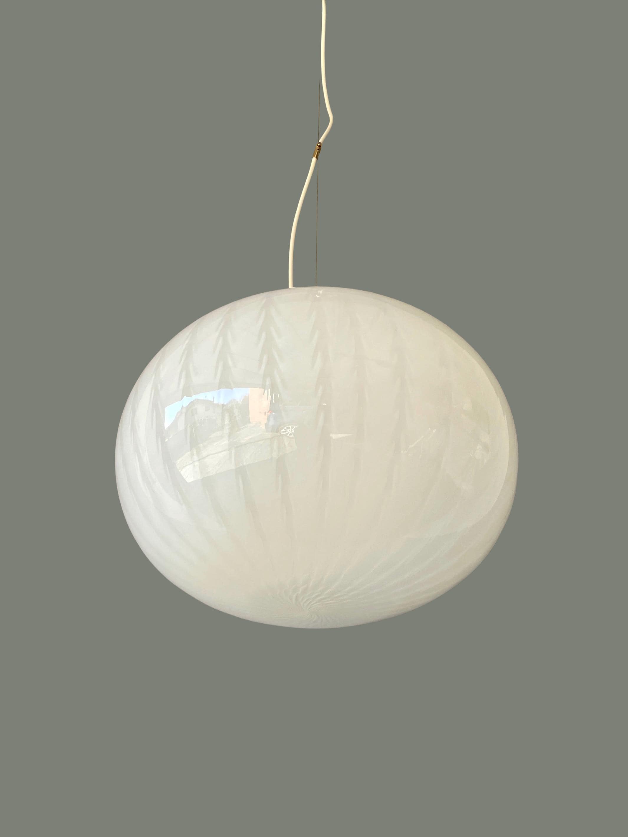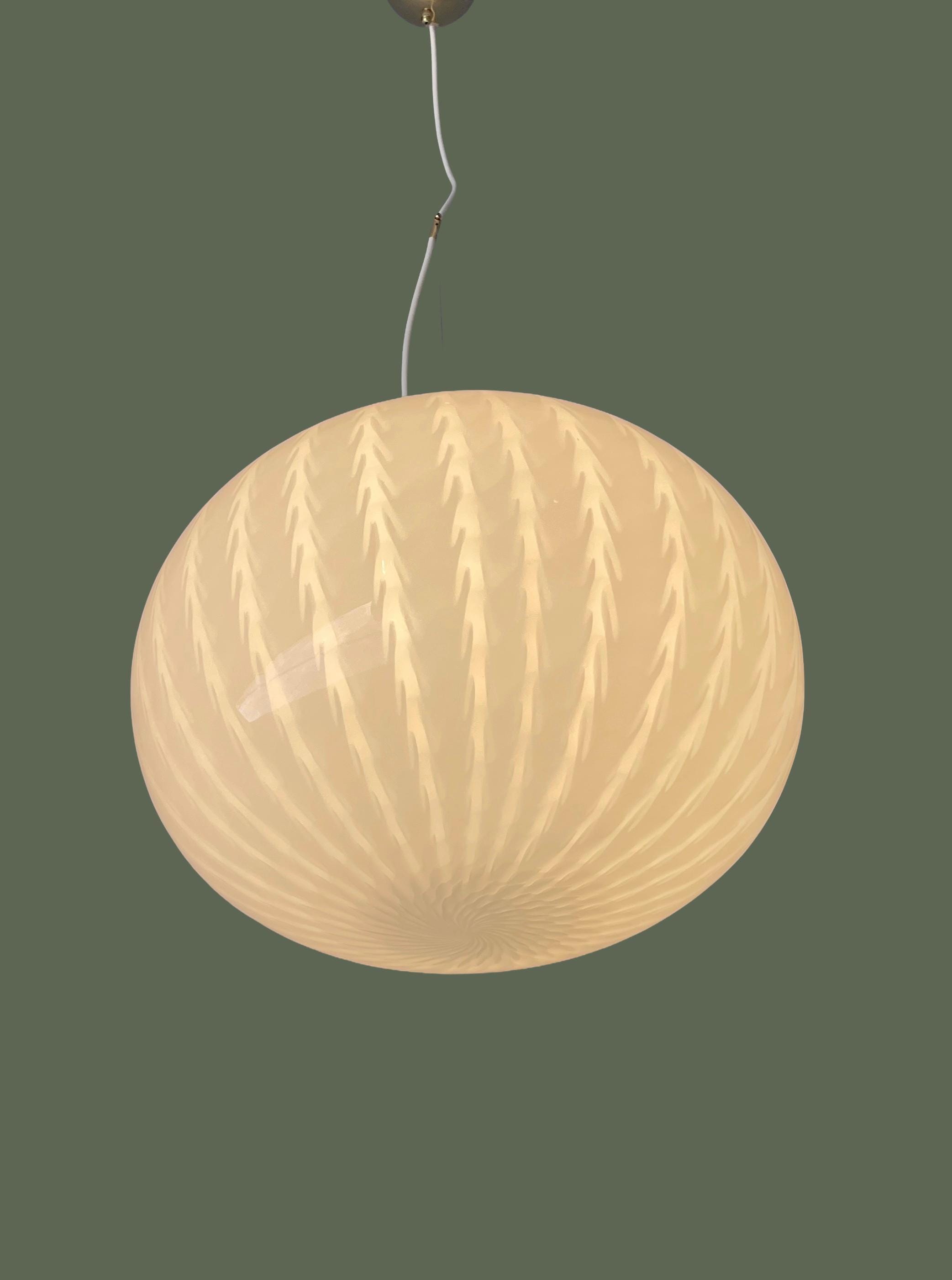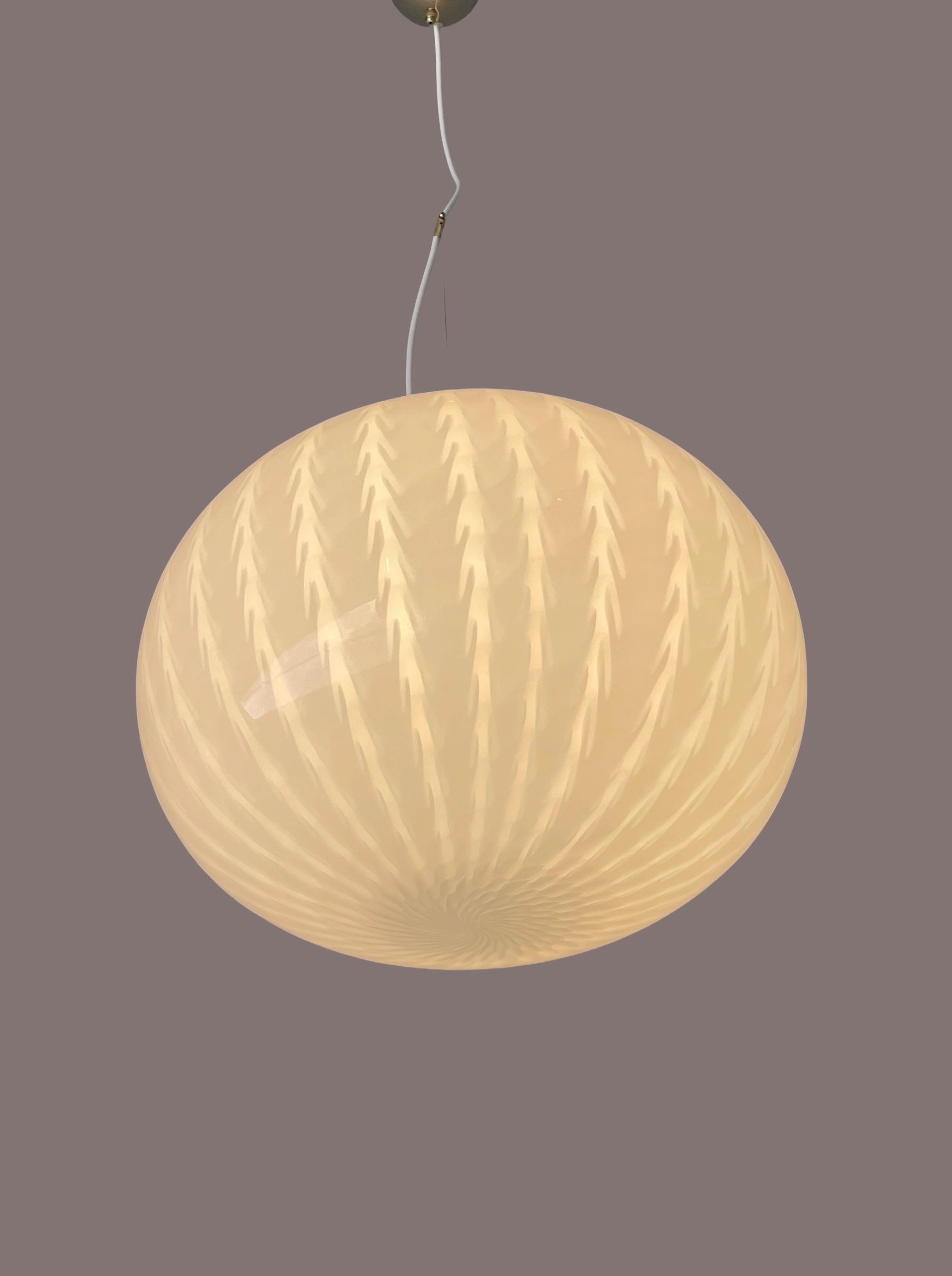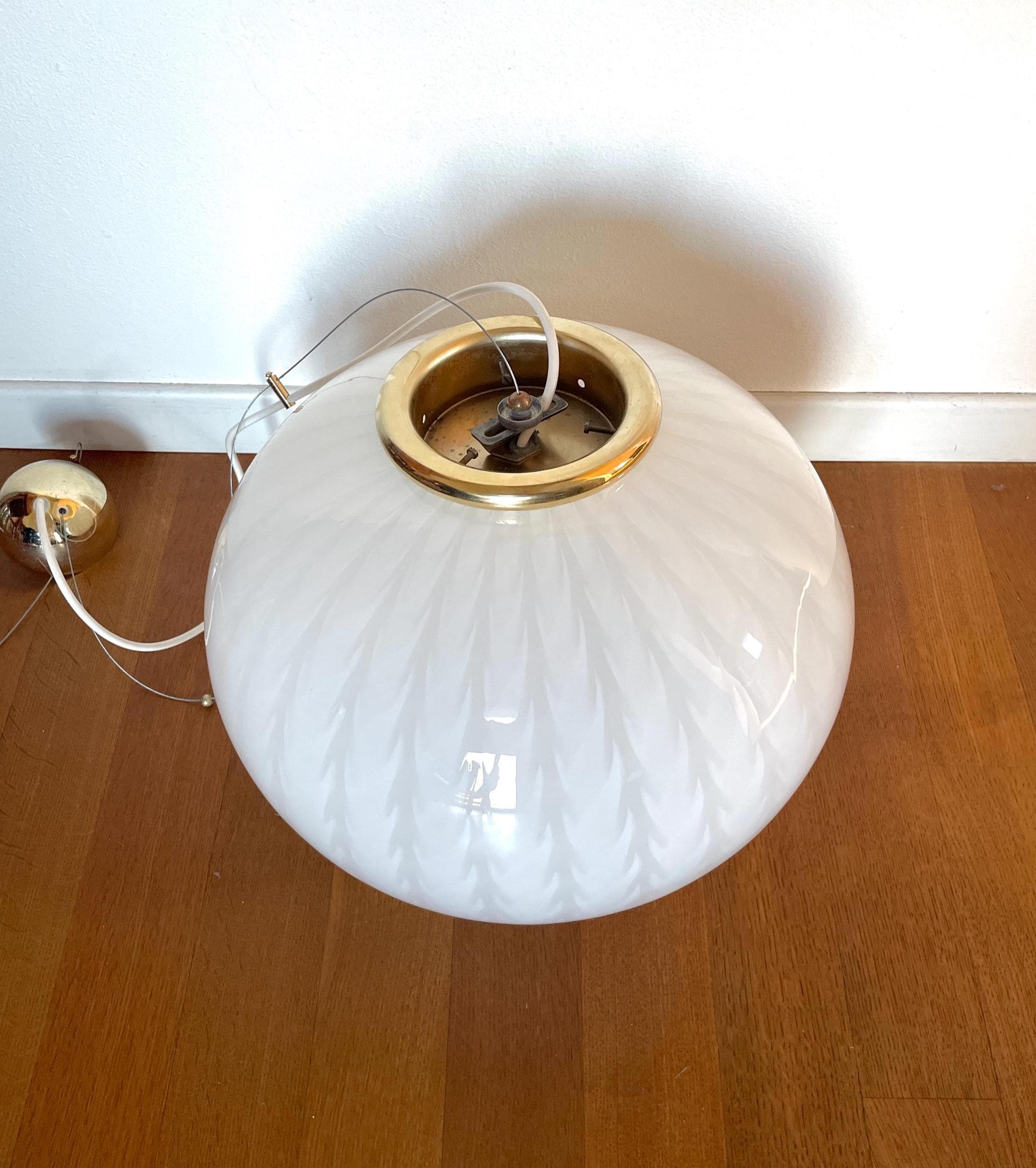 Stunning large MURANO CEILING LAMP, vintage from the 1970s, with beautiful white mouth-blown glass with spinato rigadin motif, the frame is in brass.