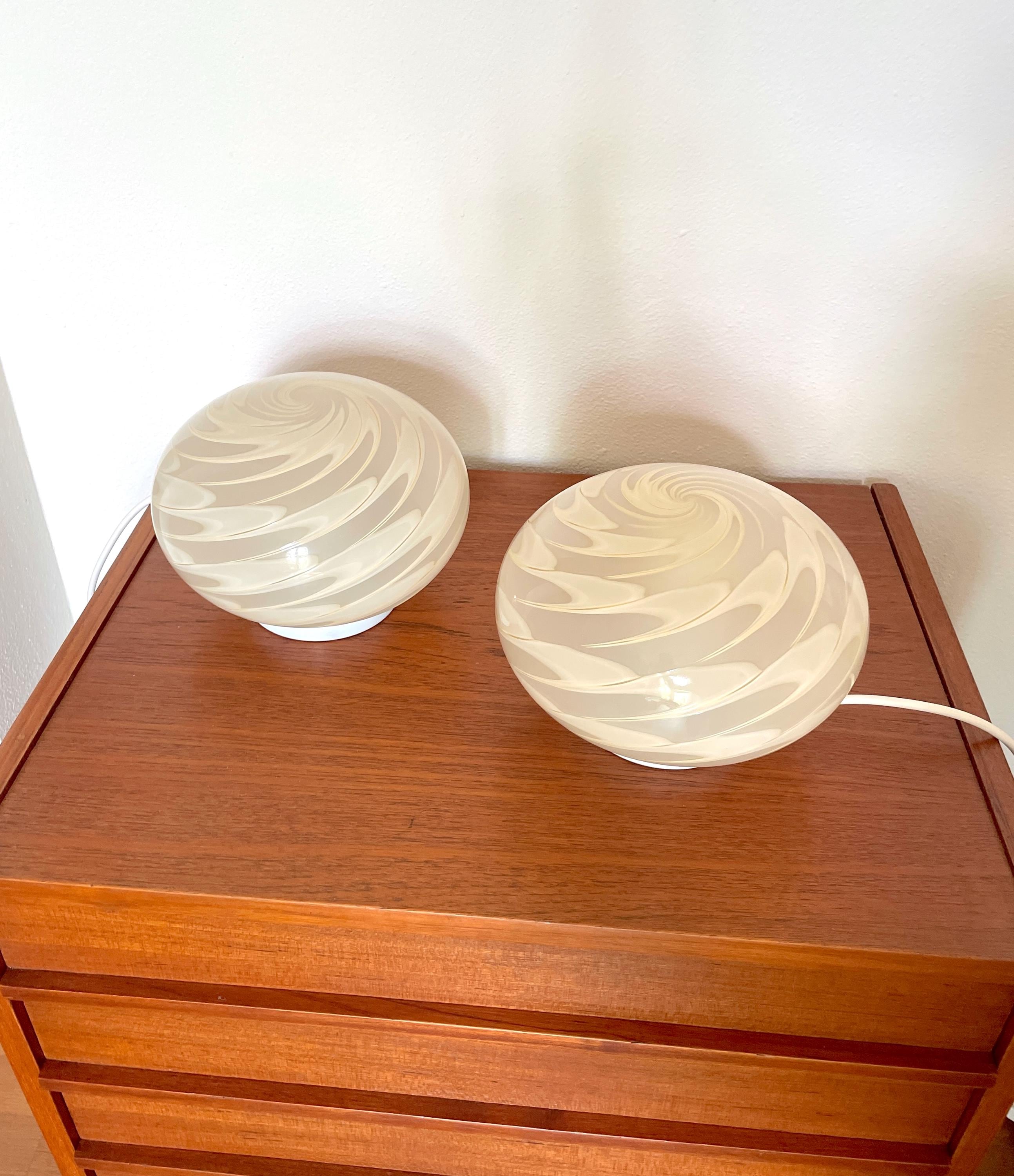 Lovely lamp handcrafted by Murano glass masters using the ancient glass-making technique PIUMA, a beautiful amber-colored glass with a spiral pattern. The frame has a white finish.