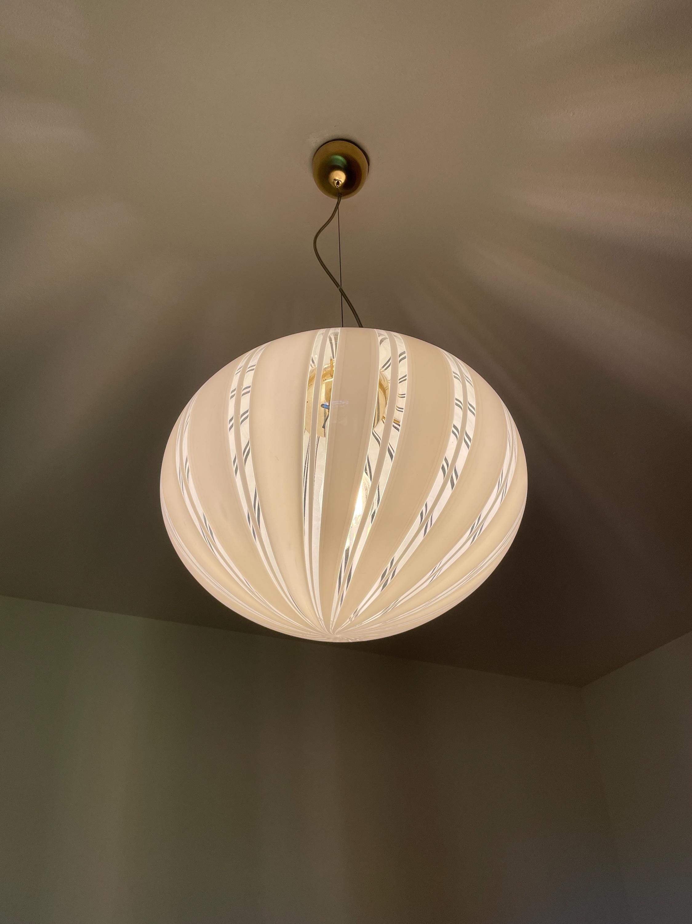 Gorgeous large Murano glass chandelier, vintage 1970s with mouth-blown glass and hand-crafted with vertical filigree motifs and white canes on a transparent background.