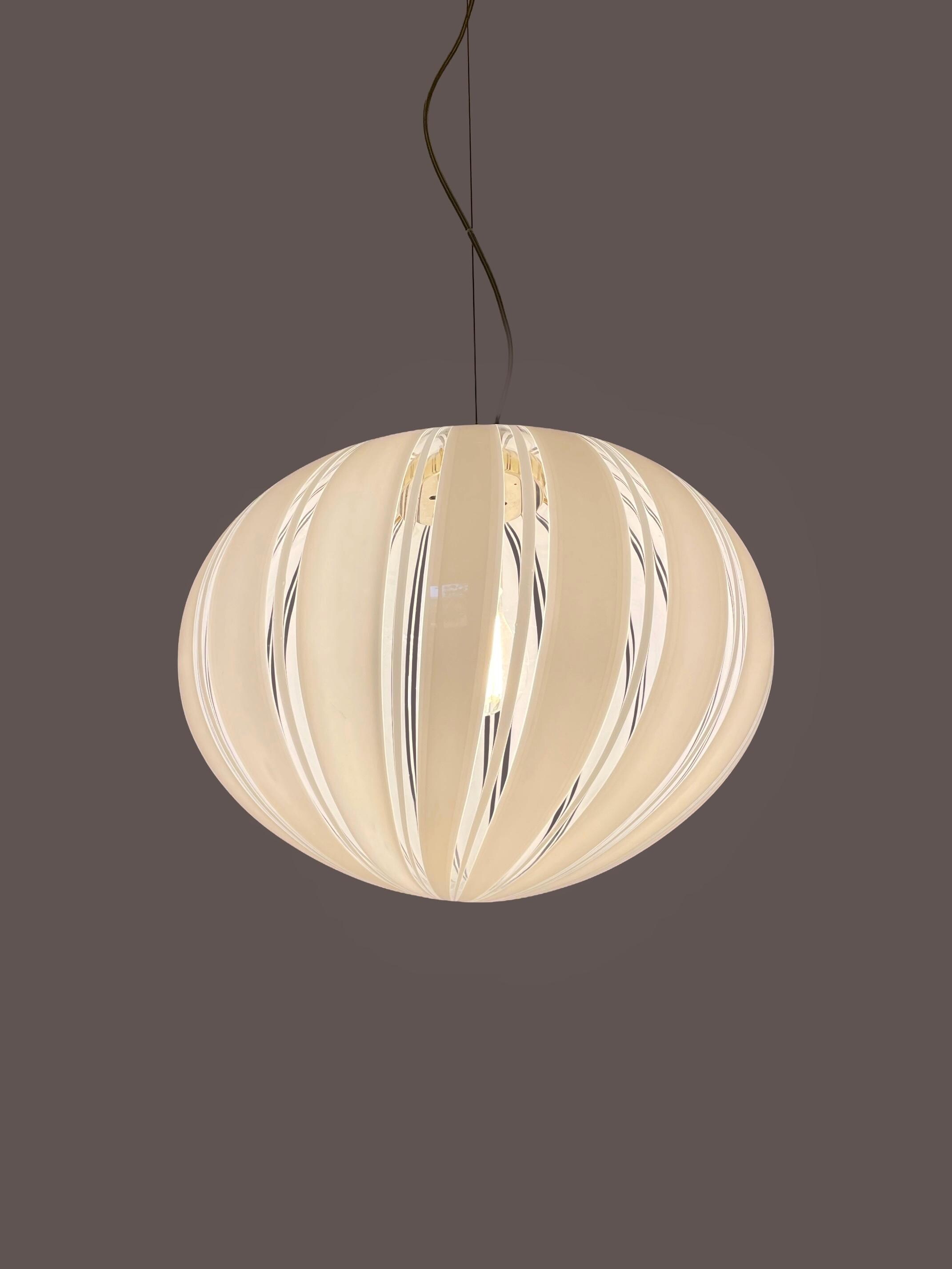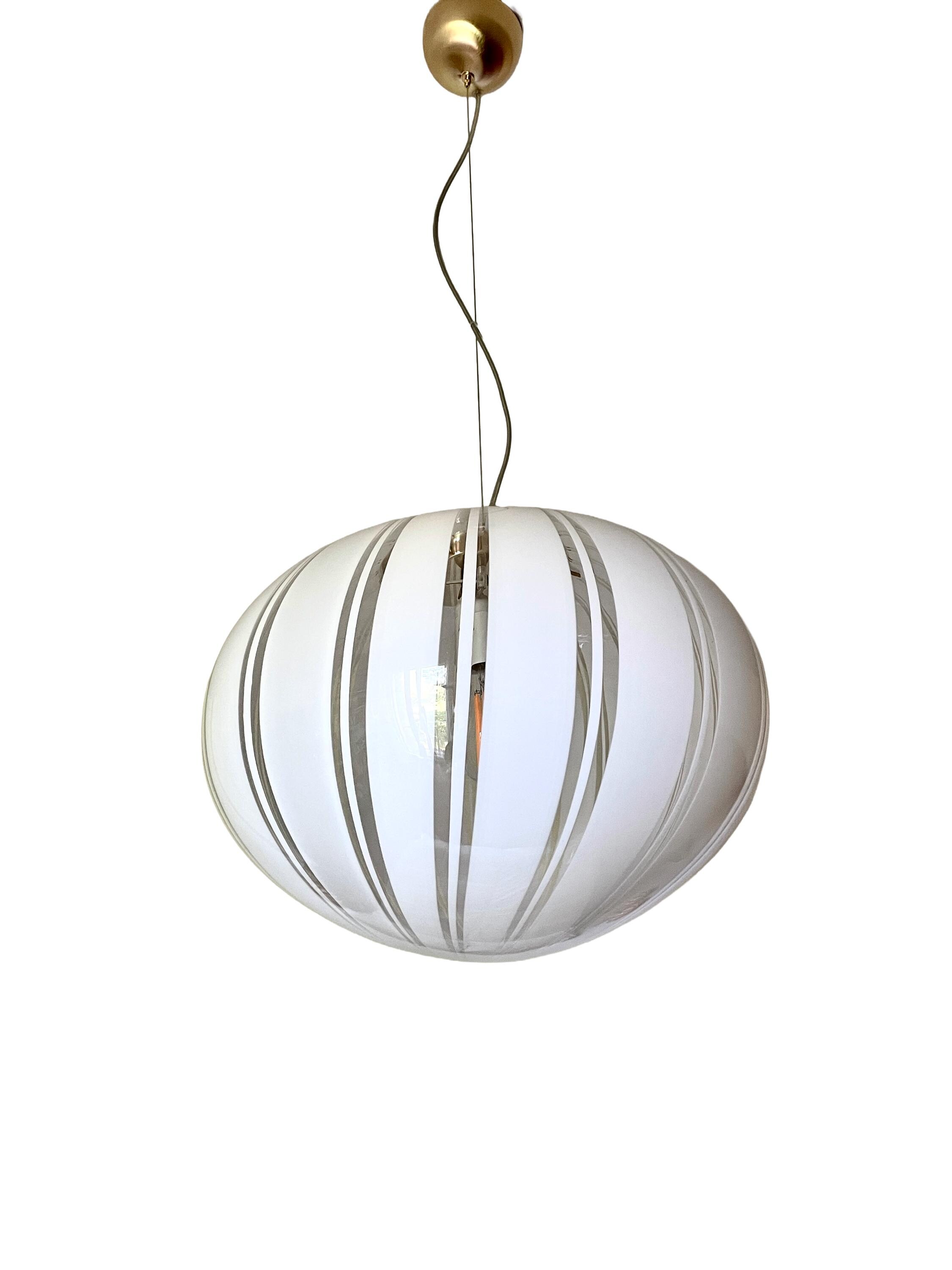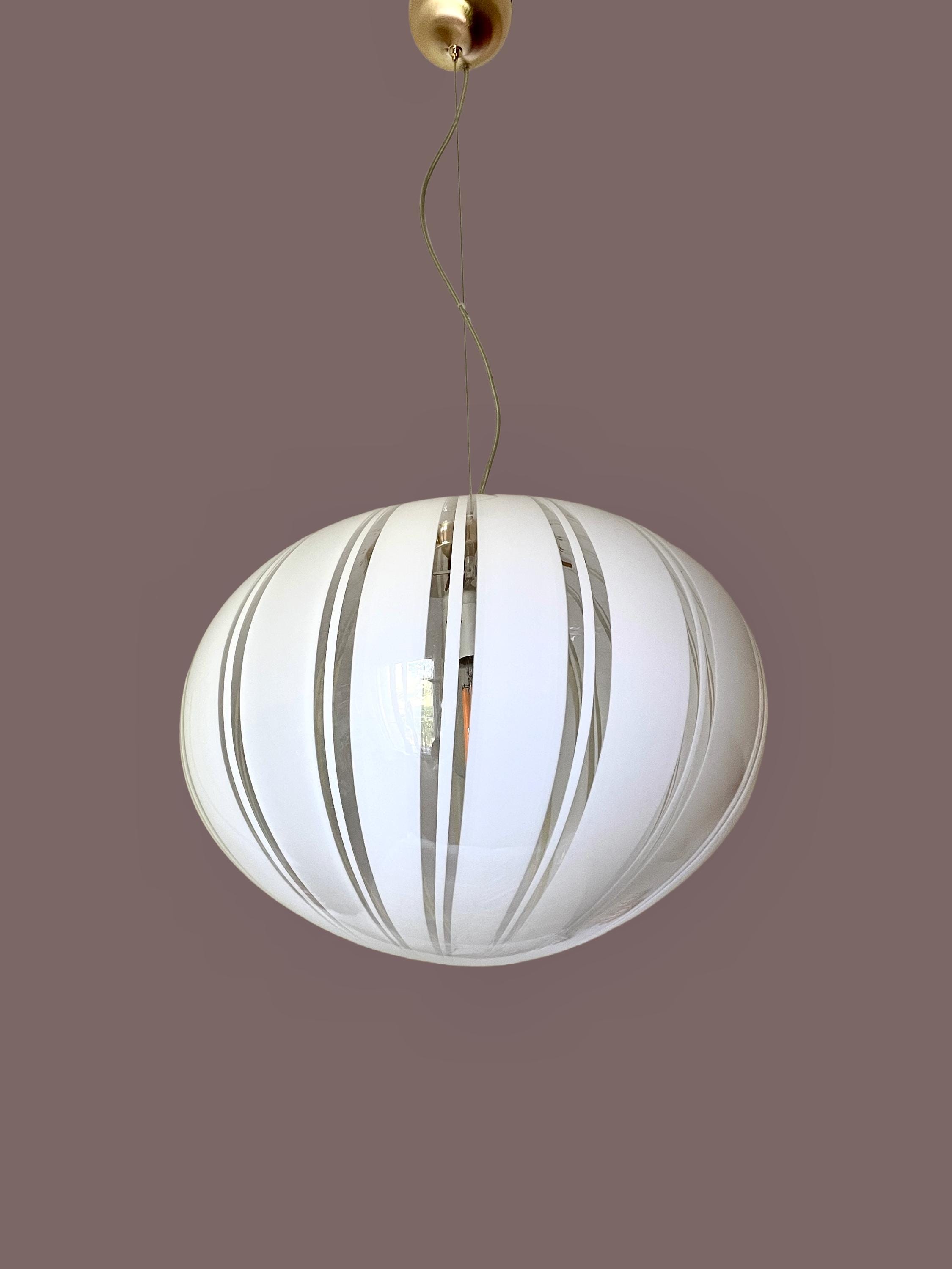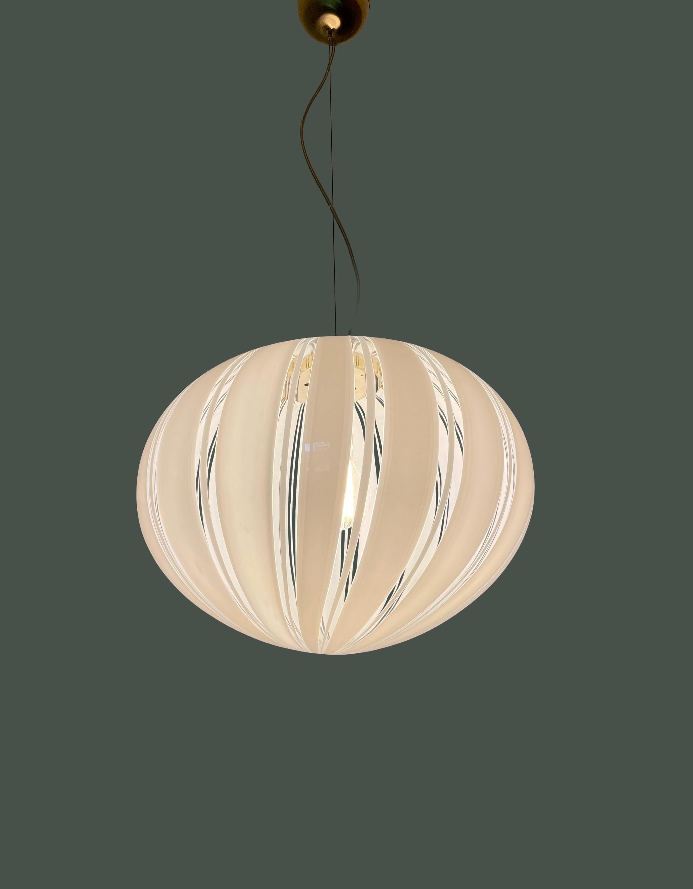 Gorgeous large Murano glass chandelier, vintage from the 1970s, featuring mouth-blown glass and hand-crafted with vertical filigree motifs and white canes on a transparent background.