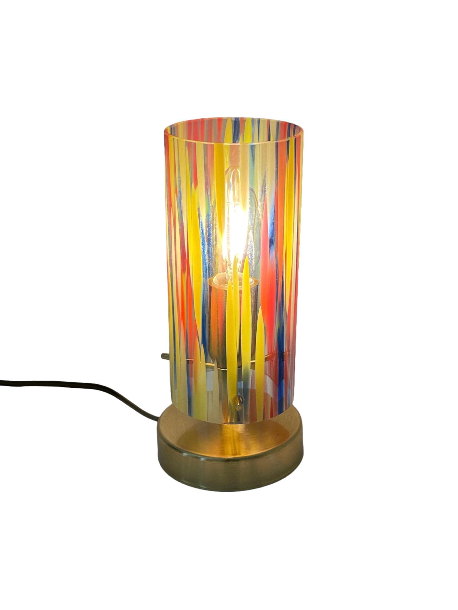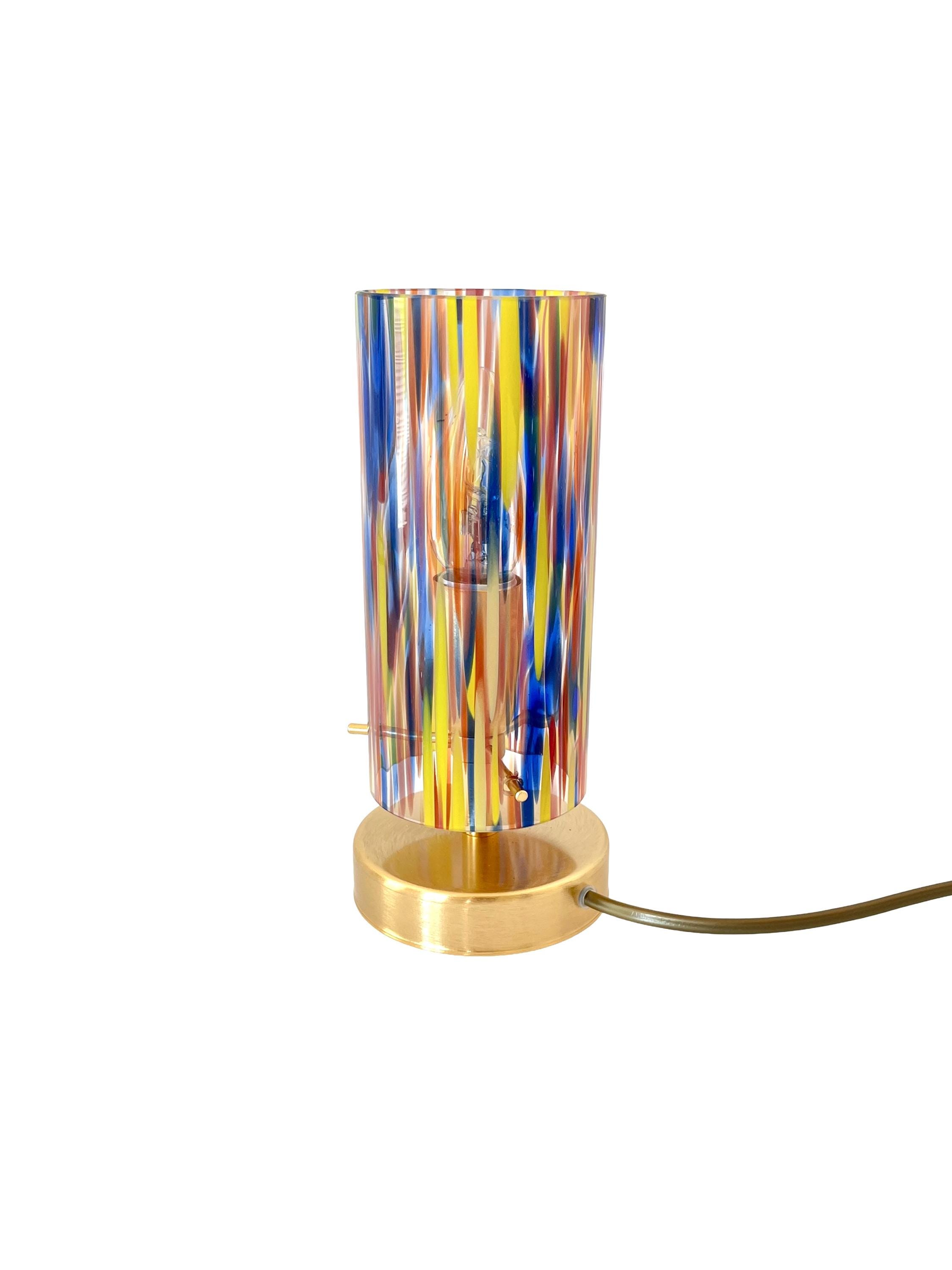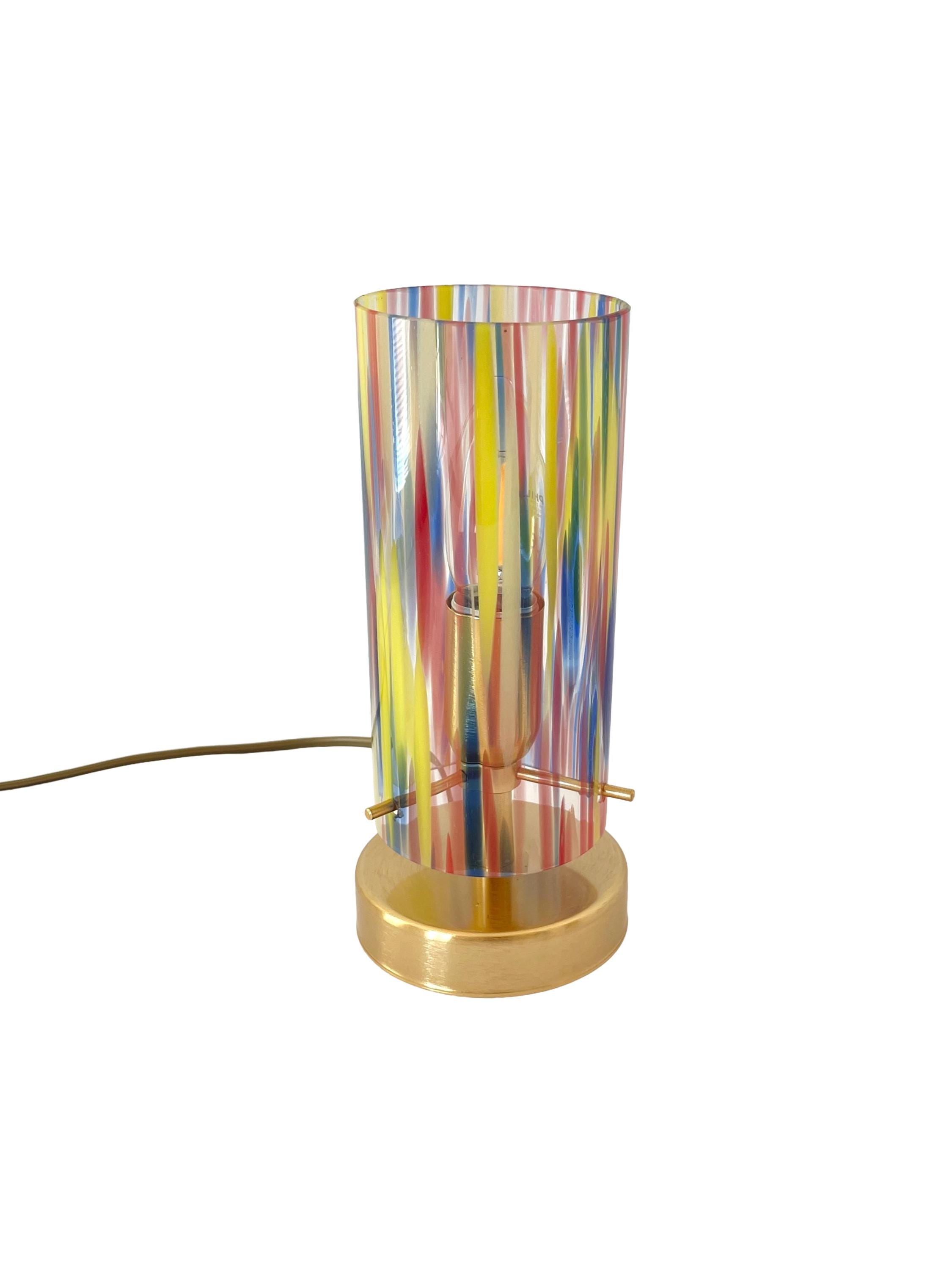 Graceful table lamps with multicolored Murano glass, expertly mouth-blown and hand-crafted by the master glassmaker, the frame is in satin gold metal.