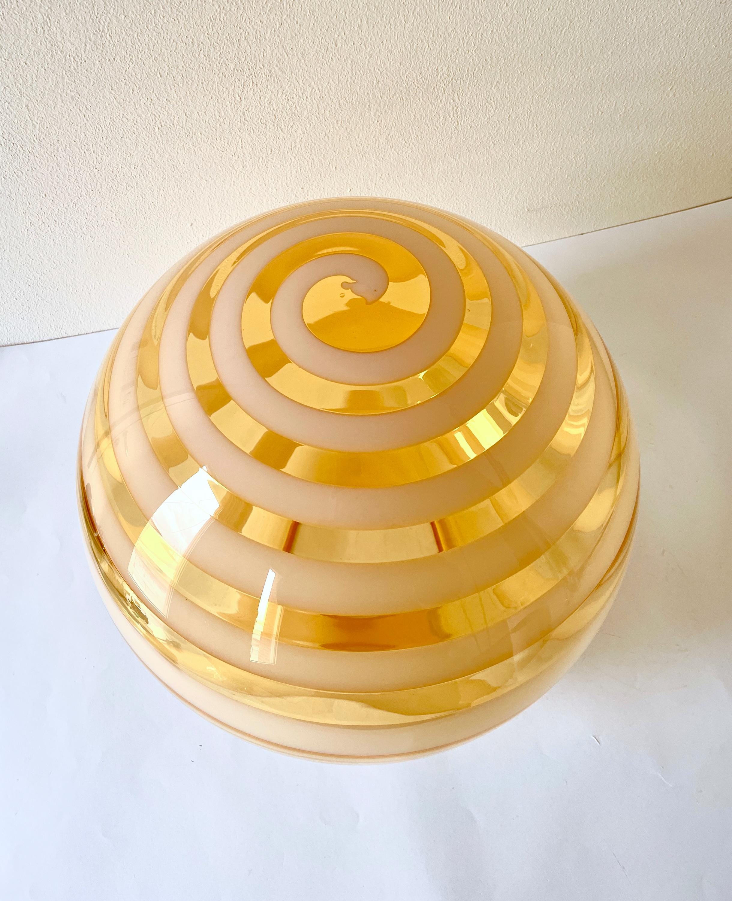 Splendid spherical table lamp handmade by Murano master glassmakers using an ancient technique: a white glass casting is fused in a spiral over a transparent amber base.