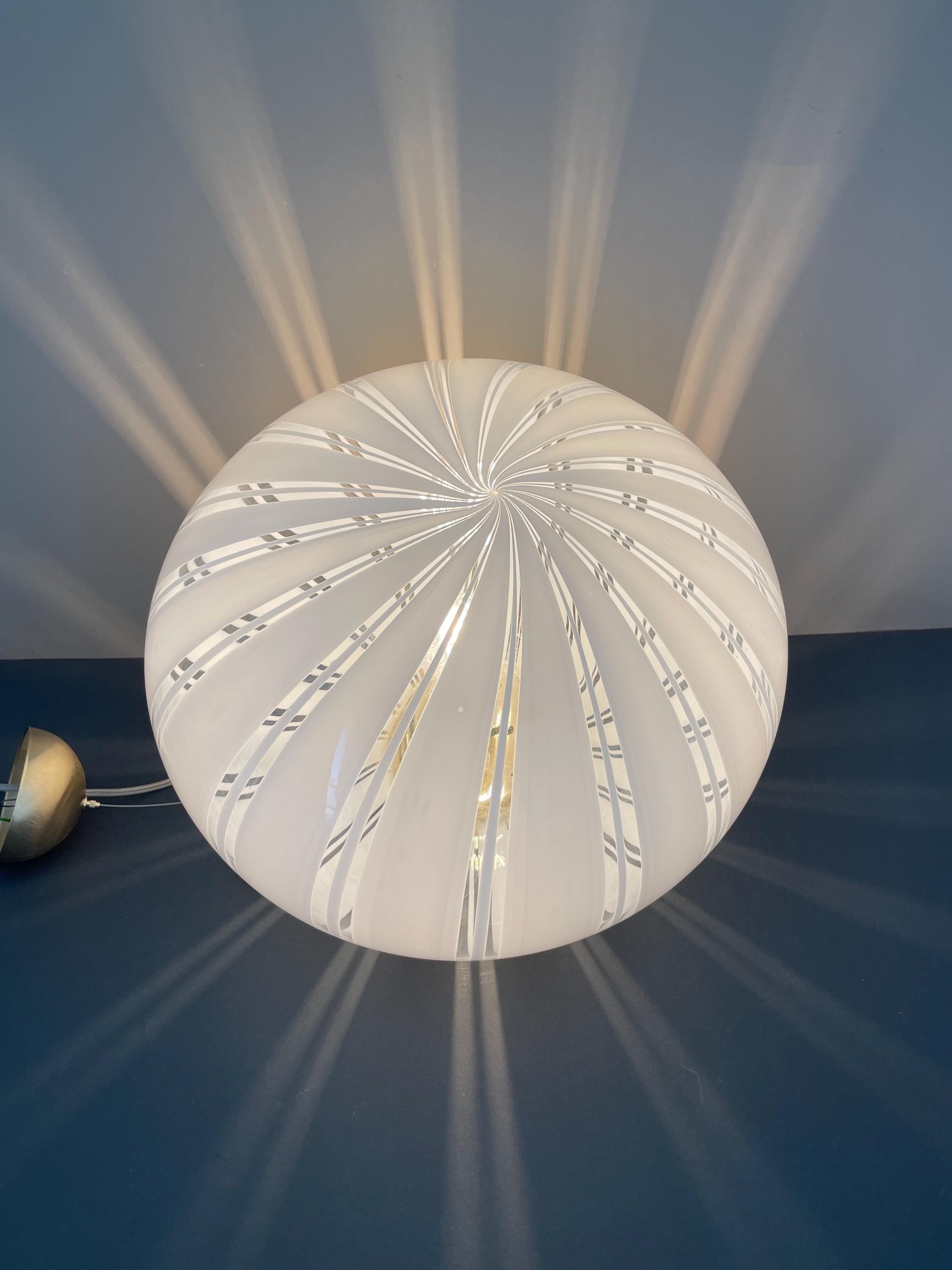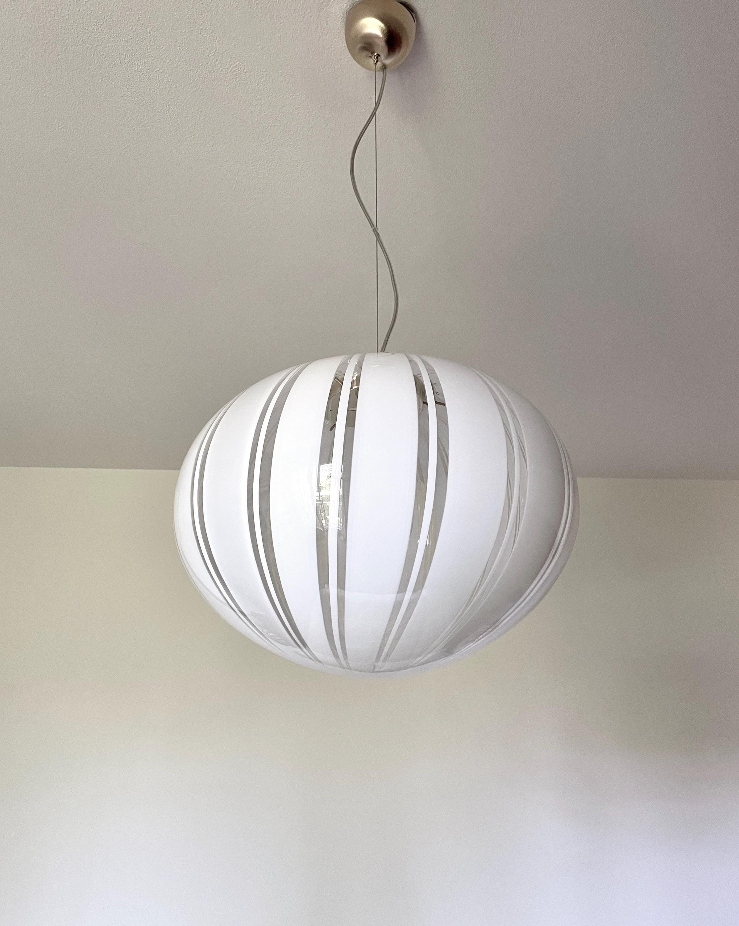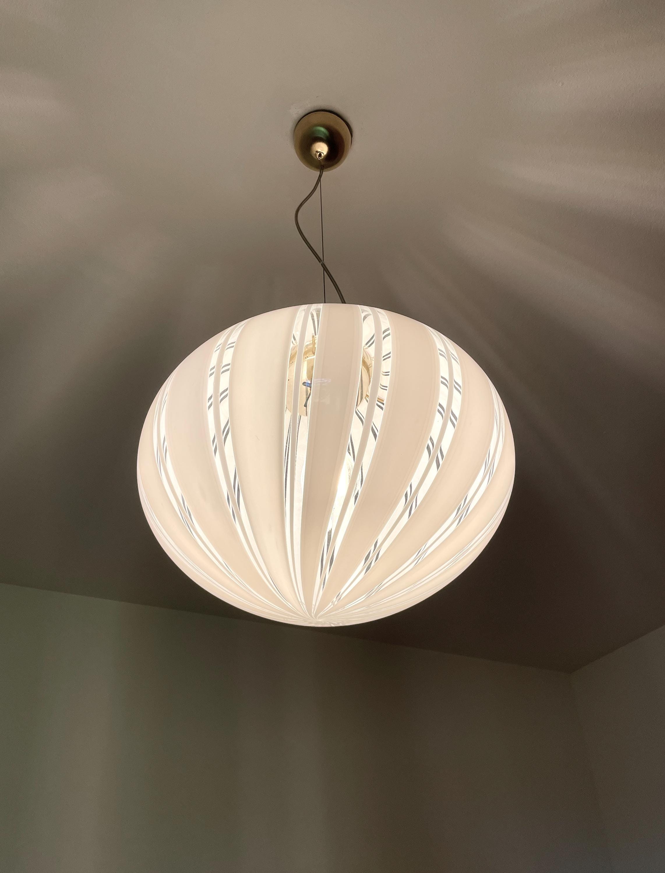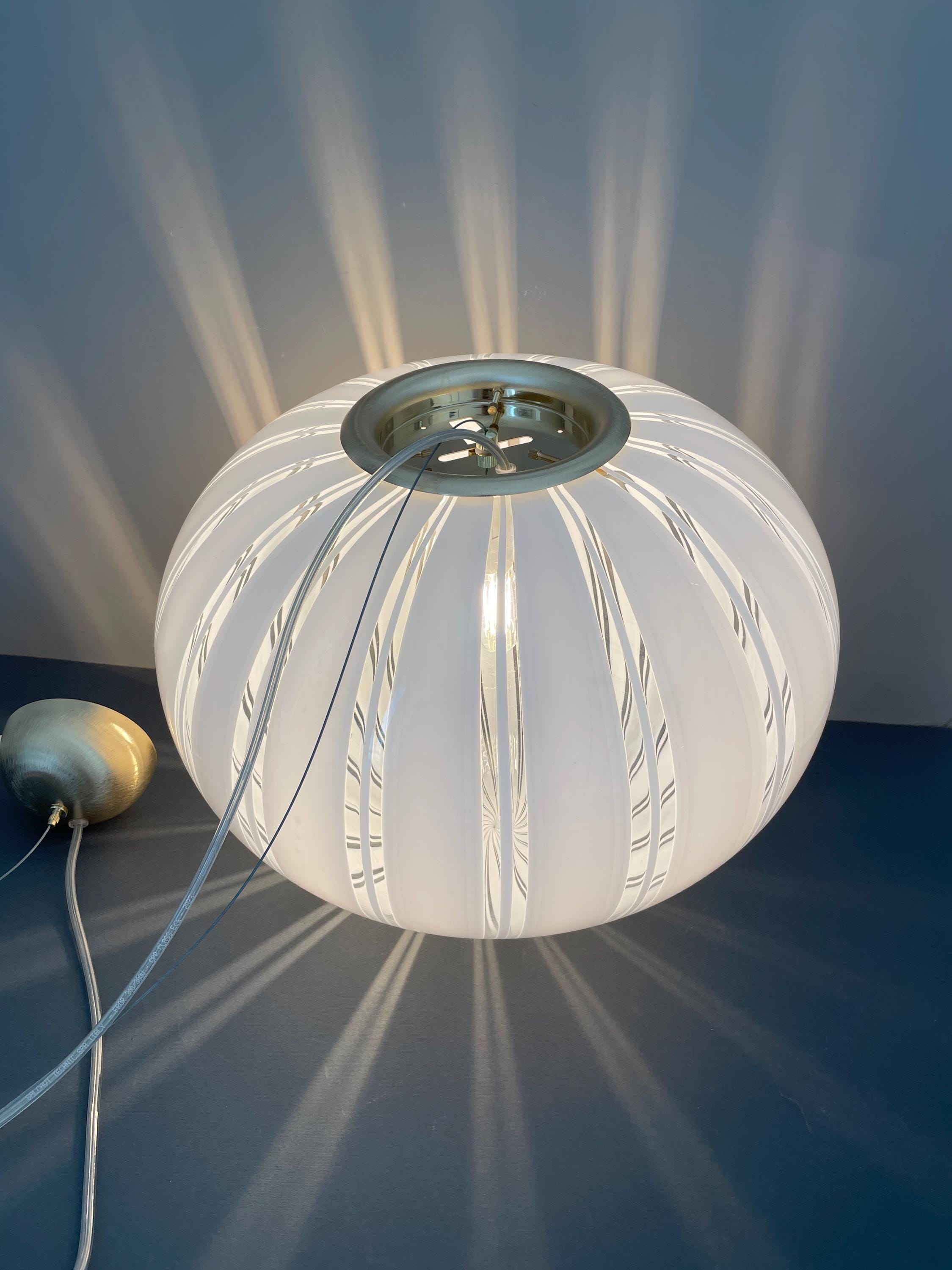 Gorgeous large Murano glass chandelier, vintage 1970s with mouth-blown glass and hand-crafted with vertical filigree motifs and white canes on a transparent background.