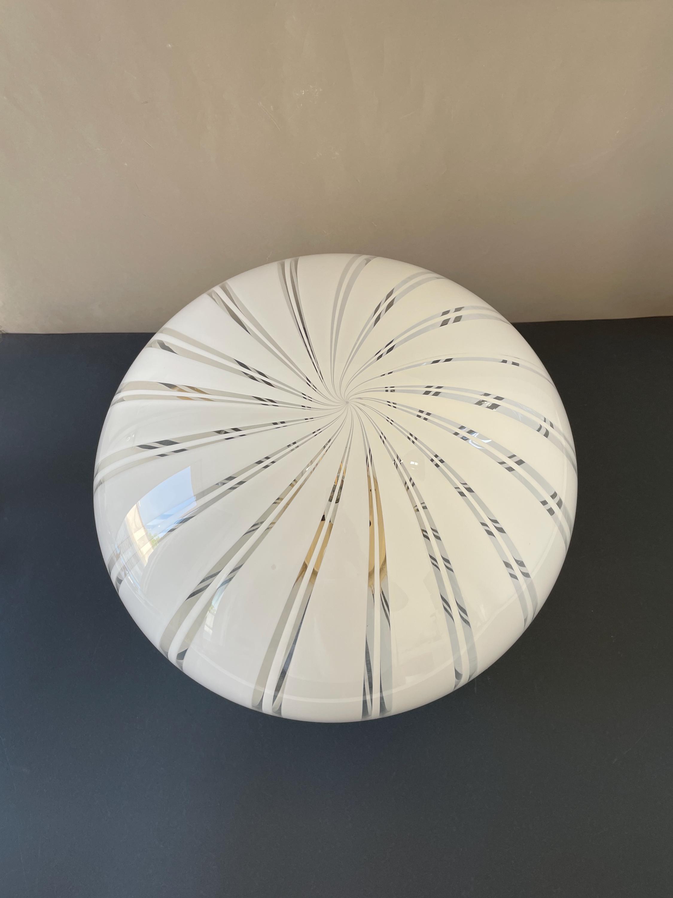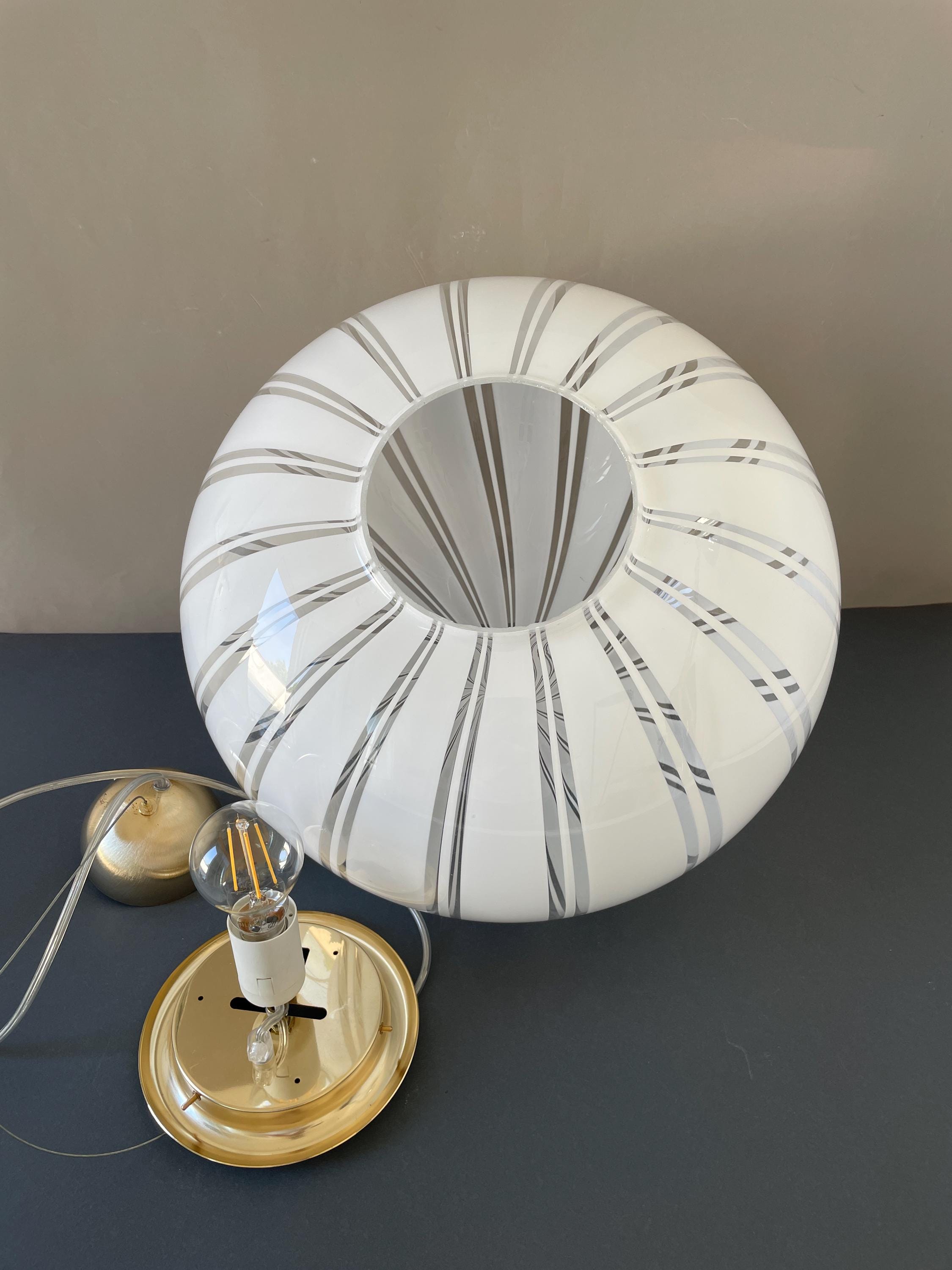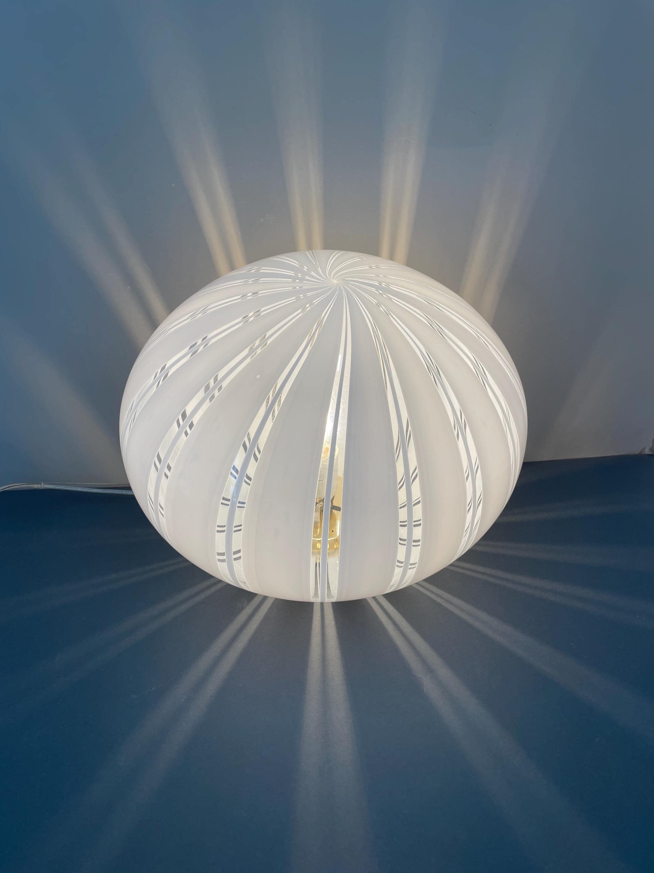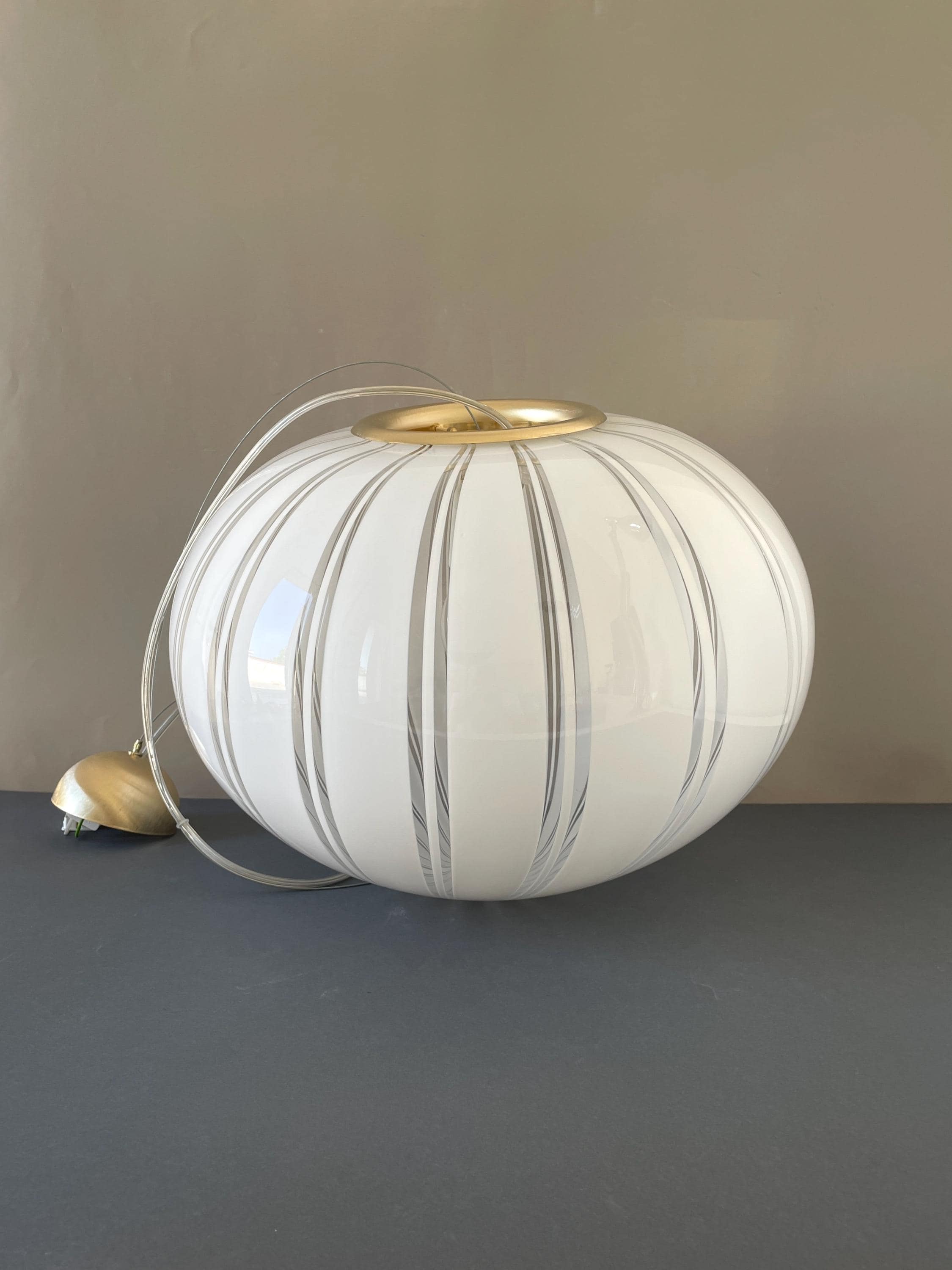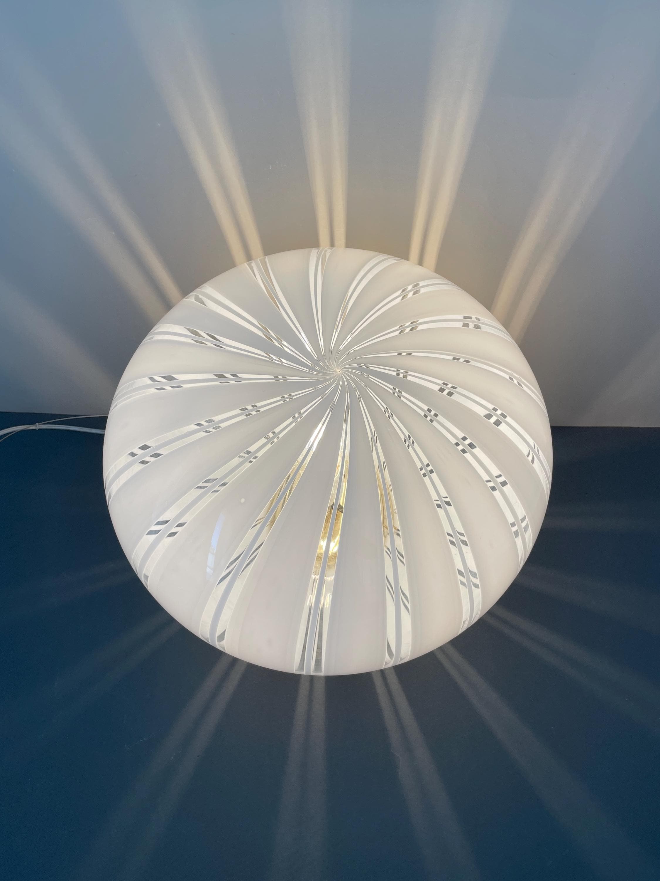 Gorgeous large Murano glass chandelier, vintage 1970s with mouth-blown glass and hand-crafted with vertical filigree motifs and white canes on a transparent background.