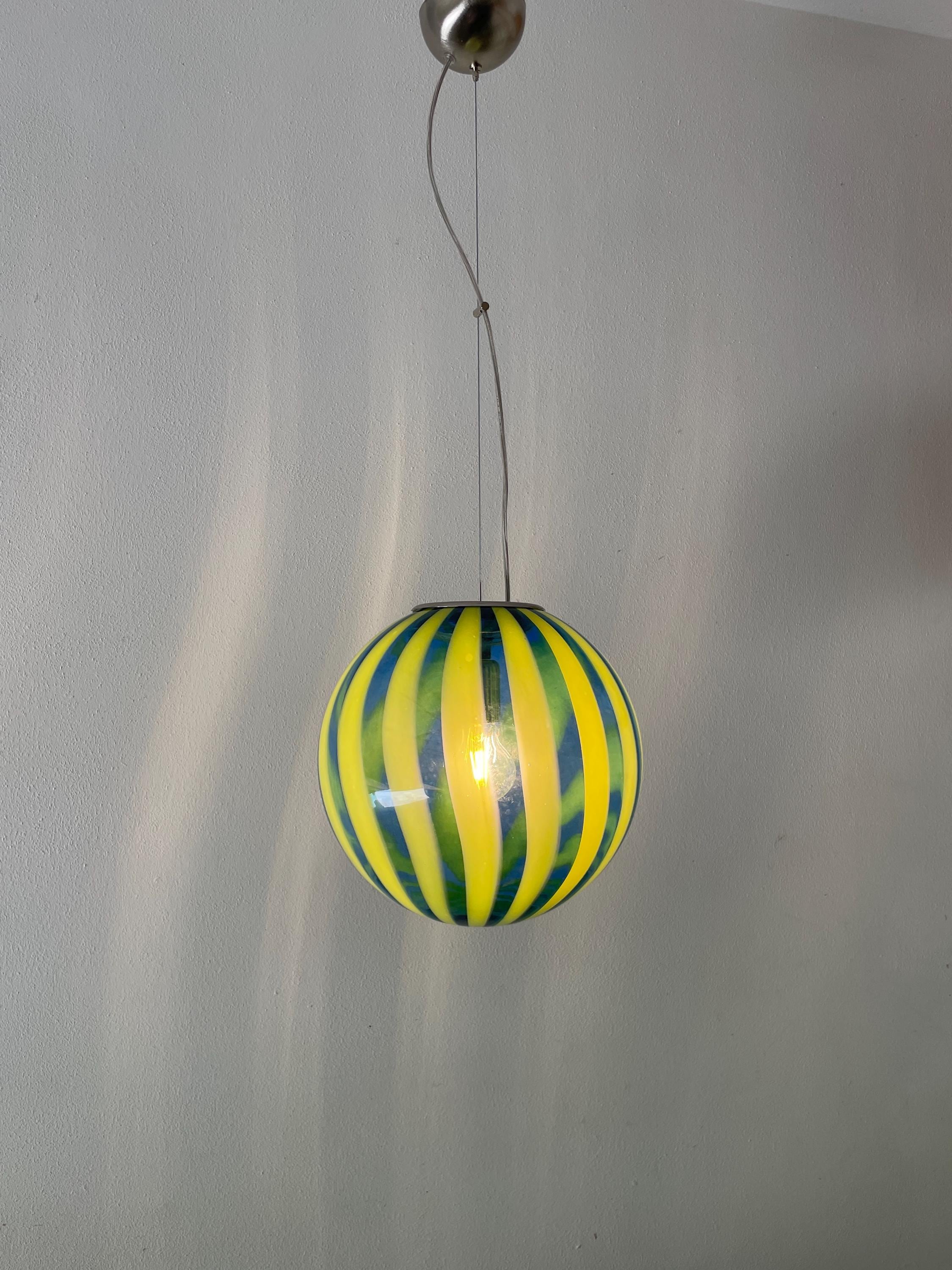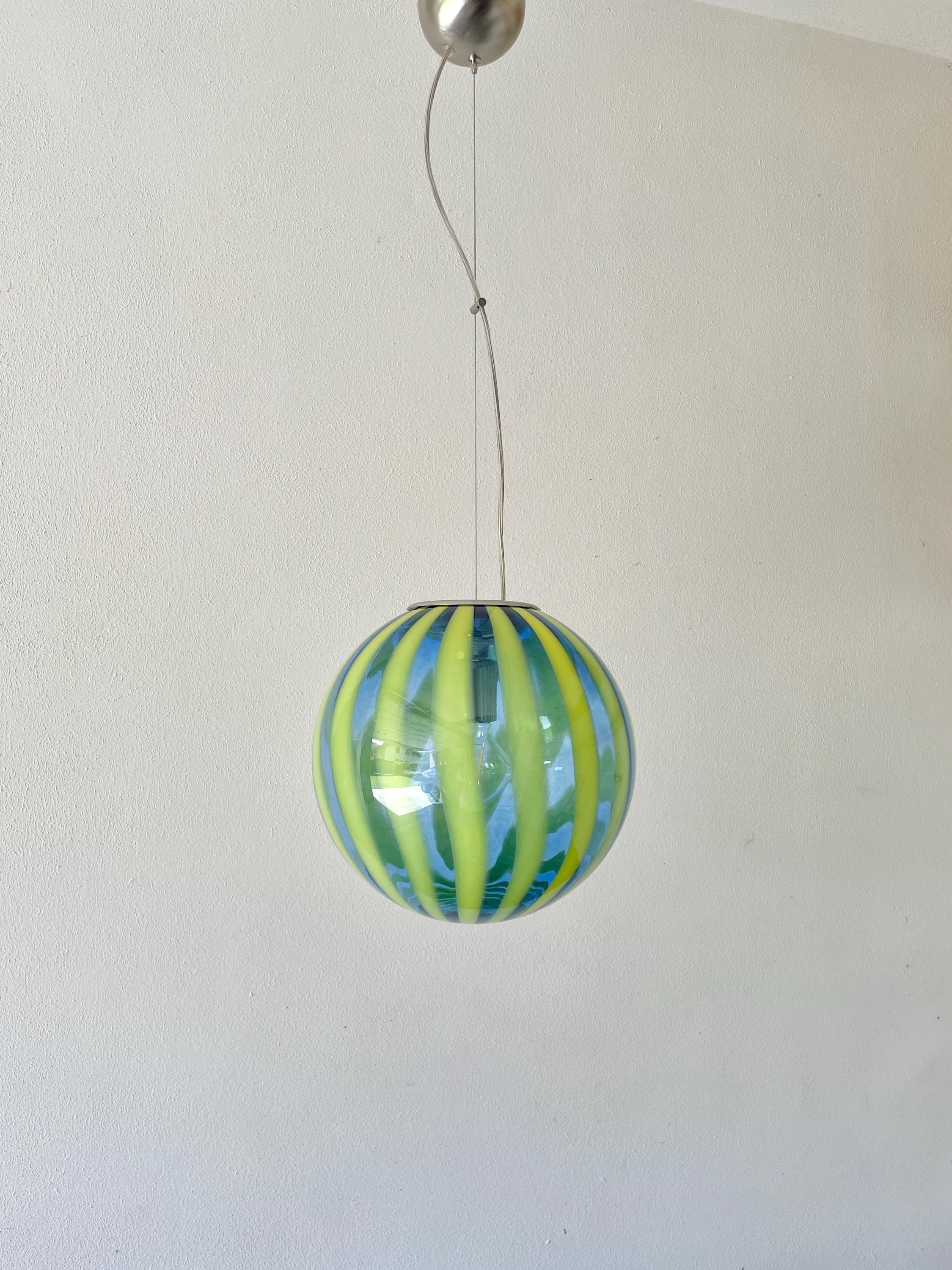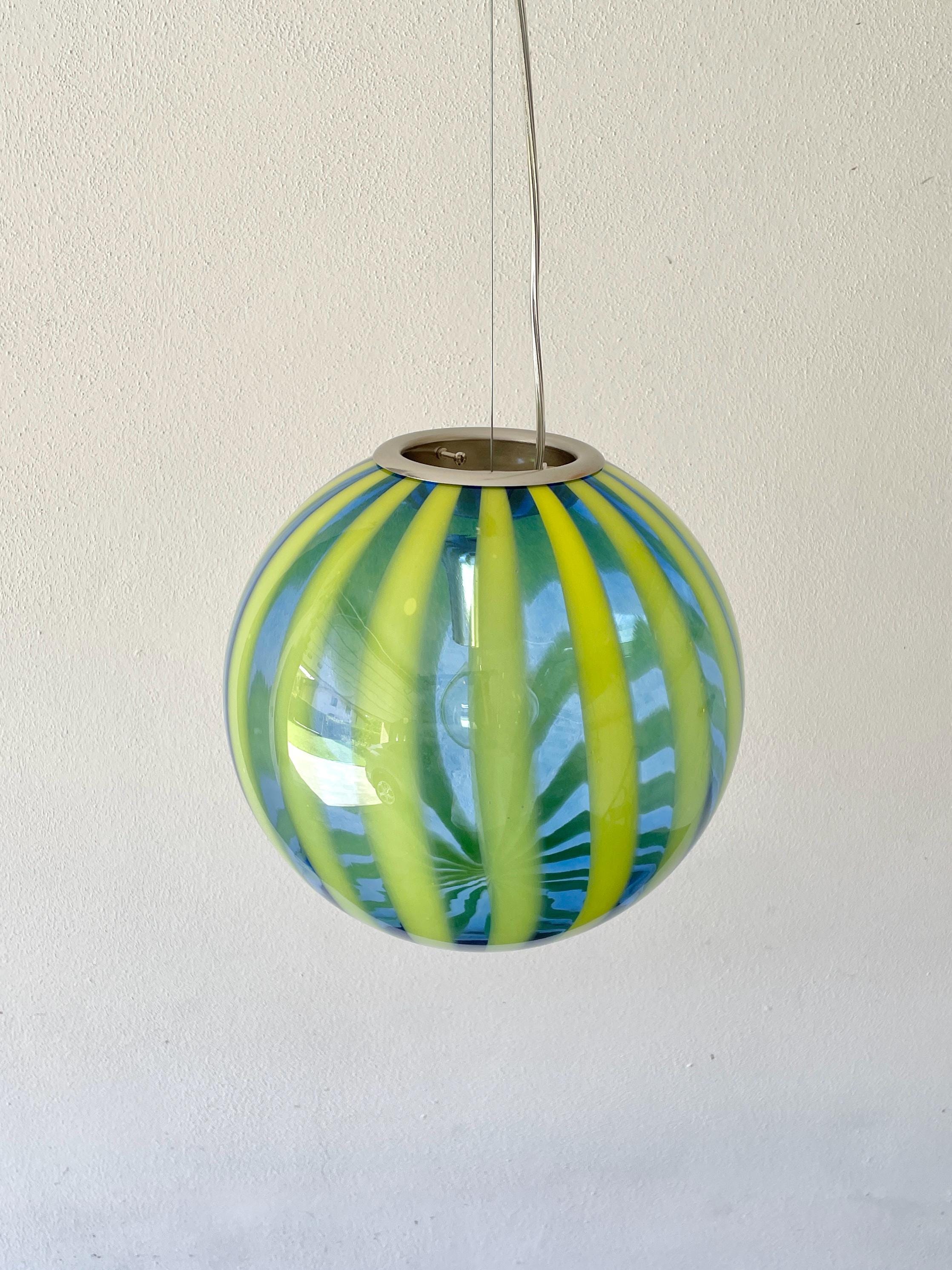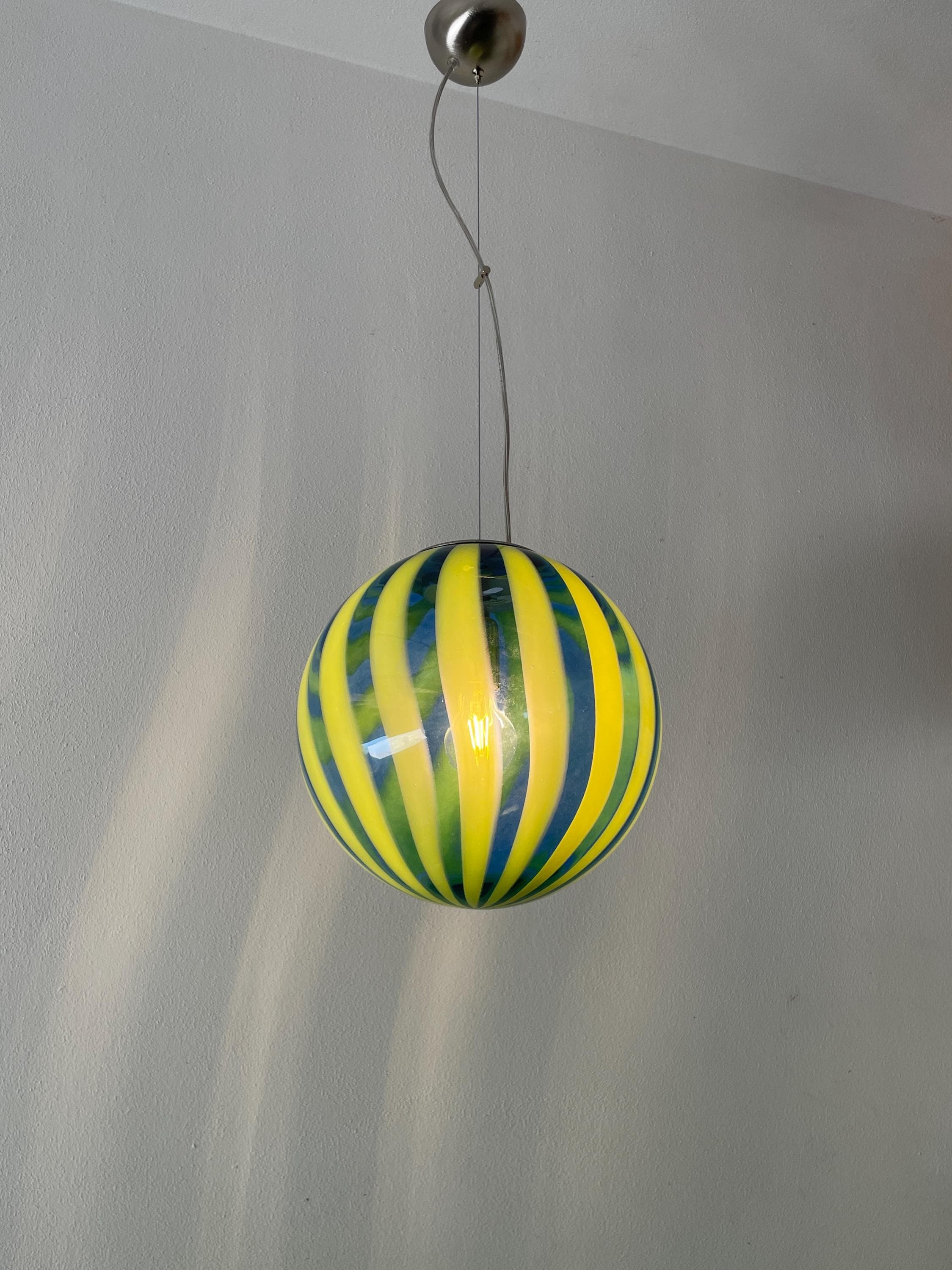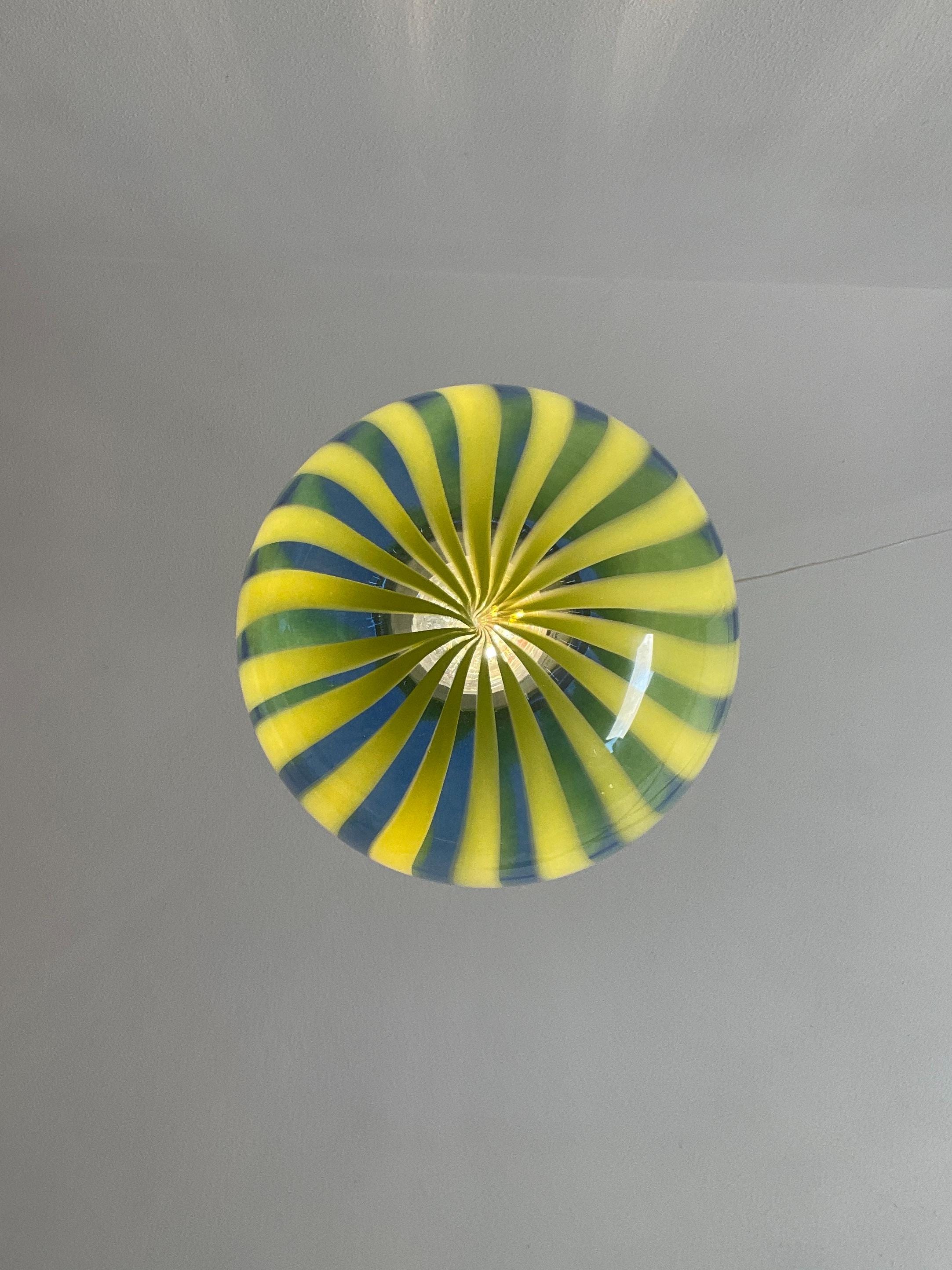 Lamps handcrafted by master glassmakers using the ancient Murano technique of working with colored glass rods. This model is available in a beautiful blue color with lemon yellow rods by Effetre Murano.