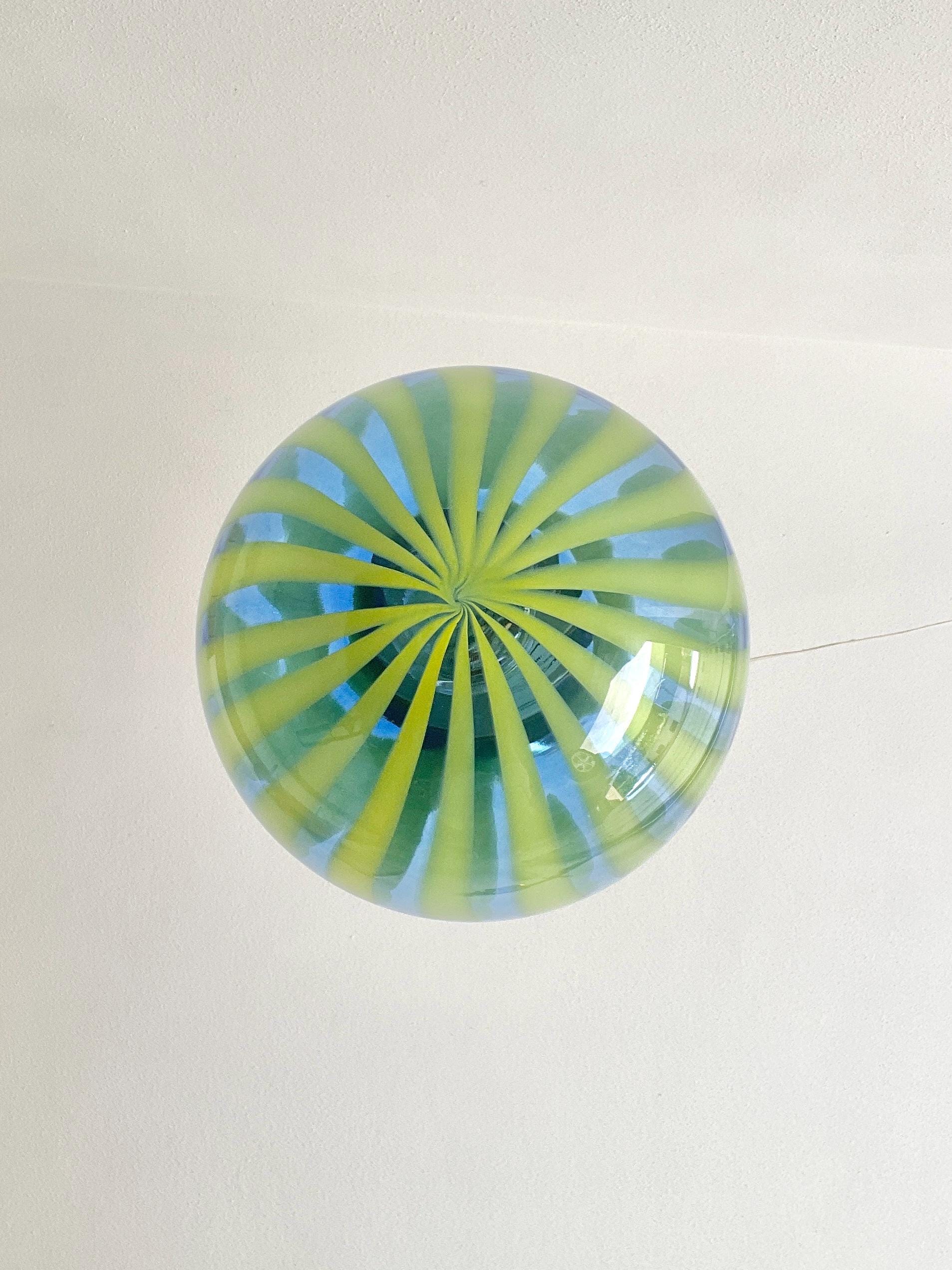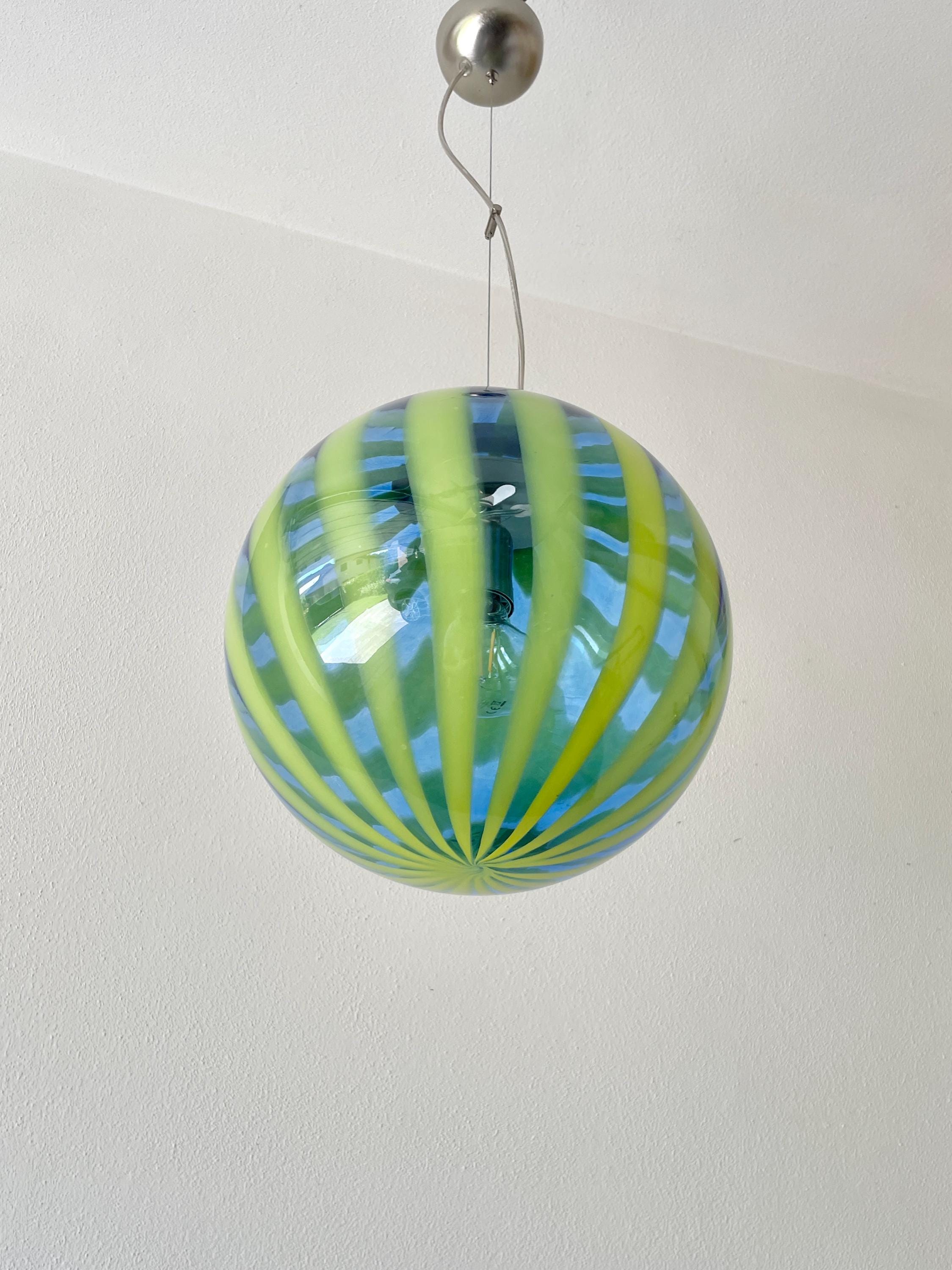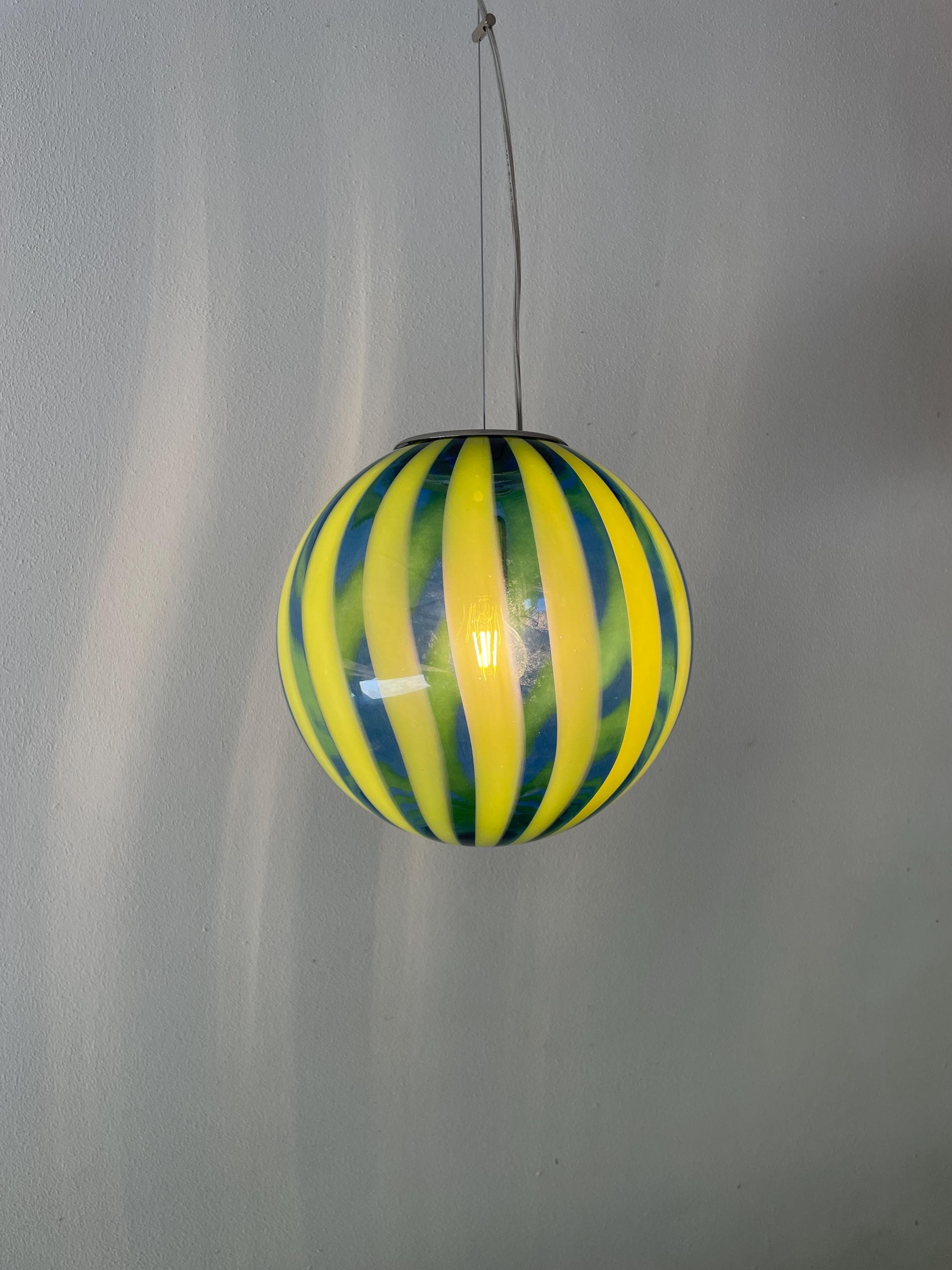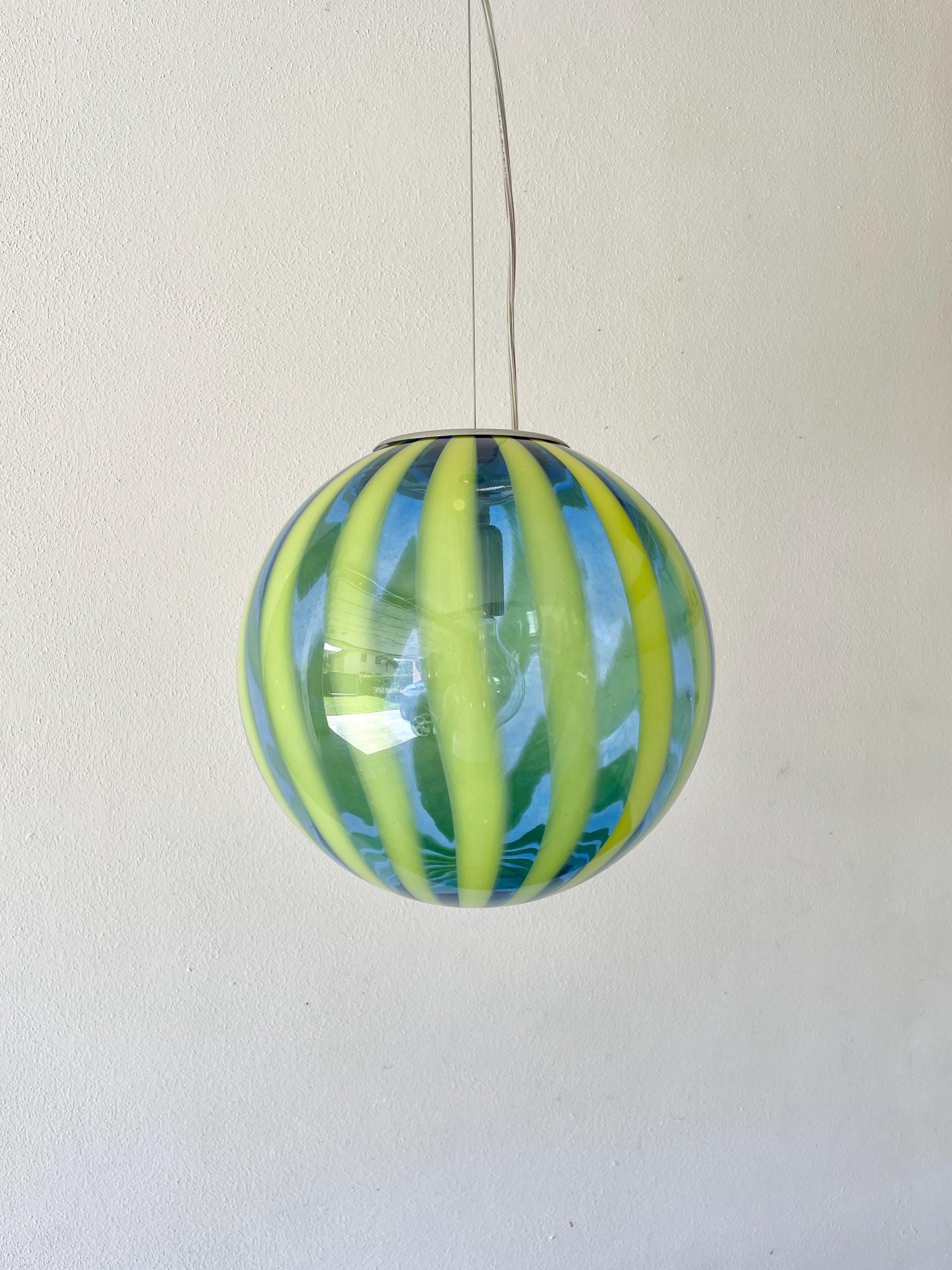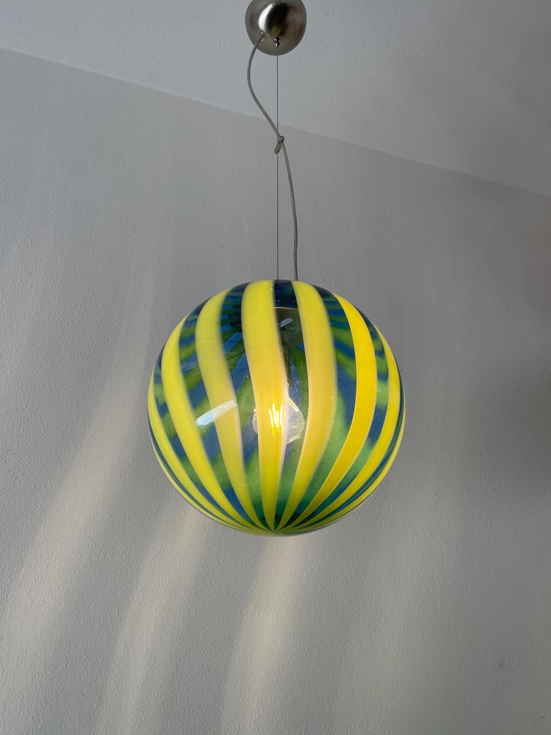 Lamps handcrafted by master glassmakers using the ancient Murano technique of working with colored glass rods. This model is available in a beautiful blue color with lemon yellow rods by Effetre Murano.