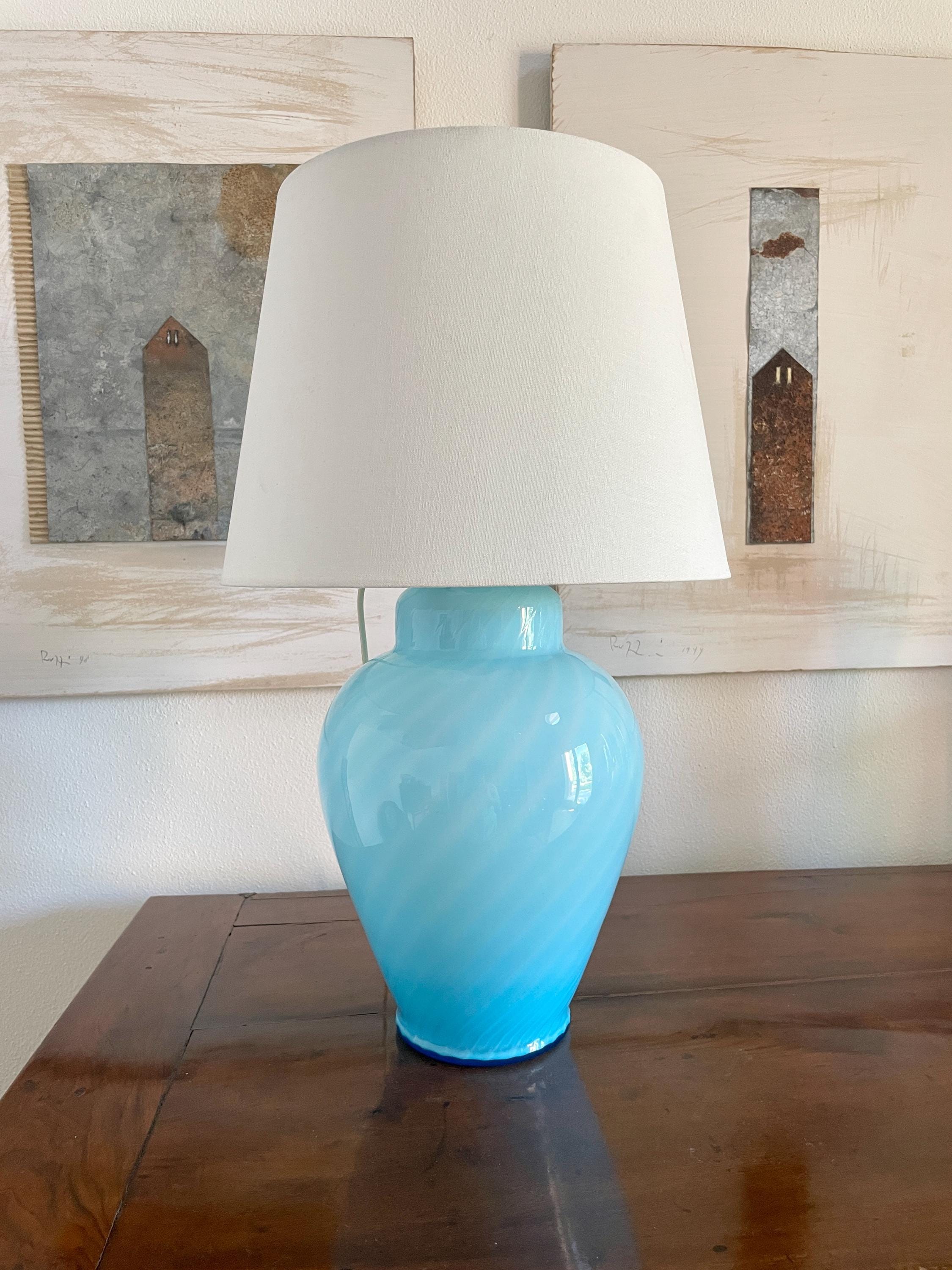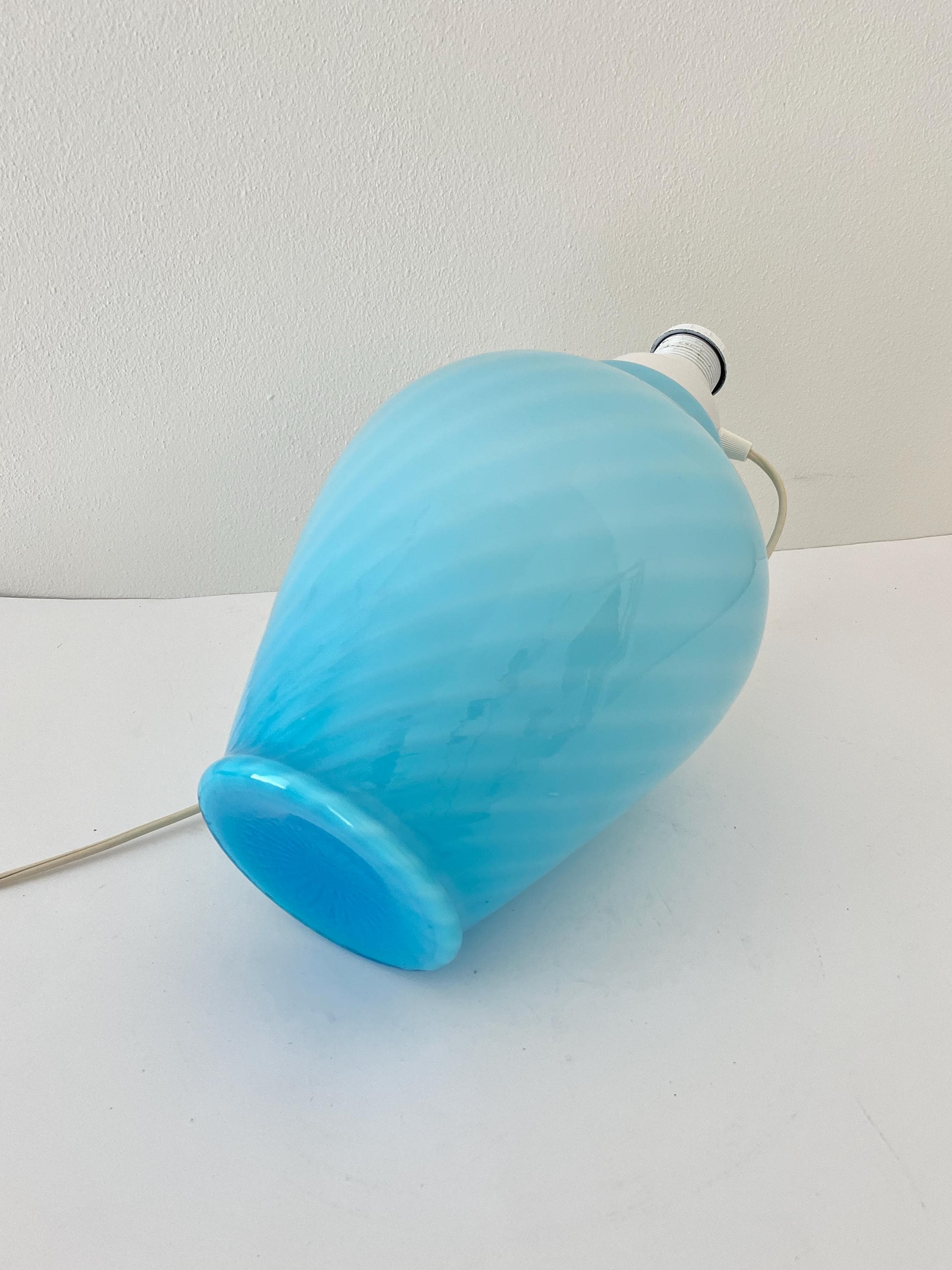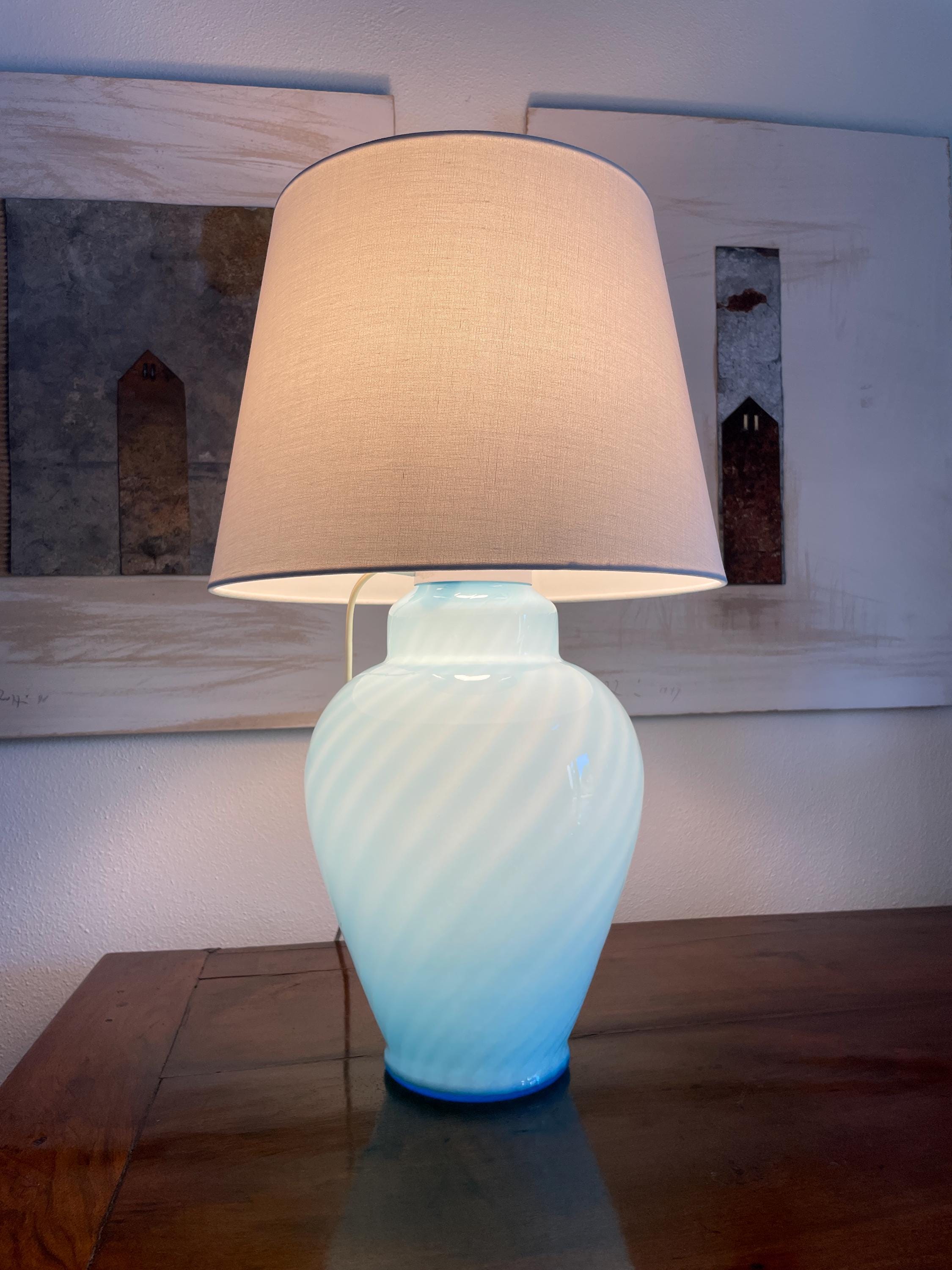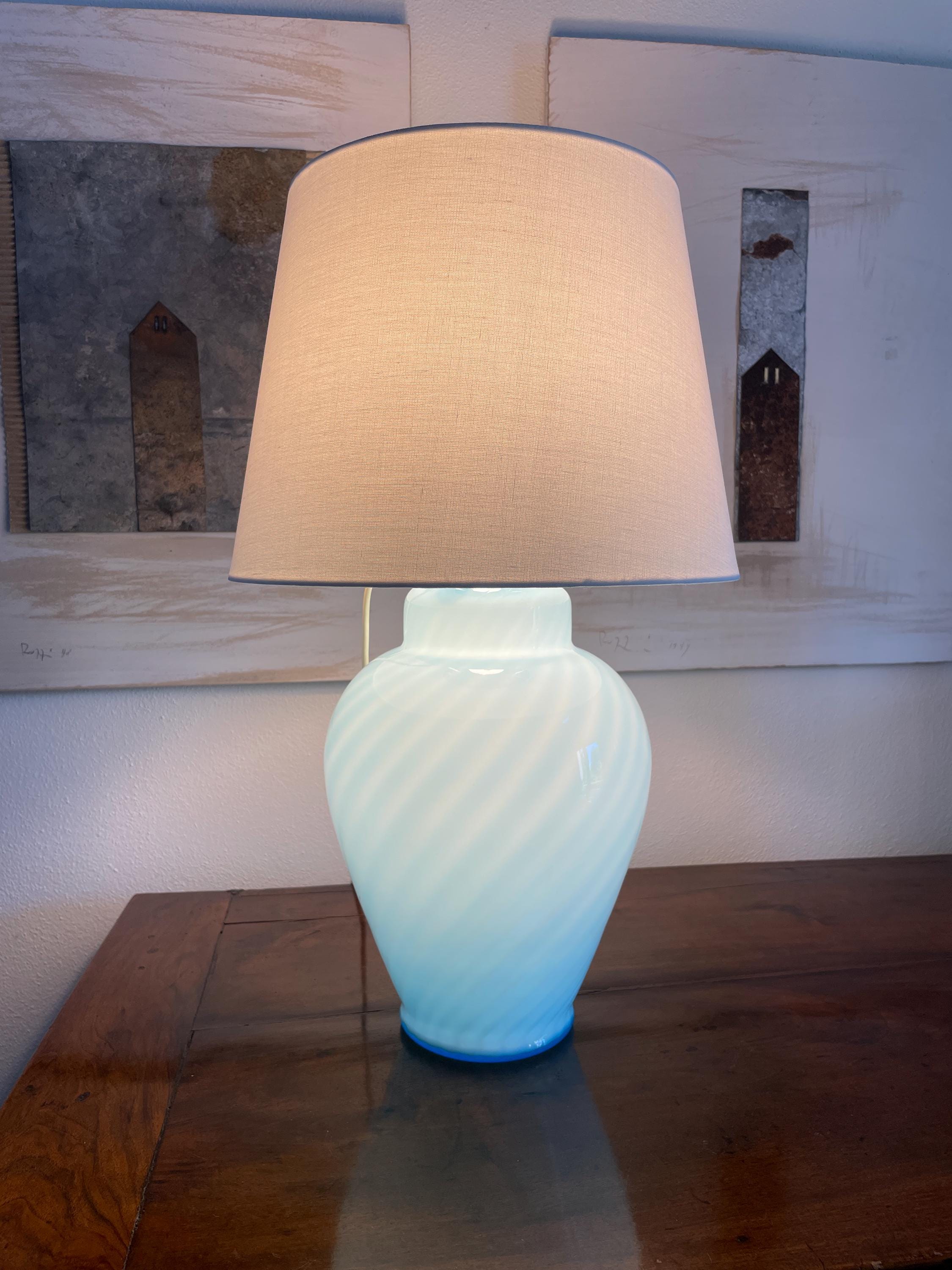 Delightful and rare vintage table lamp with splendid twisted rigadin blue Murano glass, spiral motif, the metal frame is white and designed for 2 bulbs, one that illuminates the glass internally and one above for the lampshade.