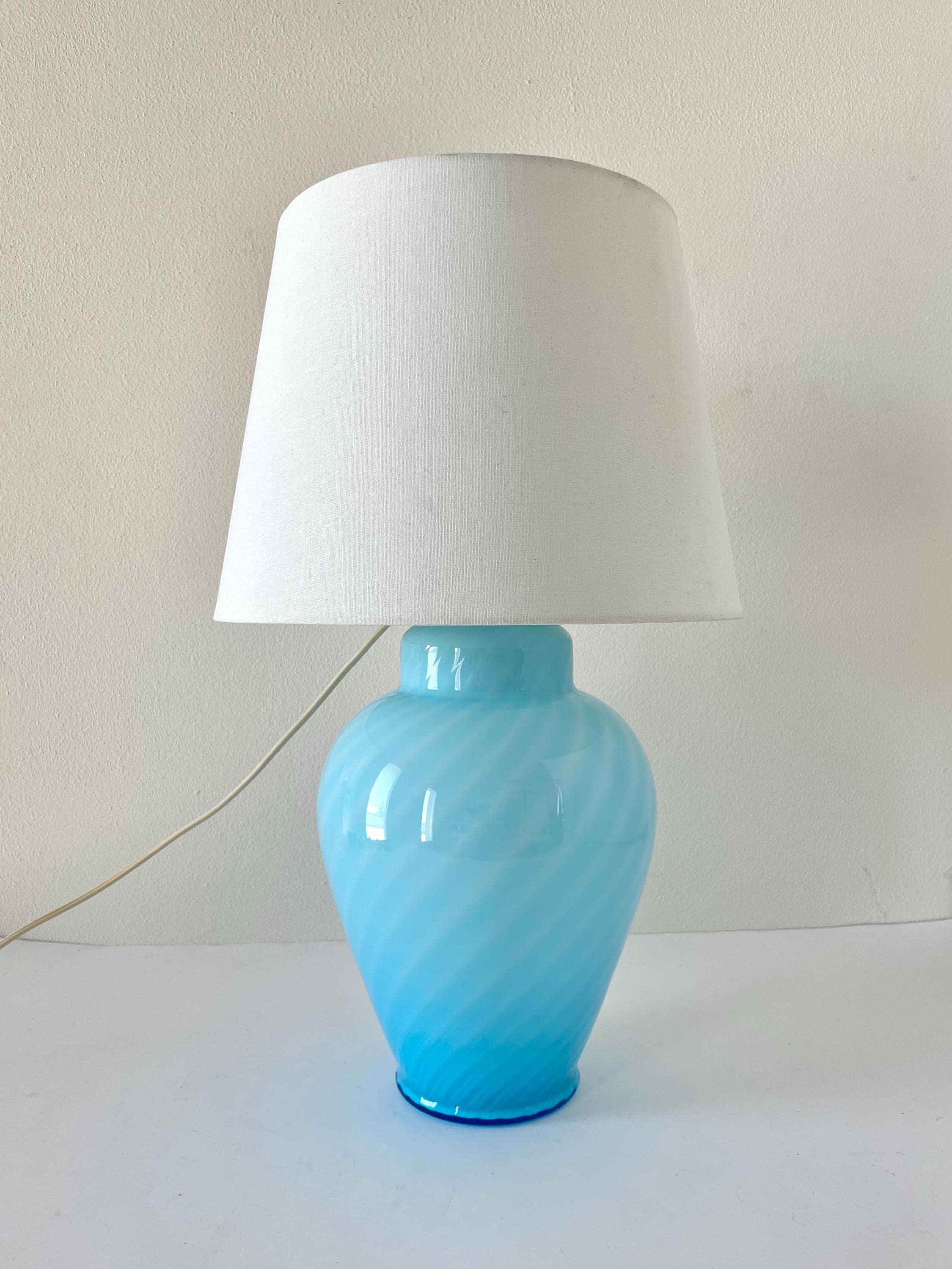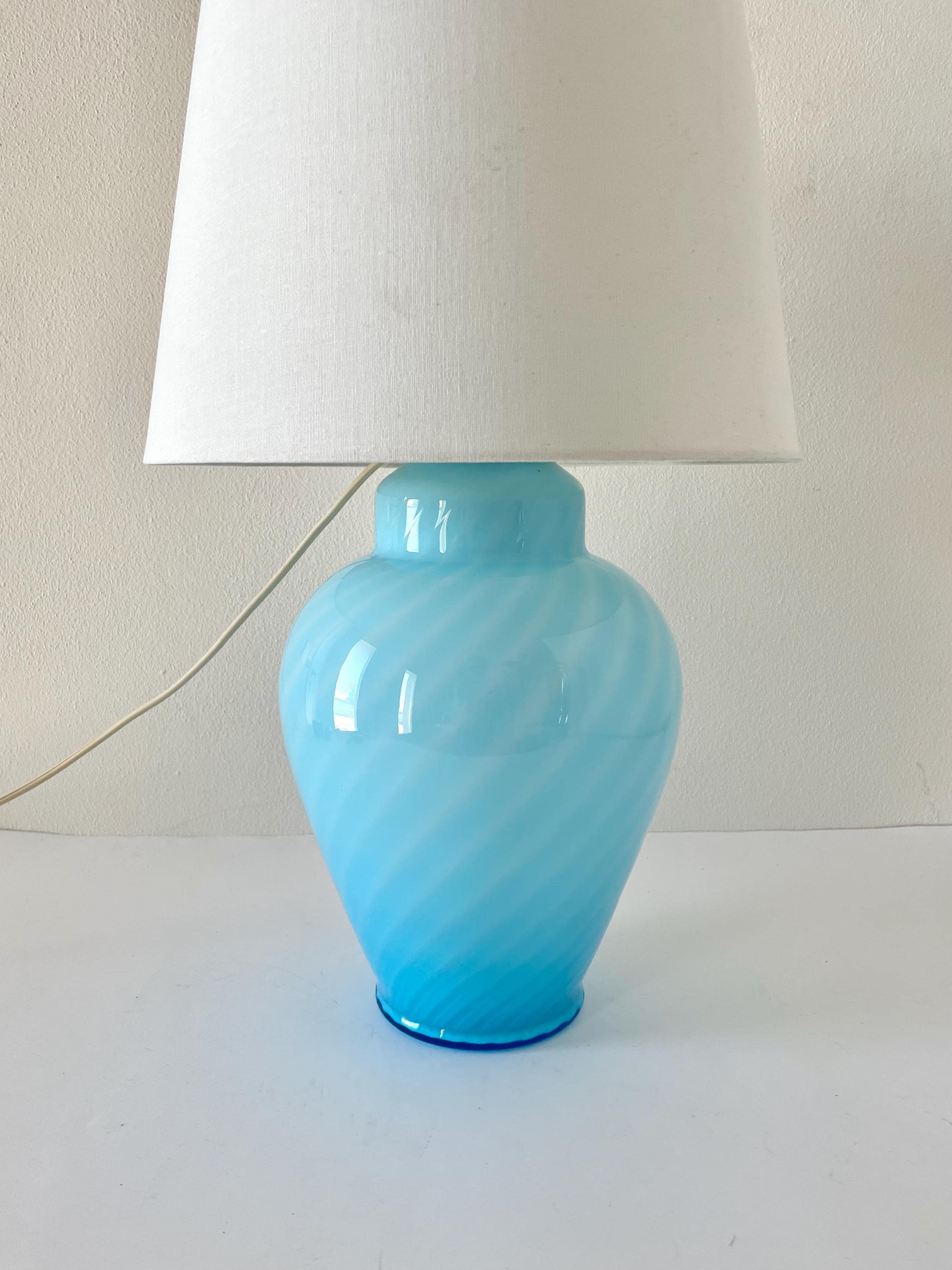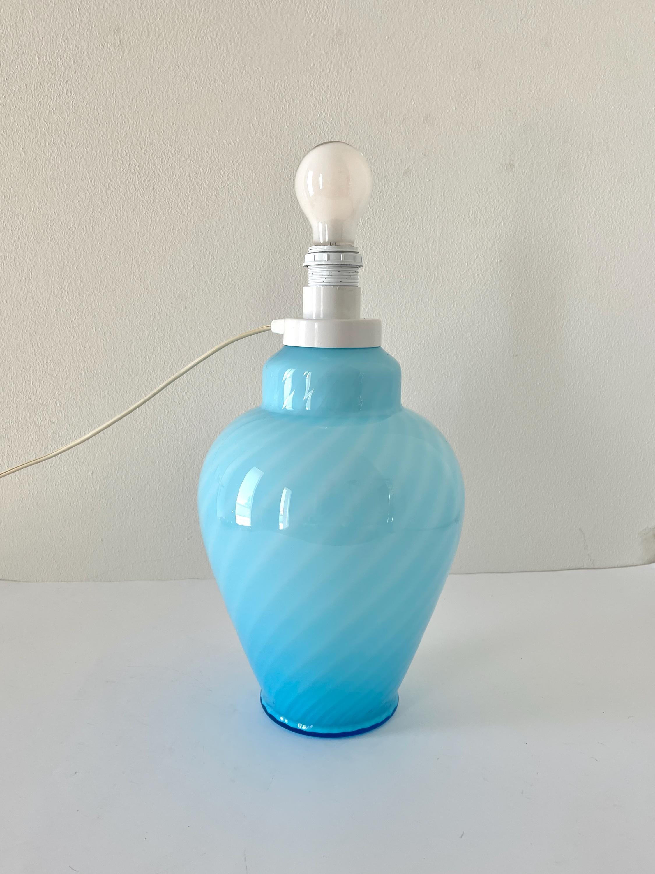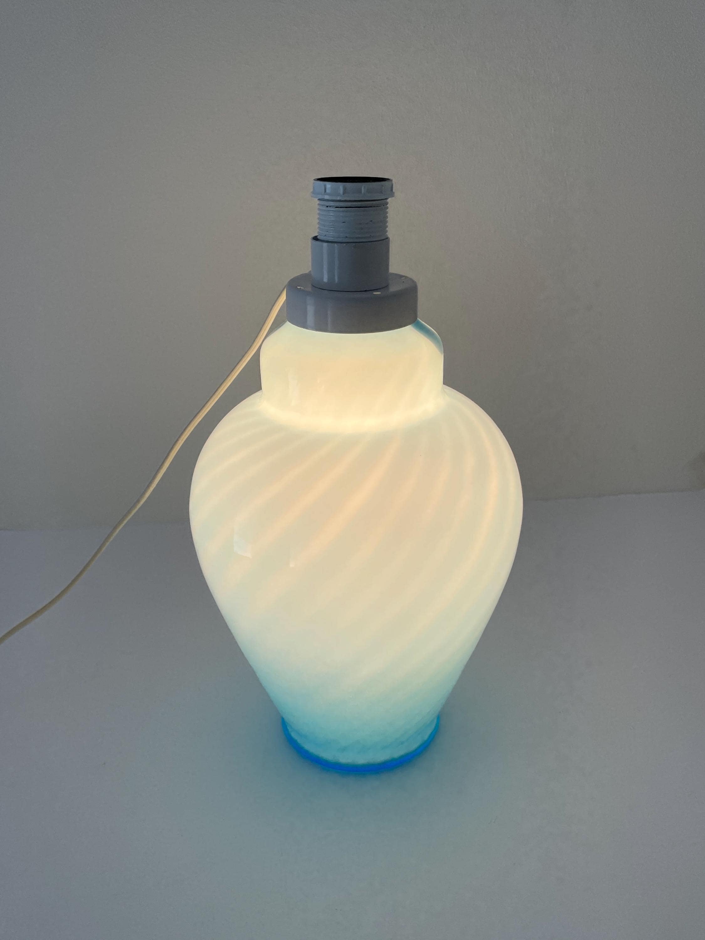 Delightful and rare vintage table lamp with splendid twisted rigadin blue Murano glass, spiral motif, the metal frame is white and designed for 2 bulbs, one that illuminates the glass internally and one above for the lampshade.