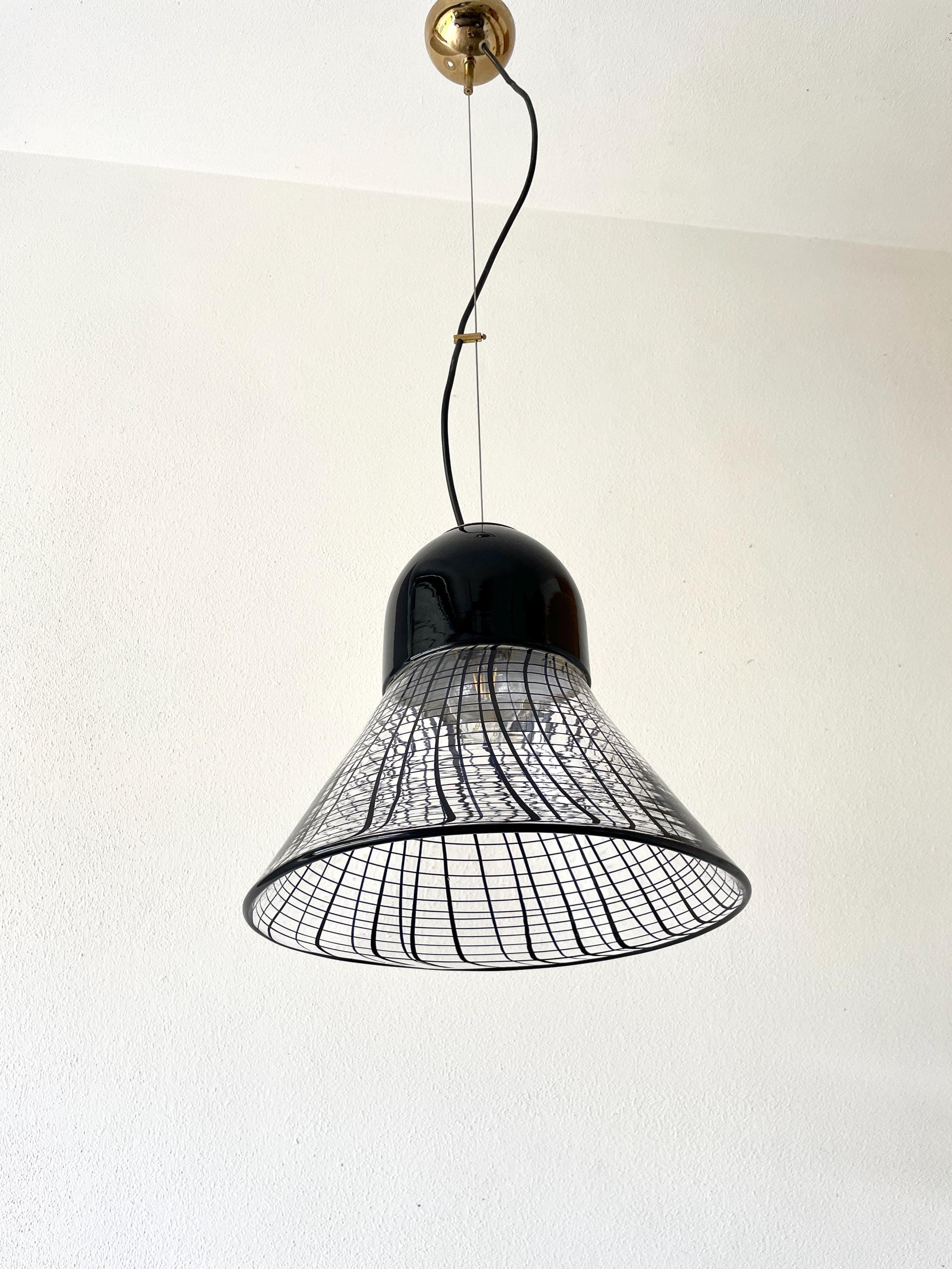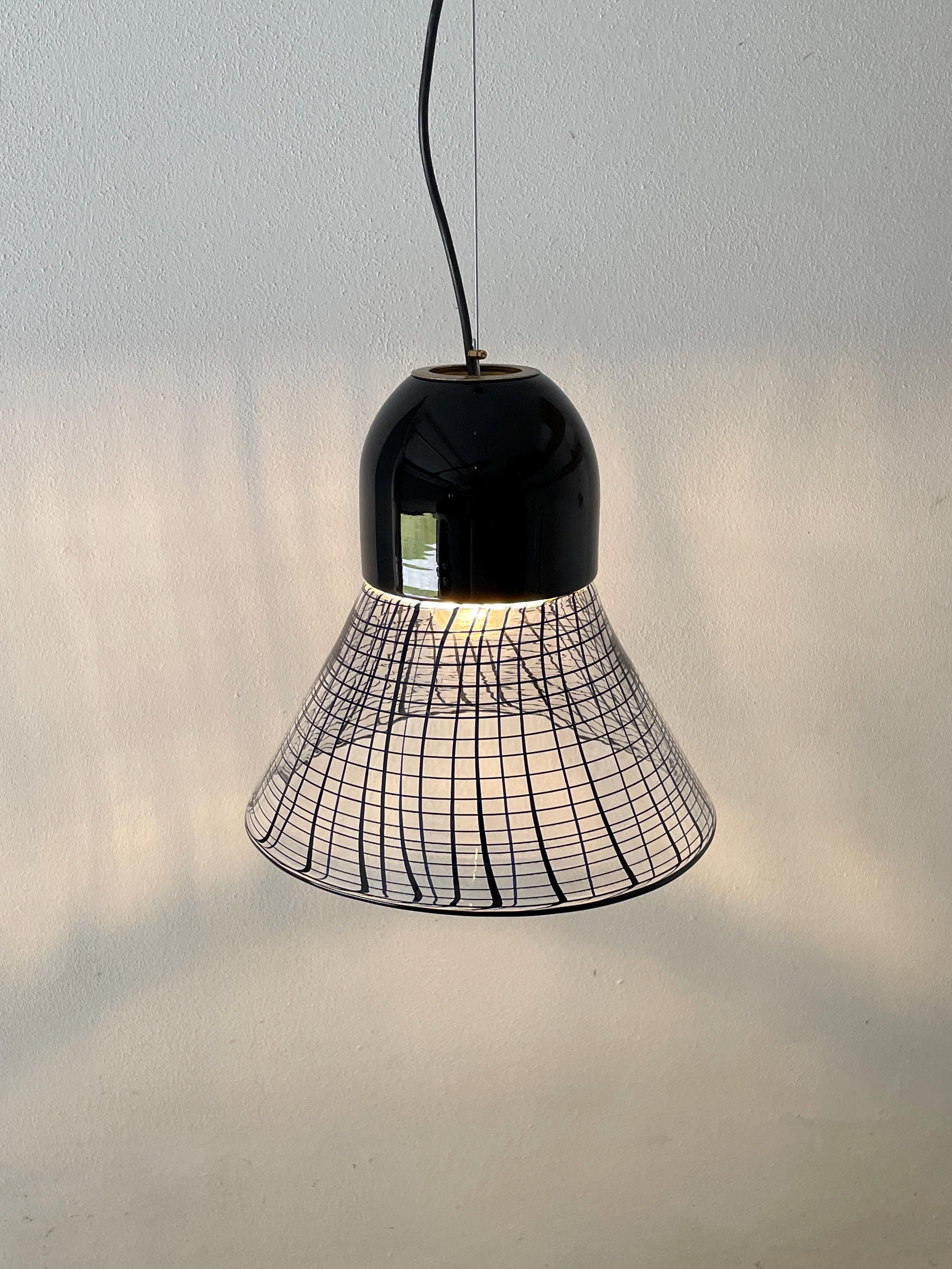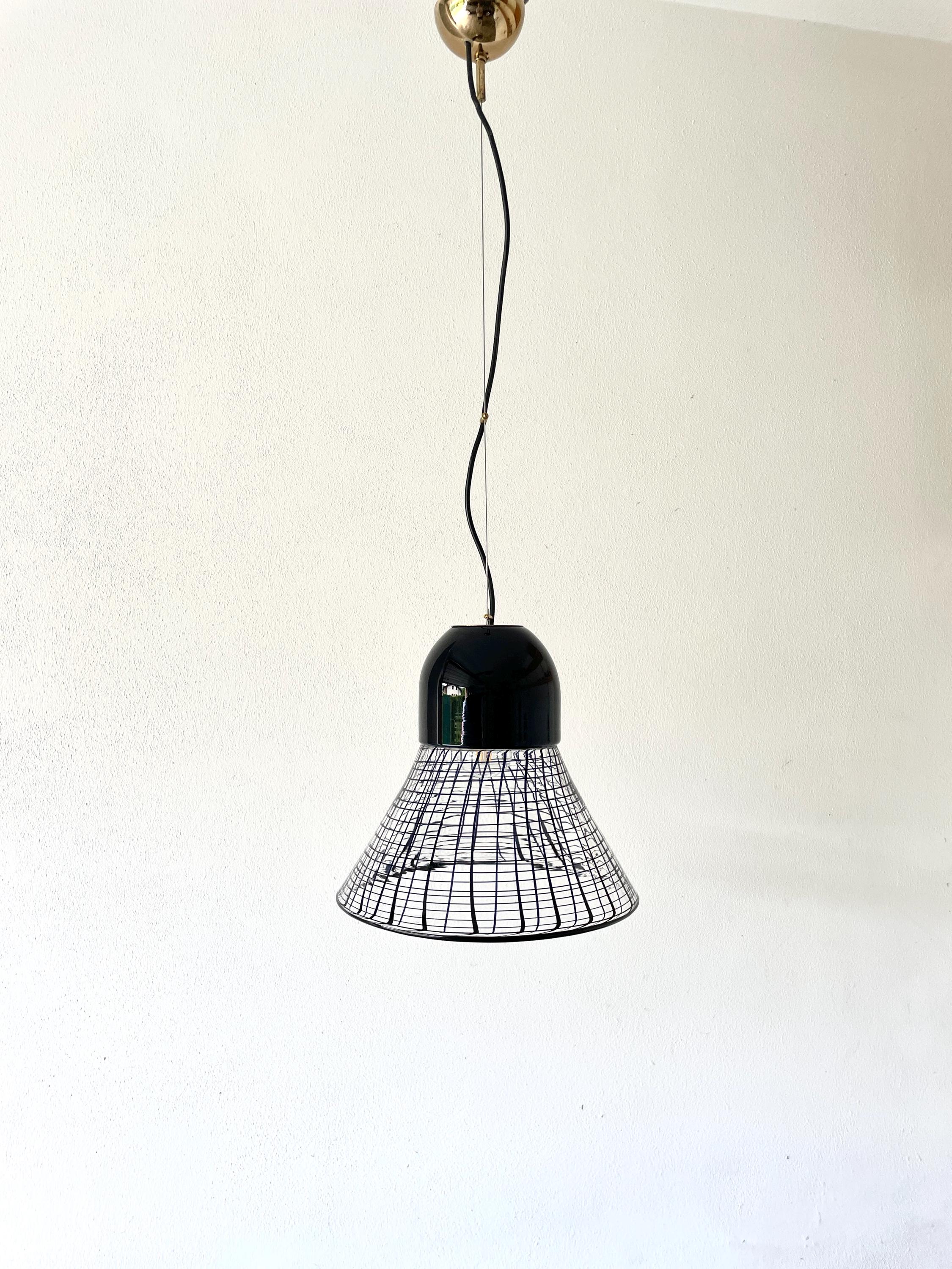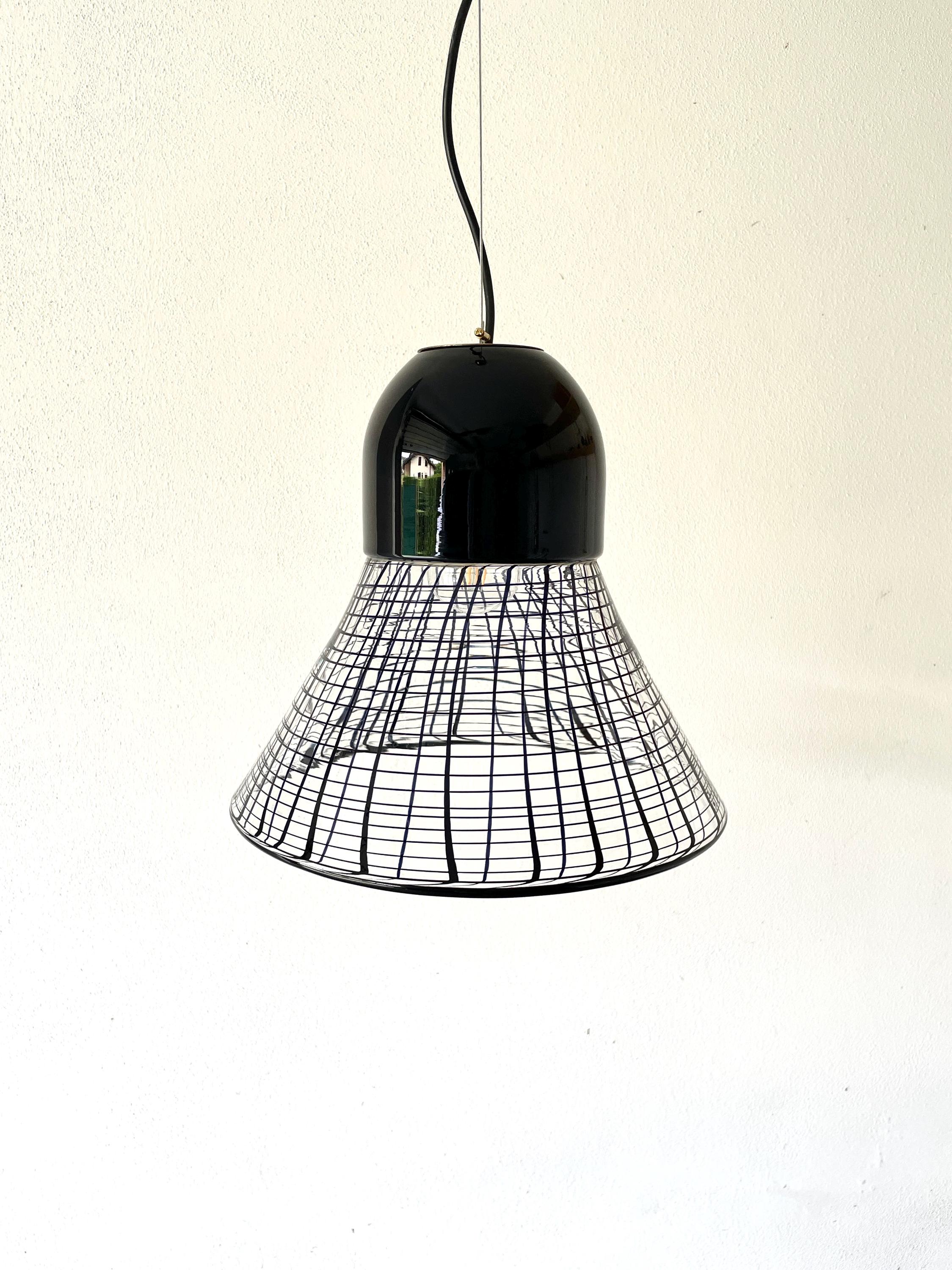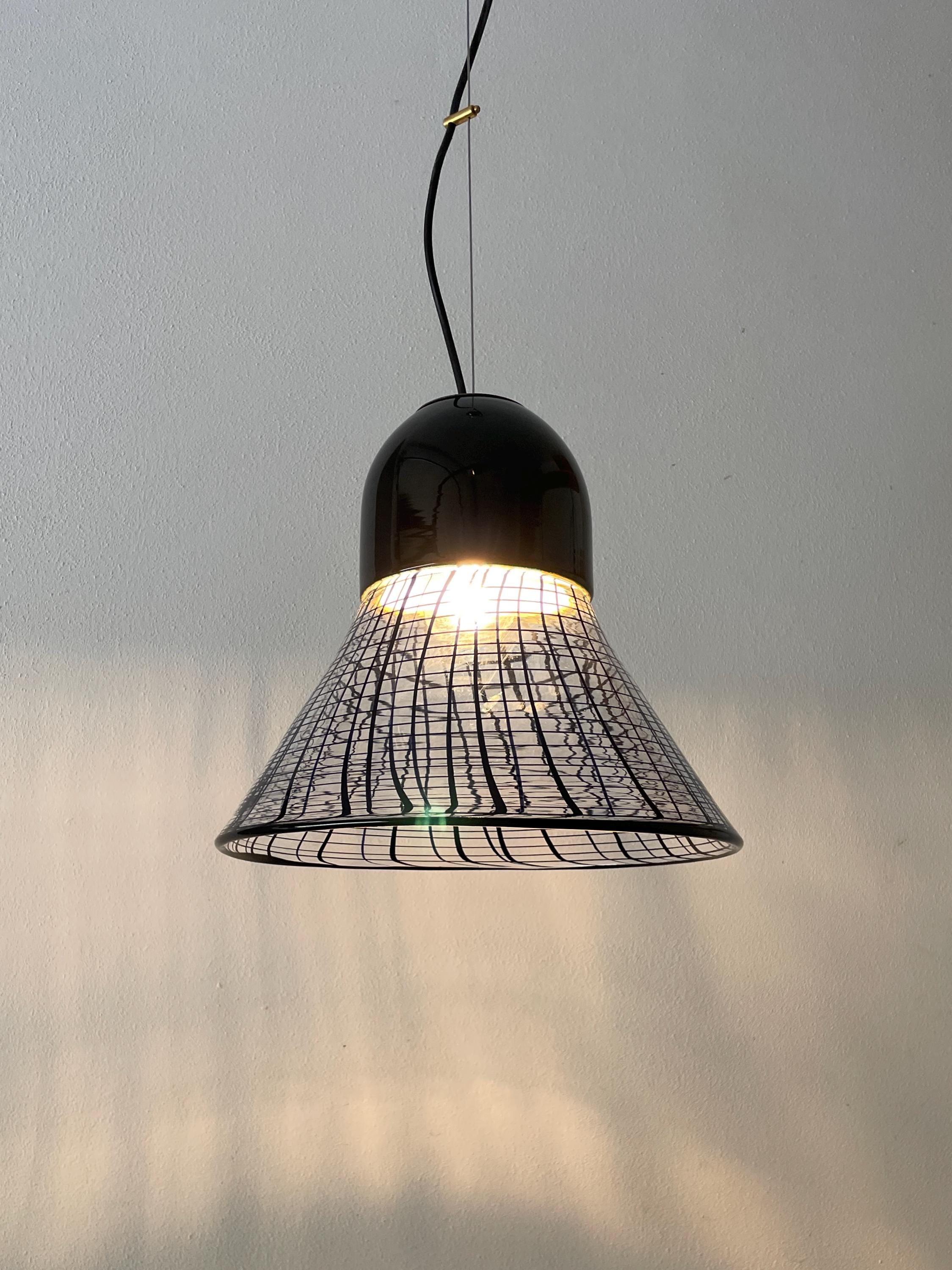 The lamp is completely original, the mouth-blown and hand-worked glass features a black filigree cross-work on the lower part, while the upper part is made of black-colored glass on the outside and white on the inside.