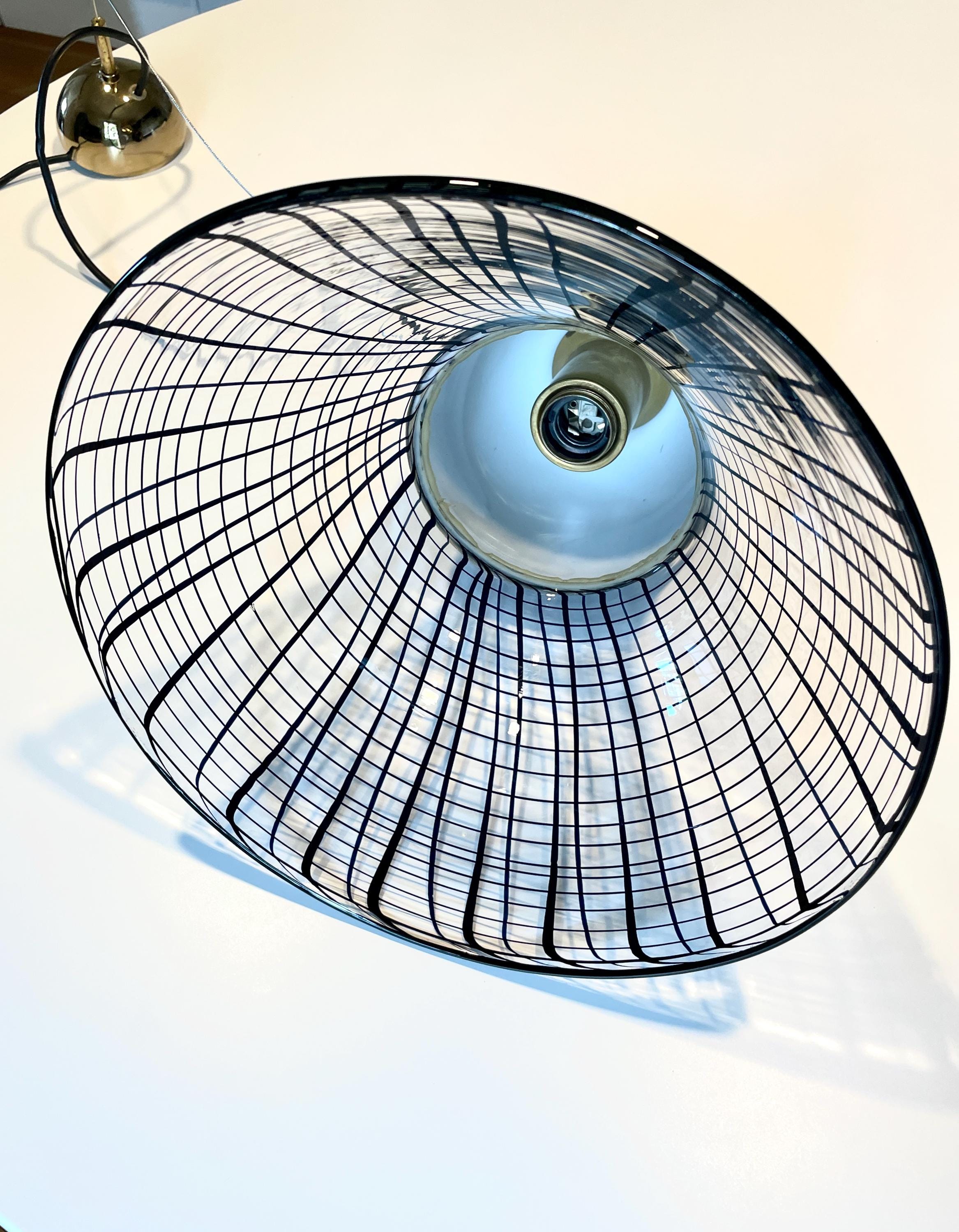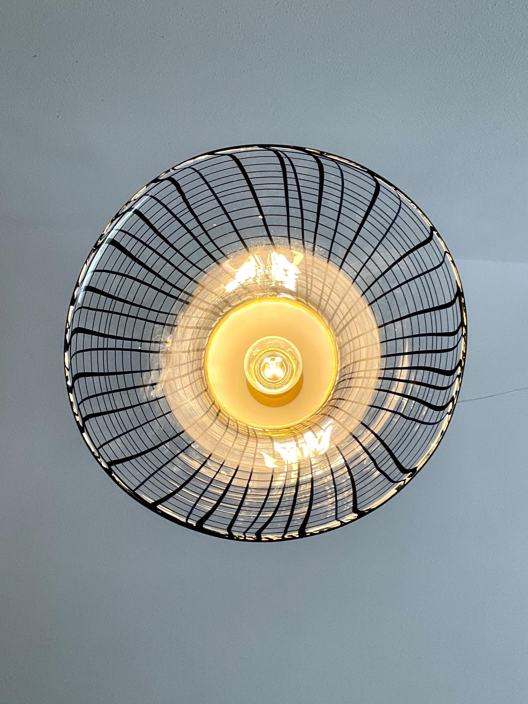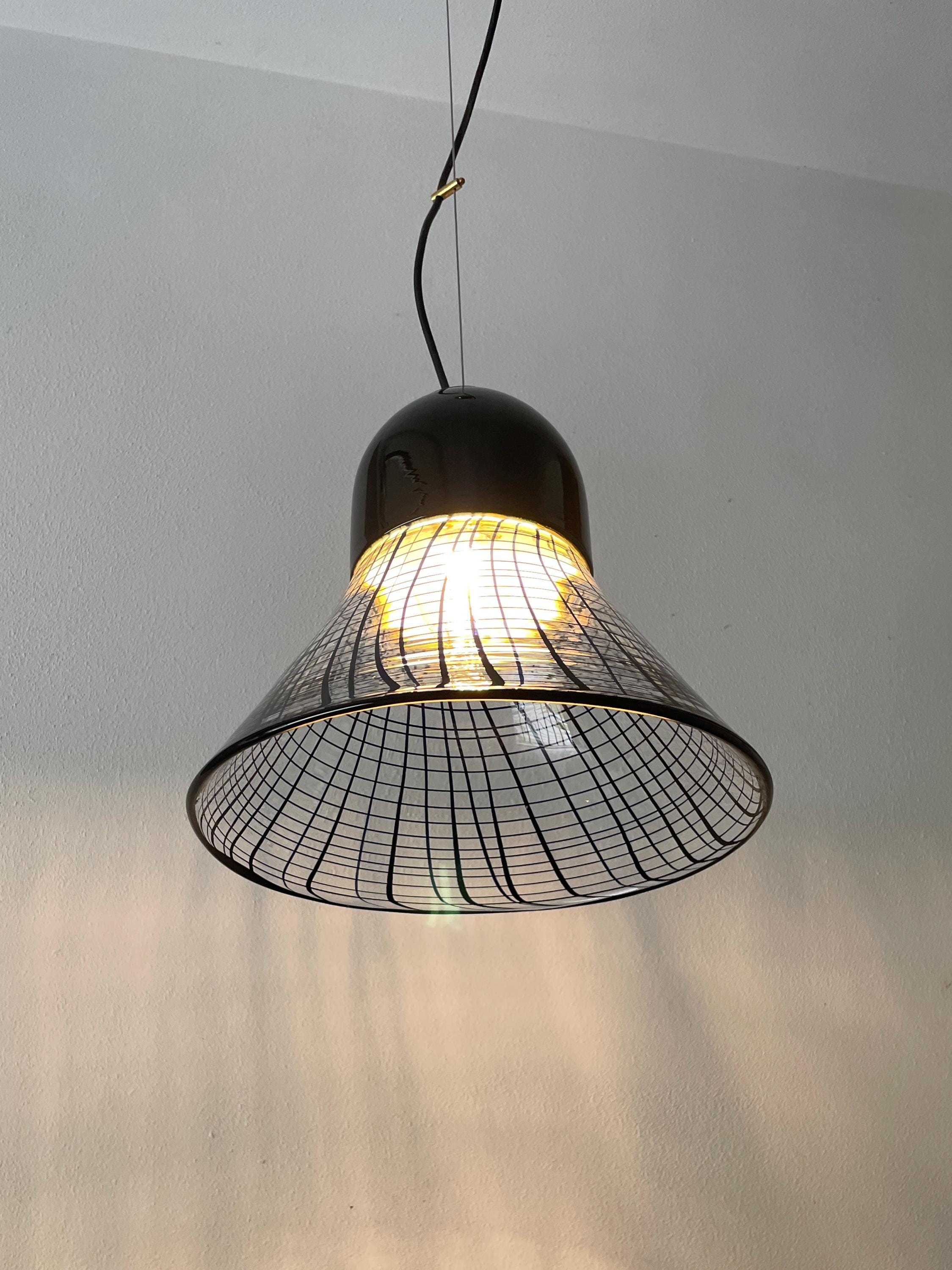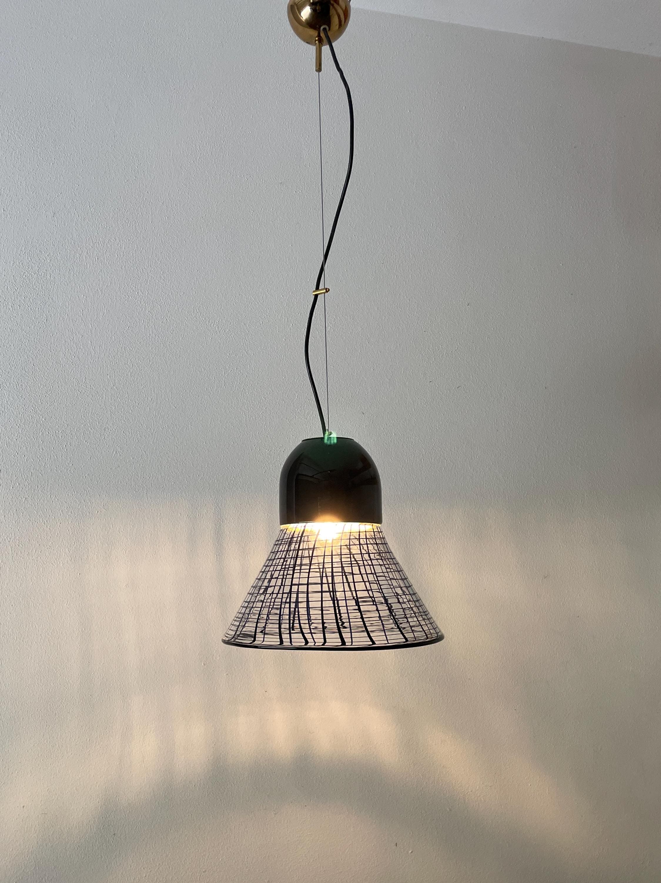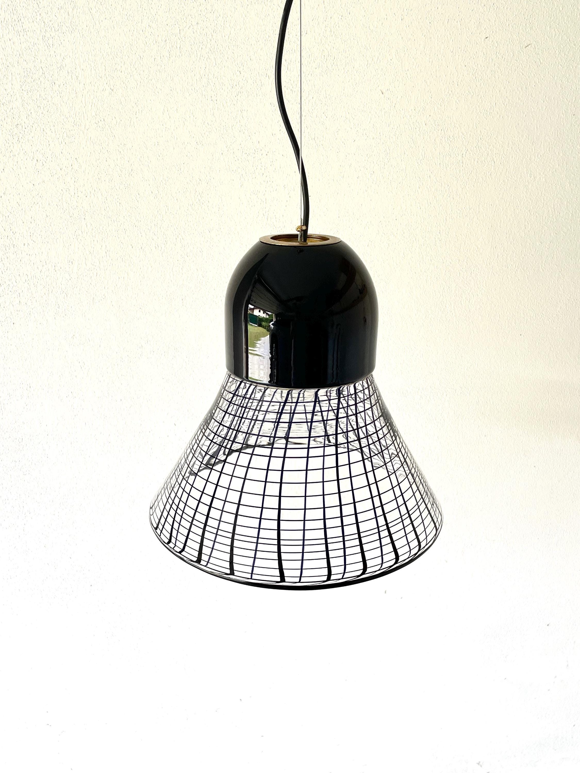 The lamp is completely original, the mouth-blown and hand-worked glass features a black filigree cross-work on the lower part, while the upper part is made of black-colored glass on the outside and white on the inside.