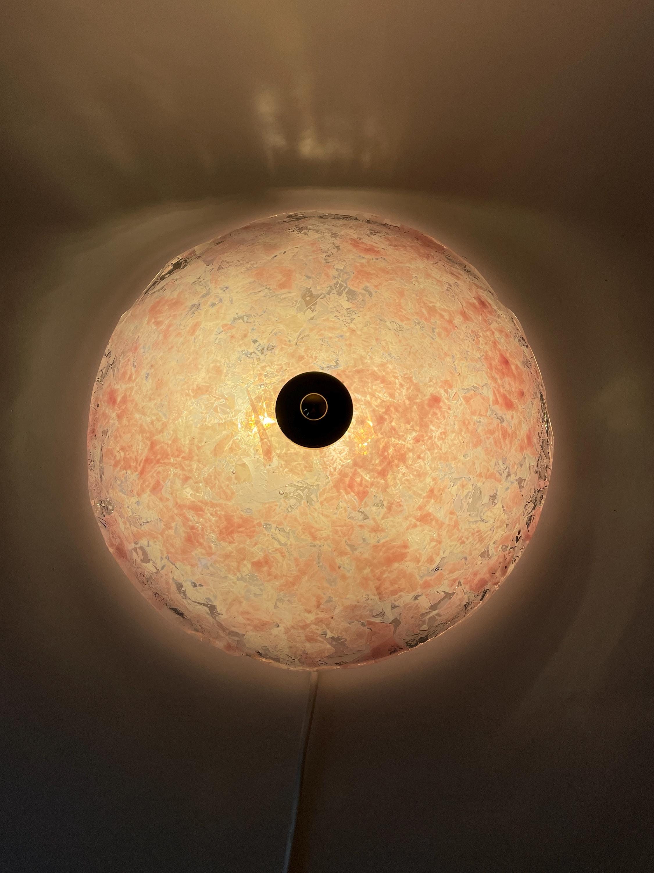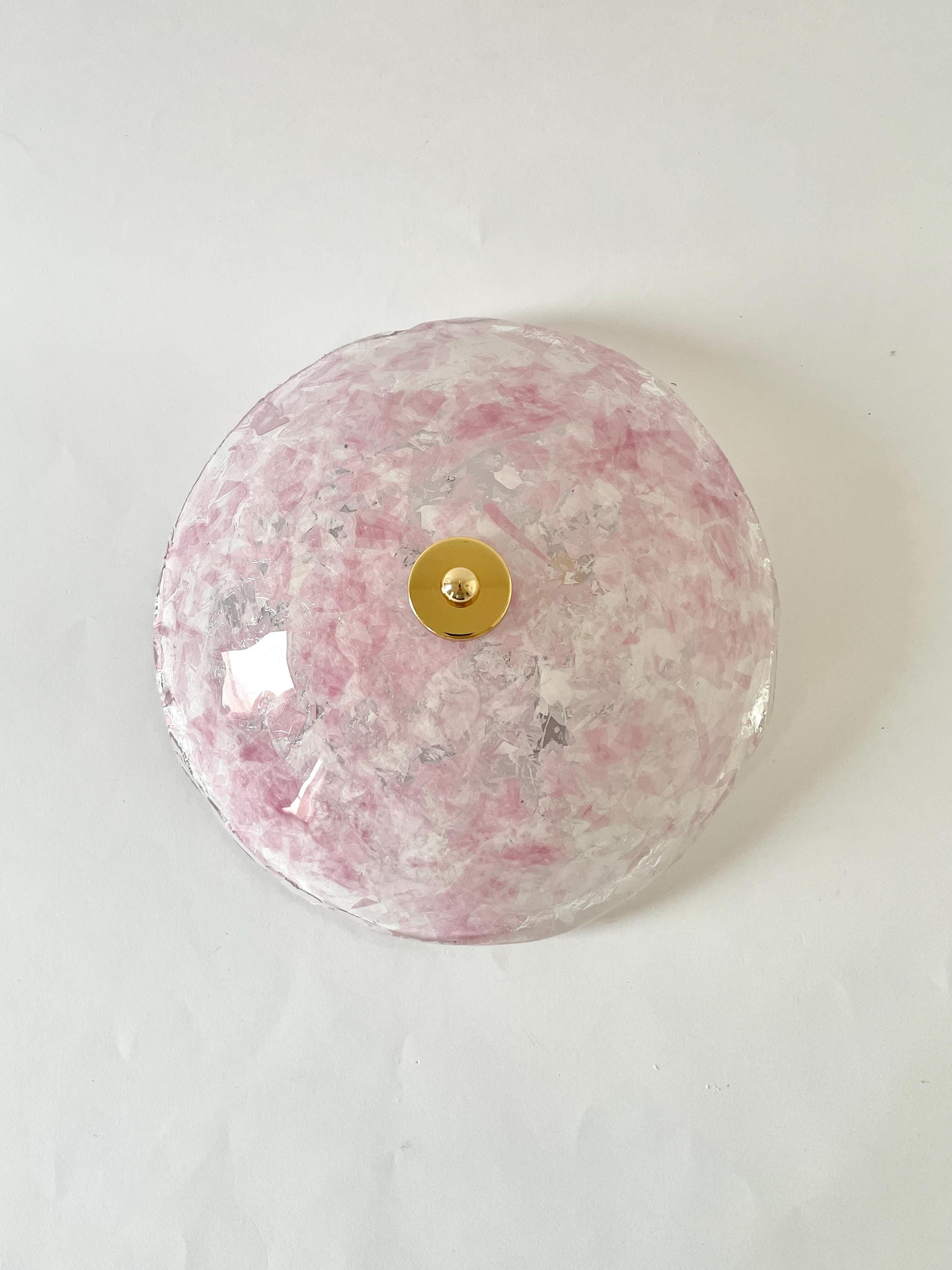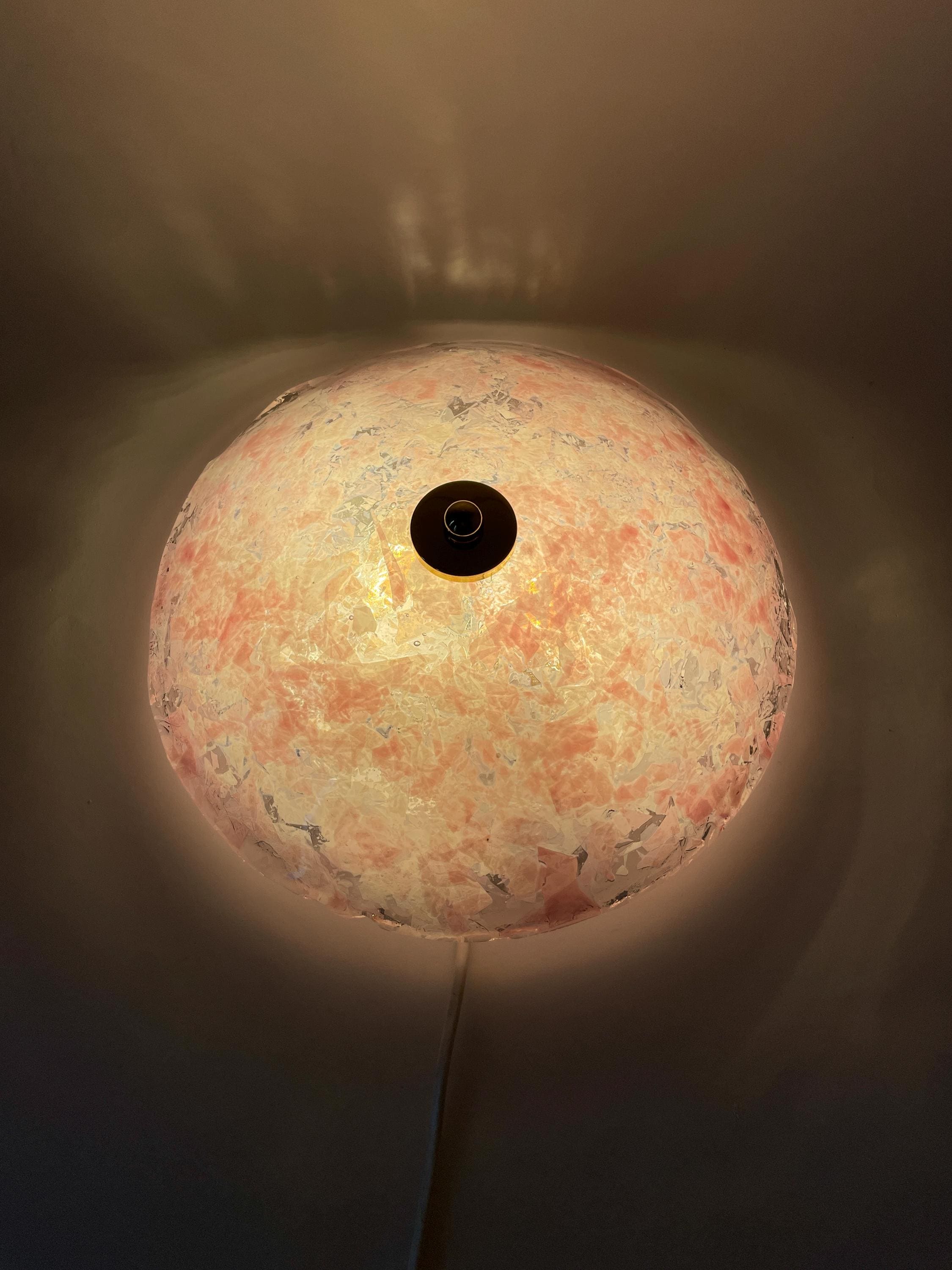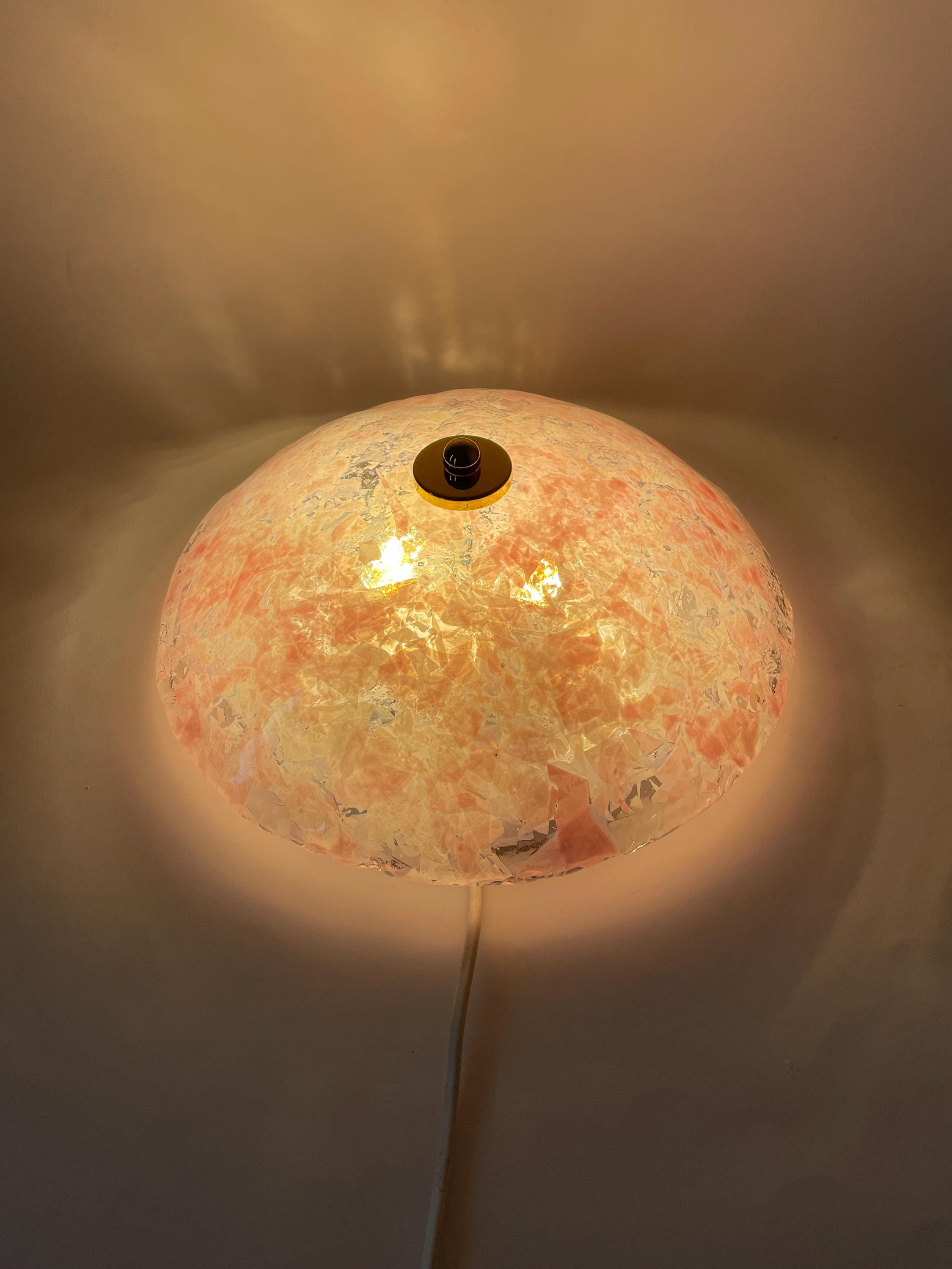 Gorgeous vintage PINK LEAVES Murano glass wall or ceiling lamp, original from the 1990s, with splendid mouth-blown and hand-crafted glass with an infinite pink glass leaf motif on a crystal background, beautiful diffused light effect.