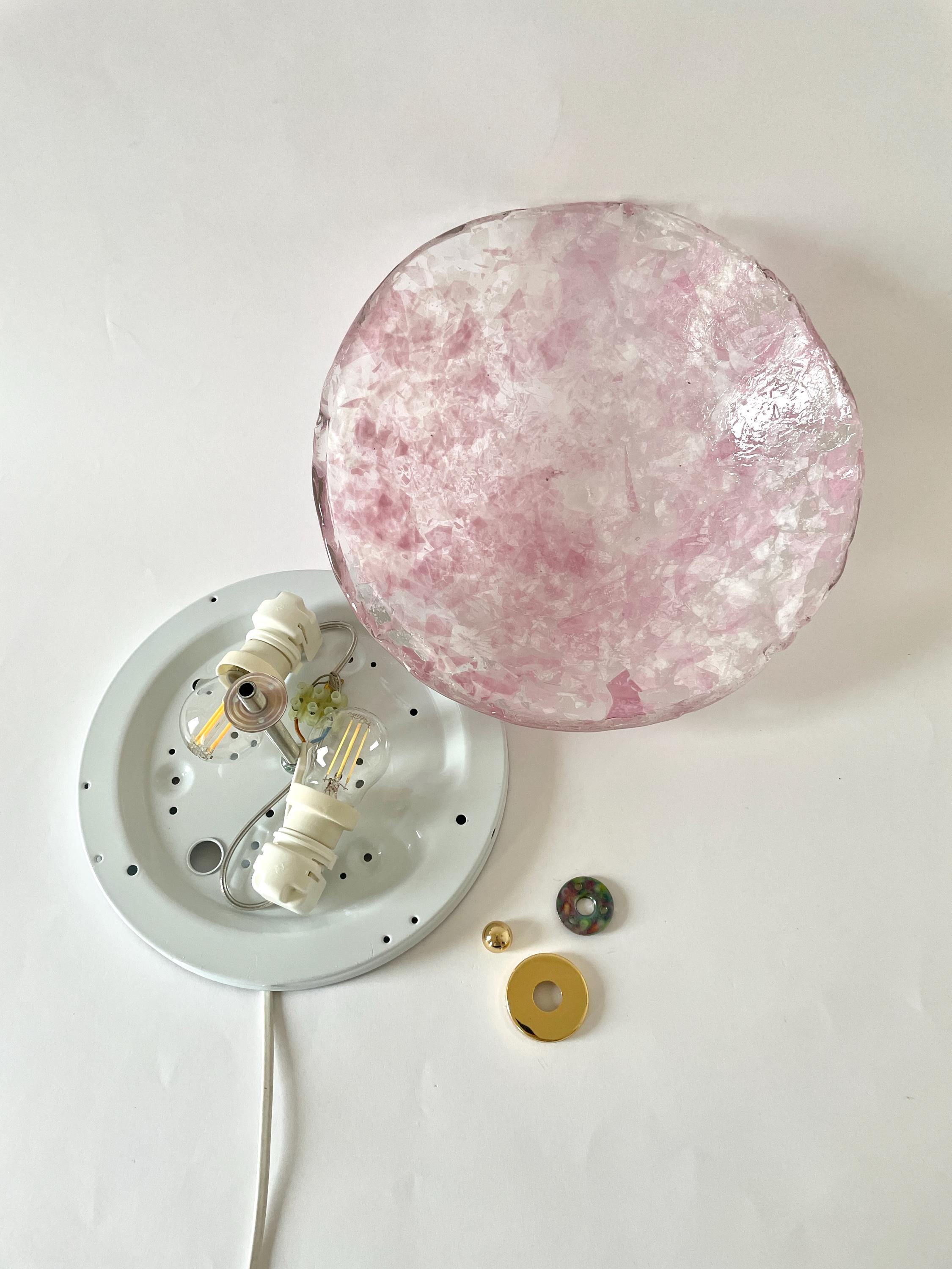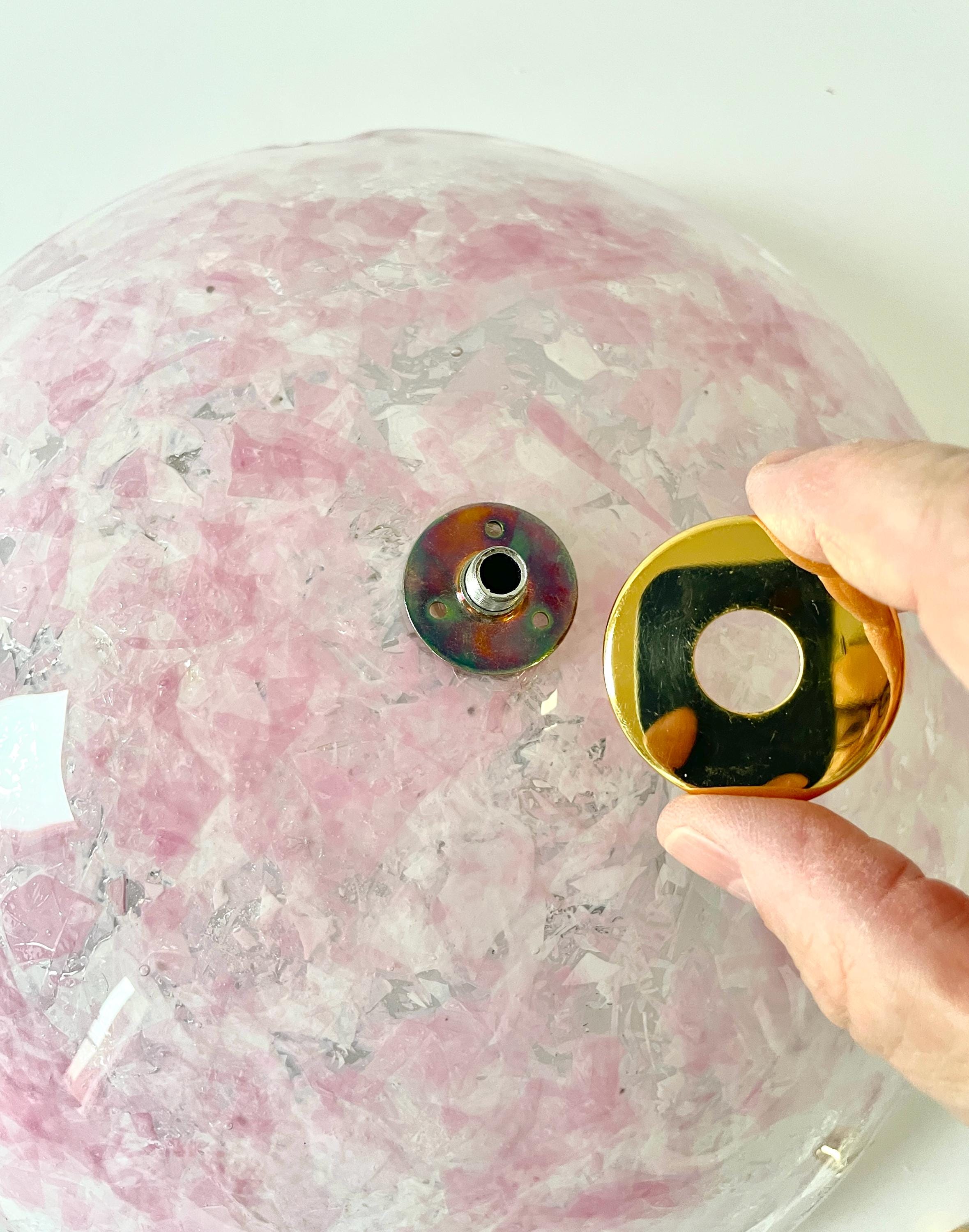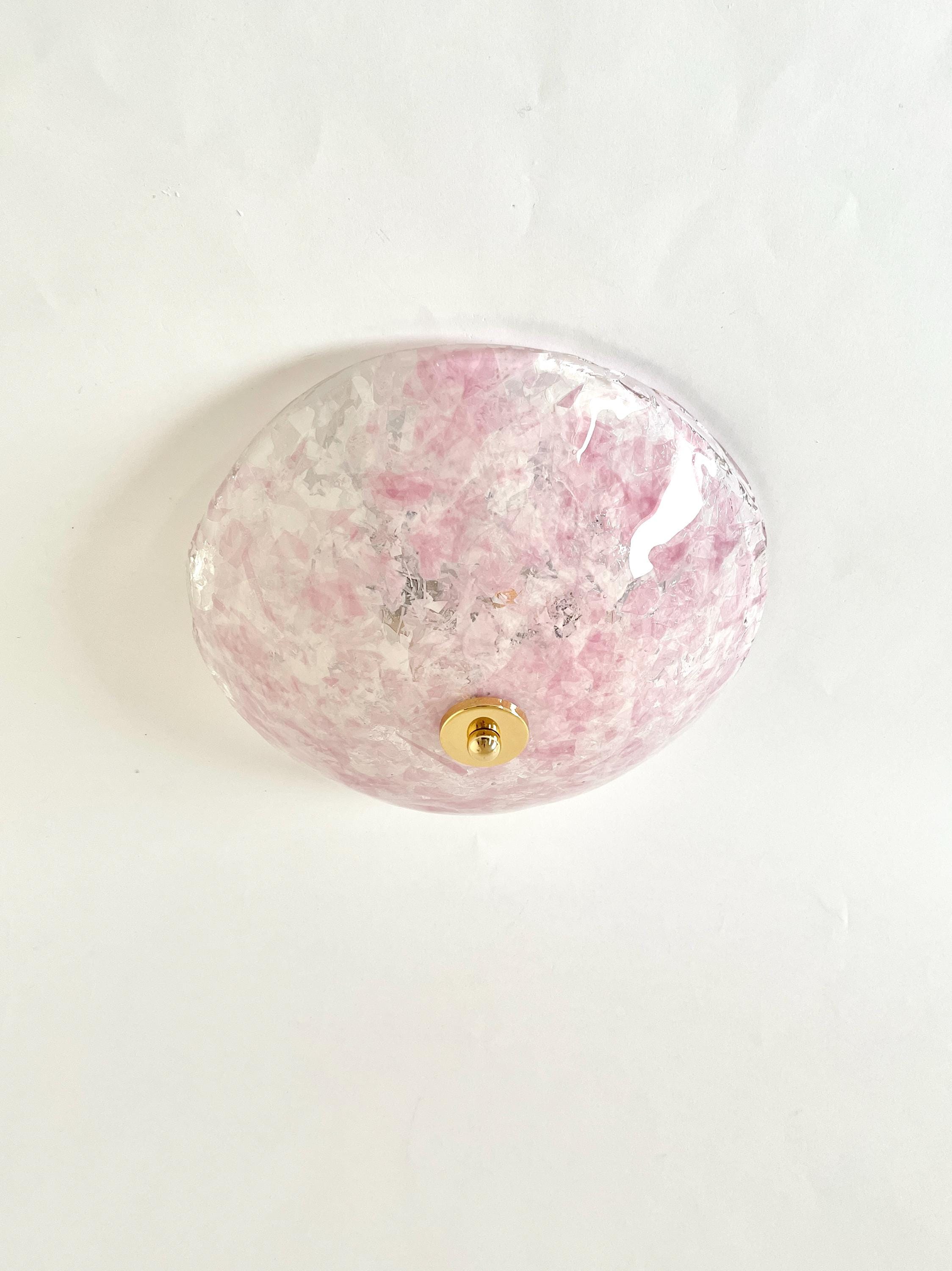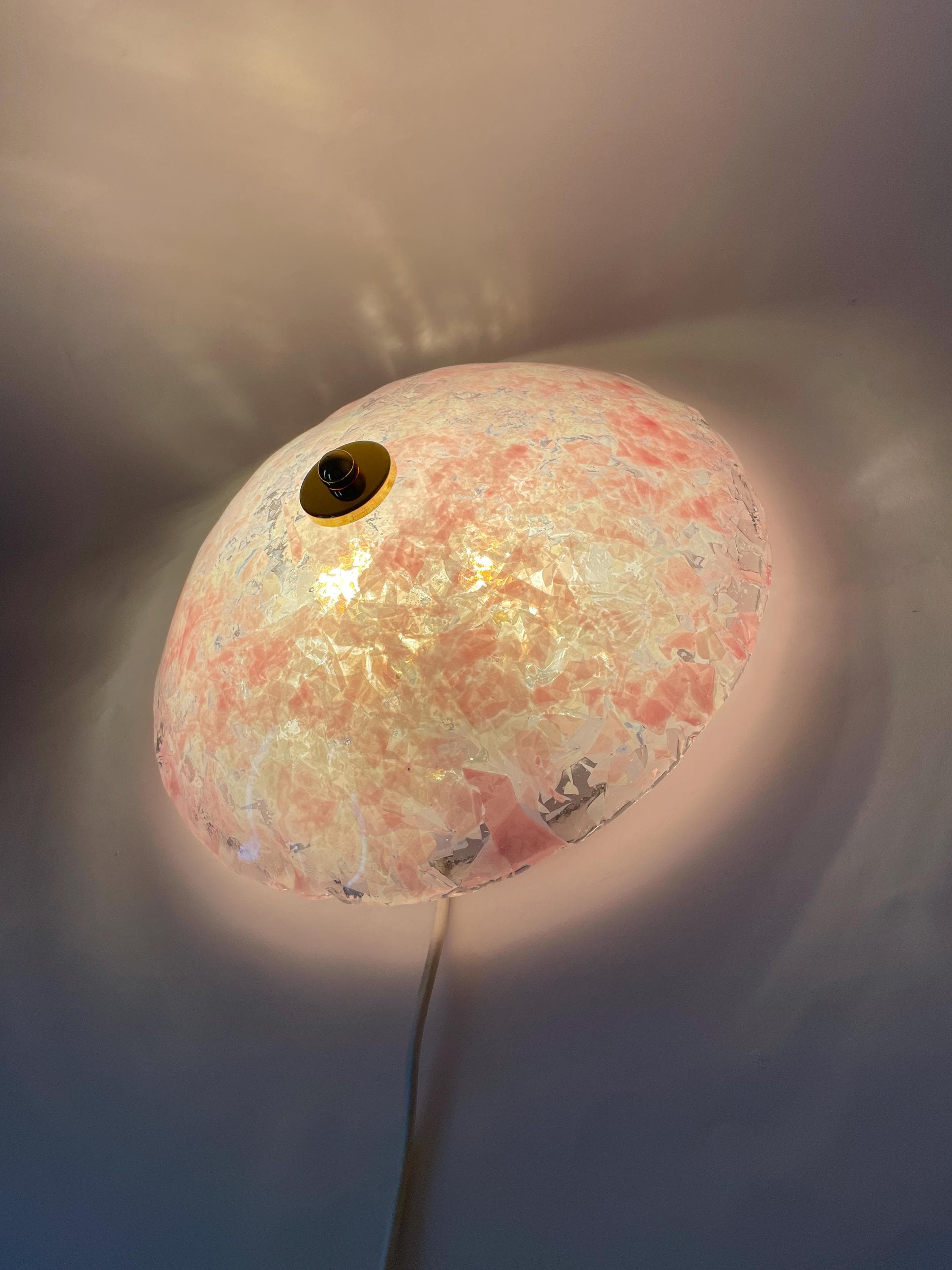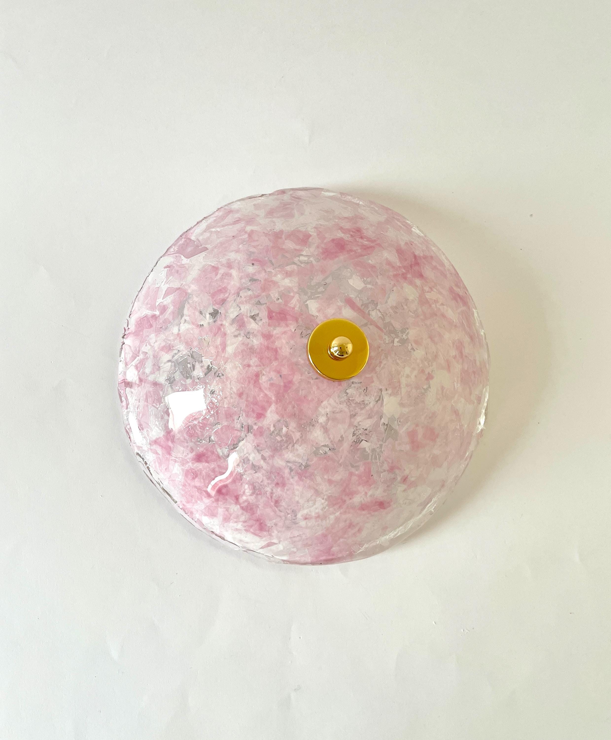 Gorgeous vintage PINK LEAVES Murano glass wall or ceiling lamp, original from the 1990s, with splendid mouth-blown and hand-crafted glass with an infinite pink glass leaf motif on a crystal background, beautiful diffused light effect.