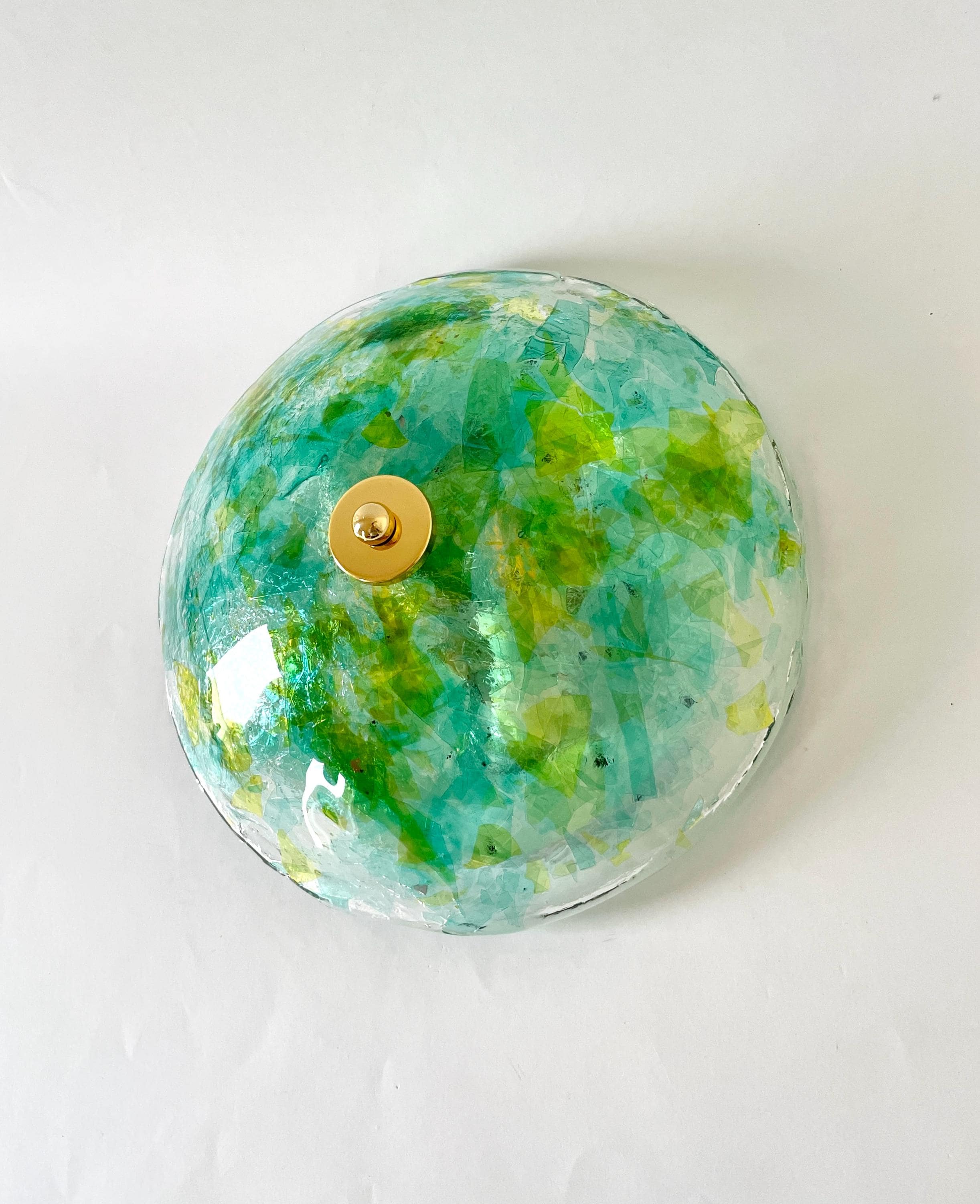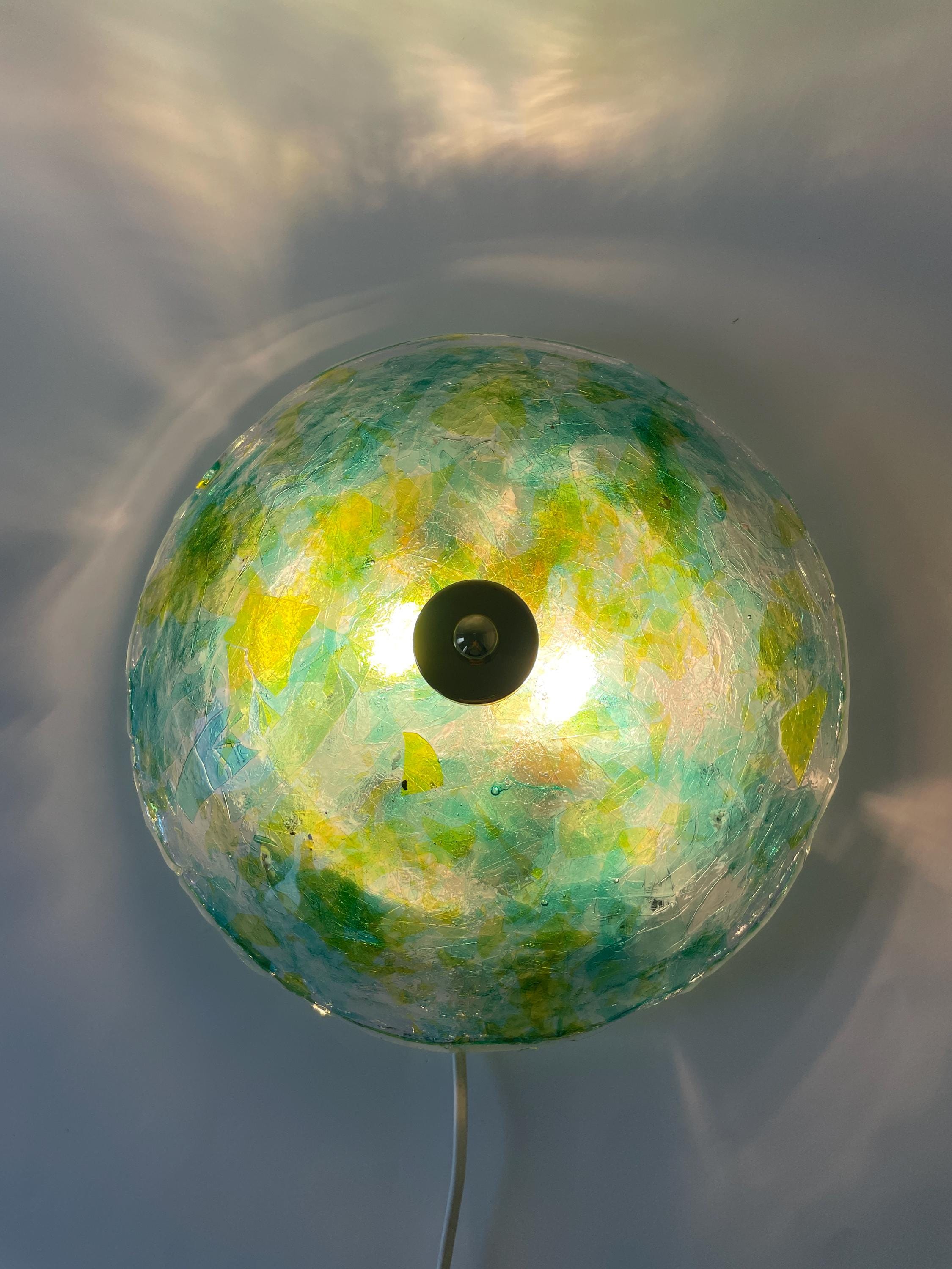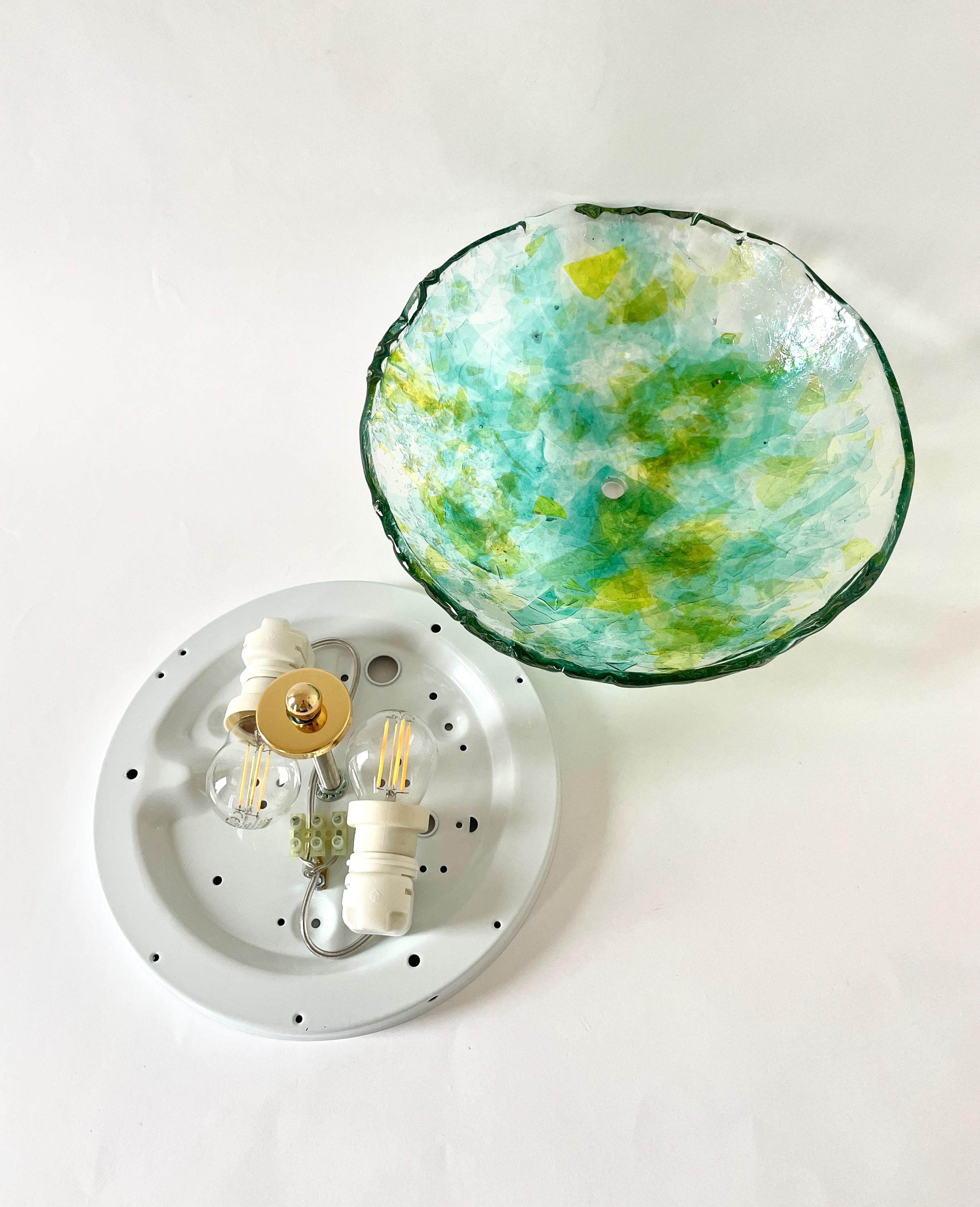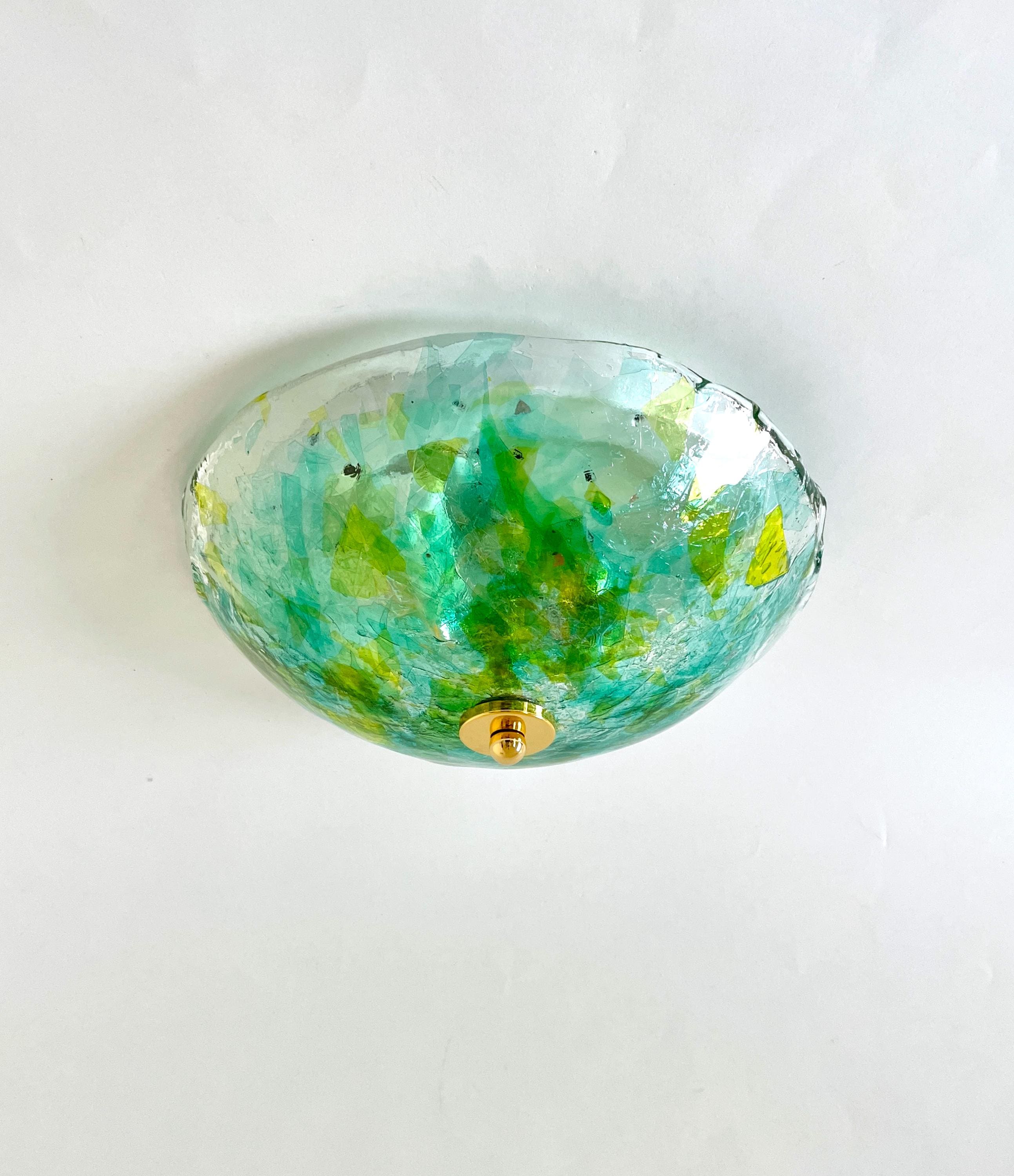 Gorgeous vintage GREEN LEAVES Murano glass wall or ceiling lamp, original from the 1990s, with splendid mouth-blown and hand-crafted glass with an infinite green glass leaf motif on a crystal background, beautiful diffused light effect.
