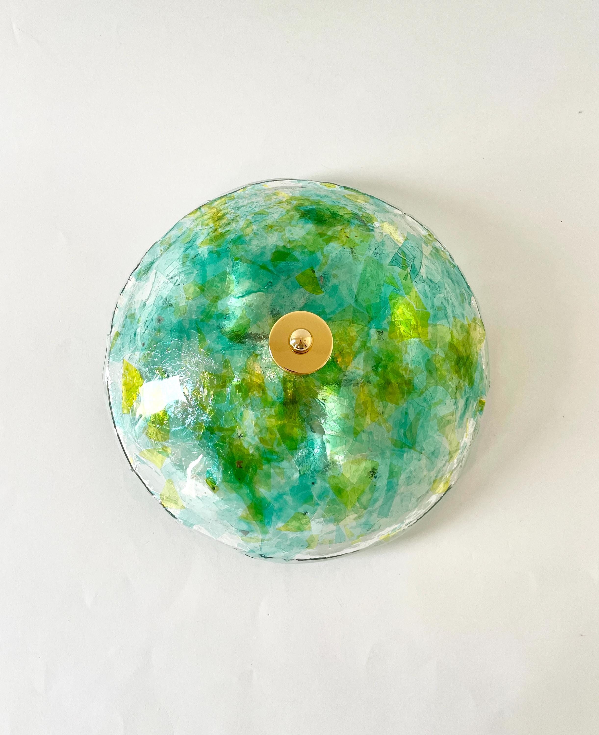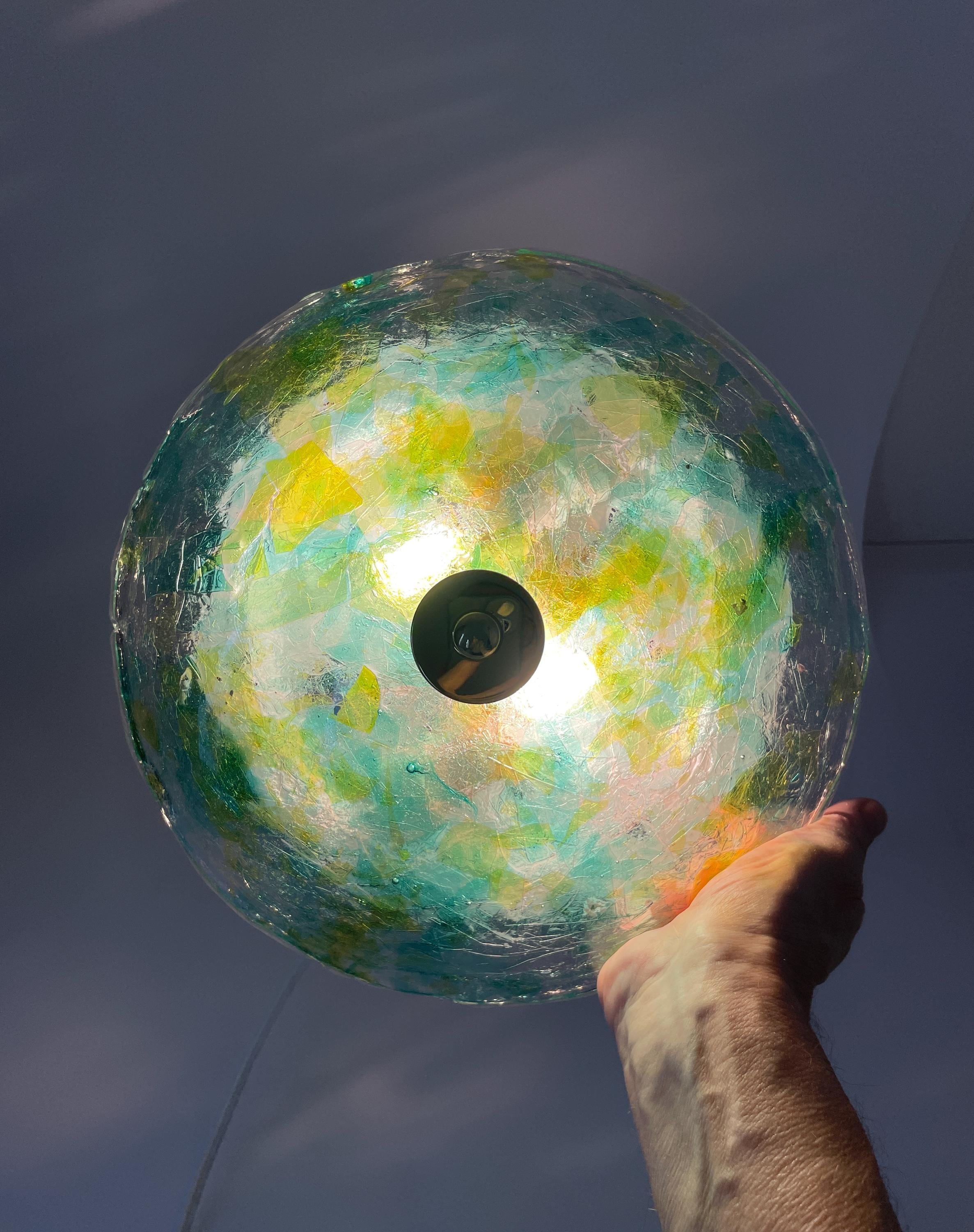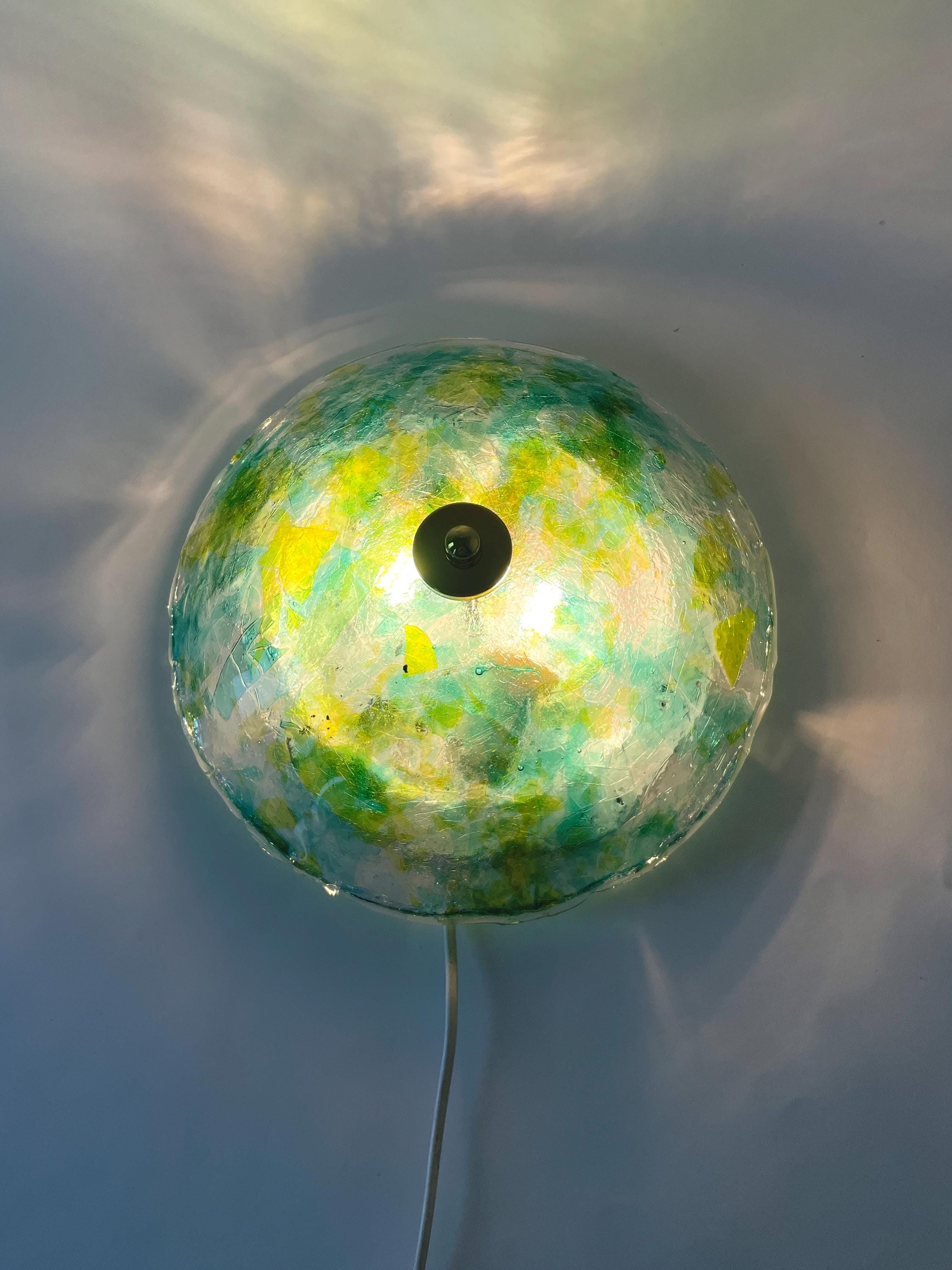 Gorgeous vintage GREEN LEAVES Murano glass wall or ceiling lamp, original from the 1990s, with splendid mouth-blown and hand-crafted glass with an infinite green glass leaf motif on a crystal background, beautiful diffused light effect.
