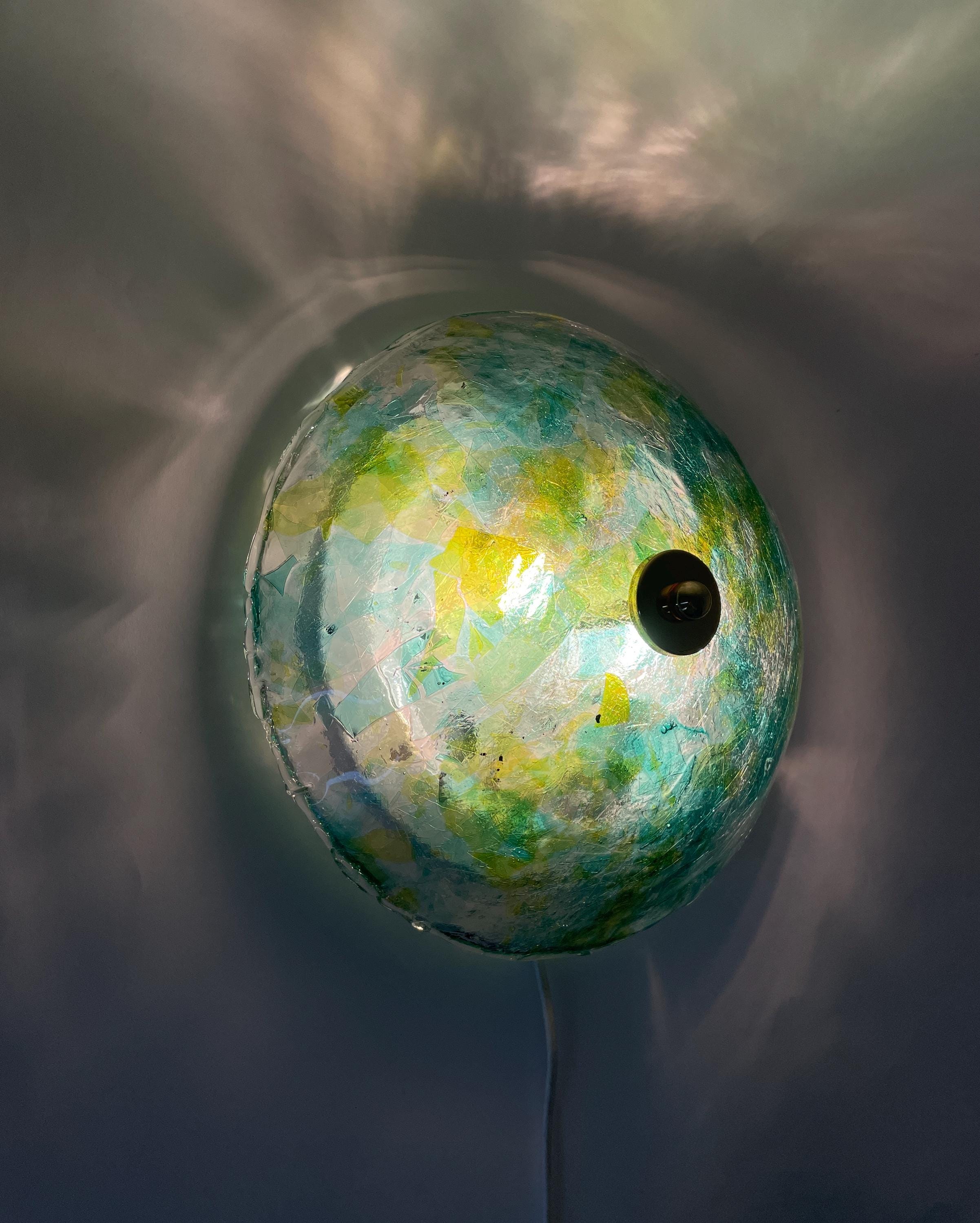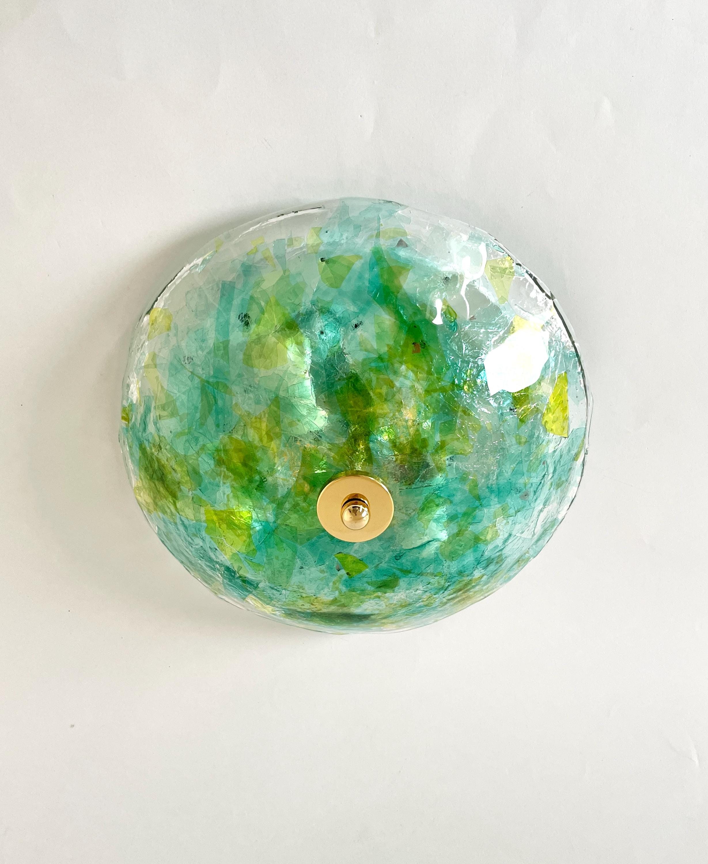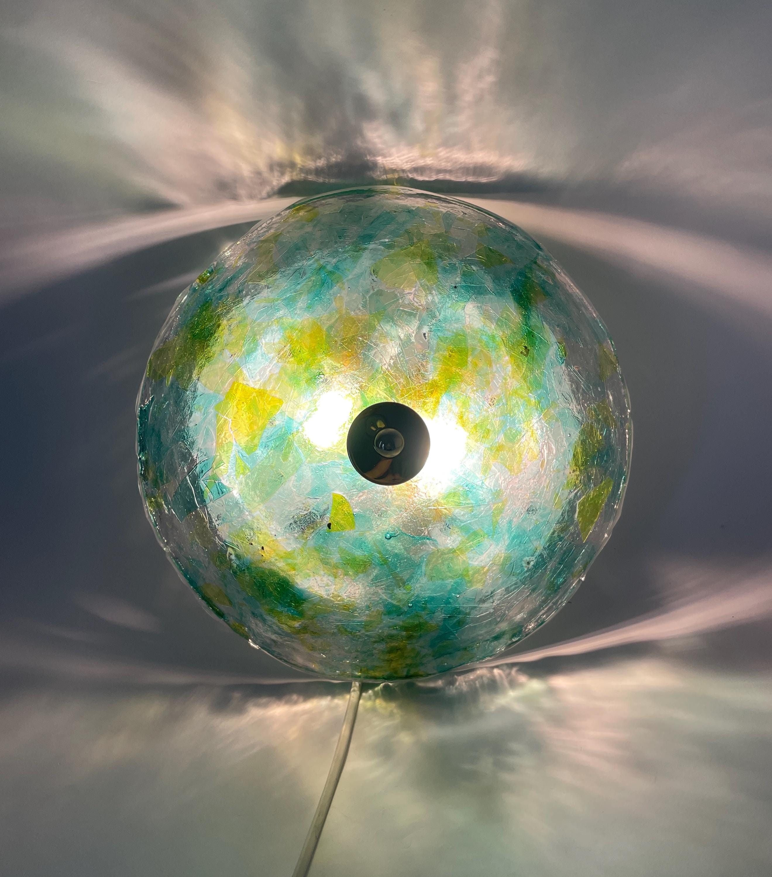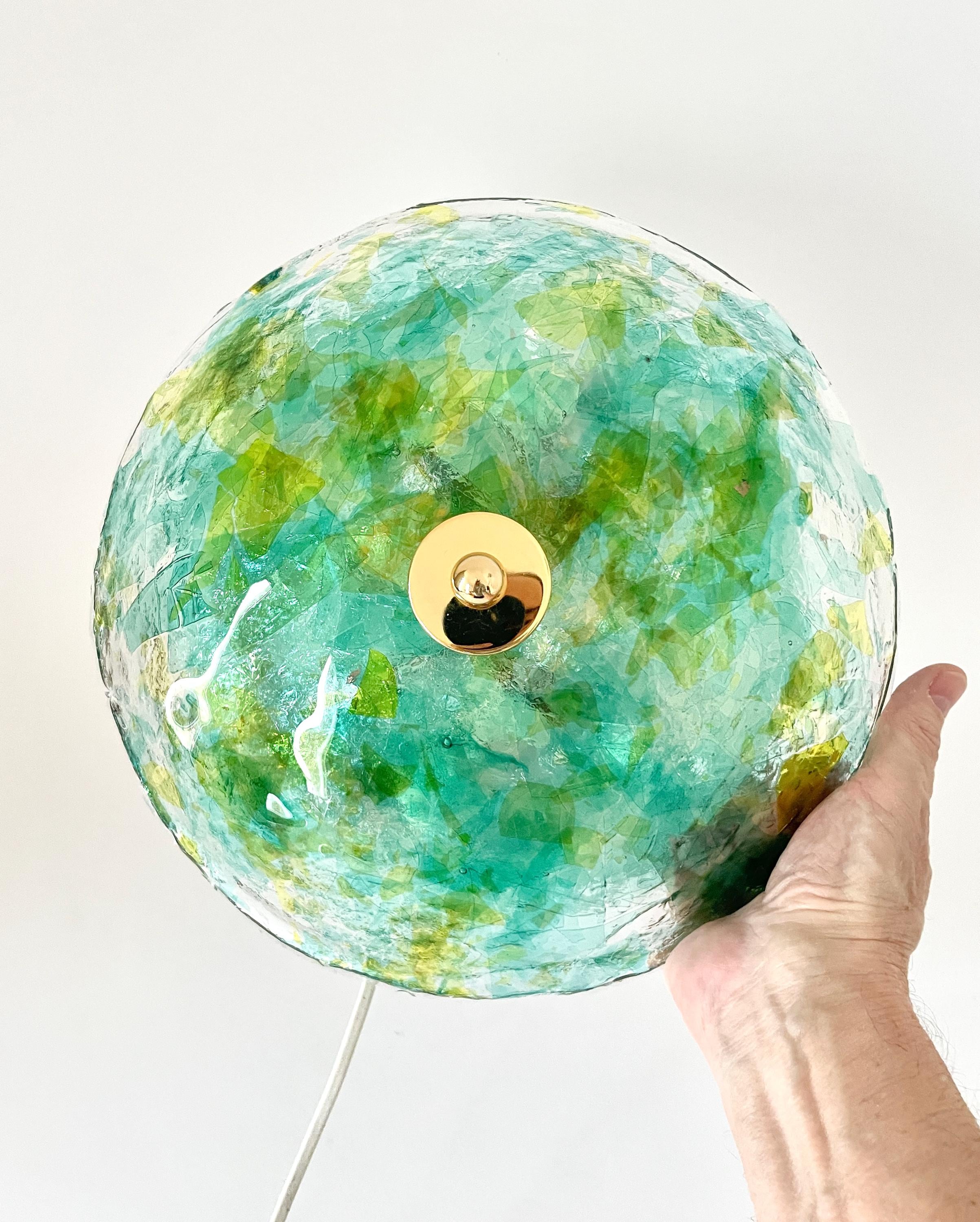 Gorgeous vintage GREEN LEAVES Murano glass wall or ceiling lamp, original from the 1990s, with splendid mouth-blown and hand-crafted glass with an infinite green glass leaf motif on a crystal background, beautiful diffused light effect.