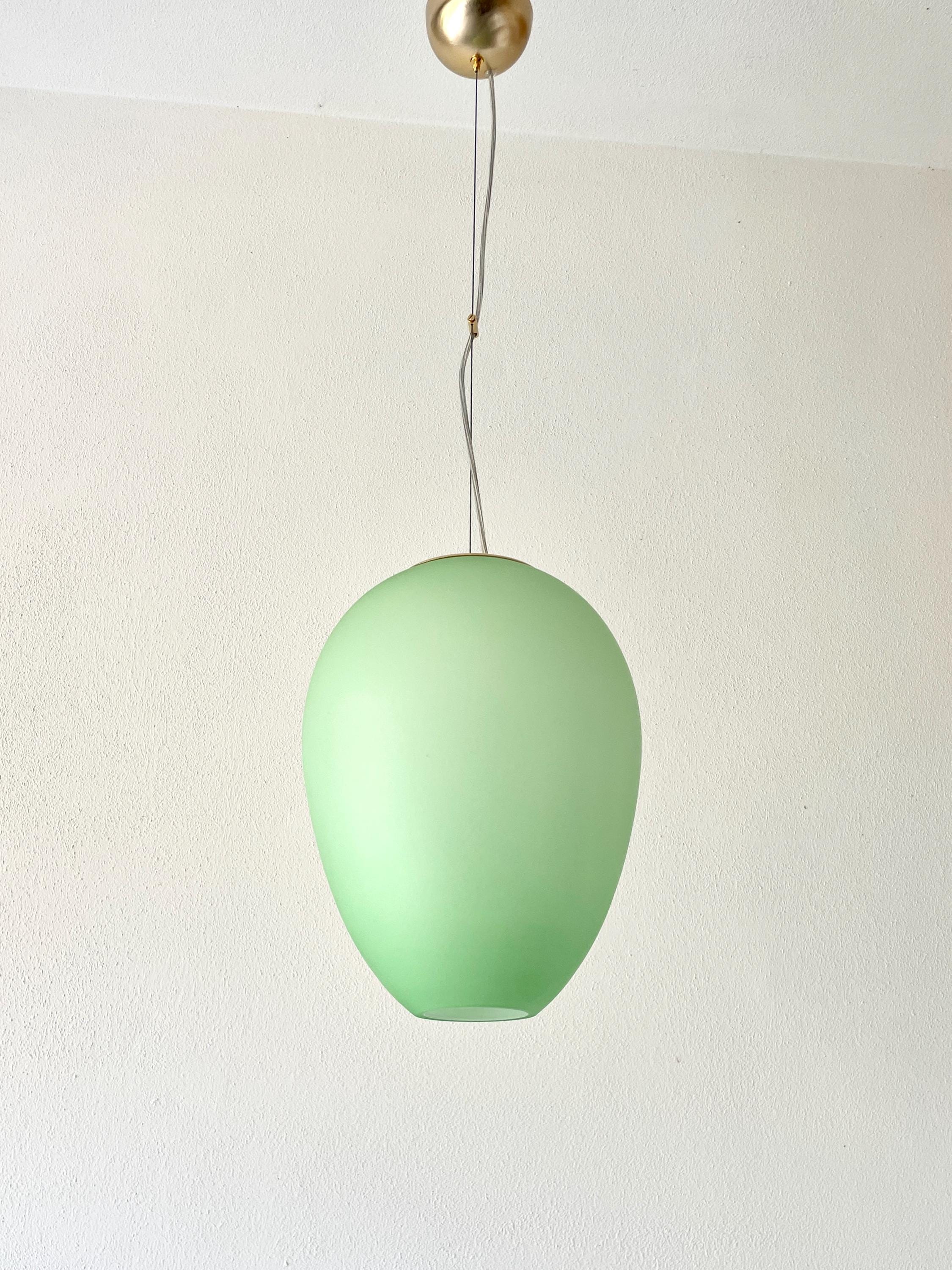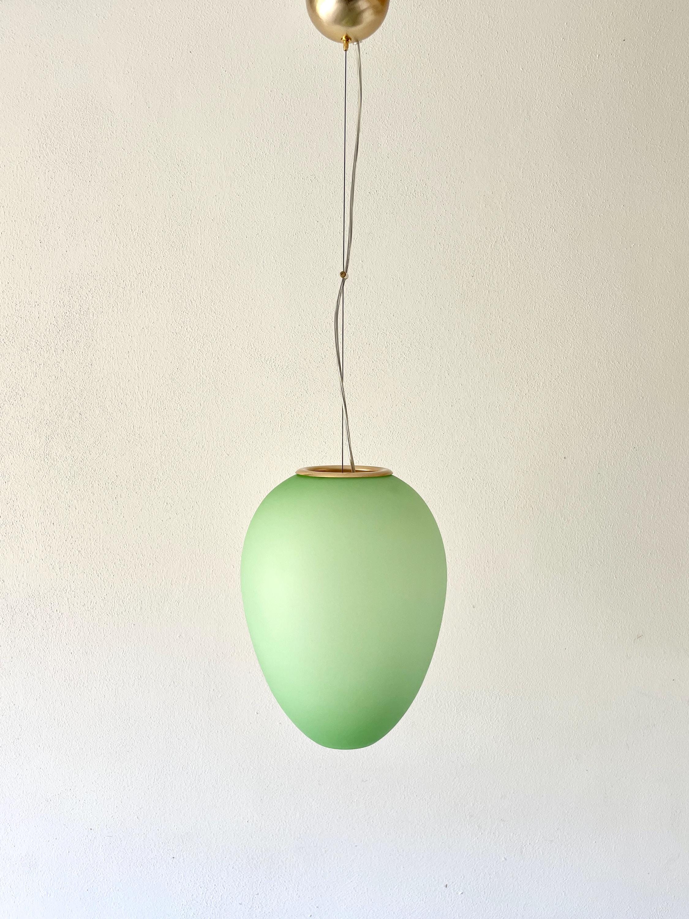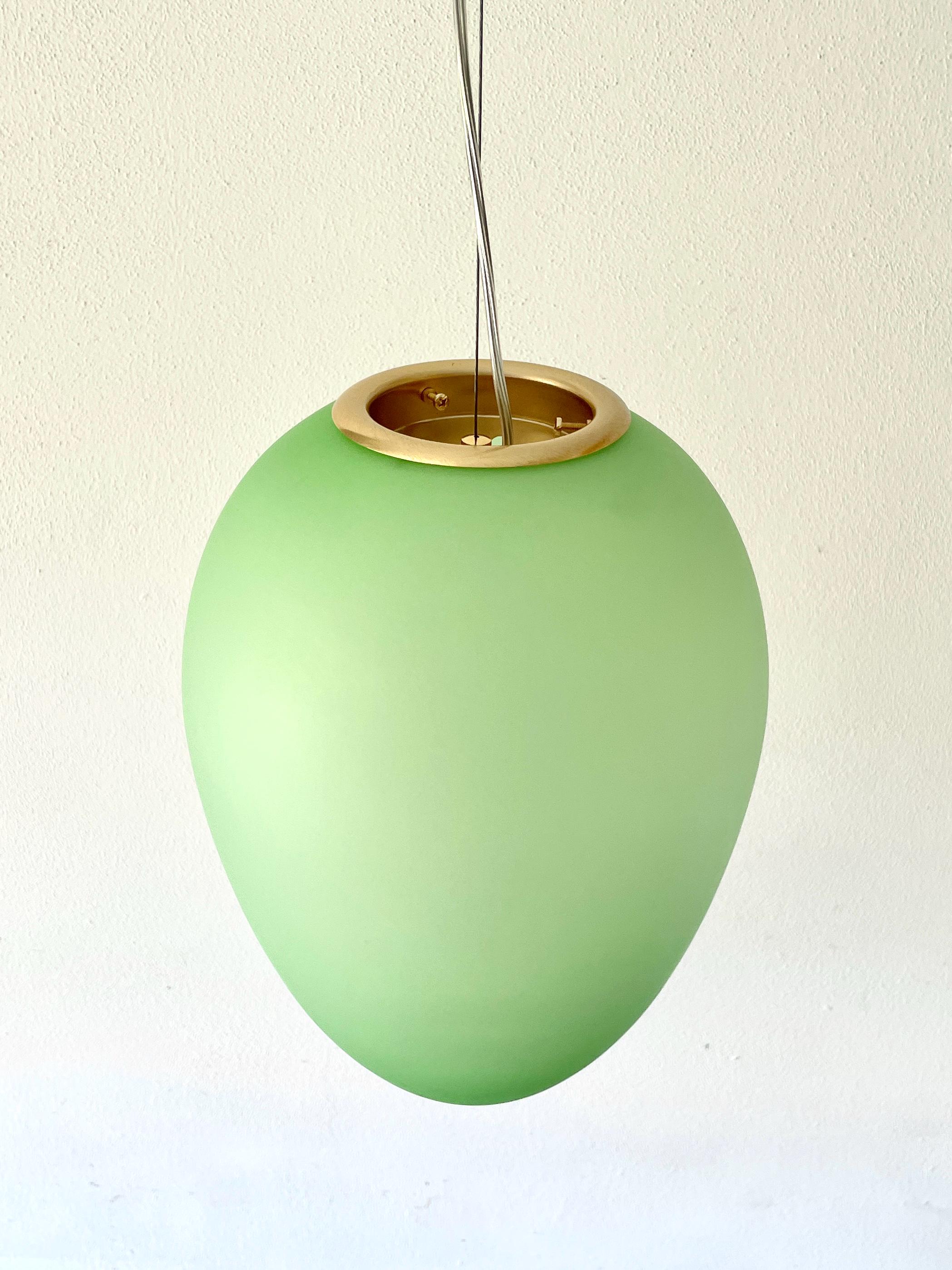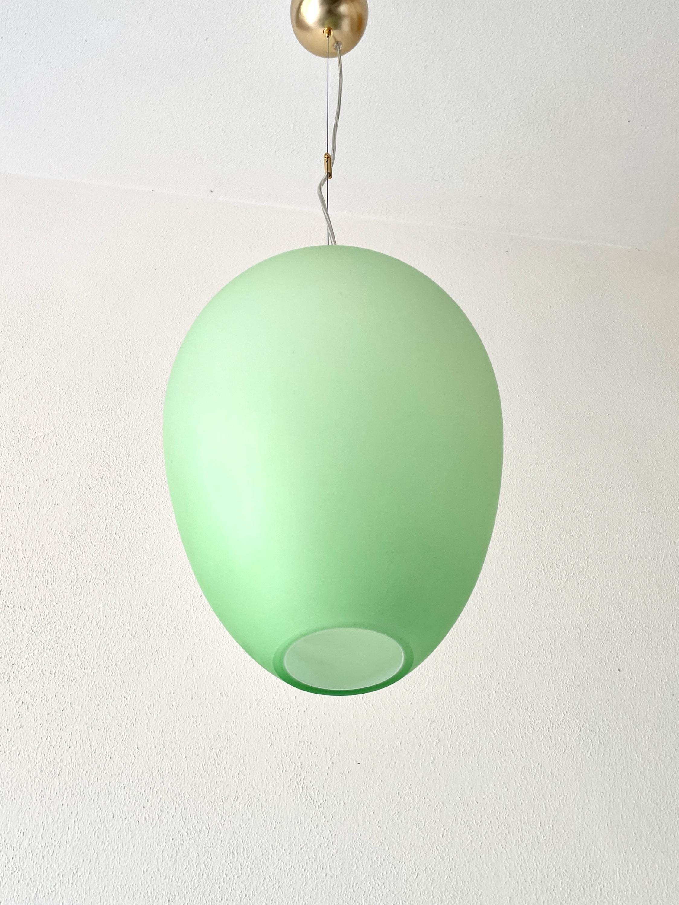 This stunning GREEN EGG Murano glass chandelier by SELENE is vintage, from the 1990s but never used. The beautiful, hand-blown, layered glass adds elegance and understated elegance to any room, creating a beautiful luminous atmosphere. The frame is satin gold, but is also available in satin chrome.