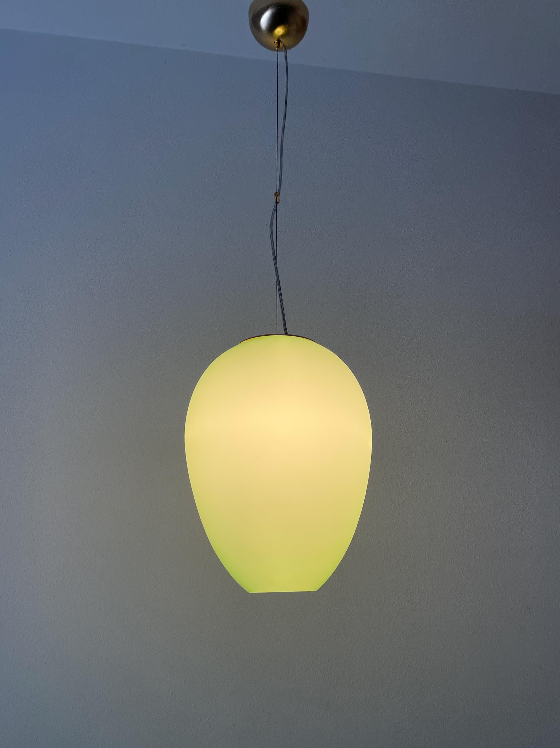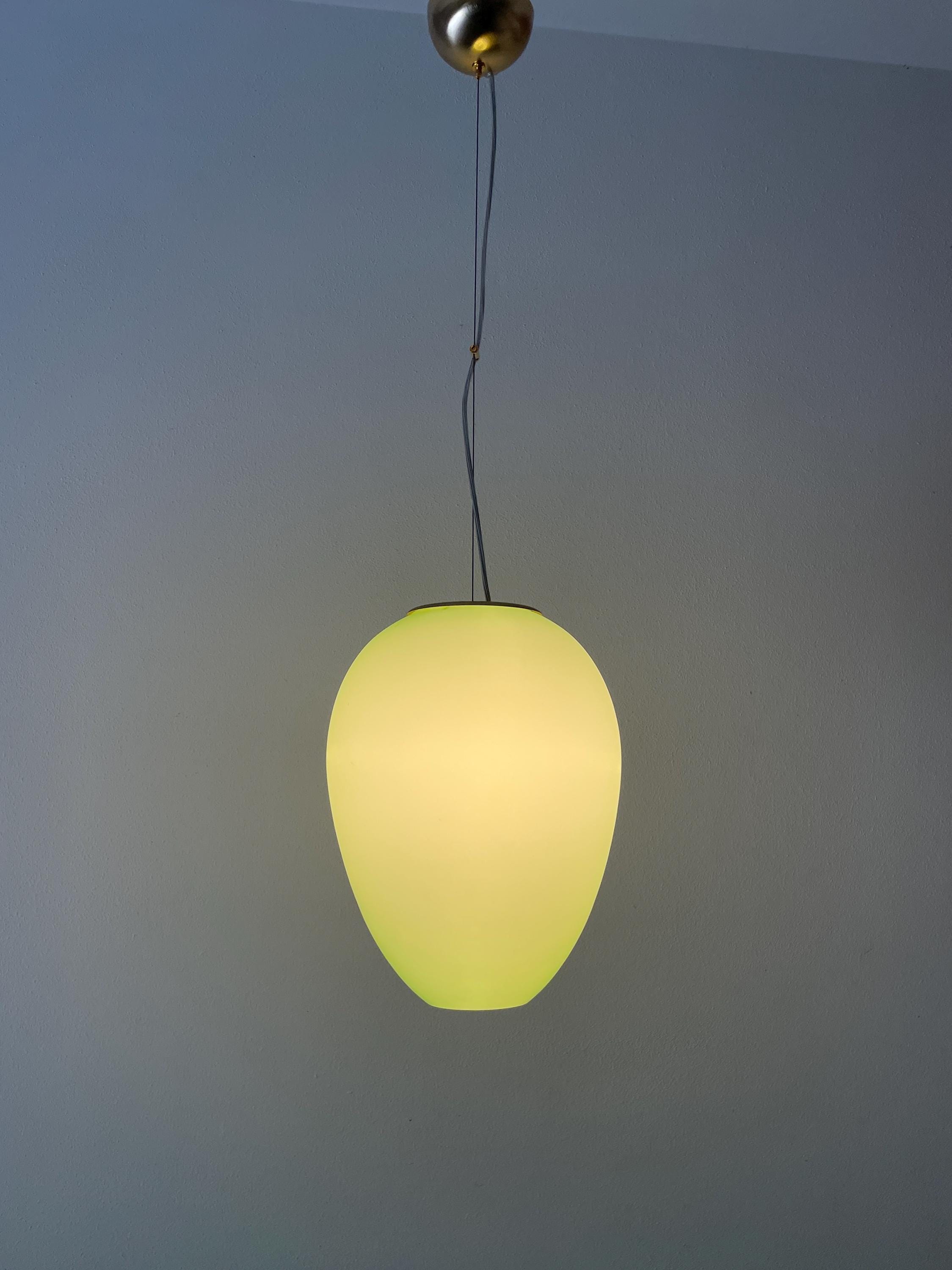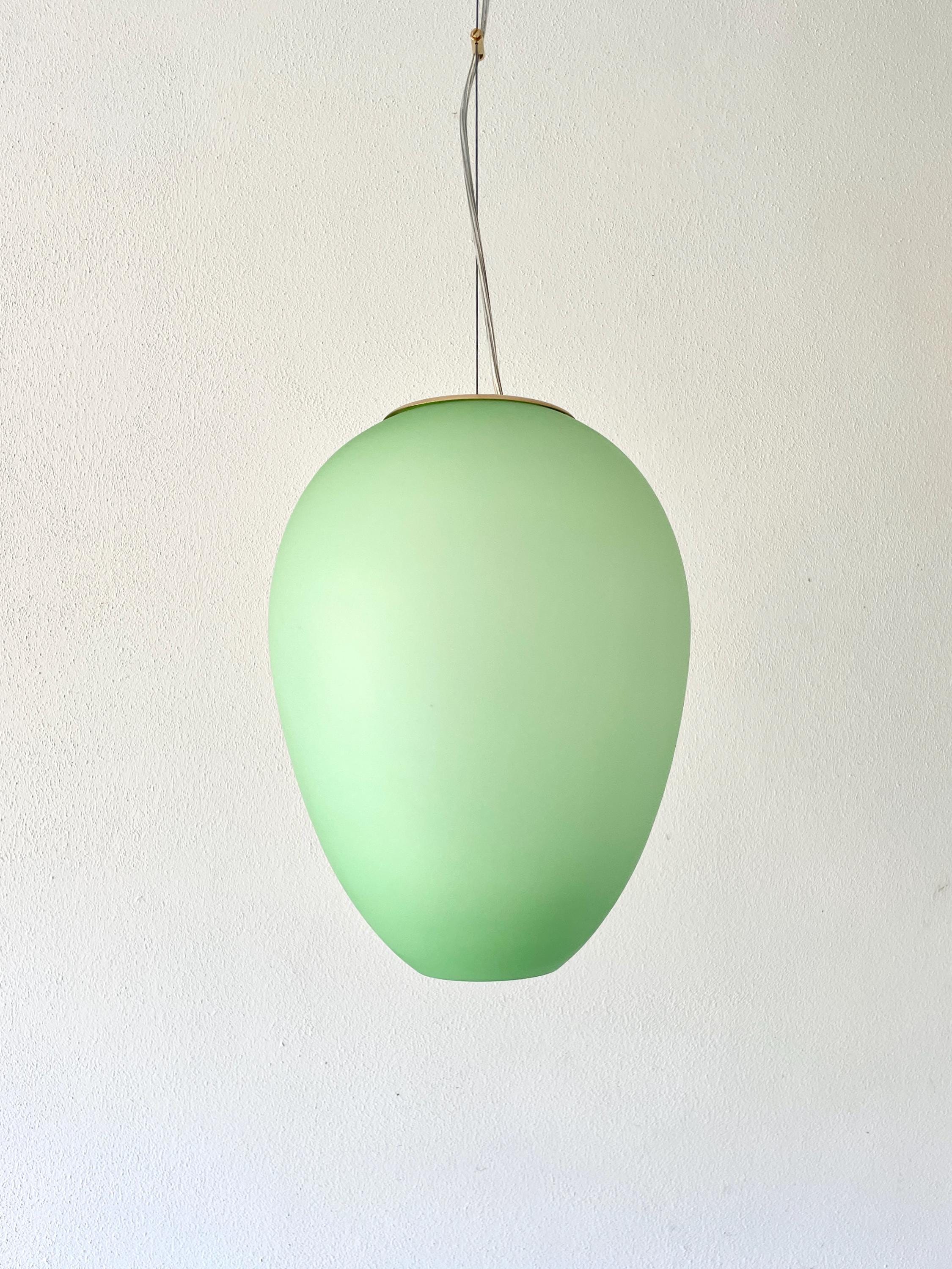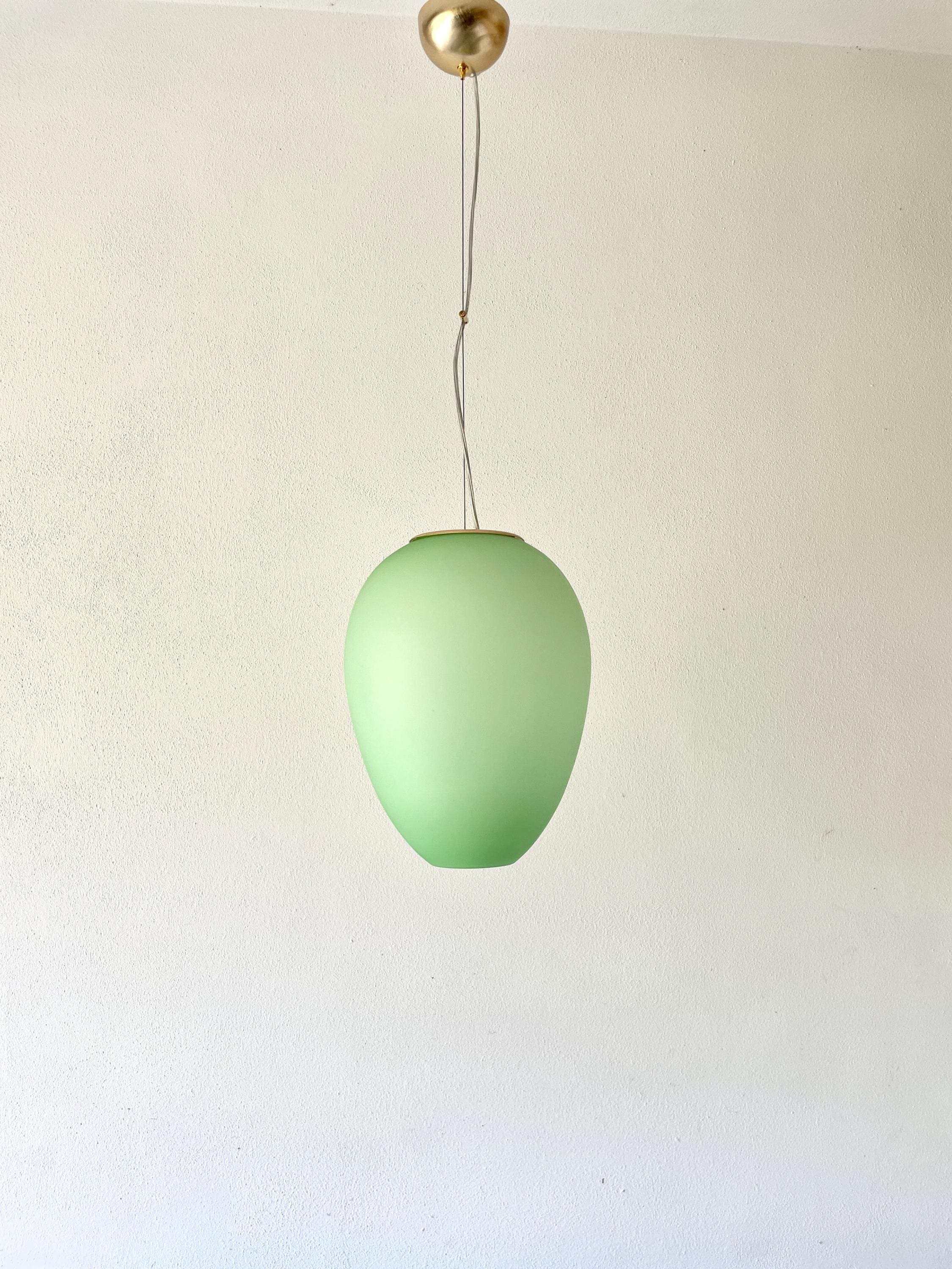 This stunning GREEN EGG Murano glass chandelier by SELENE is vintage, from the 1990s but never used. The beautiful, hand-blown, layered glass adds elegance and understated elegance to any room, creating a beautiful luminous atmosphere. The frame is satin gold, but is also available in satin chrome.