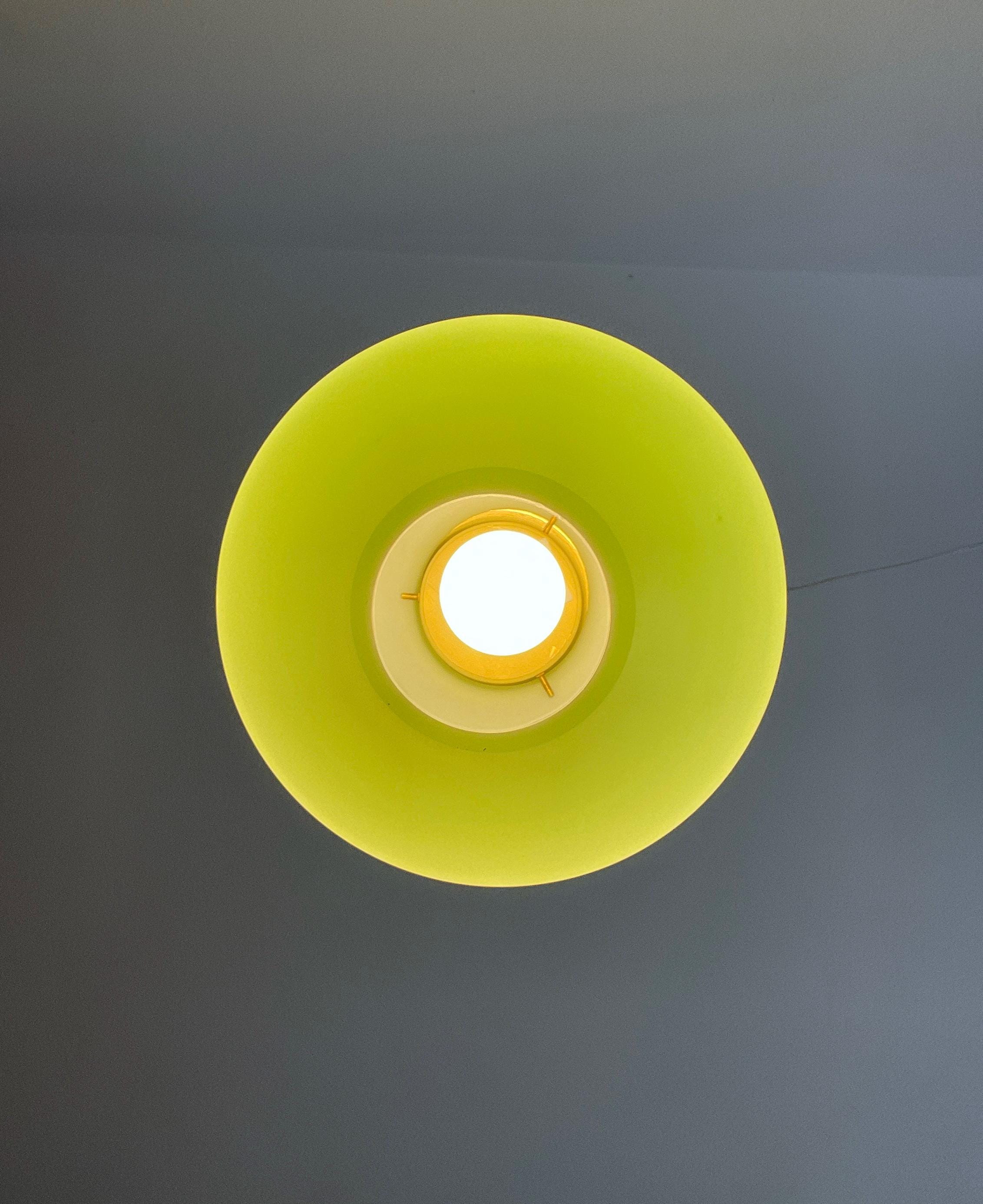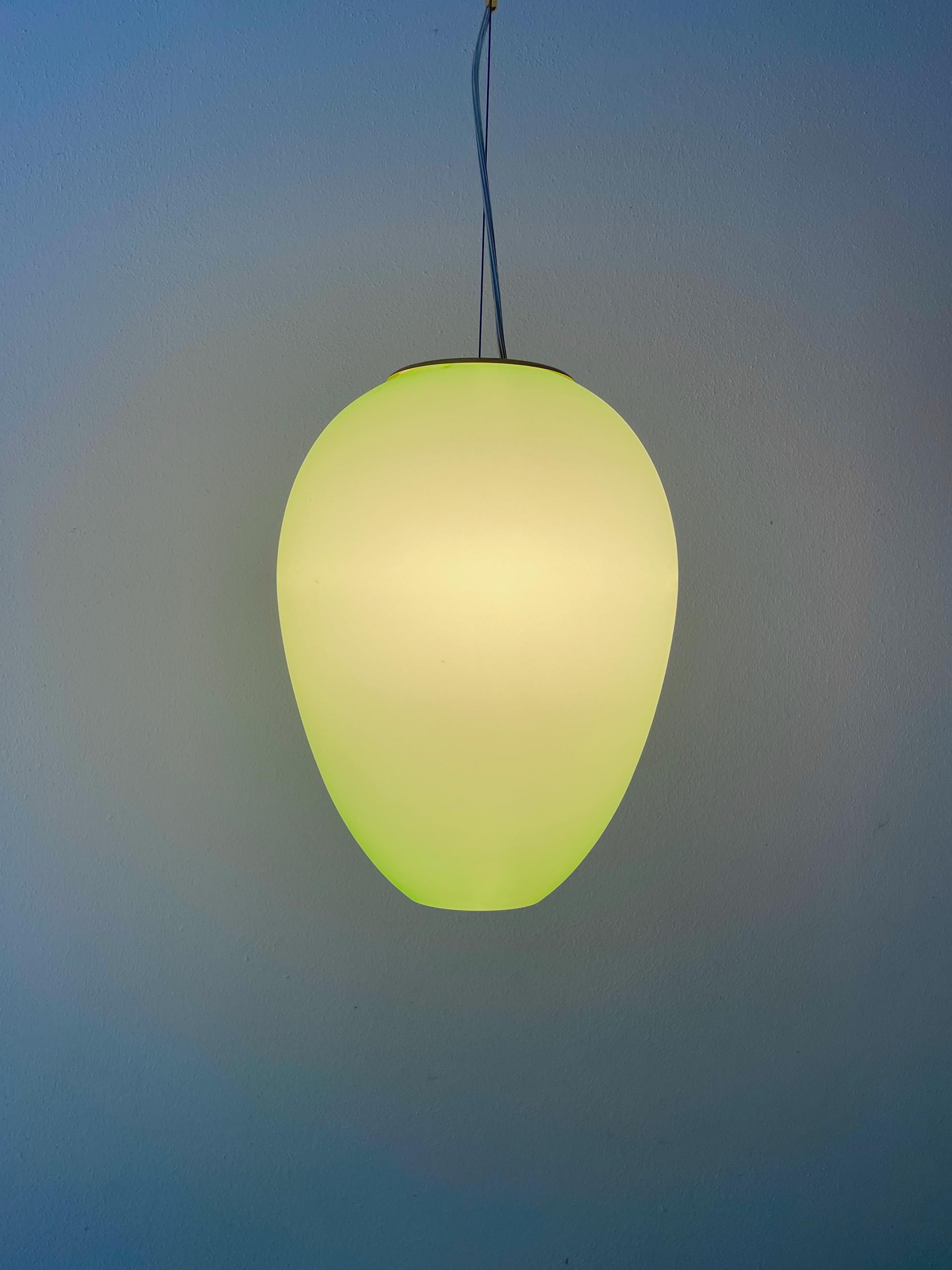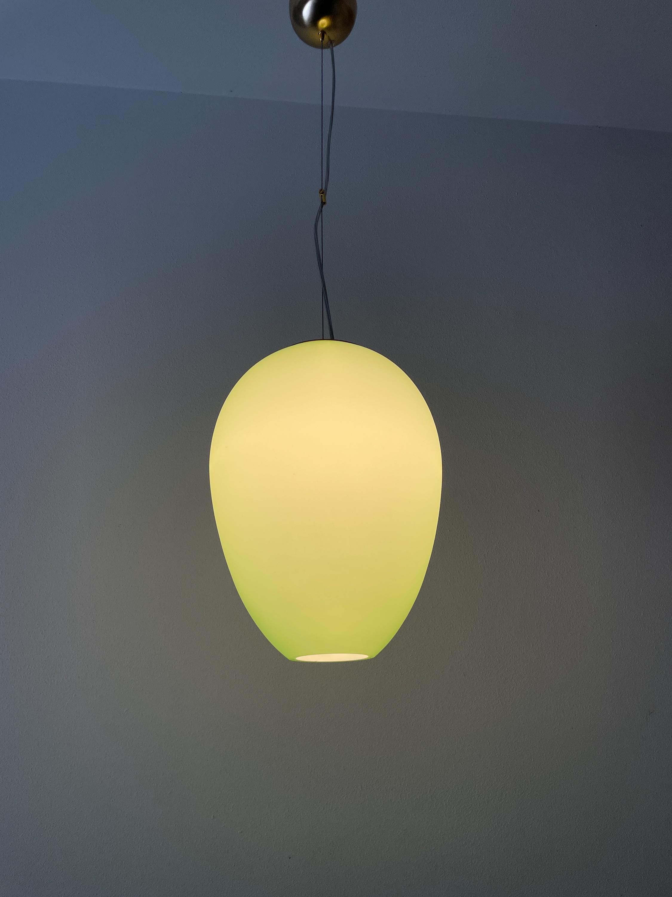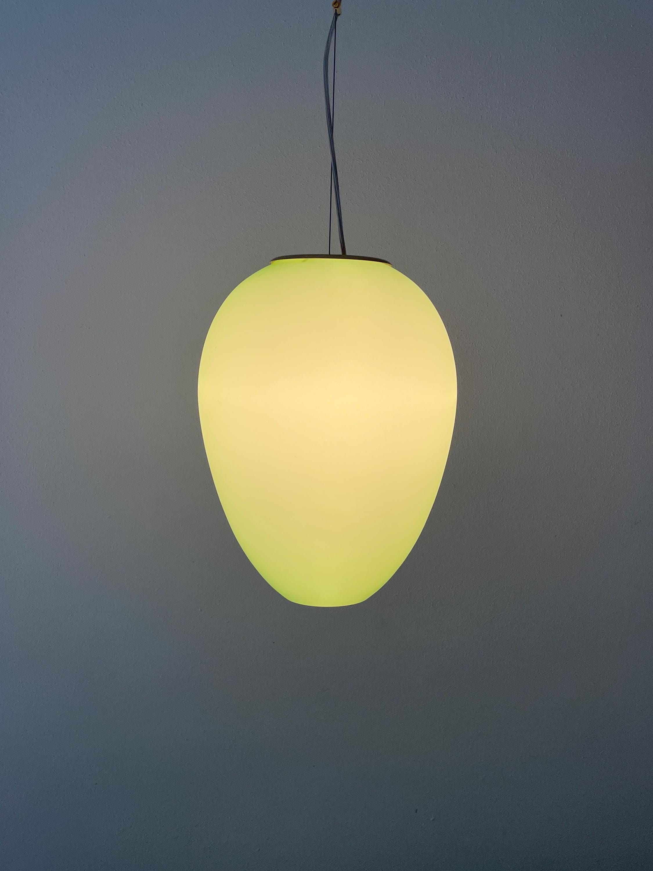 This stunning GREEN EGG Murano glass chandelier by SELENE is vintage, from the 1990s but never used. The beautiful, hand-blown, layered glass adds elegance and understated elegance to any room, creating a beautiful luminous atmosphere. The frame is satin gold, but is also available in satin chrome.