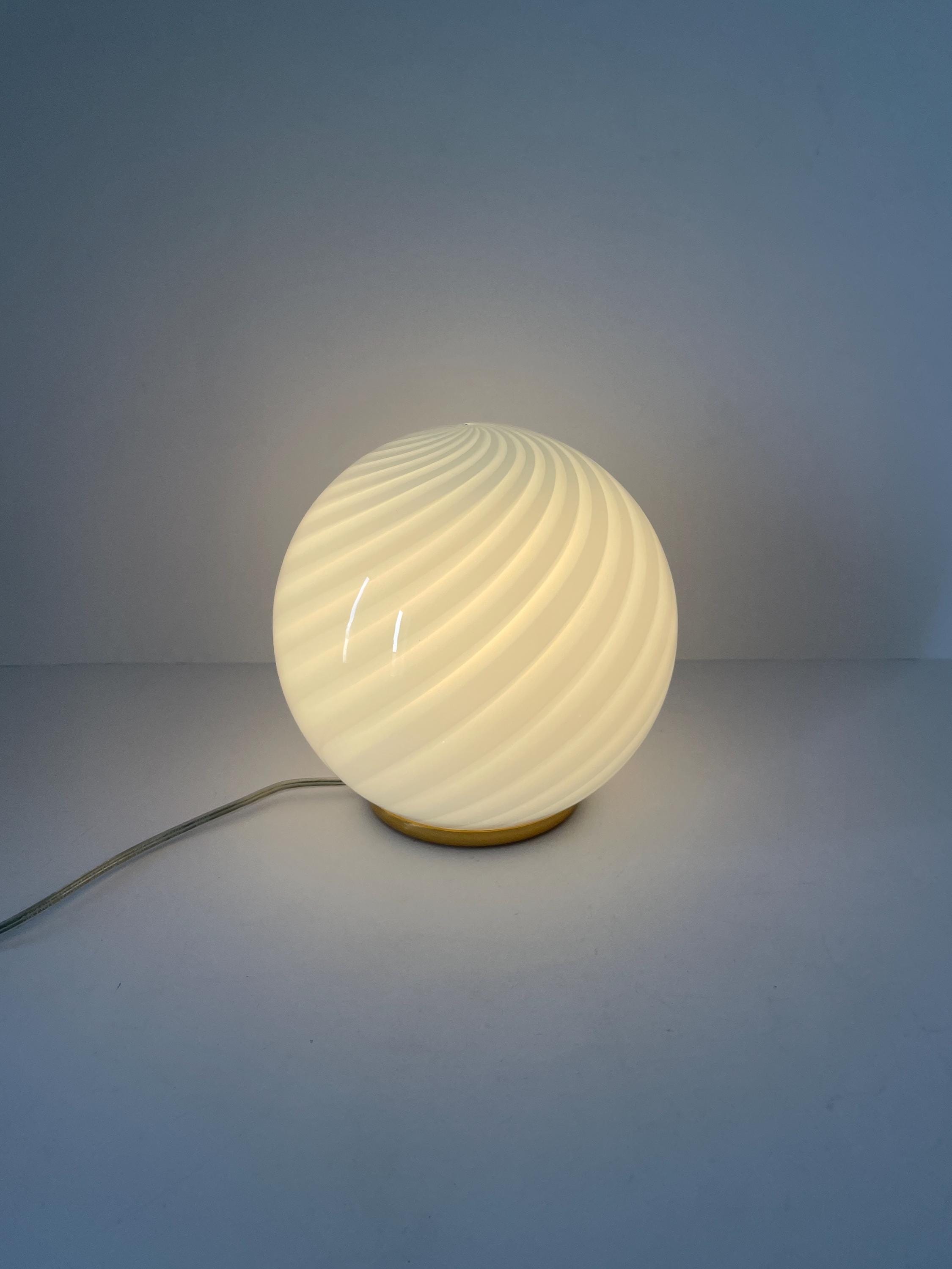 Splendid table lamp in Murano glass, mouth-blown, using the ancient Murano technique of twisted "rigadin", beautiful blue and white cased glass, the frame has a satin gold finish.