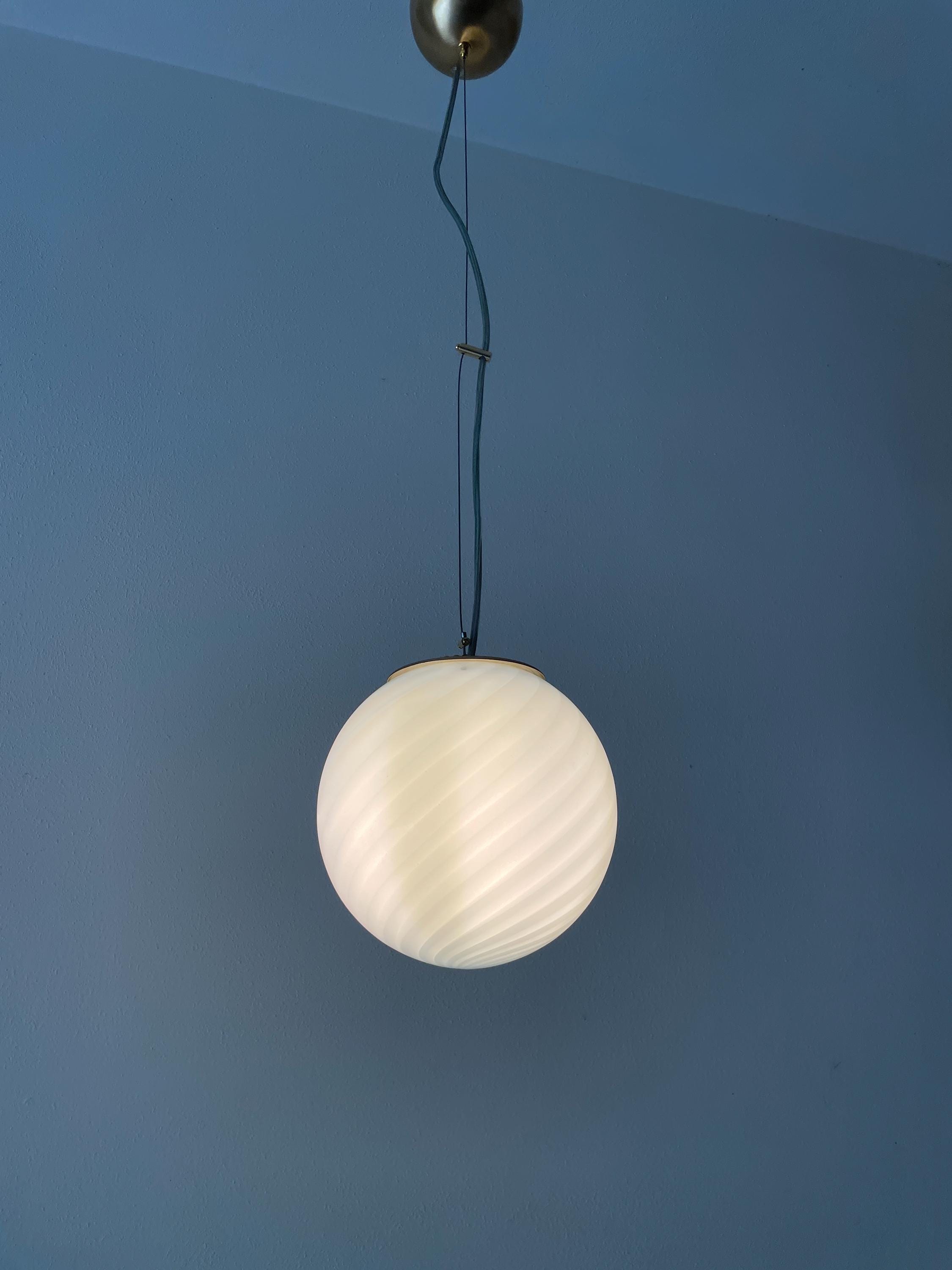 Splendid Murano glass chandelier, mouth-blown using the ancient Murano technique of twisted "rigadin", featuring beautiful blue and white cased glass and a satin gold finish on the frame.