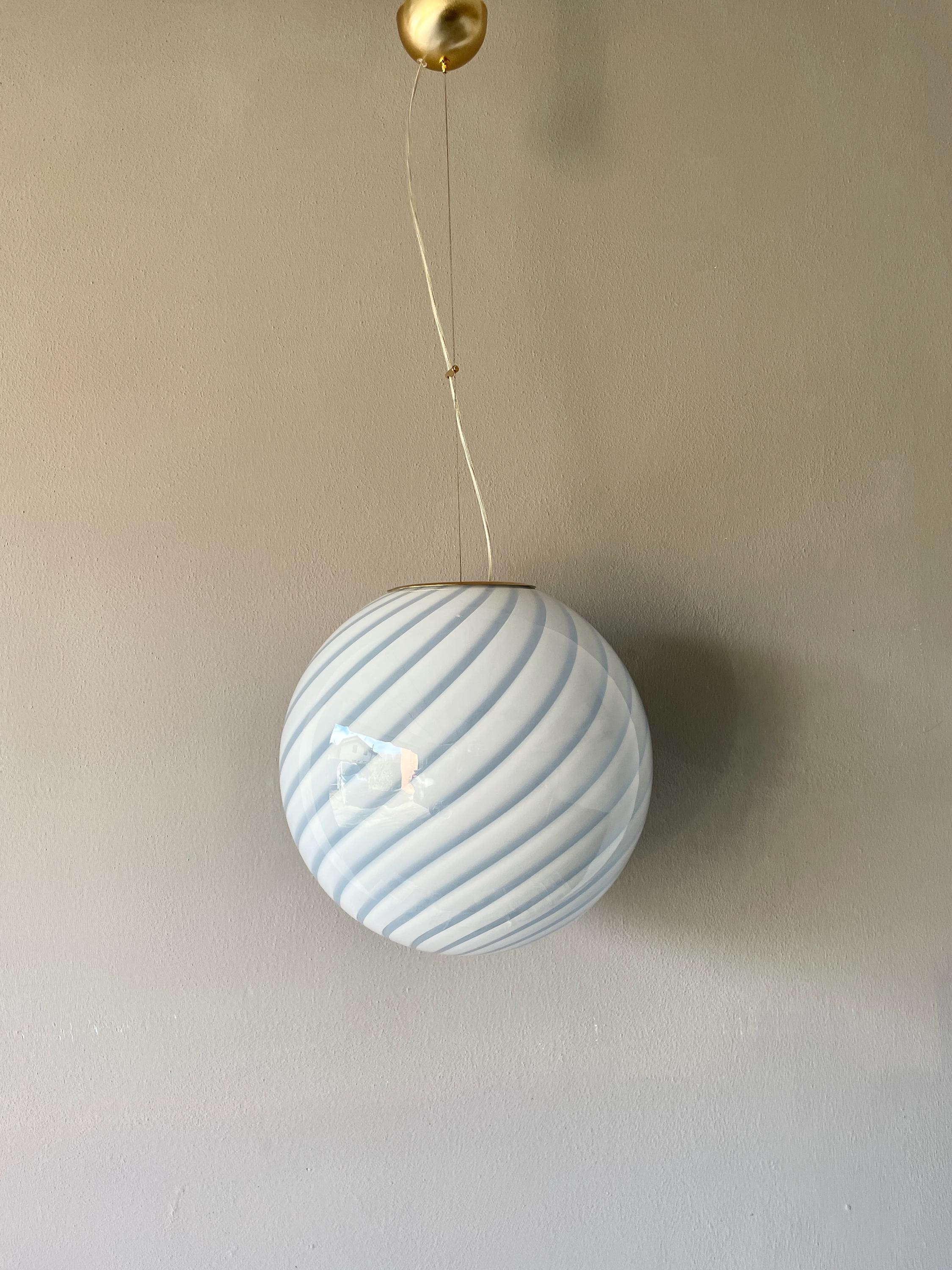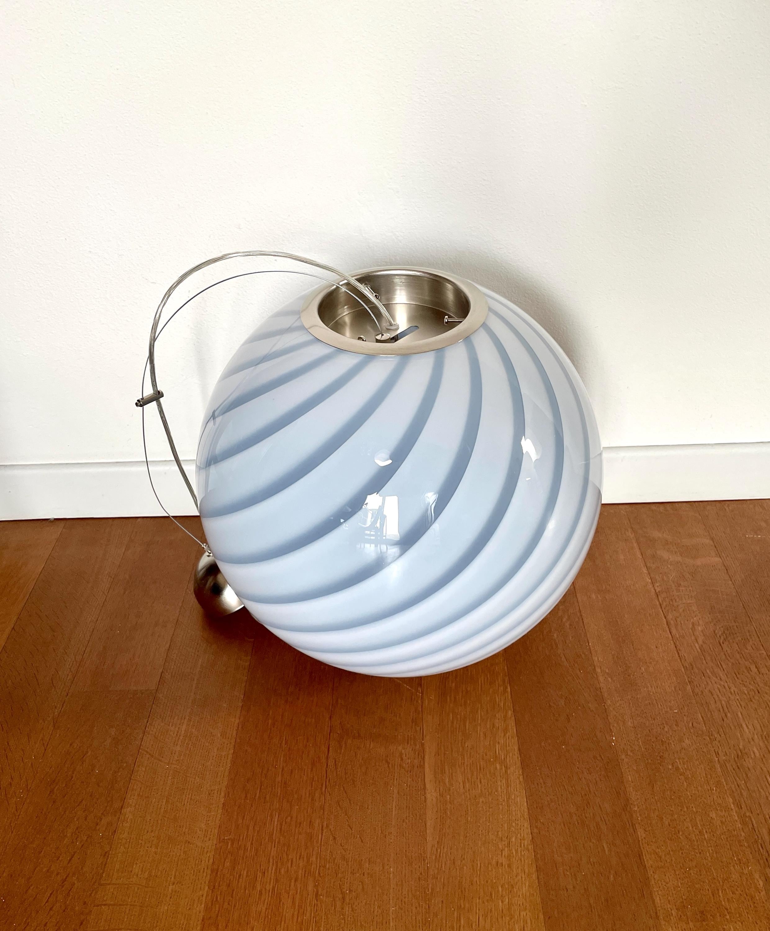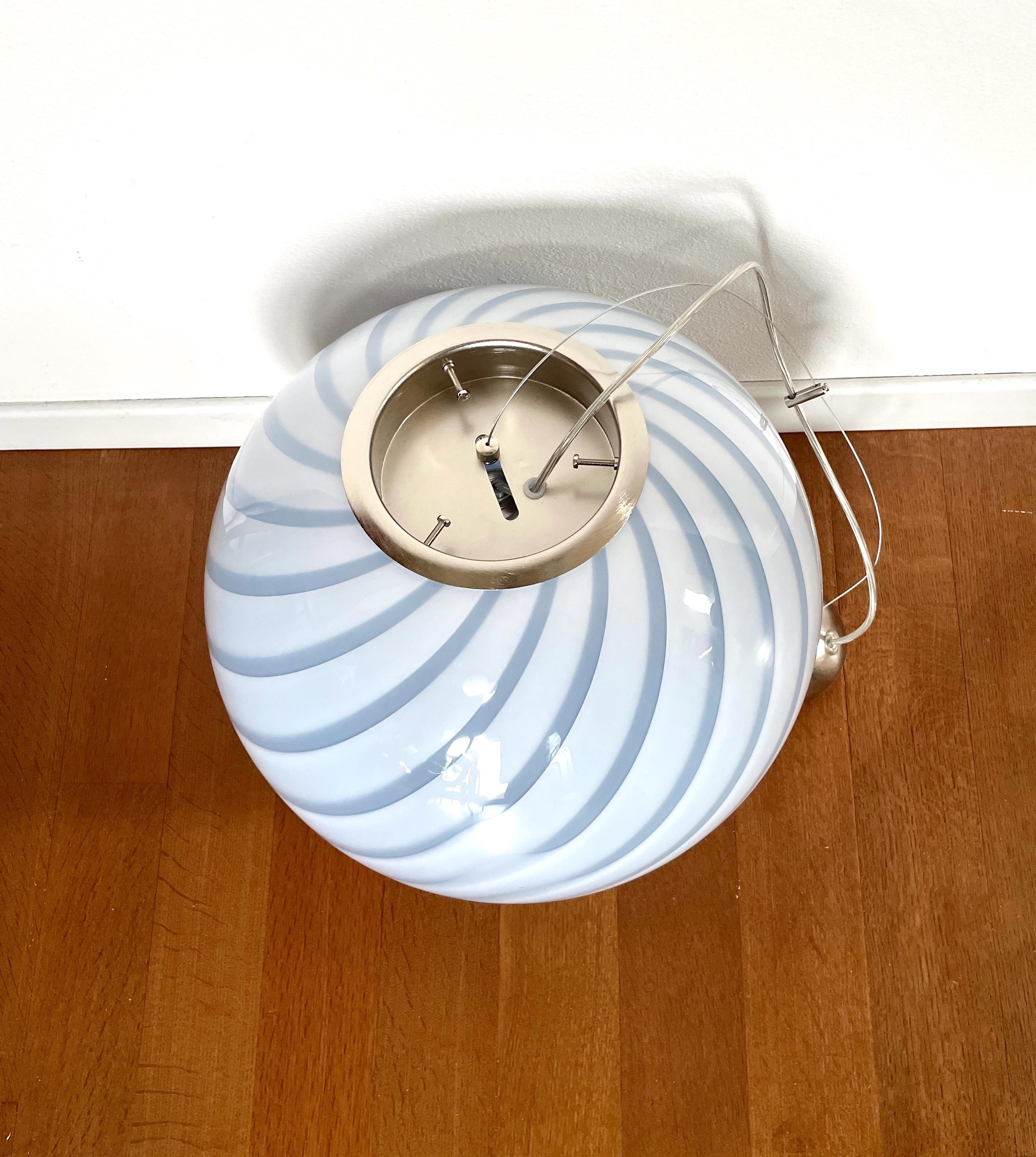 Splendid Murano glass chandelier, mouth-blown, using the ancient Murano technique of twisted "rigadin", beautiful cased glass, cloud blue and white, the frame has a satin chrome/nickel finish.