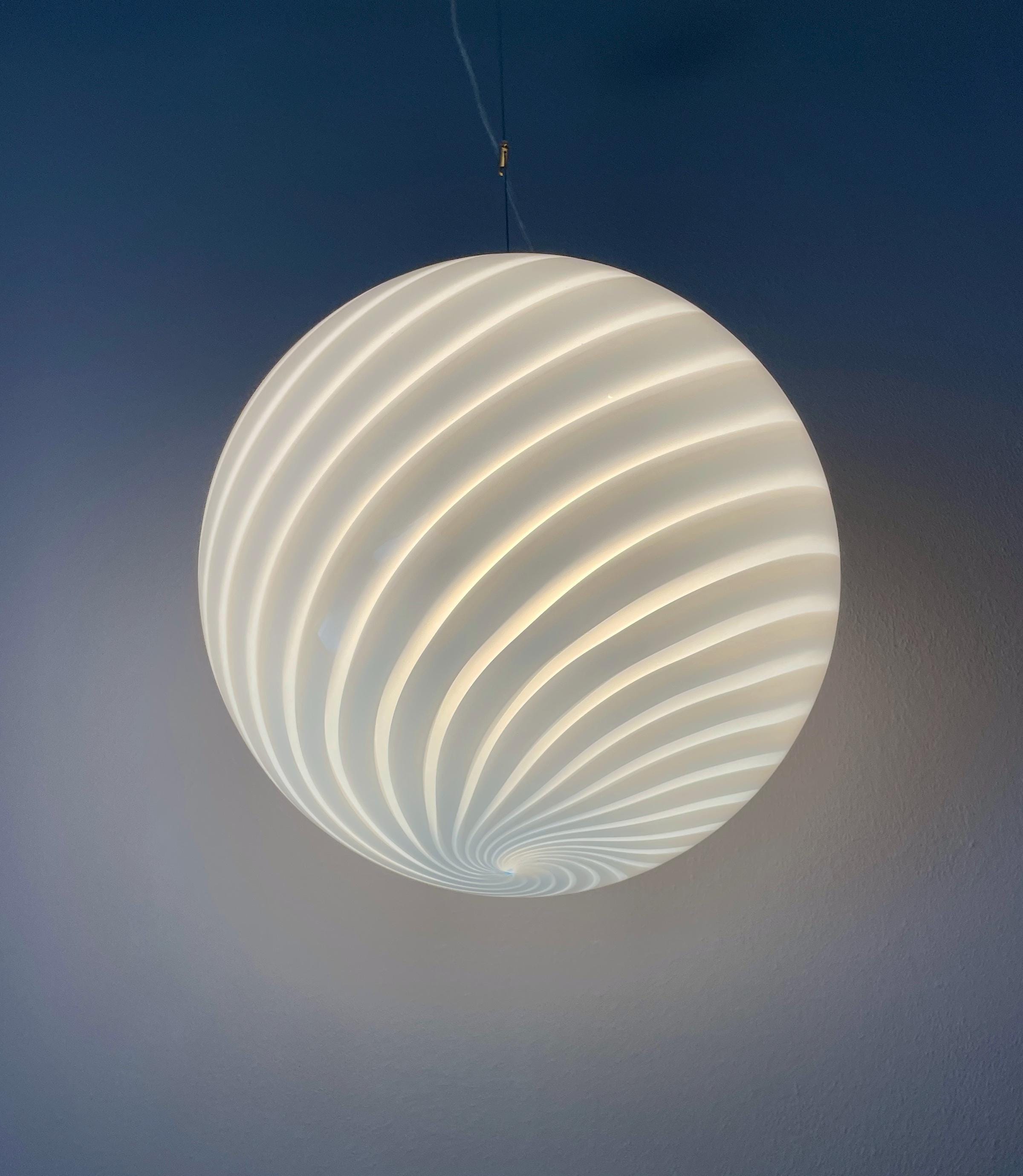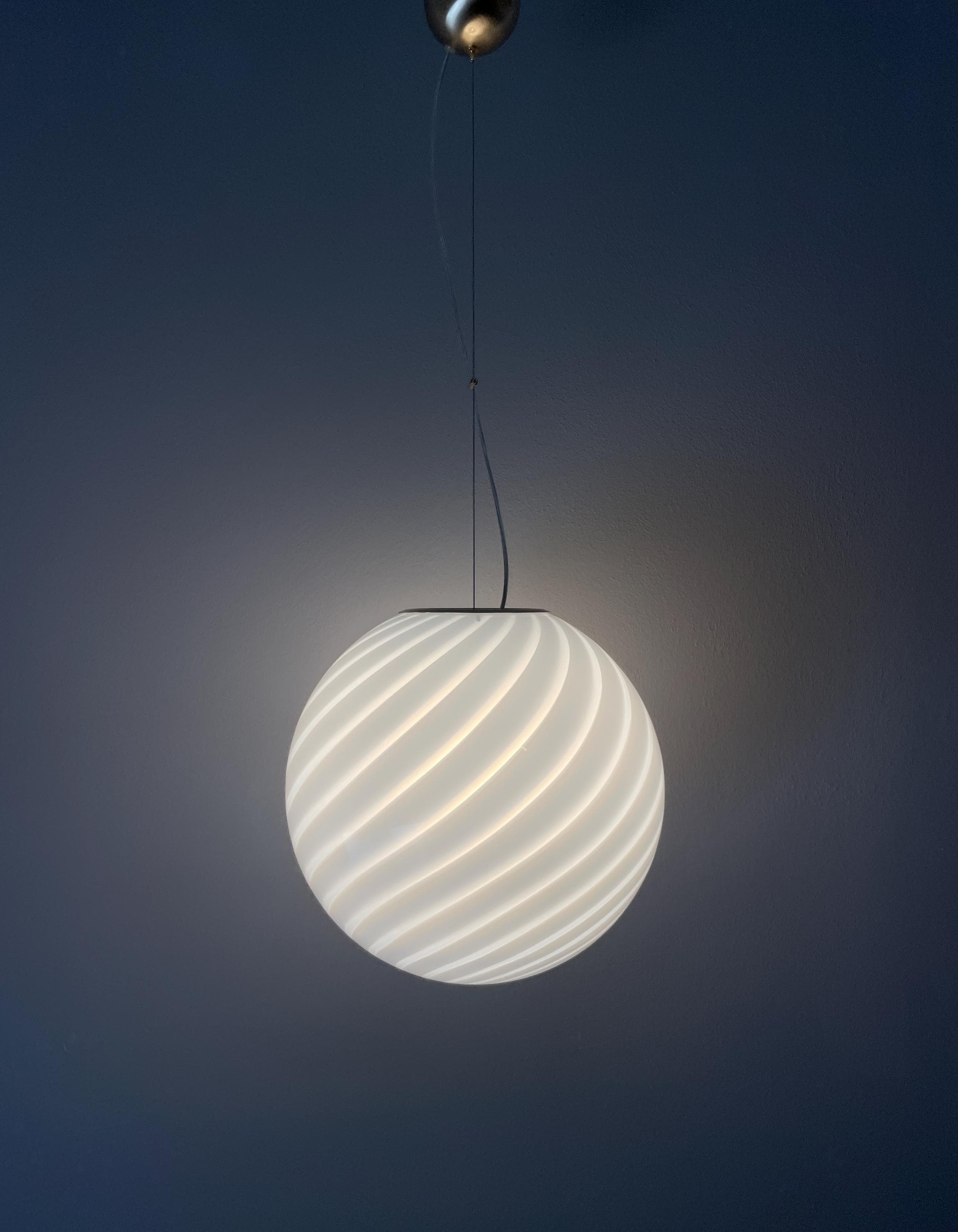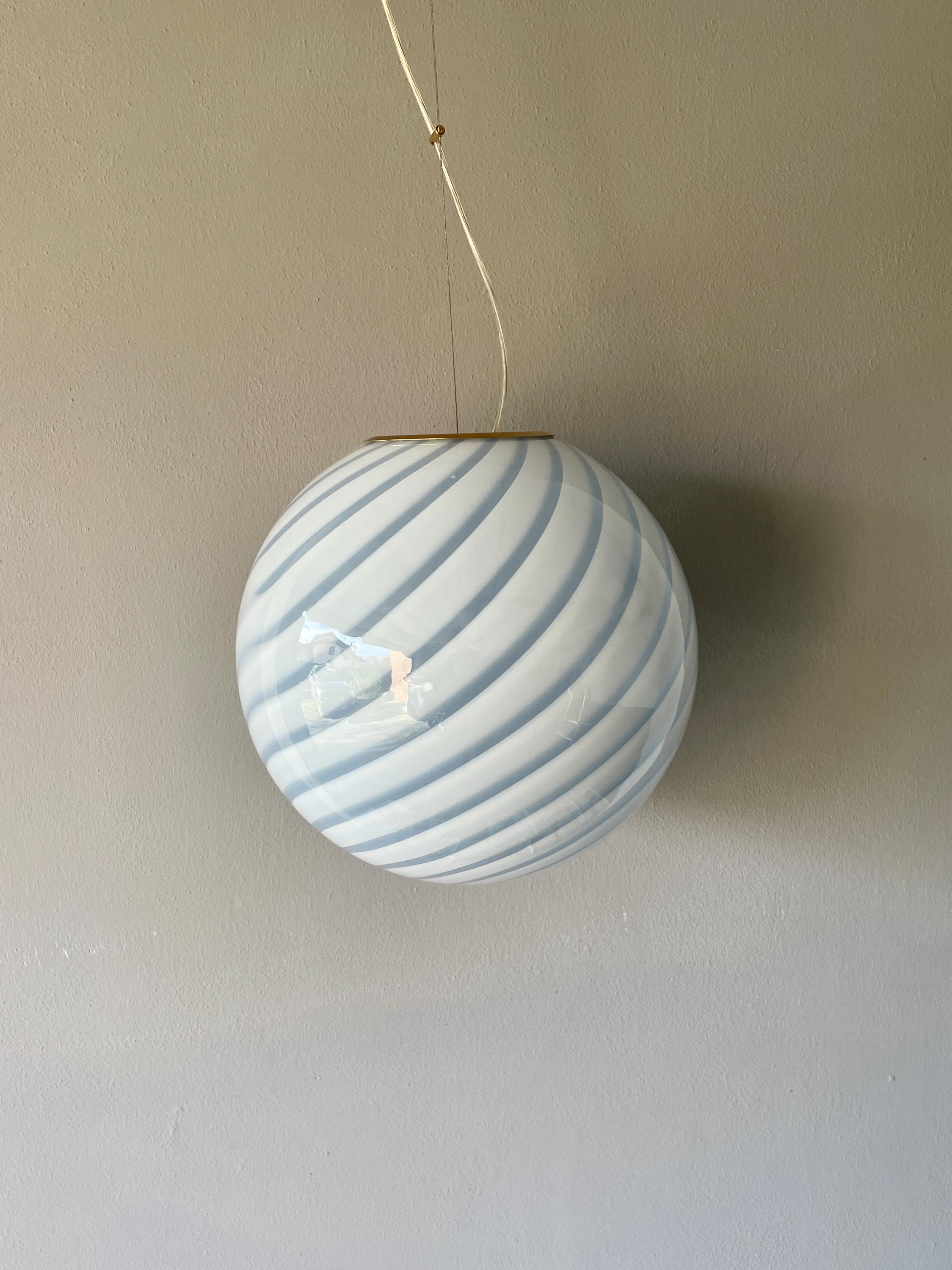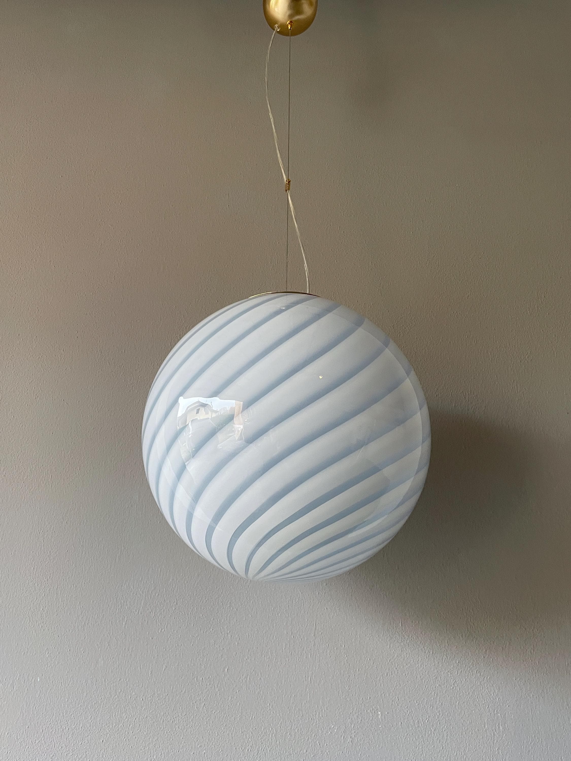 Splendid Murano glass chandelier, mouth-blown, using the ancient Murano technique of twisted "rigadin", beautiful cased glass, cloud blue and white, the frame has a satin chrome/nickel finish.