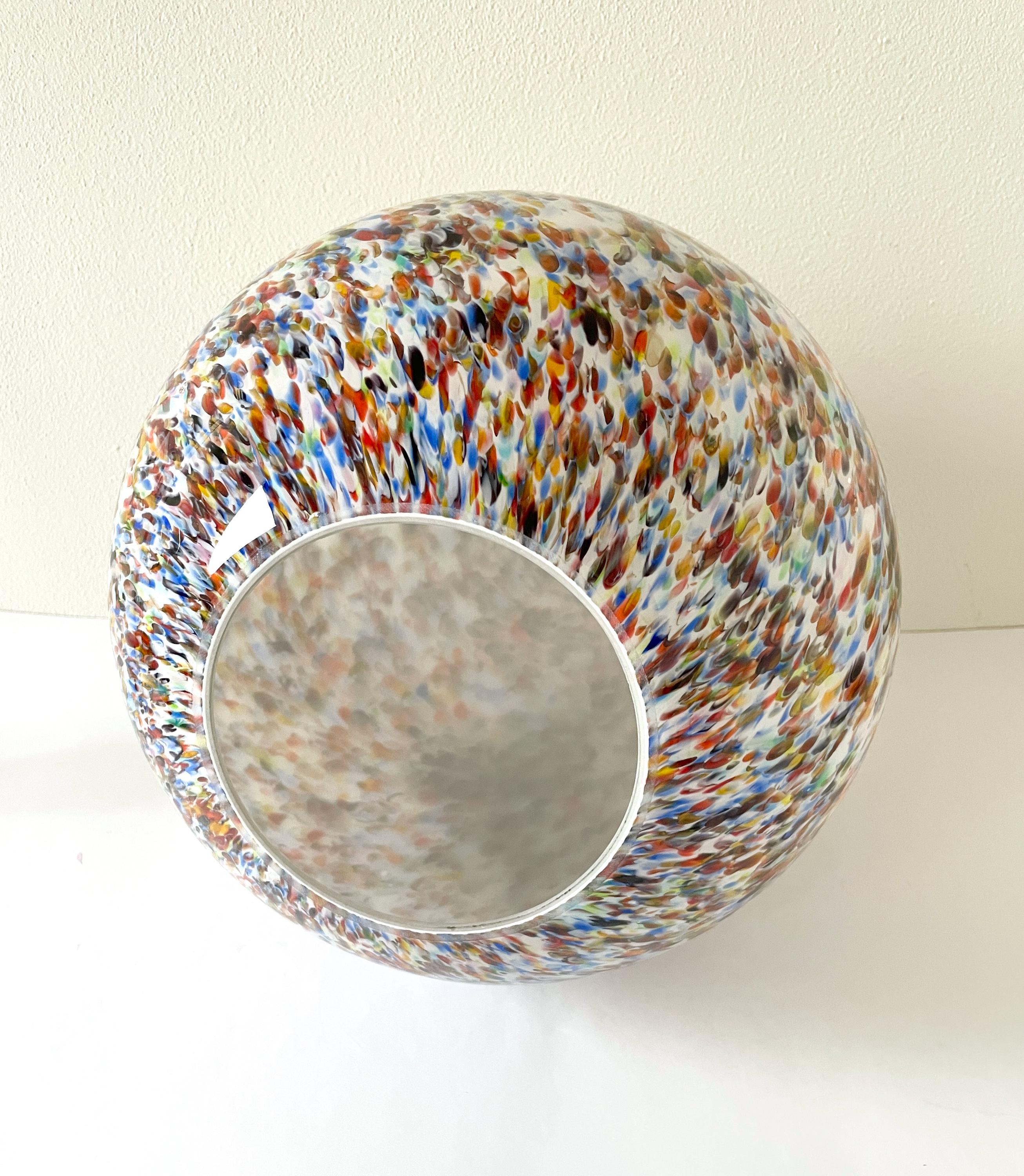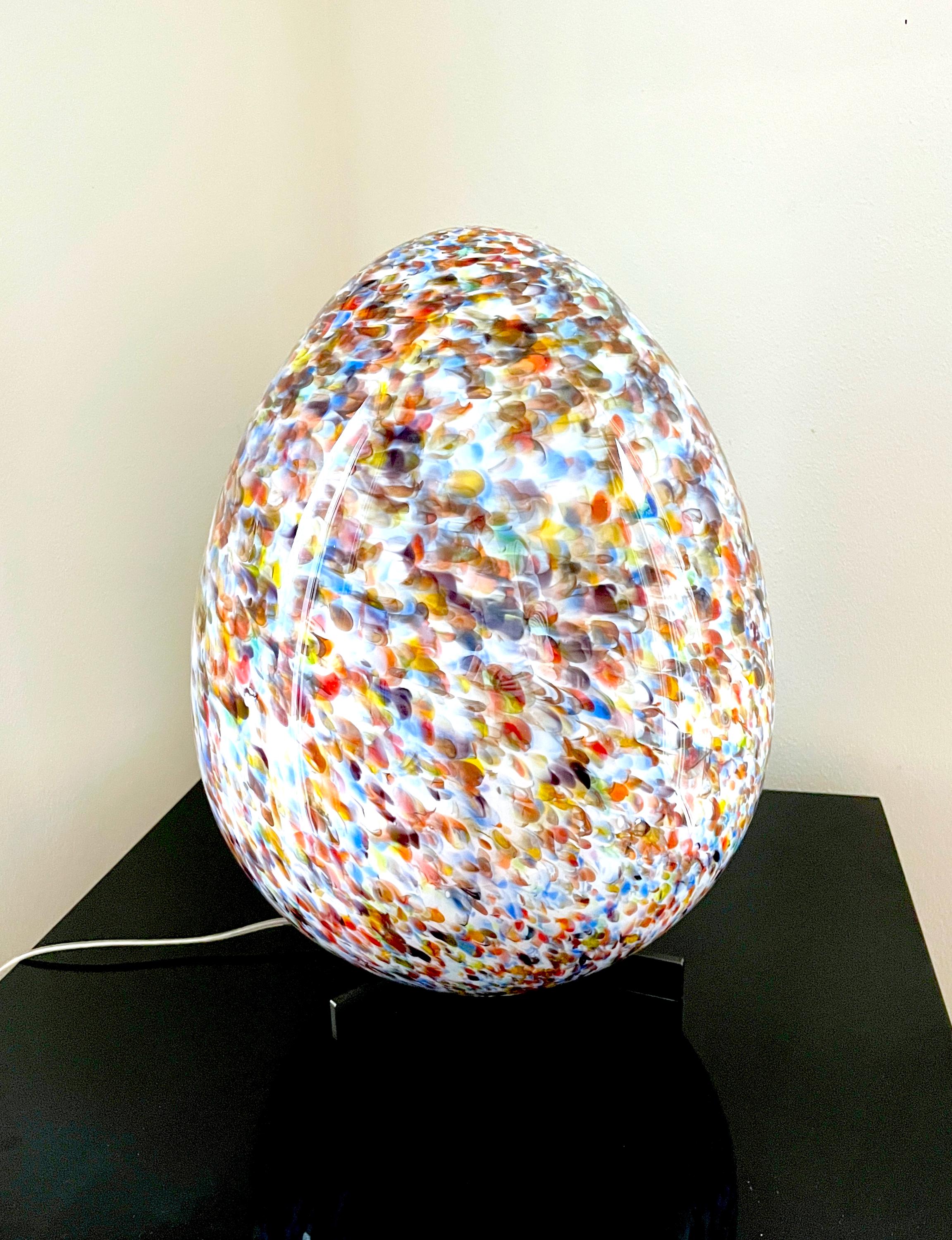 An explosion of color in this incredible and precious Murano lamp. It was crafted with countless small Murano glass tiles called "murrine." Each individual murrine has a different pattern and color. These are expertly fused by the master glassmaker onto a mass of milk glass, then blown into the egg-shaped form of this stunning lamp.
