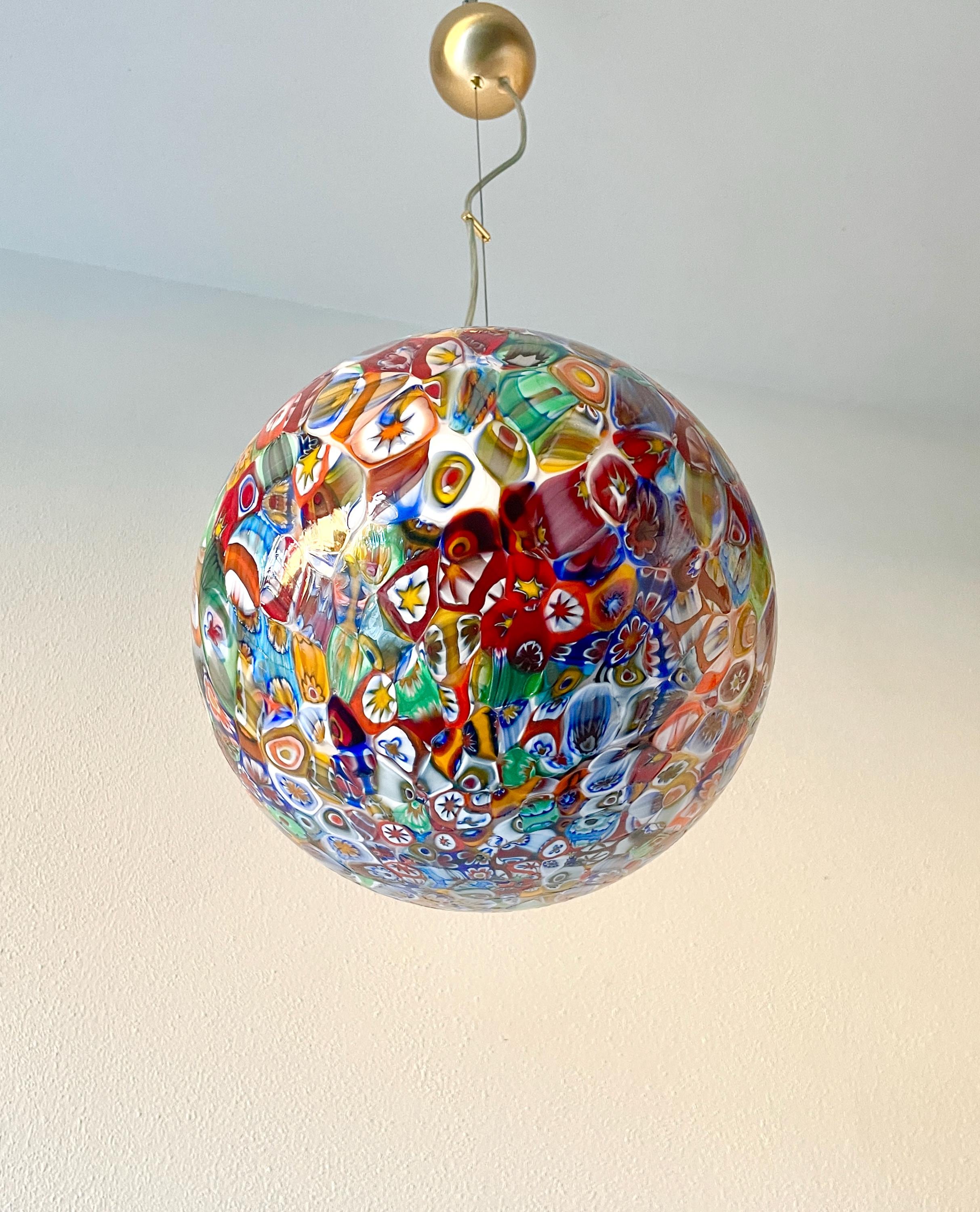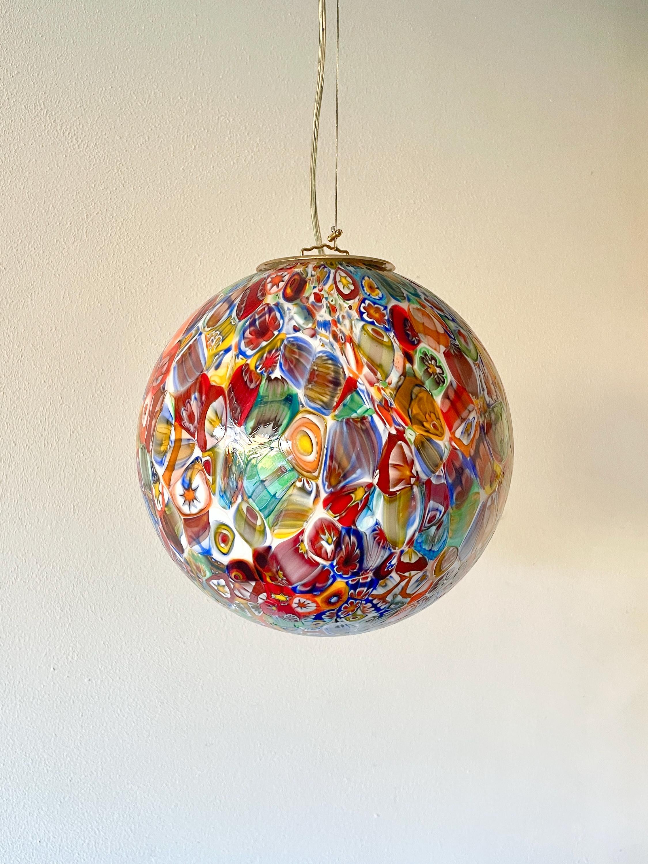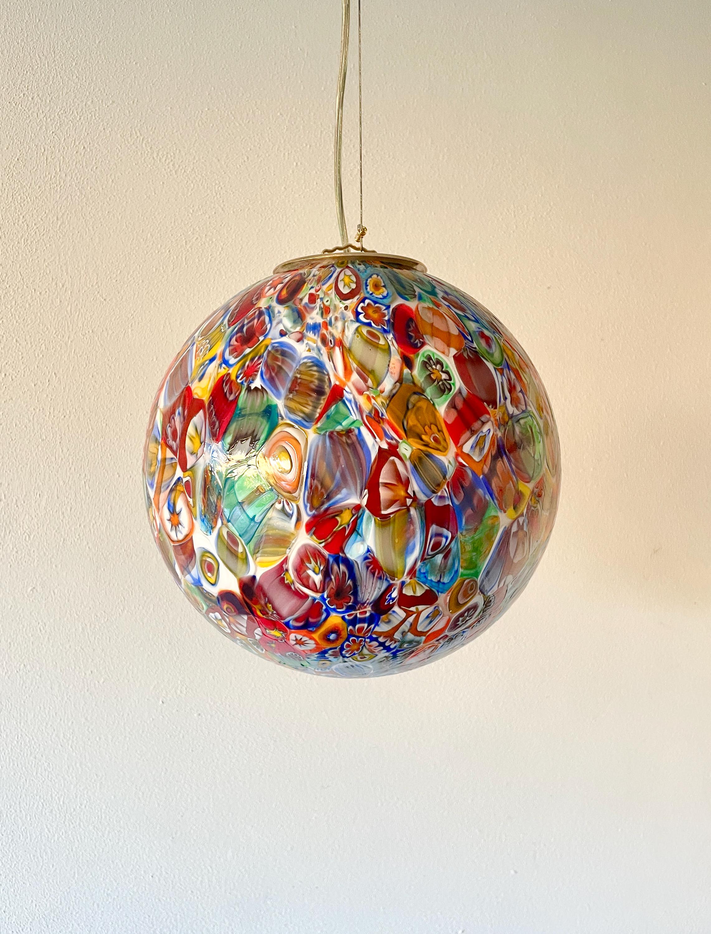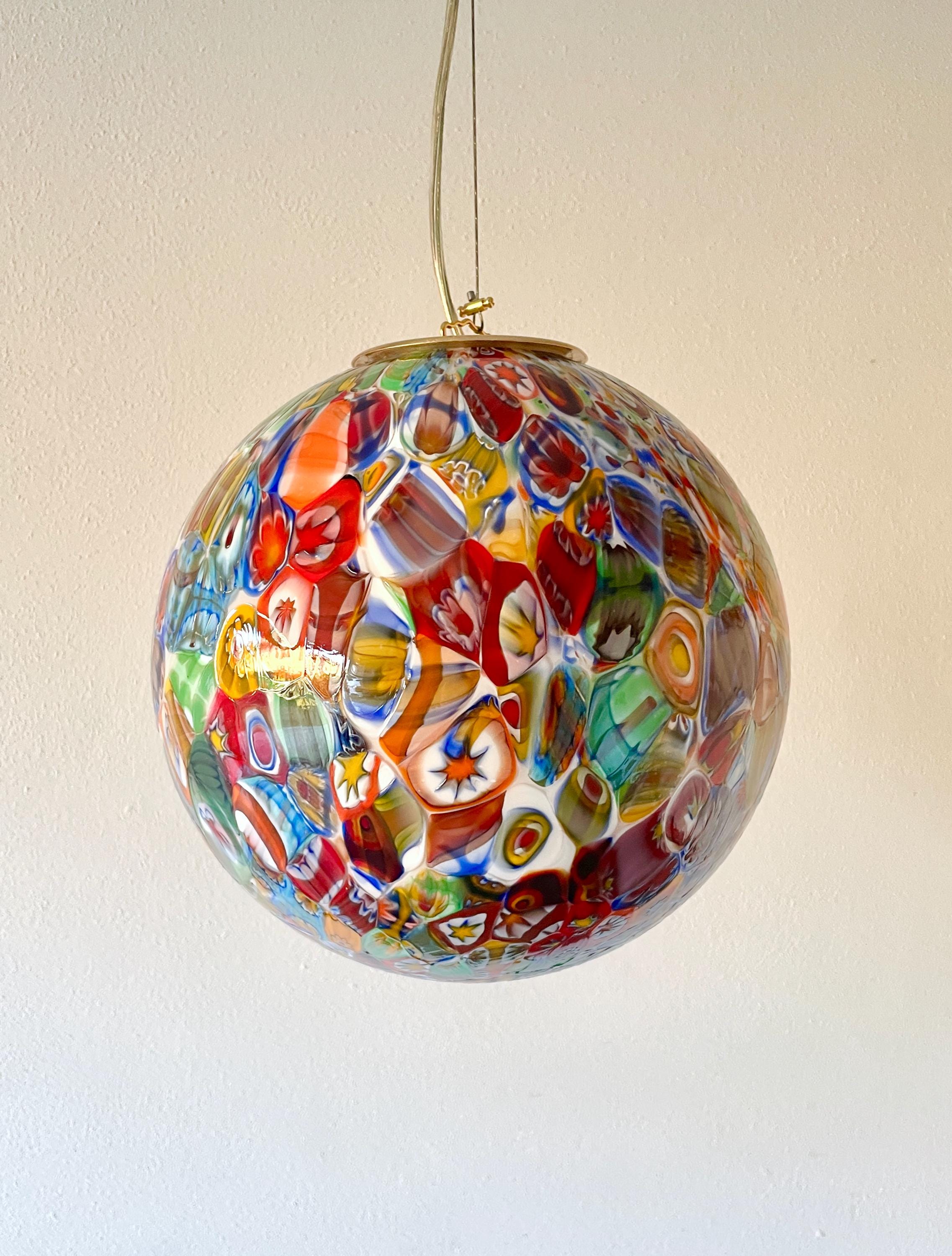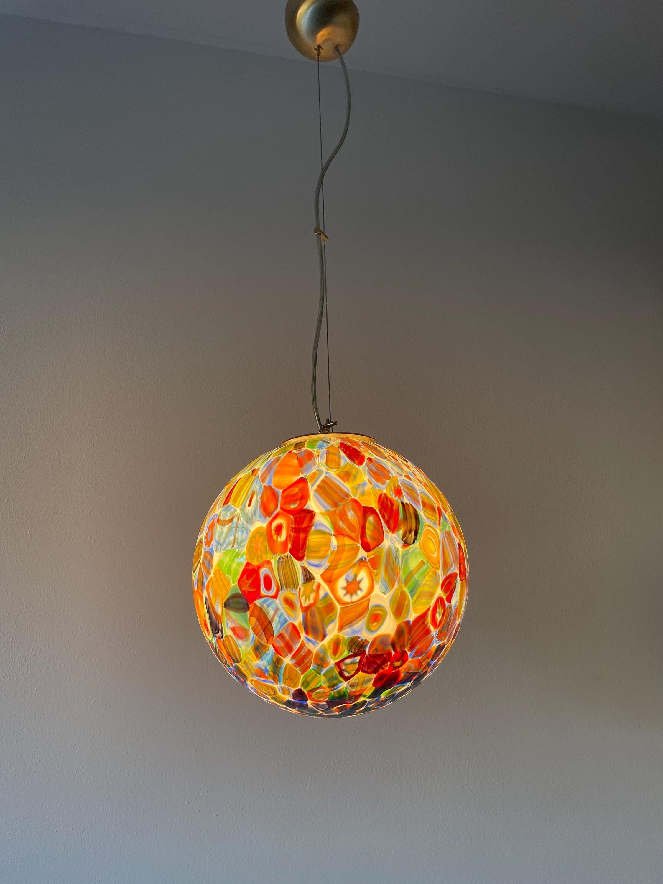 An explosion of color in this incredible and precious Murano chandelier. It was crafted with countless small Murano glass tiles called "murrine." Each individual murrine has a different pattern and color. These are expertly fused by the master glassmaker onto a mass of milky glass, then blown into the spherical shape of this chandelier.