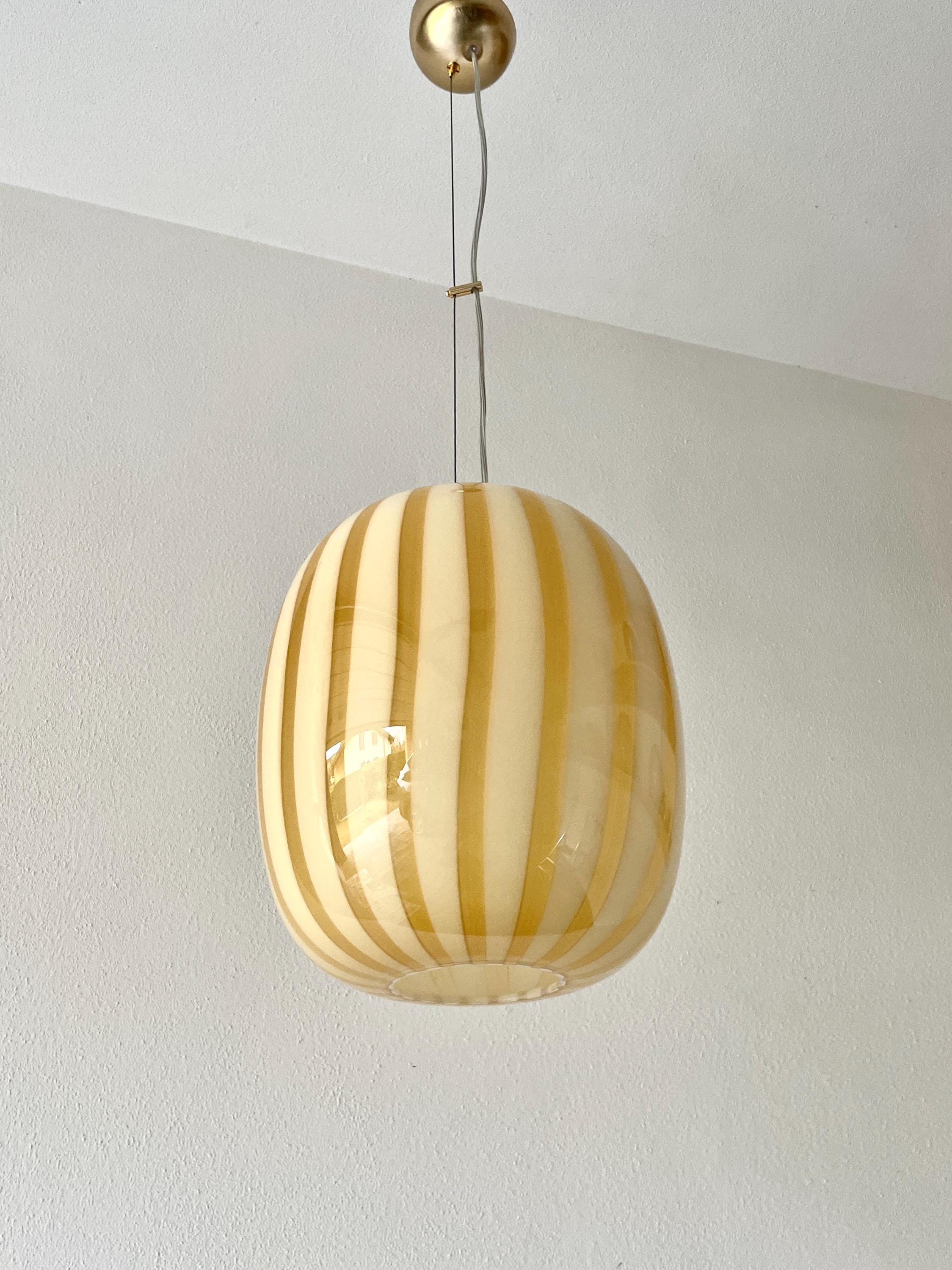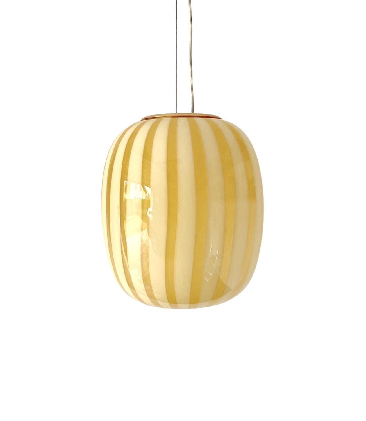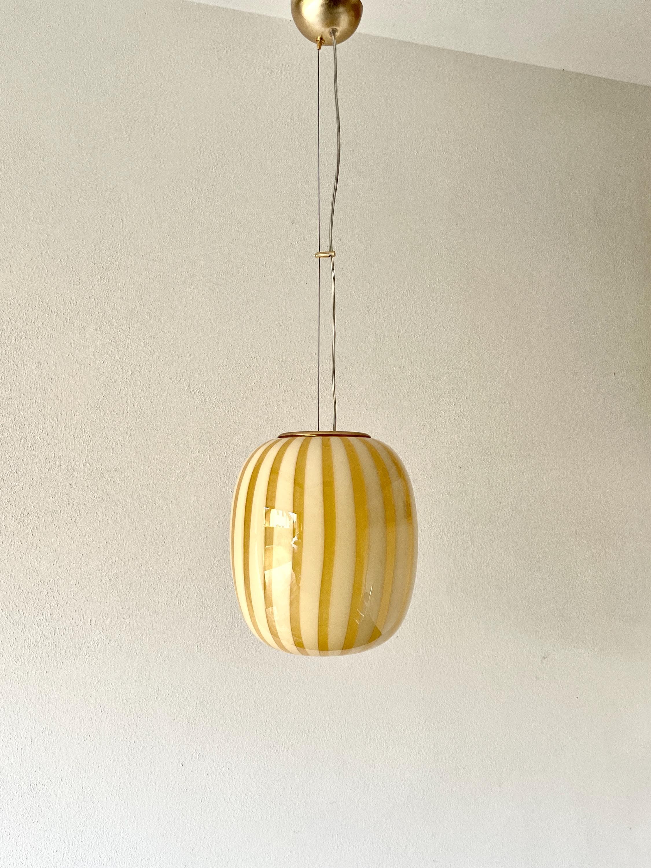 AUREA is a splendid piece made of mouth-blown Murano glass, using the ancient Murano technique of straight "rigadin". The beautiful, mouth-blown and hand-worked glass is amber in colour on the outside and white on the inside. The frame has a satin gold finish.