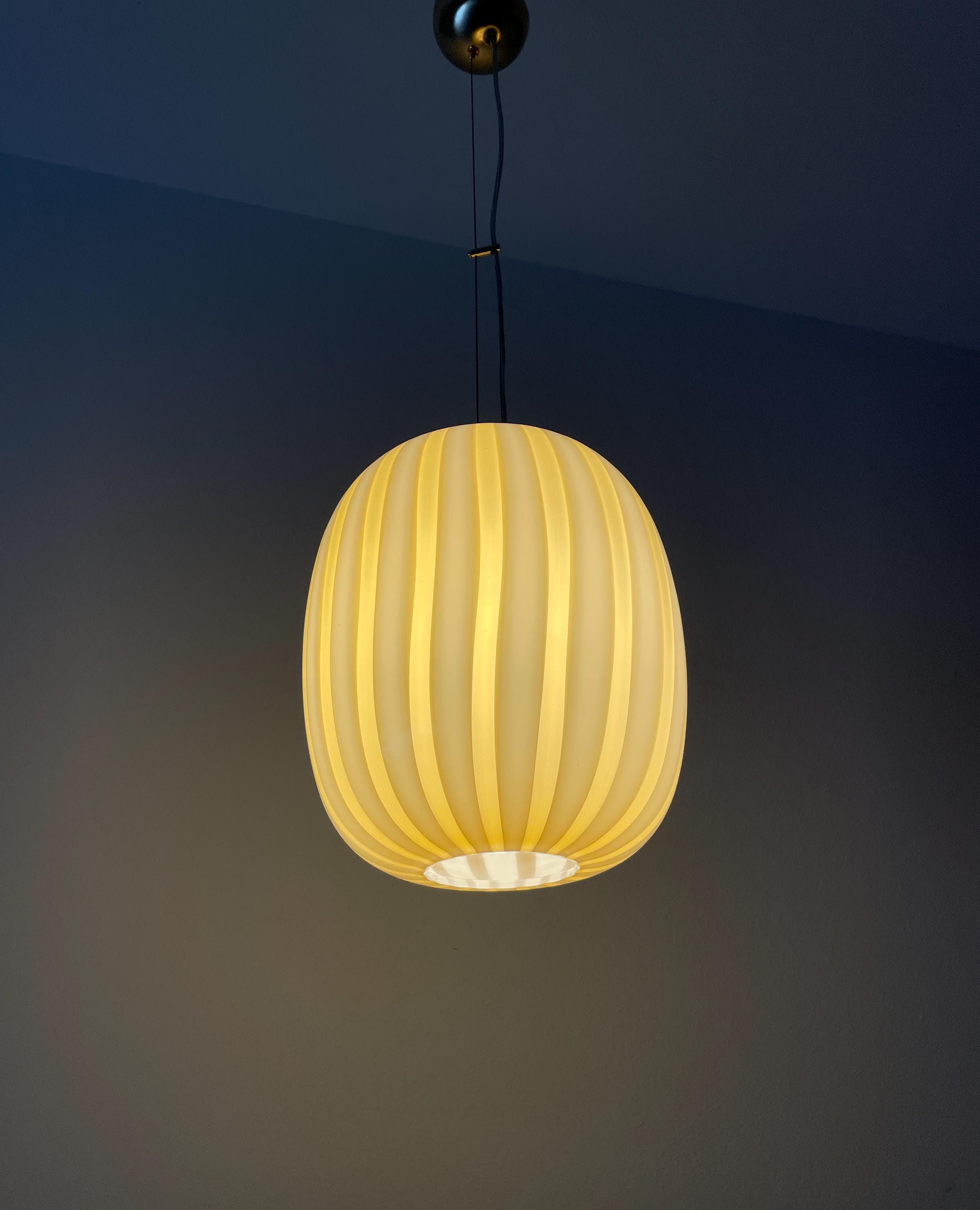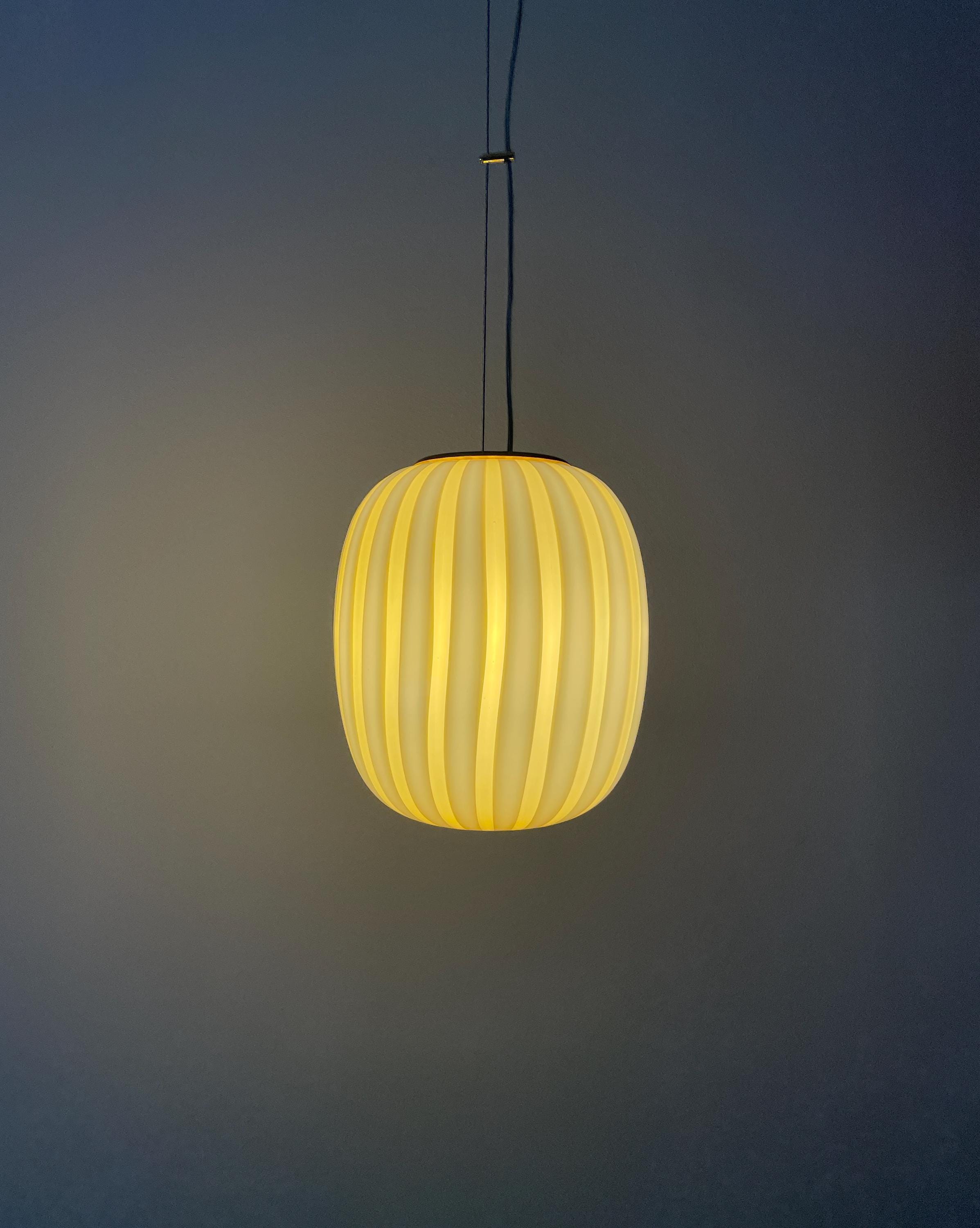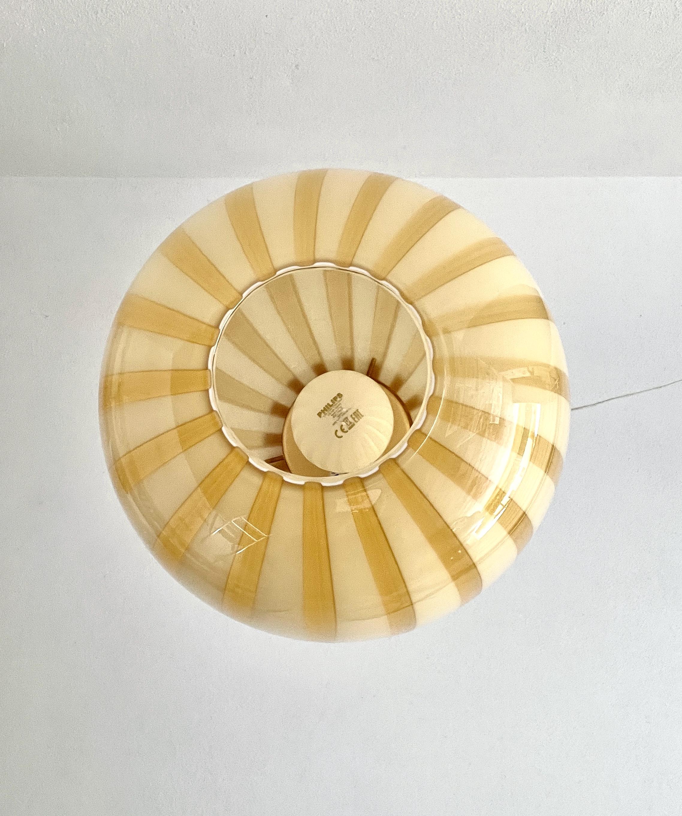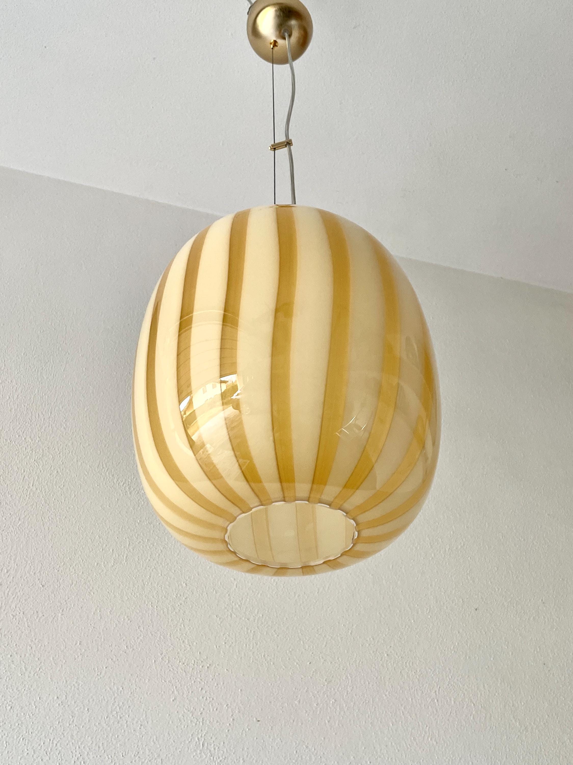 AUREA is a splendid piece made of mouth-blown Murano glass, using the ancient Murano technique of straight "rigadin". The beautiful, mouth-blown and hand-worked glass is amber in colour on the outside and white on the inside. The frame has a satin gold finish.