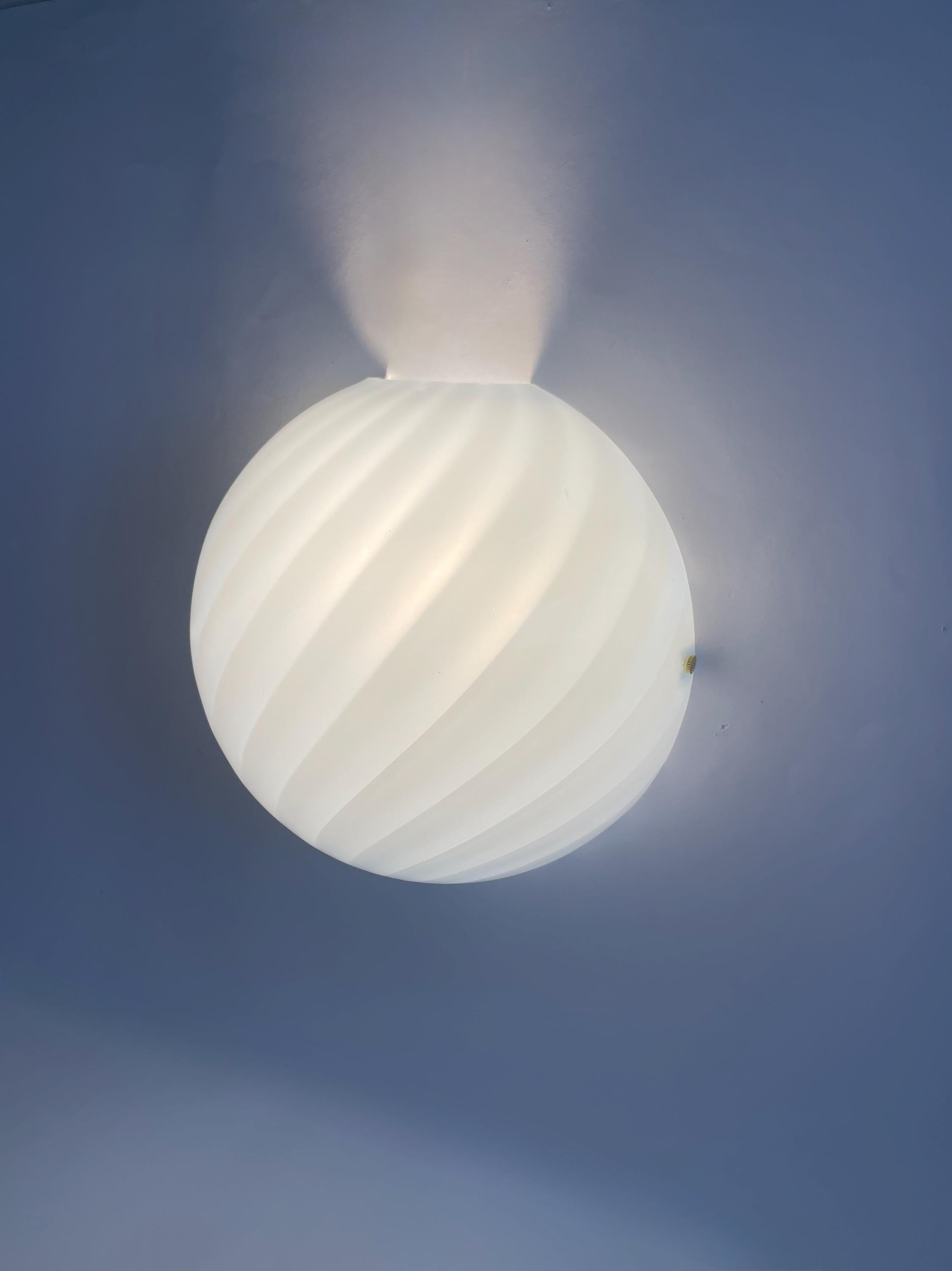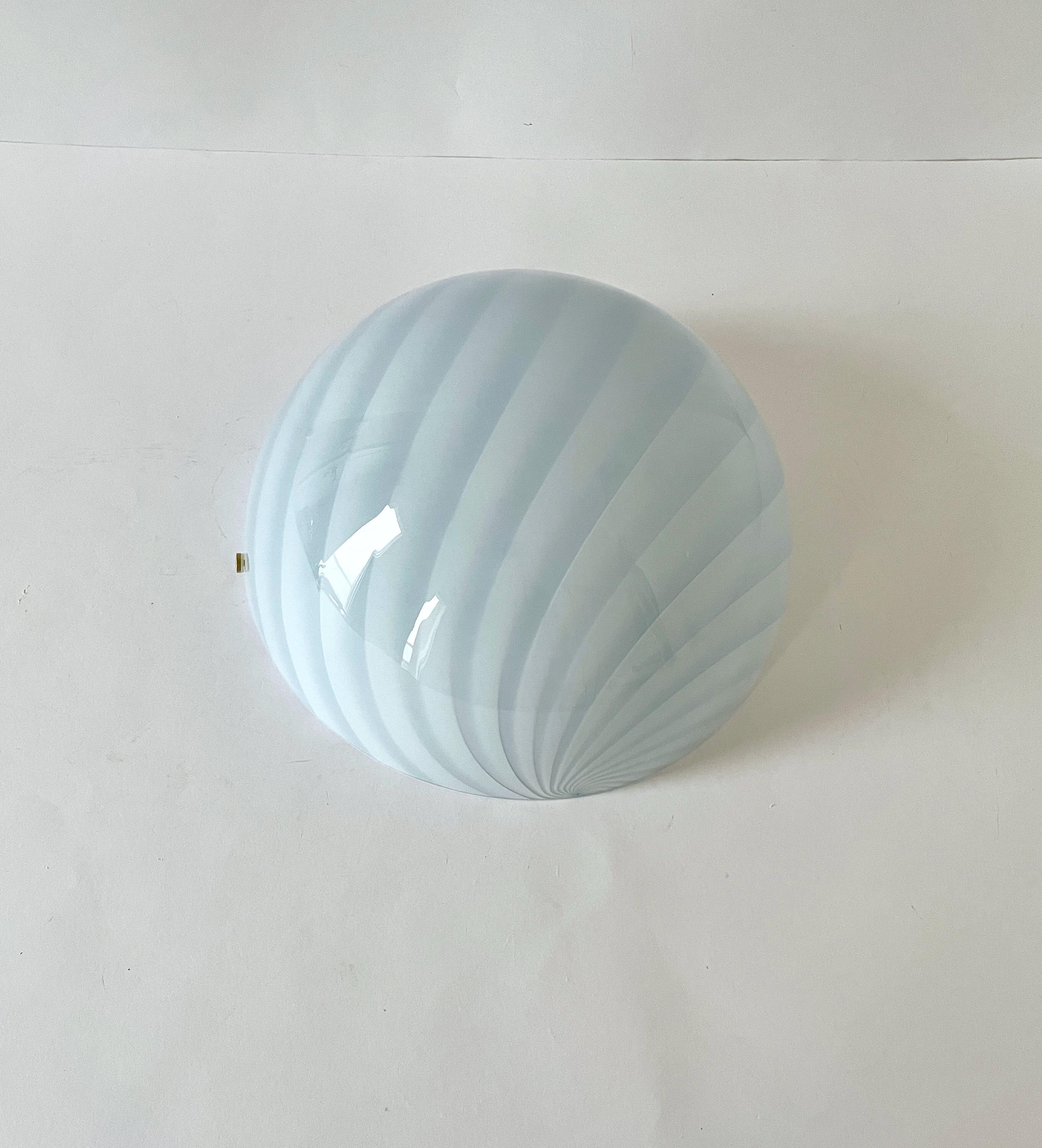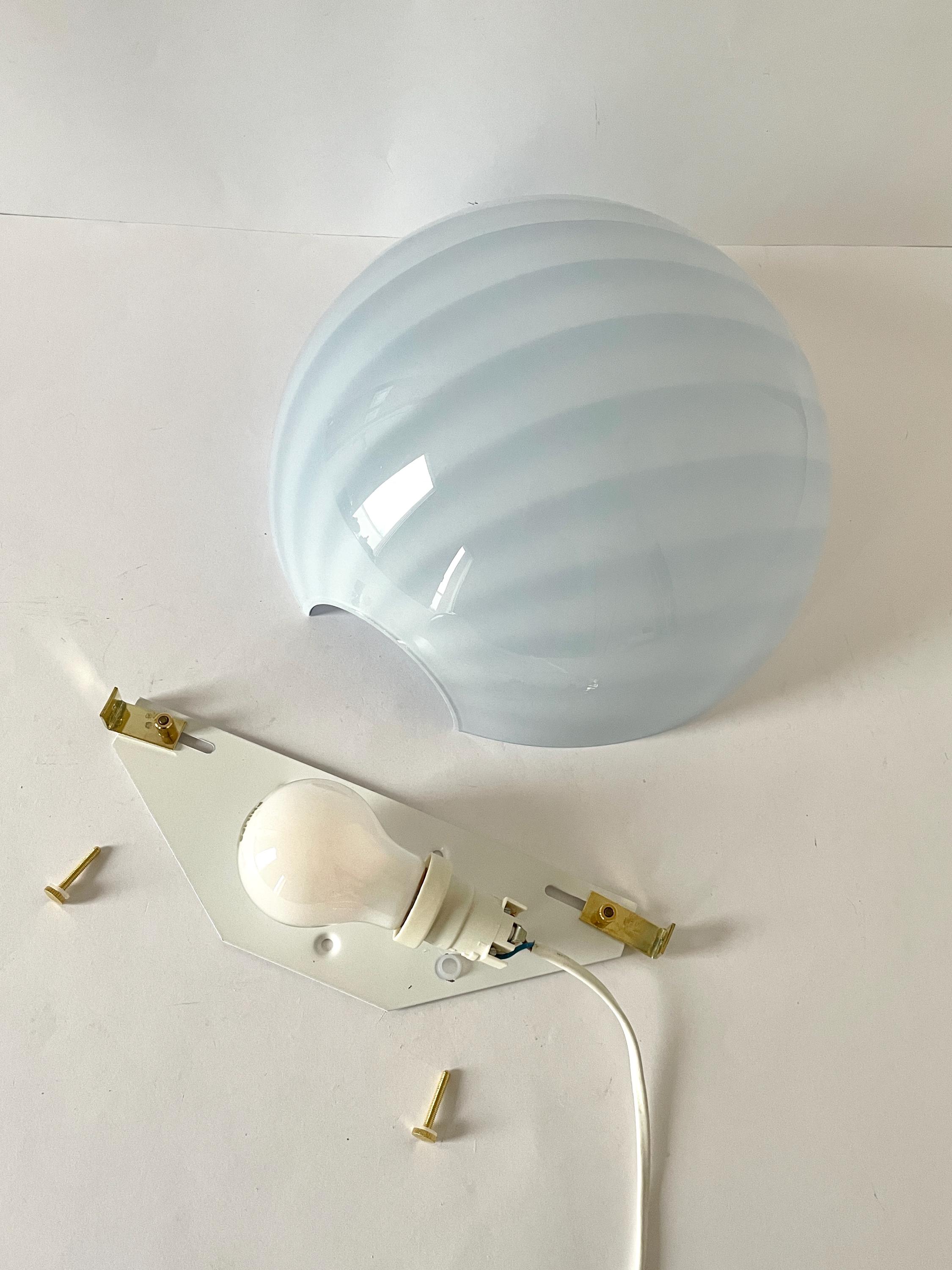 Splendid LUNA PIENA wall lamp (Cloud Blue) in mouth-blown Murano glass, using the ancient Murano technique of twisted "rigadin" (spiral), beautiful cased glass, cloud blue on the outside and white on the inside, the frame has a white finish with gold screws.