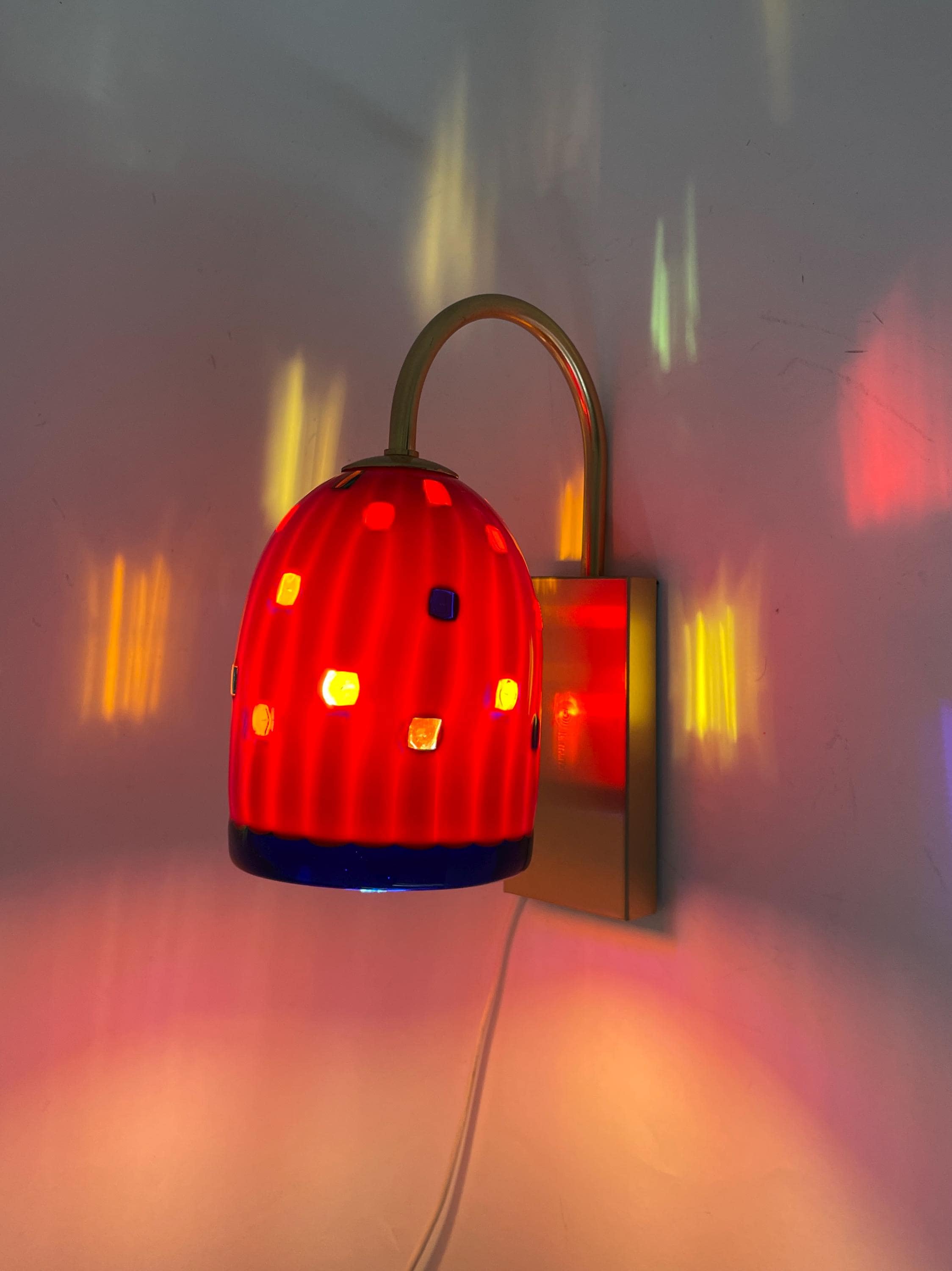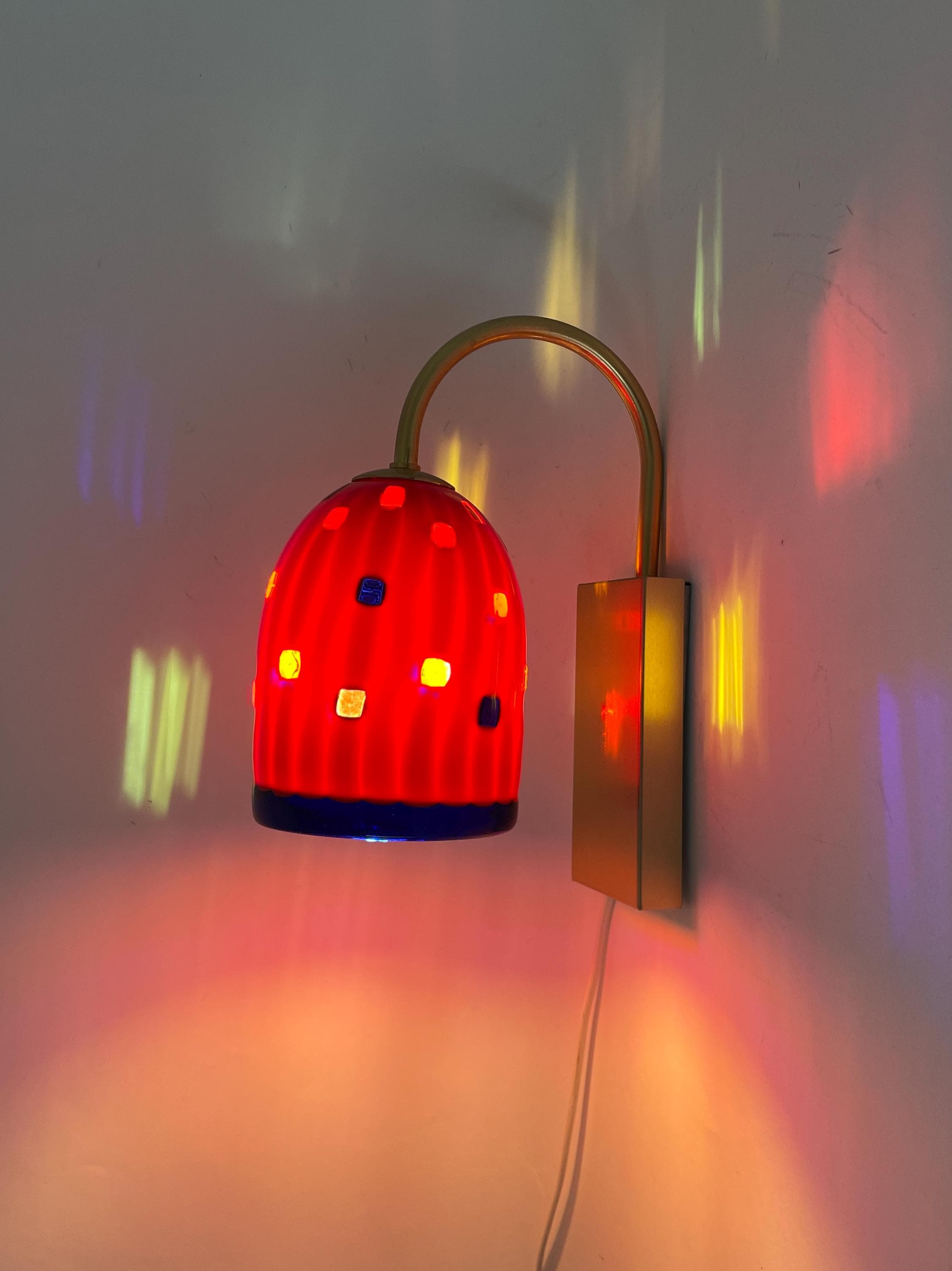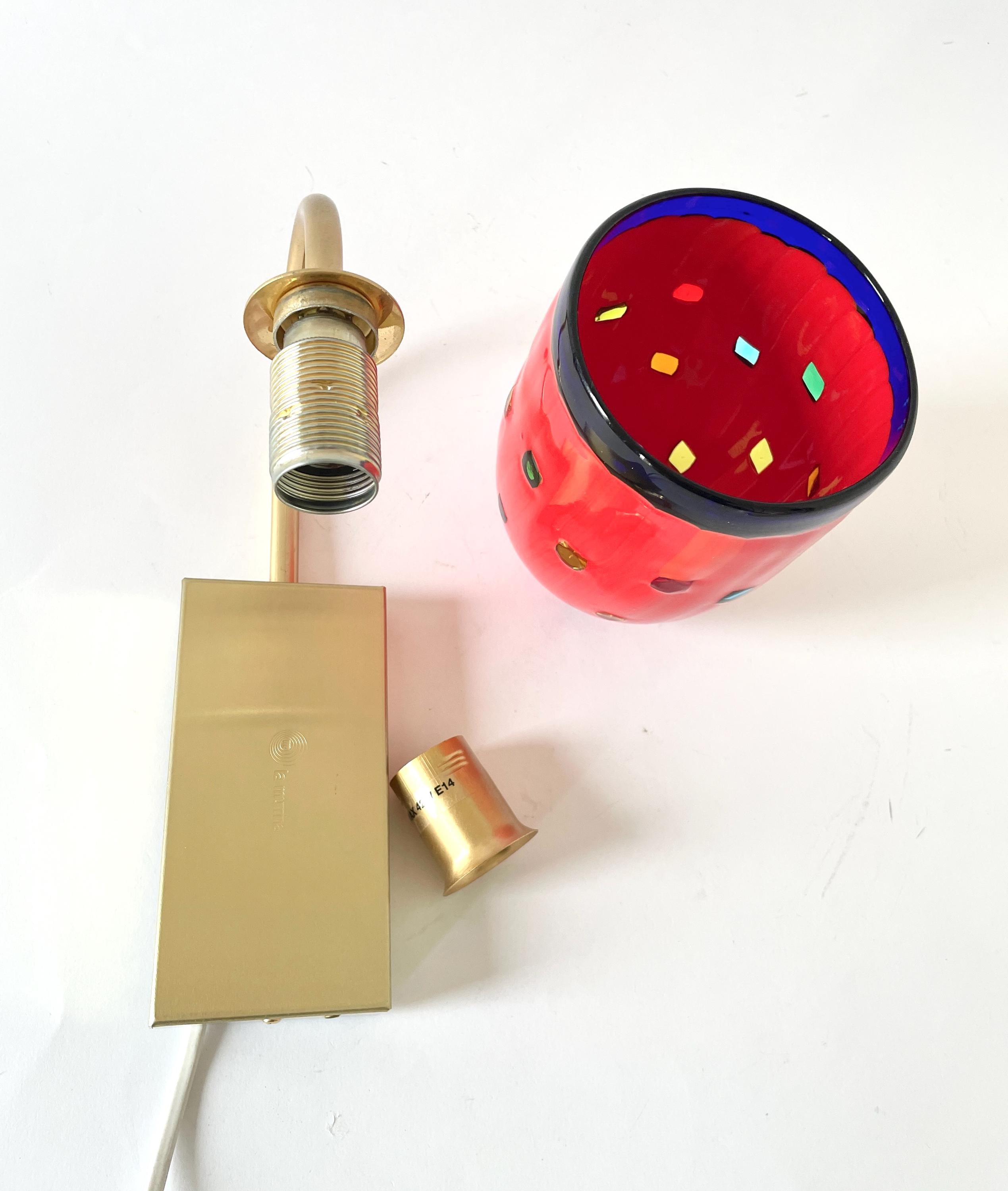 The glass is beautiful, handcrafted by the master glassmaker of Murano, with the insertion of many colored glass tiles on red glass, the frame has a satin gold finish.