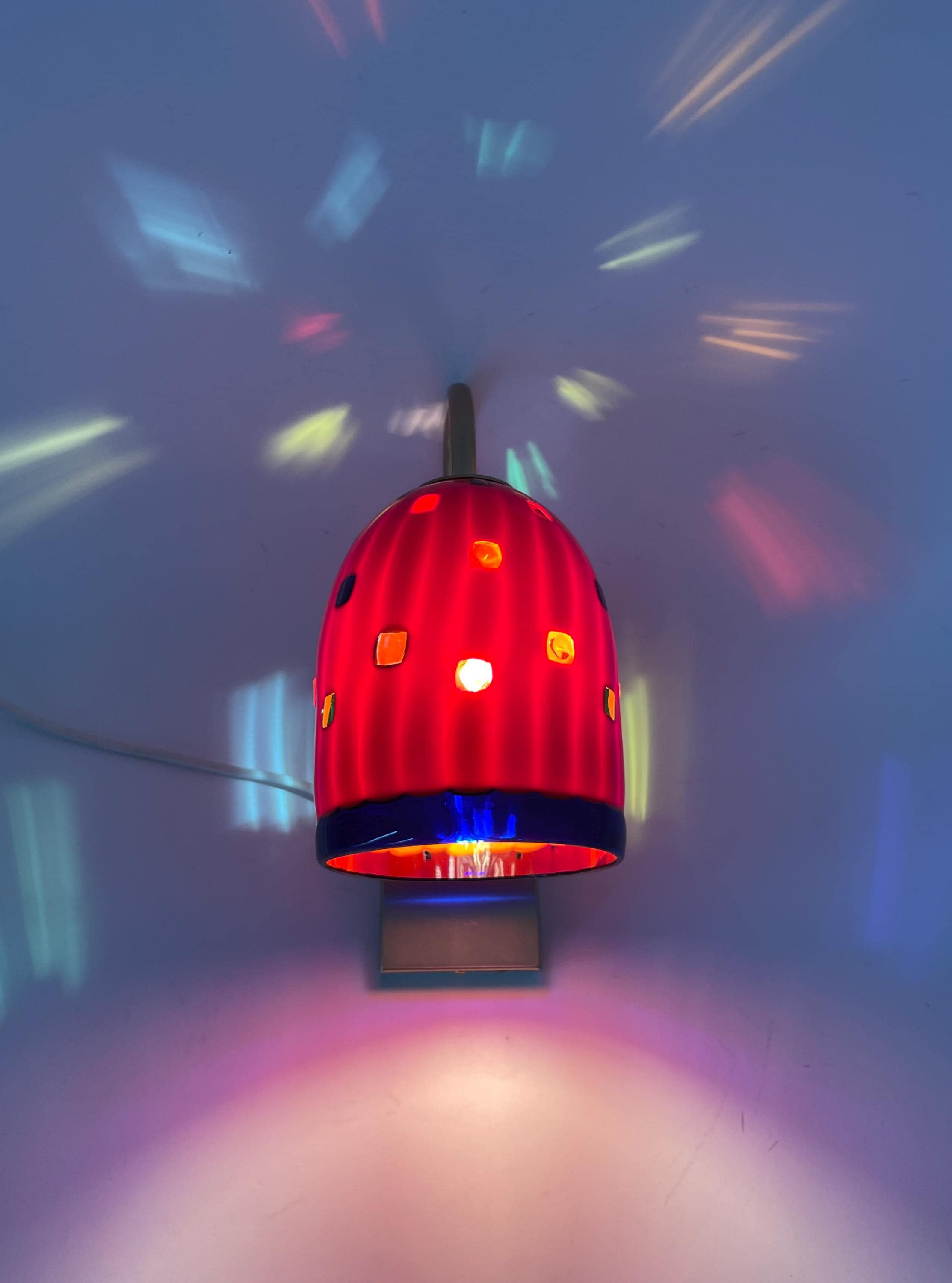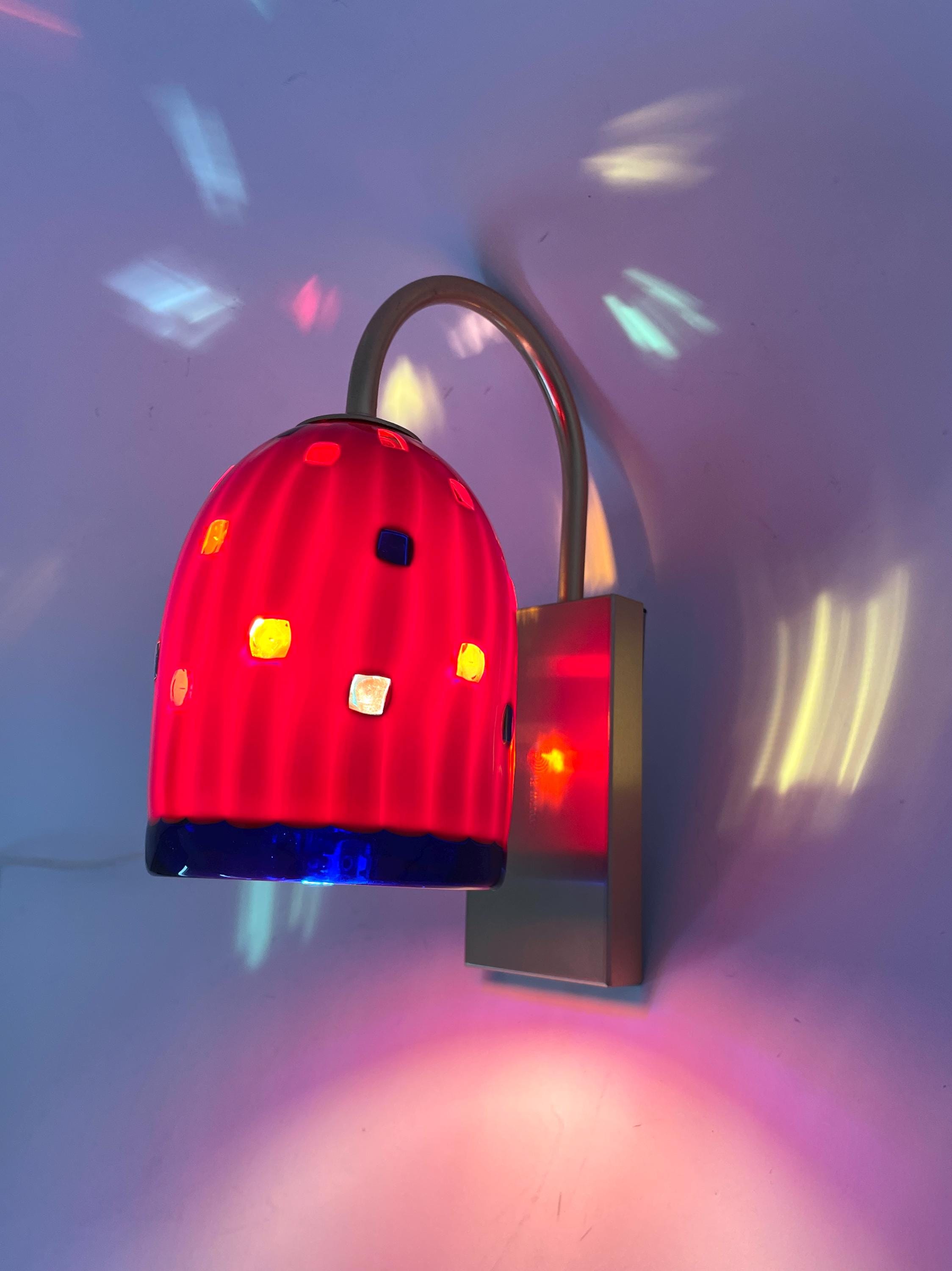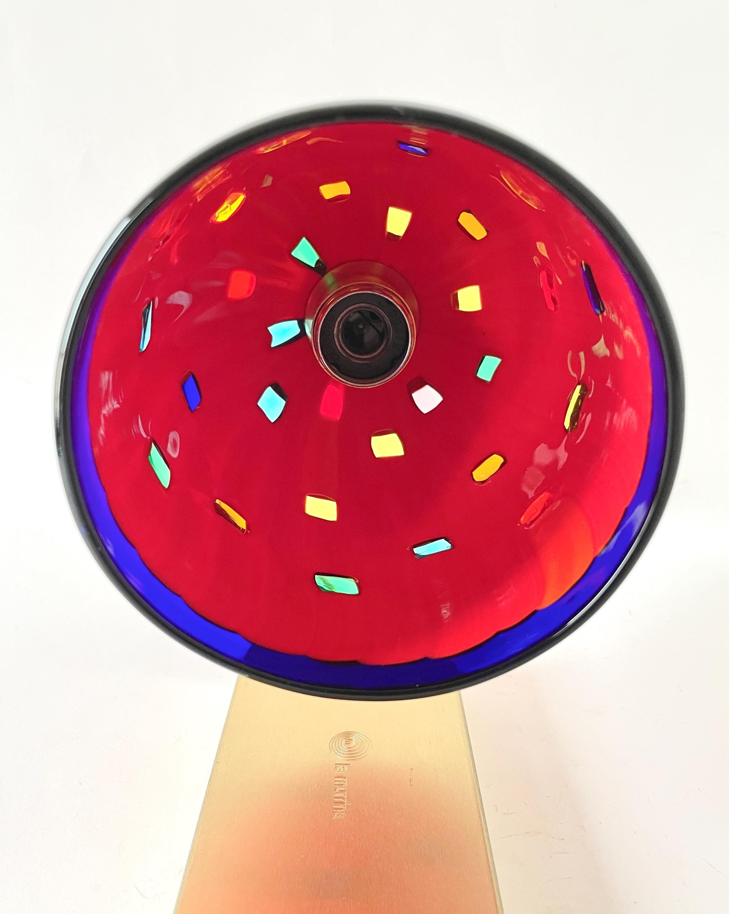 The glass is beautiful, handcrafted by the master glassmaker of Murano, with the insertion of many colored glass tiles on red glass, the frame has a satin gold finish.