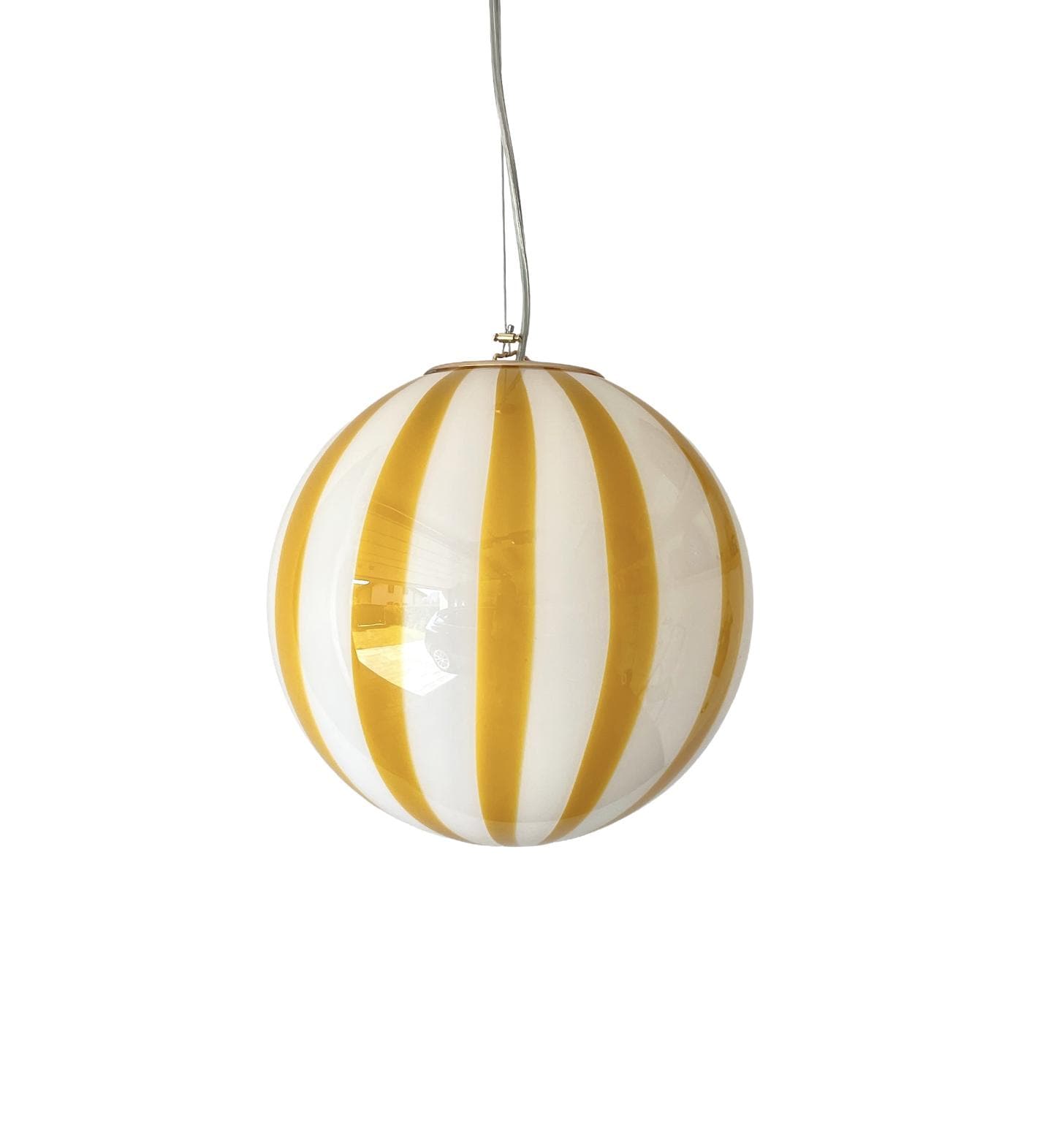These chandeliers are spherical in shape with amber yellow rods on a white background, the frame has a satin gold finish.
