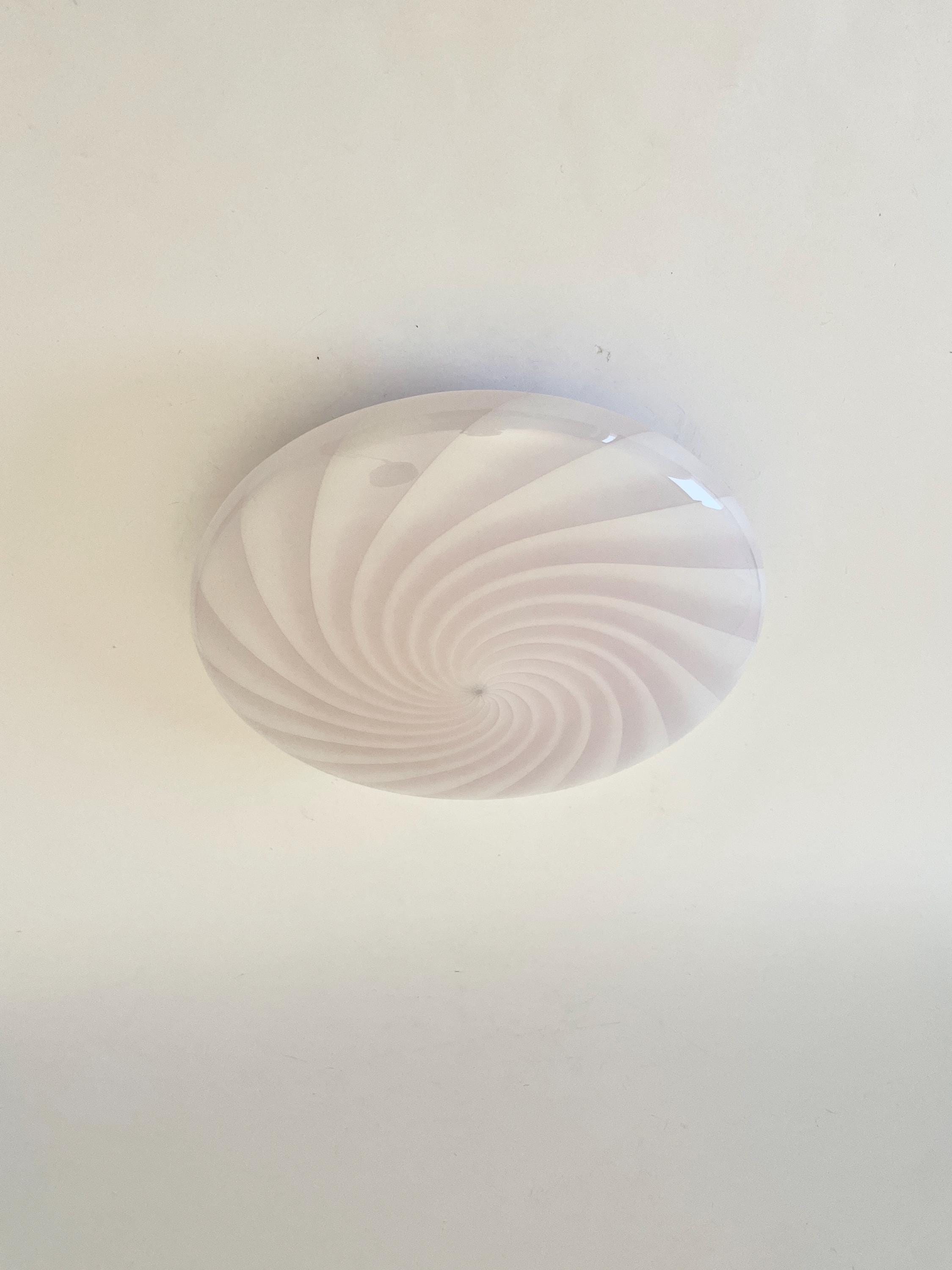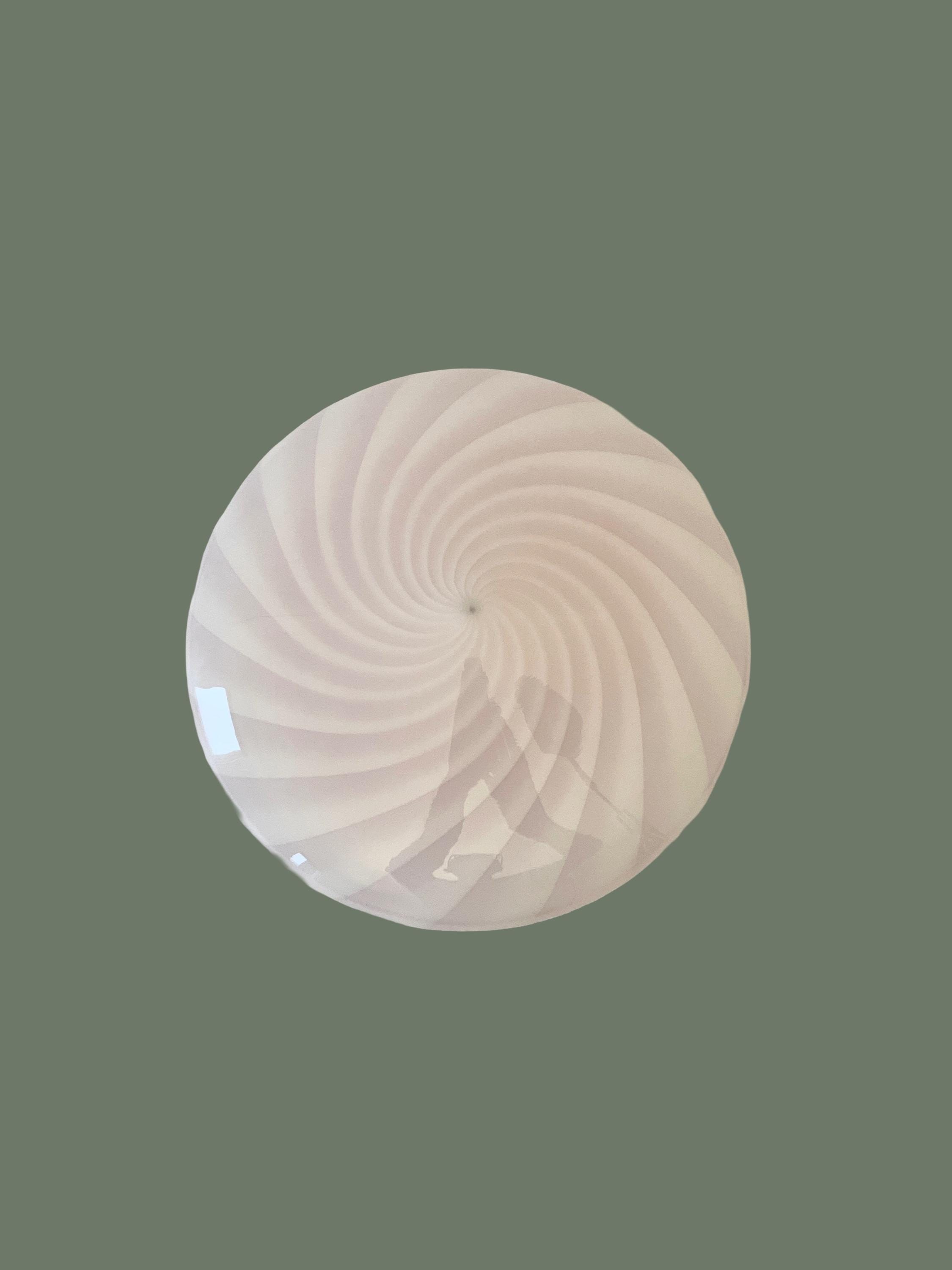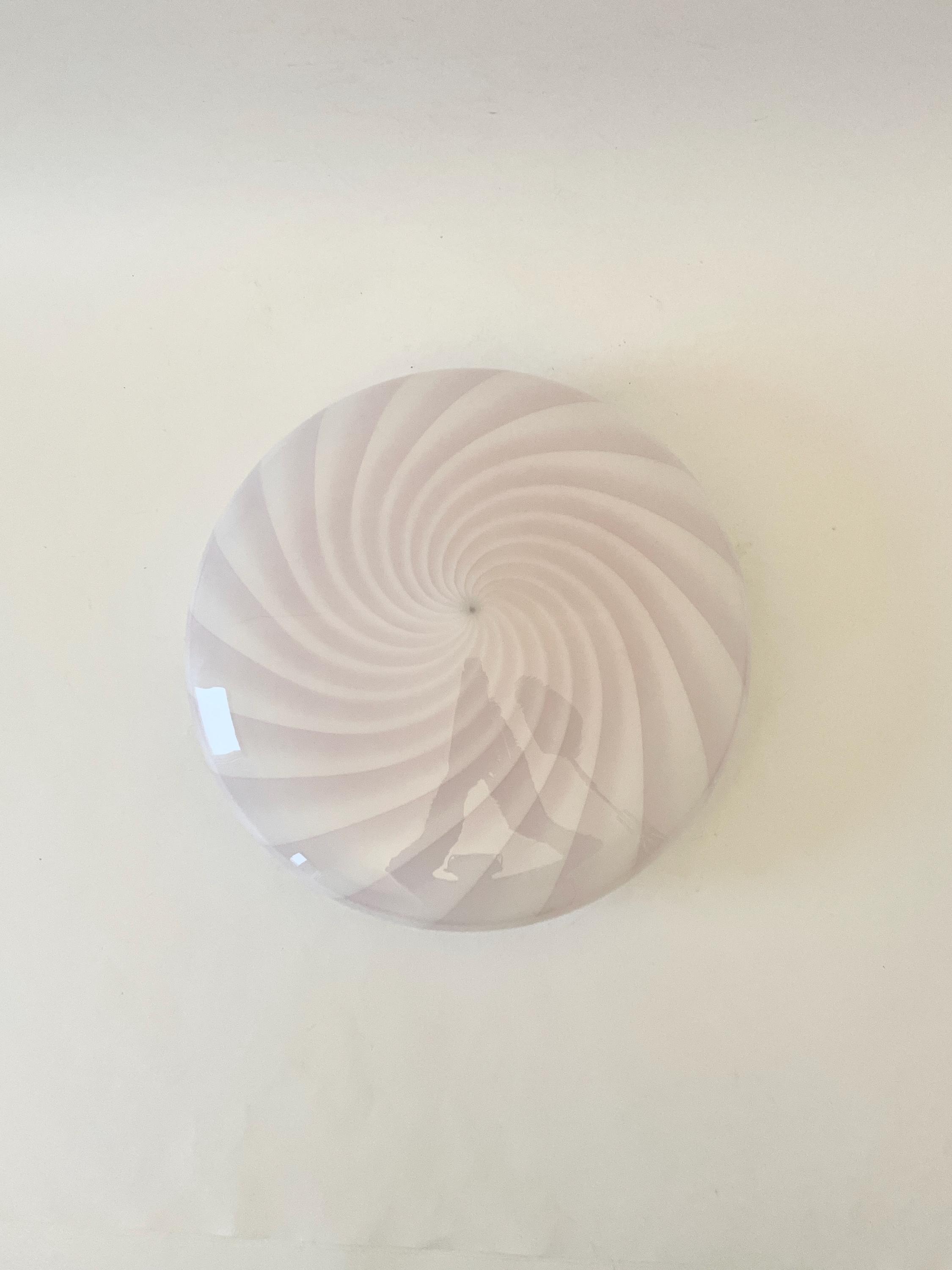 Splendid wall or ceiling lamp in Murano glass, mouth-blown, using the ancient Murano technique of twisted "rigadin". The beautiful cased glass features various shades from pink to white, and the frame has a white finish.