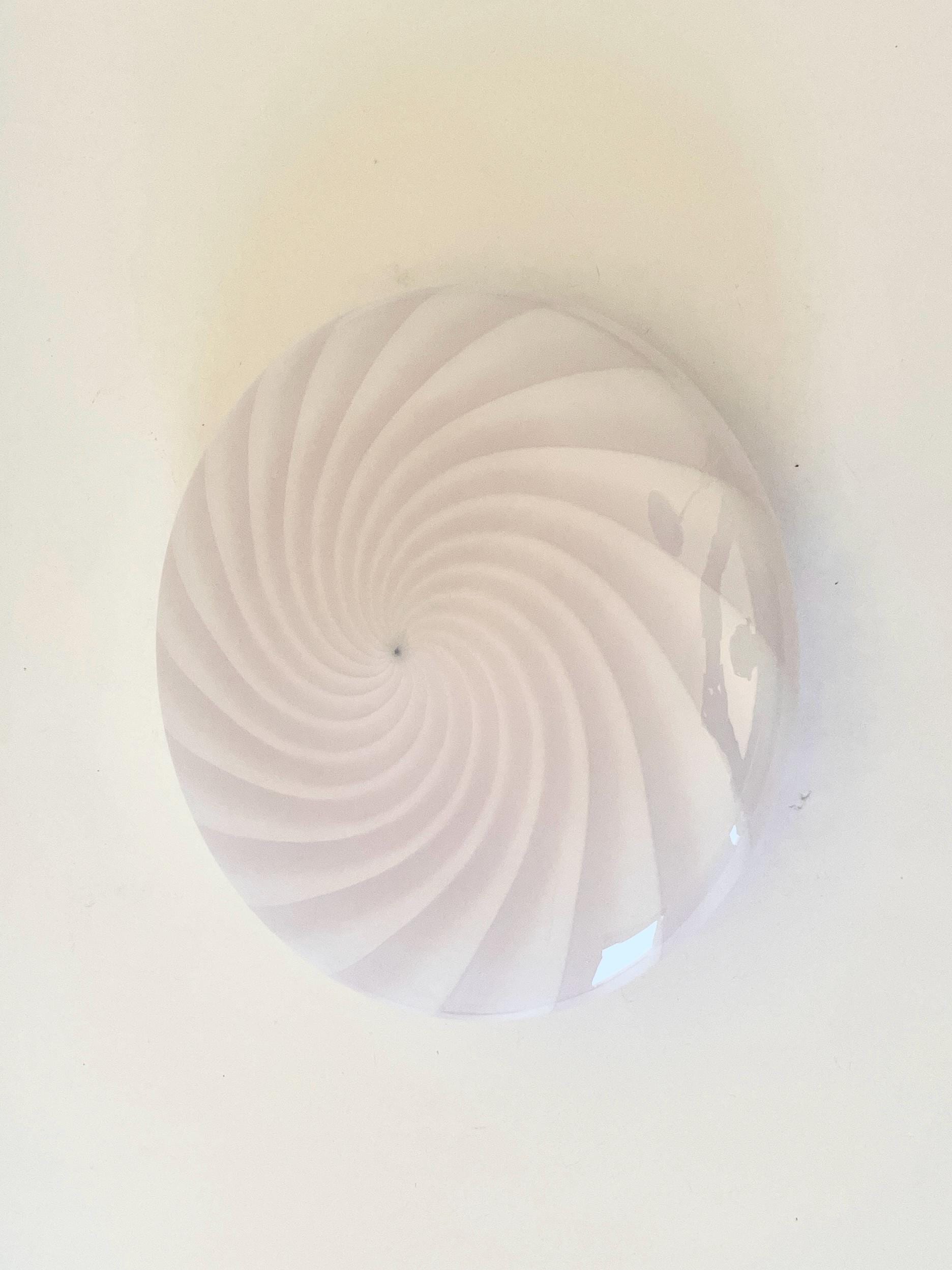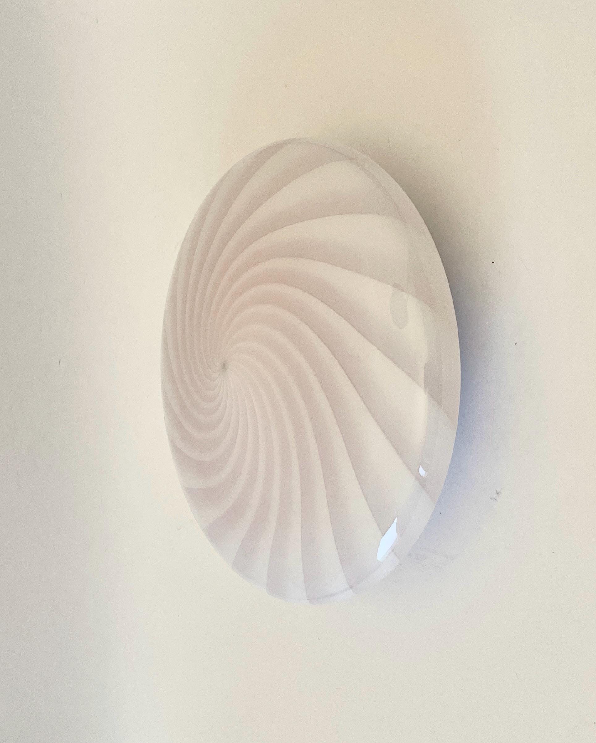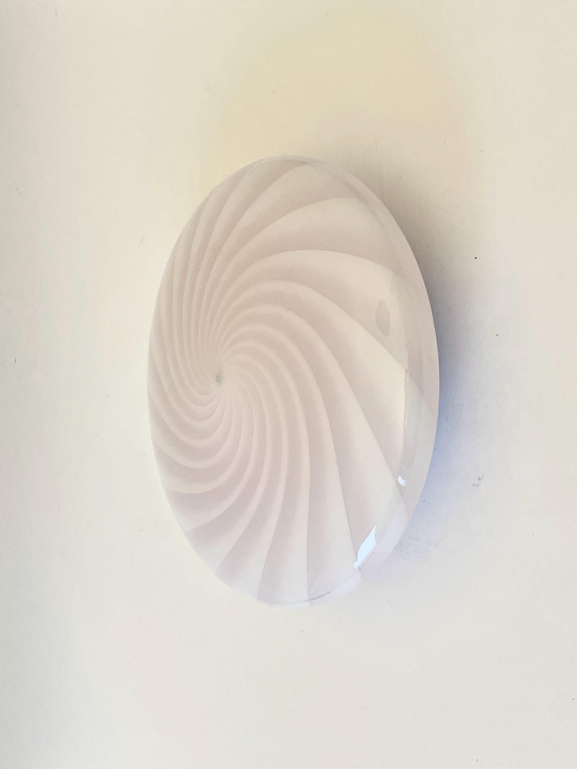 Splendid wall or ceiling lamp in Murano glass, mouth-blown, using the ancient Murano technique of twisted "rigadin". The beautiful cased glass features various shades from pink to white, and the frame has a white finish.