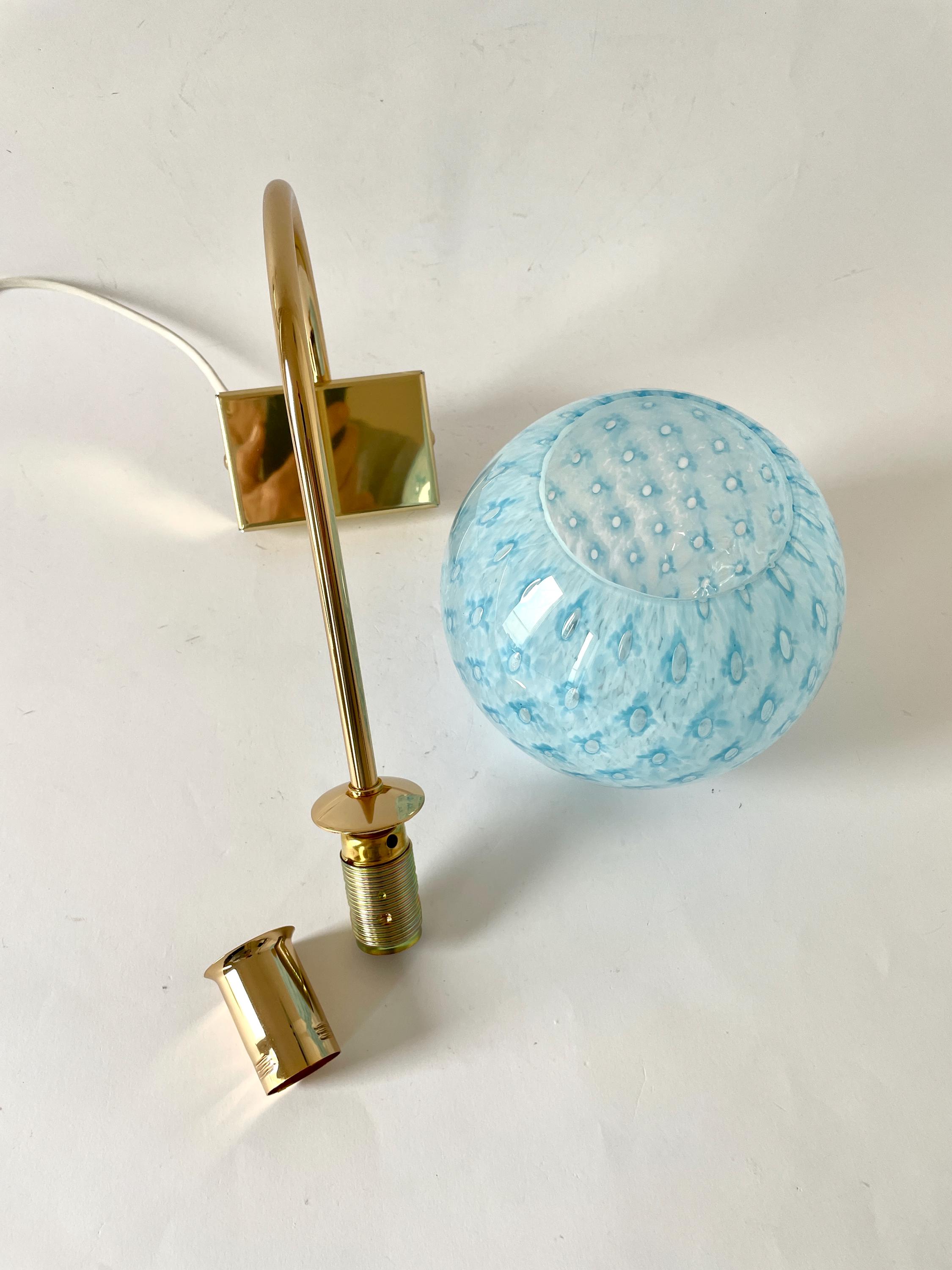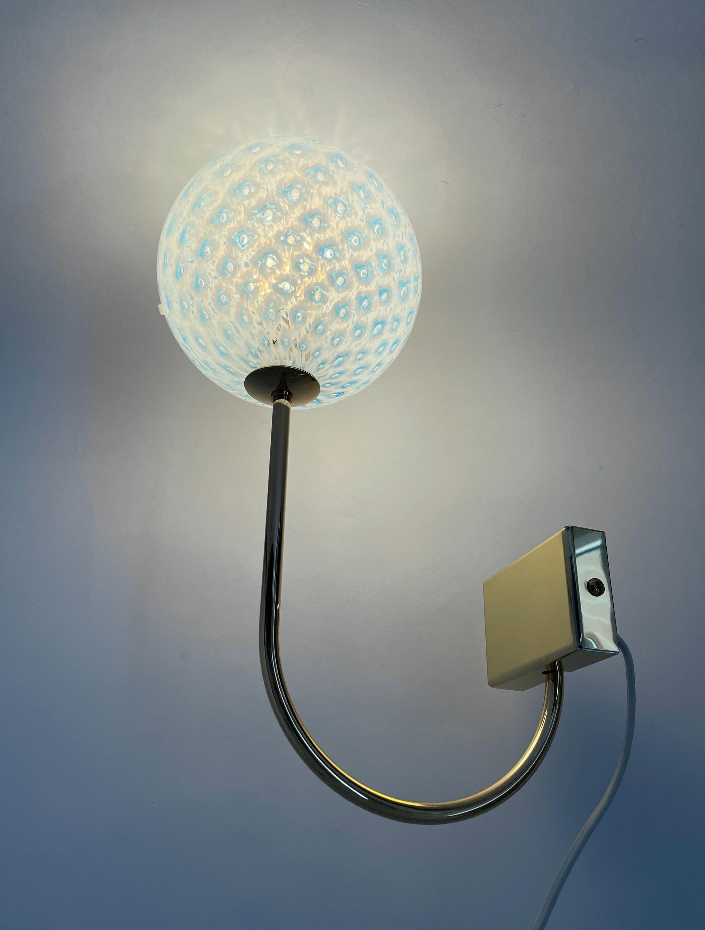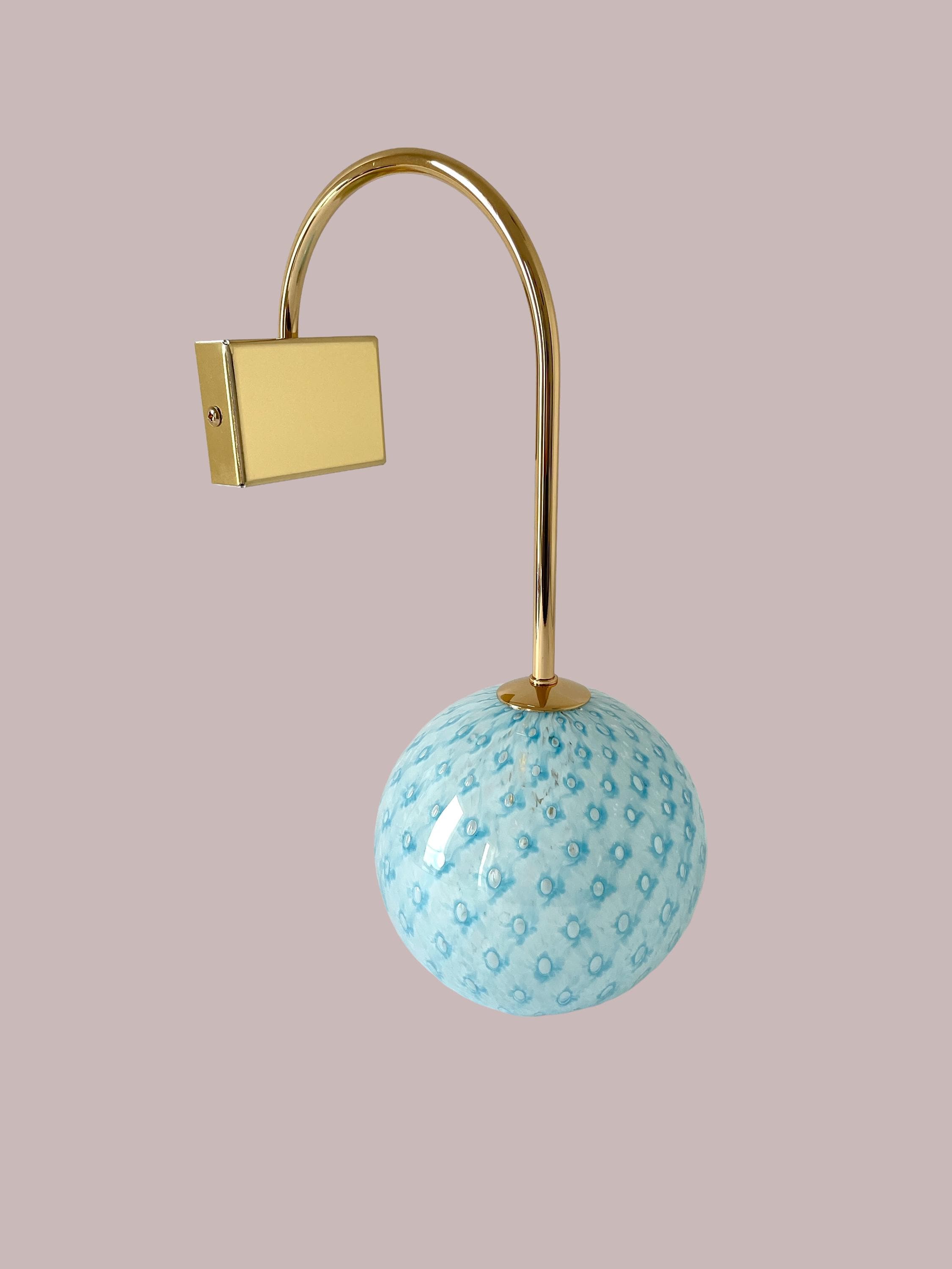 MACRAME' Wall 16 by LA MURRINA is a splendid wall lamp, vintage from the 90s, with beautiful Murano glass, in a spherical shape, mouth-blown and hand-crafted by master glassmakers of Murano, in the peacock polka dot technique, in light blue.