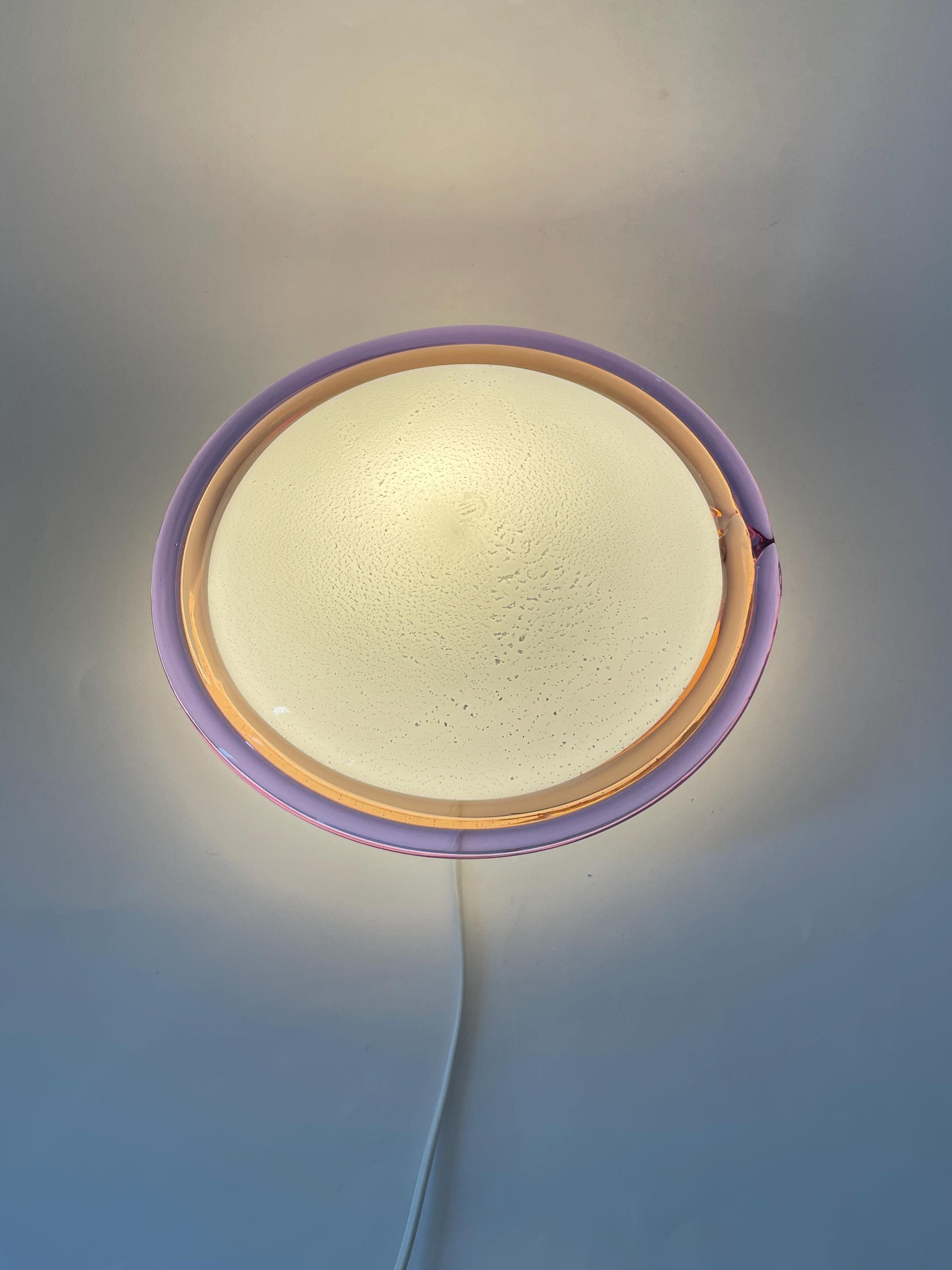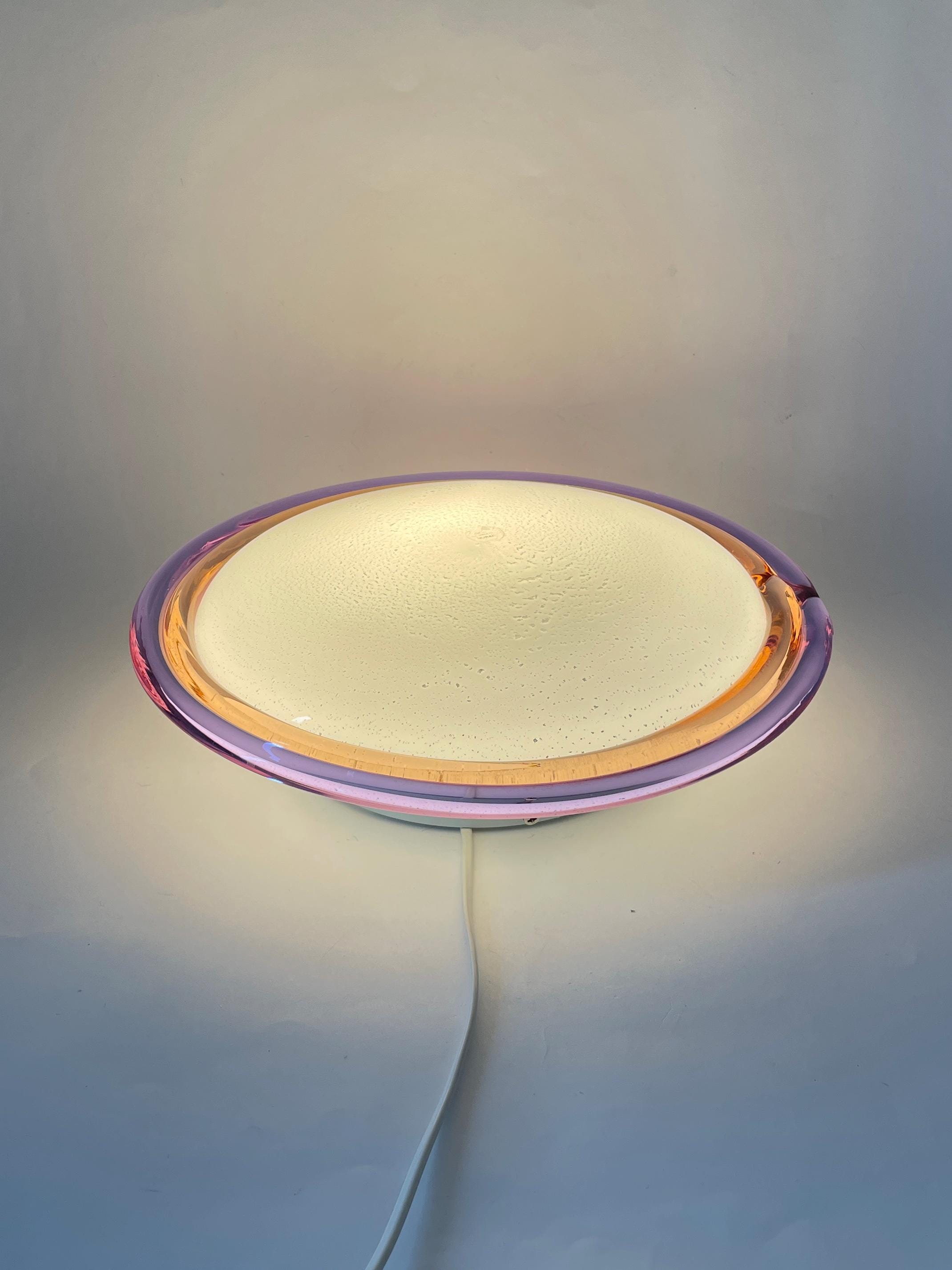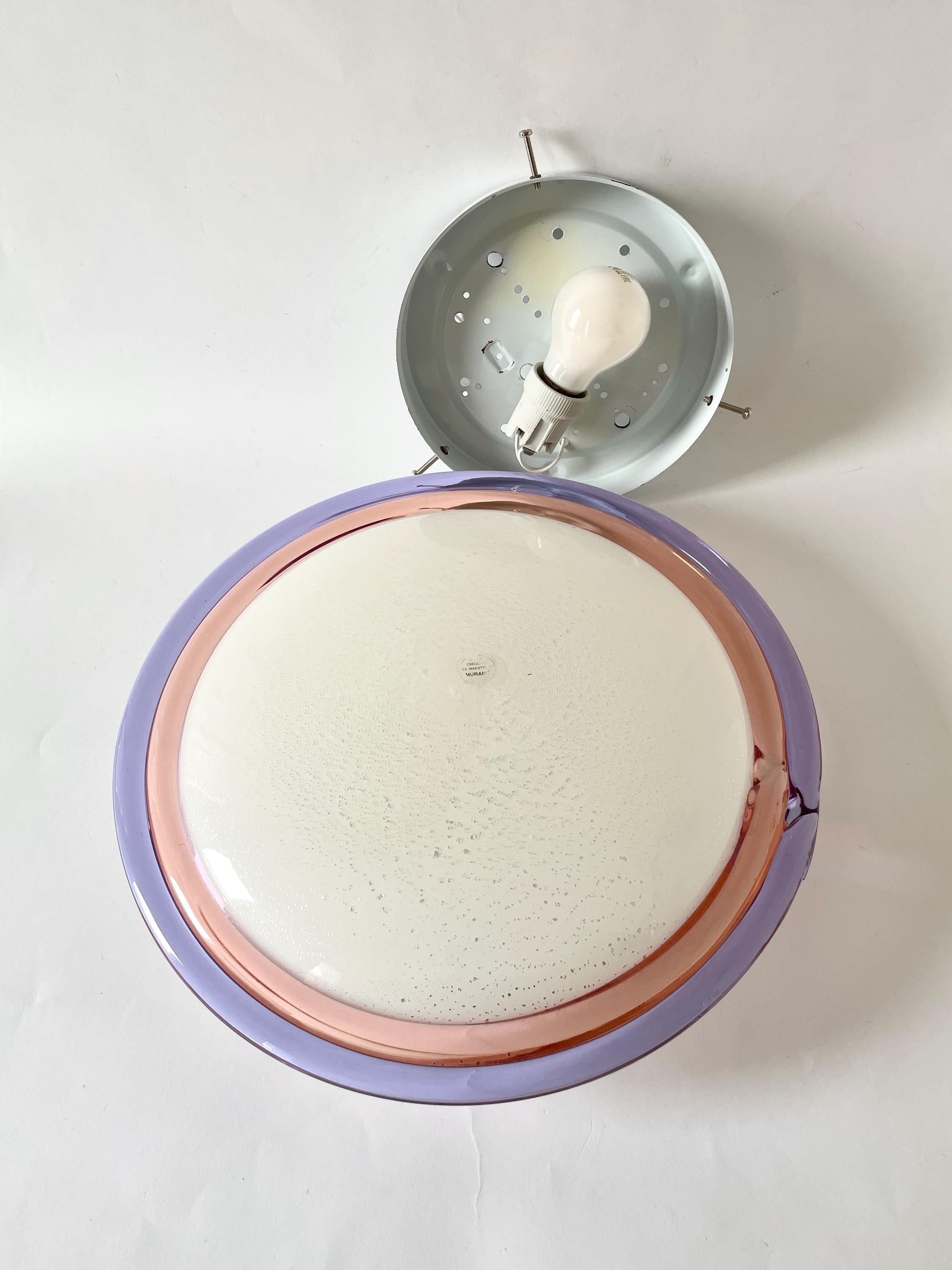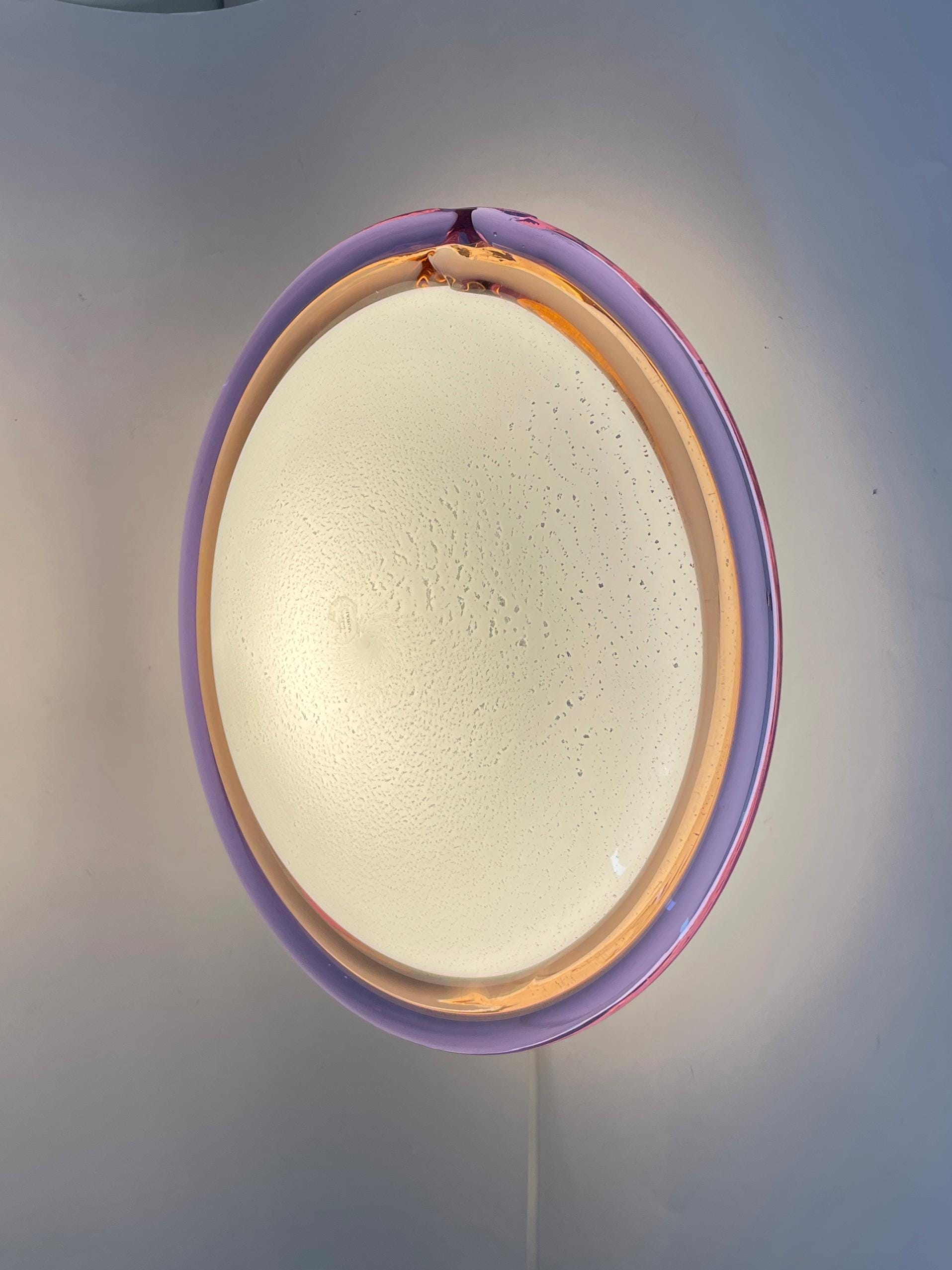 Splendid large vintage wall or ceiling lamp in Murano glass, mouth-blown using the ancient Murano technique of incalmo. In this case, it is made with a double glass edge, one pink and the other purple, and the frame has a white finish.
