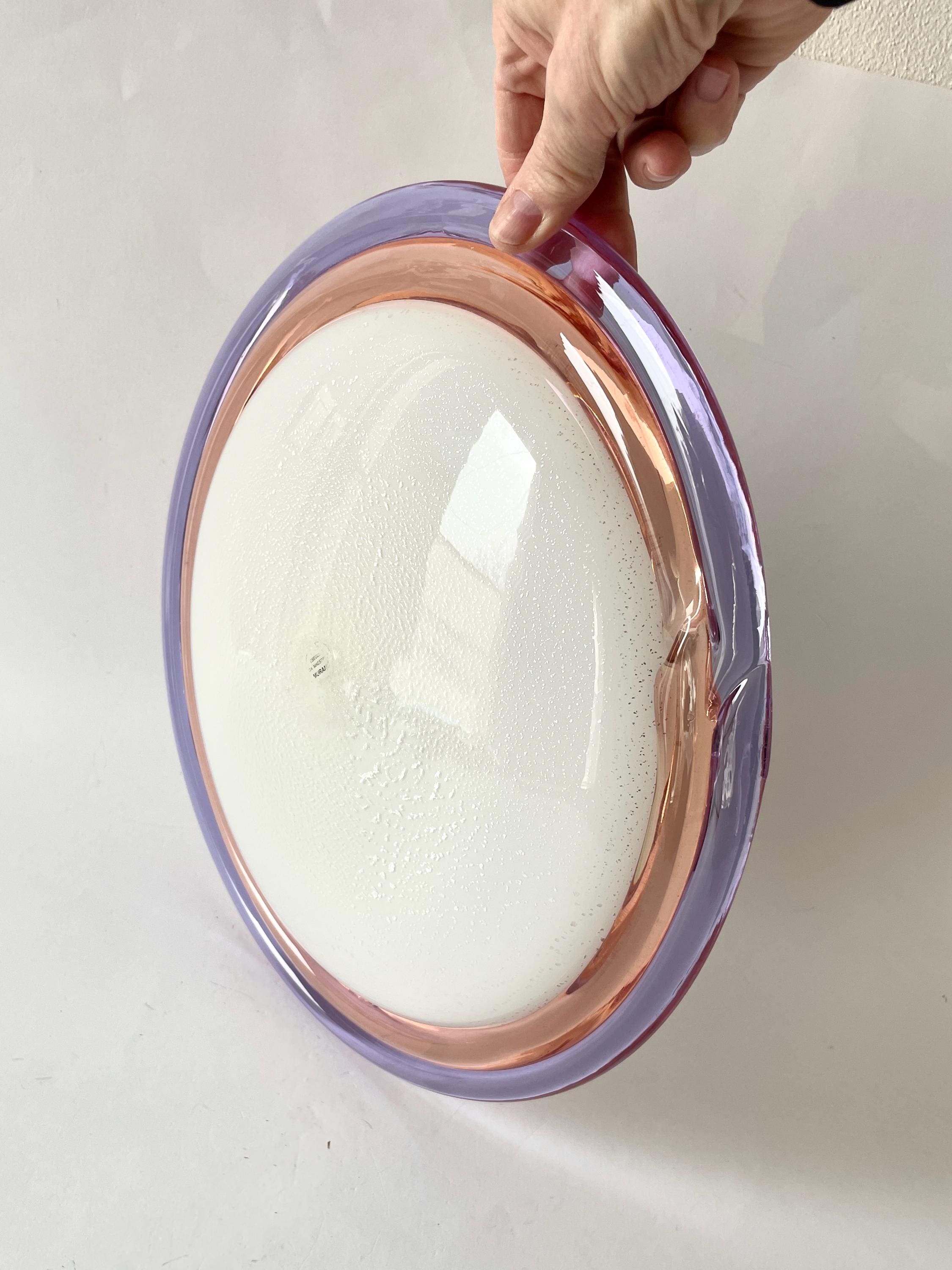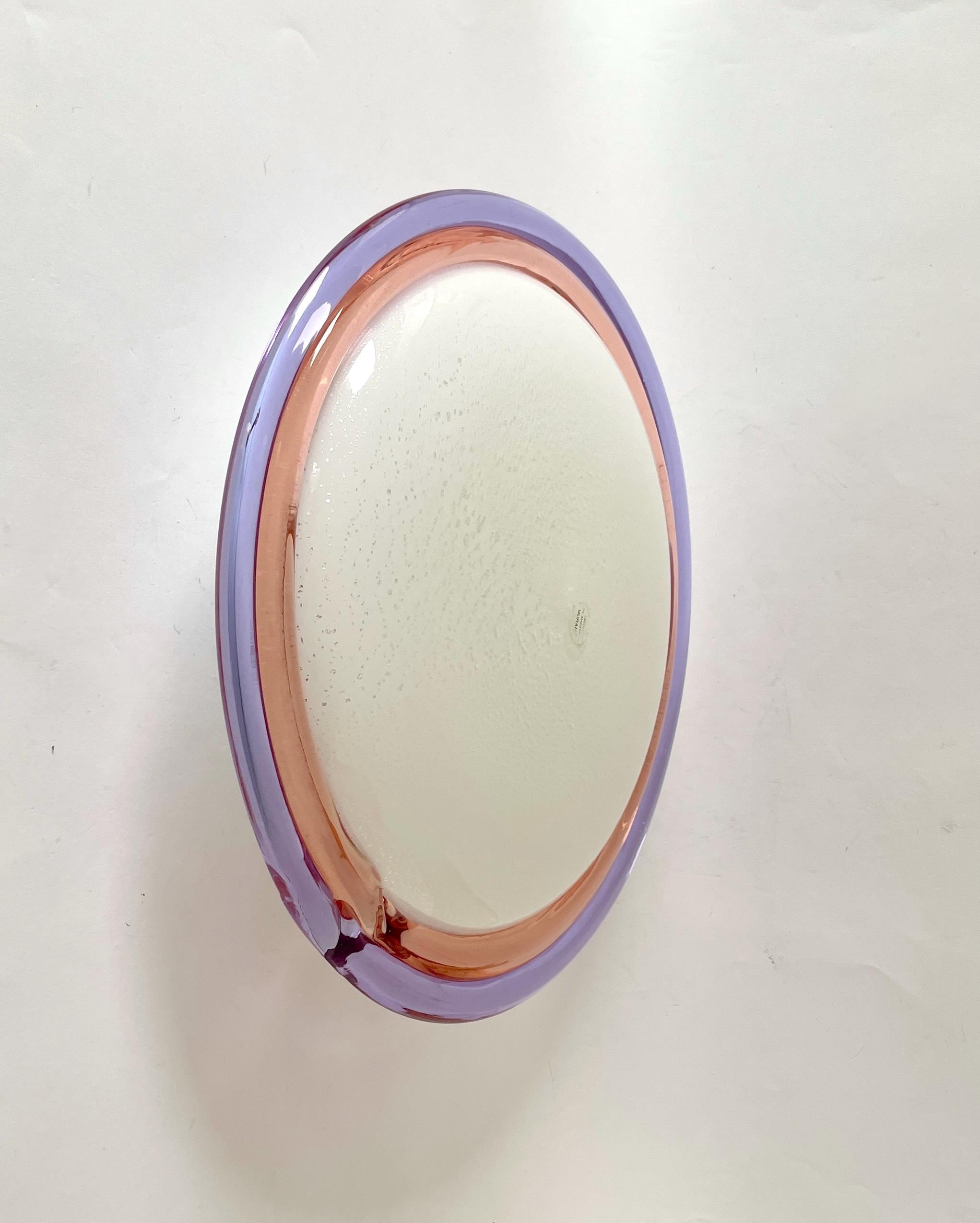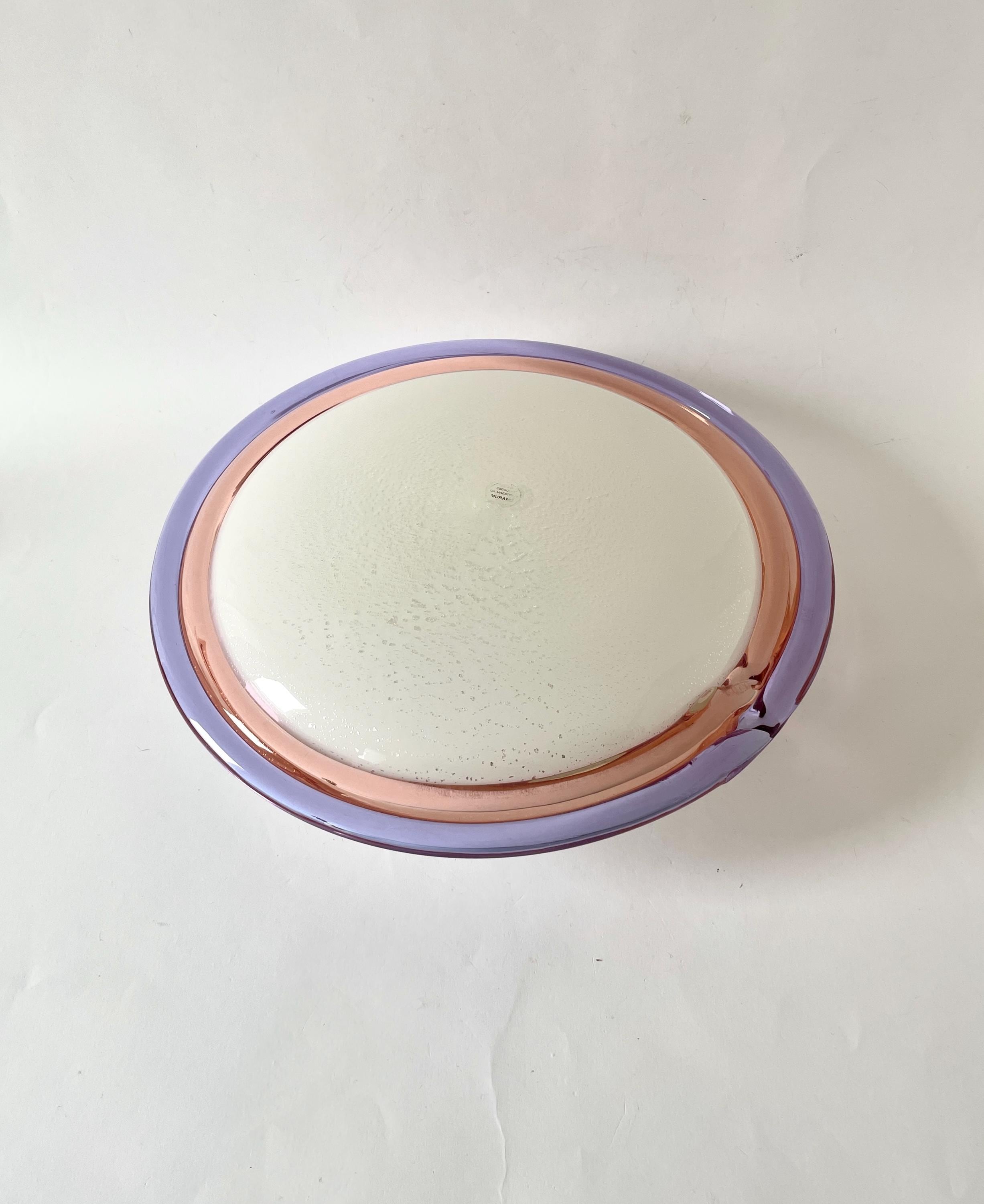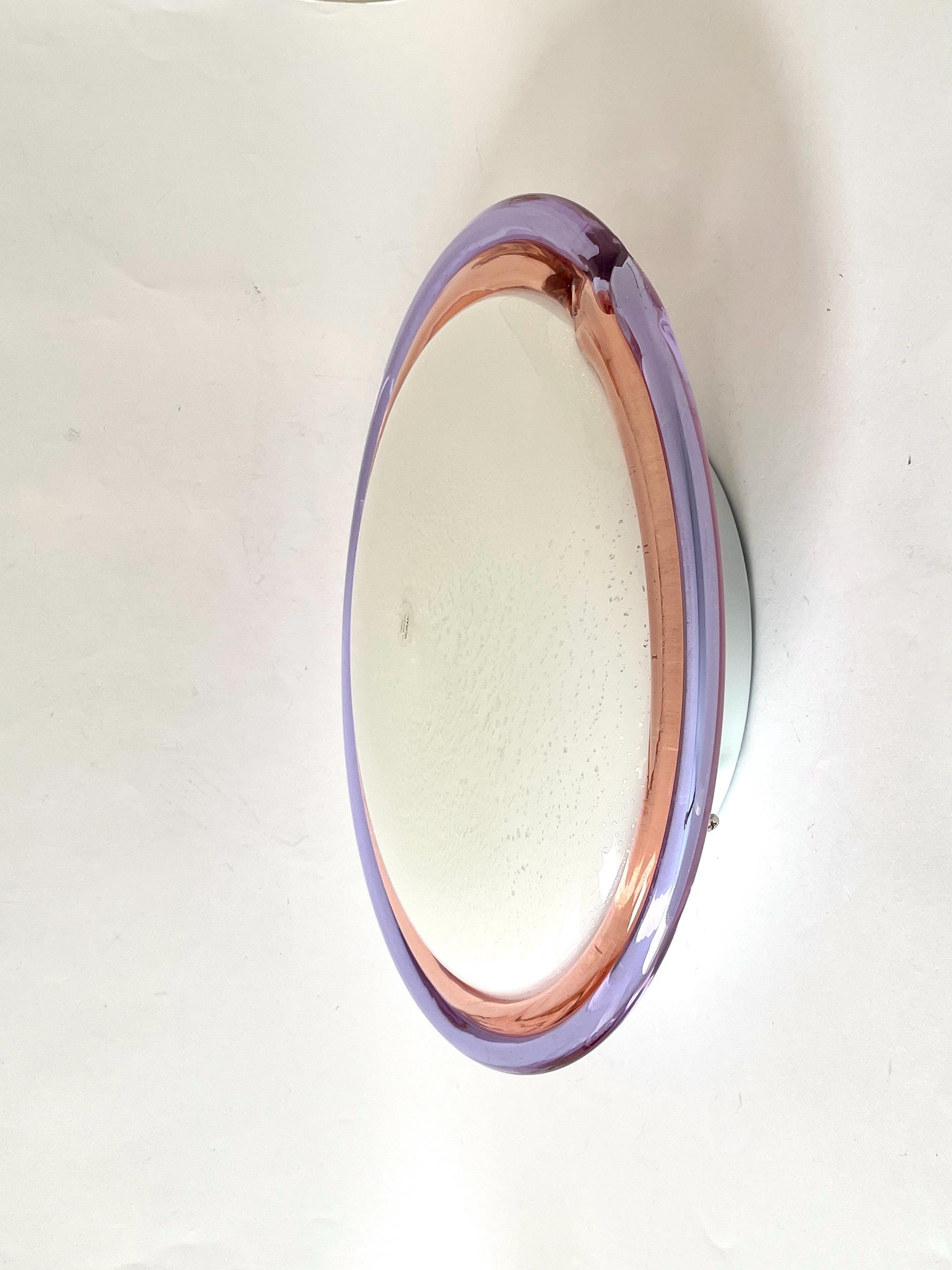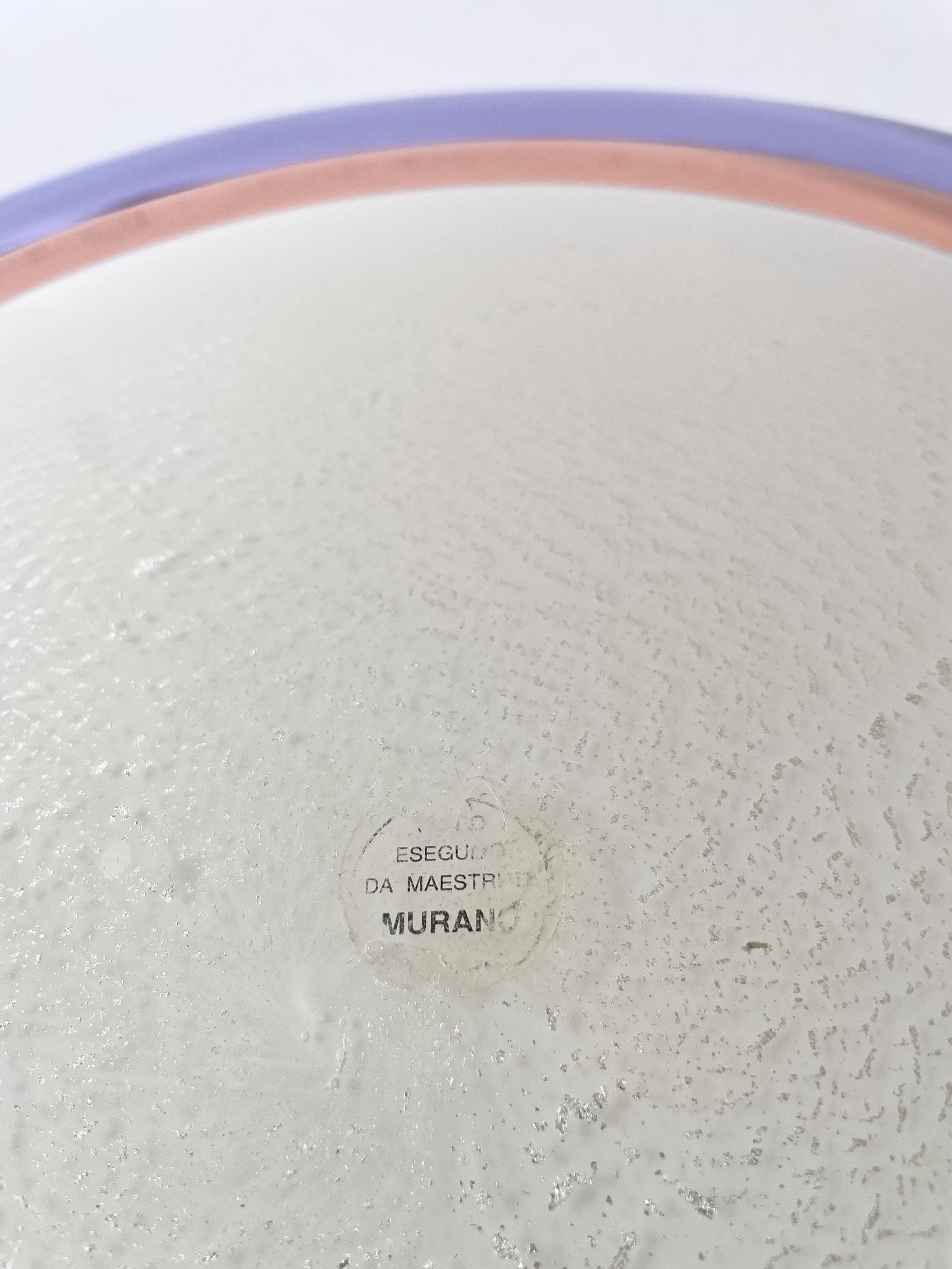 Splendid large vintage wall or ceiling lamp in Murano glass, mouth-blown using the ancient Murano technique of incalmo. In this case, it is made with a double glass edge, one pink and the other purple, and the frame has a white finish.