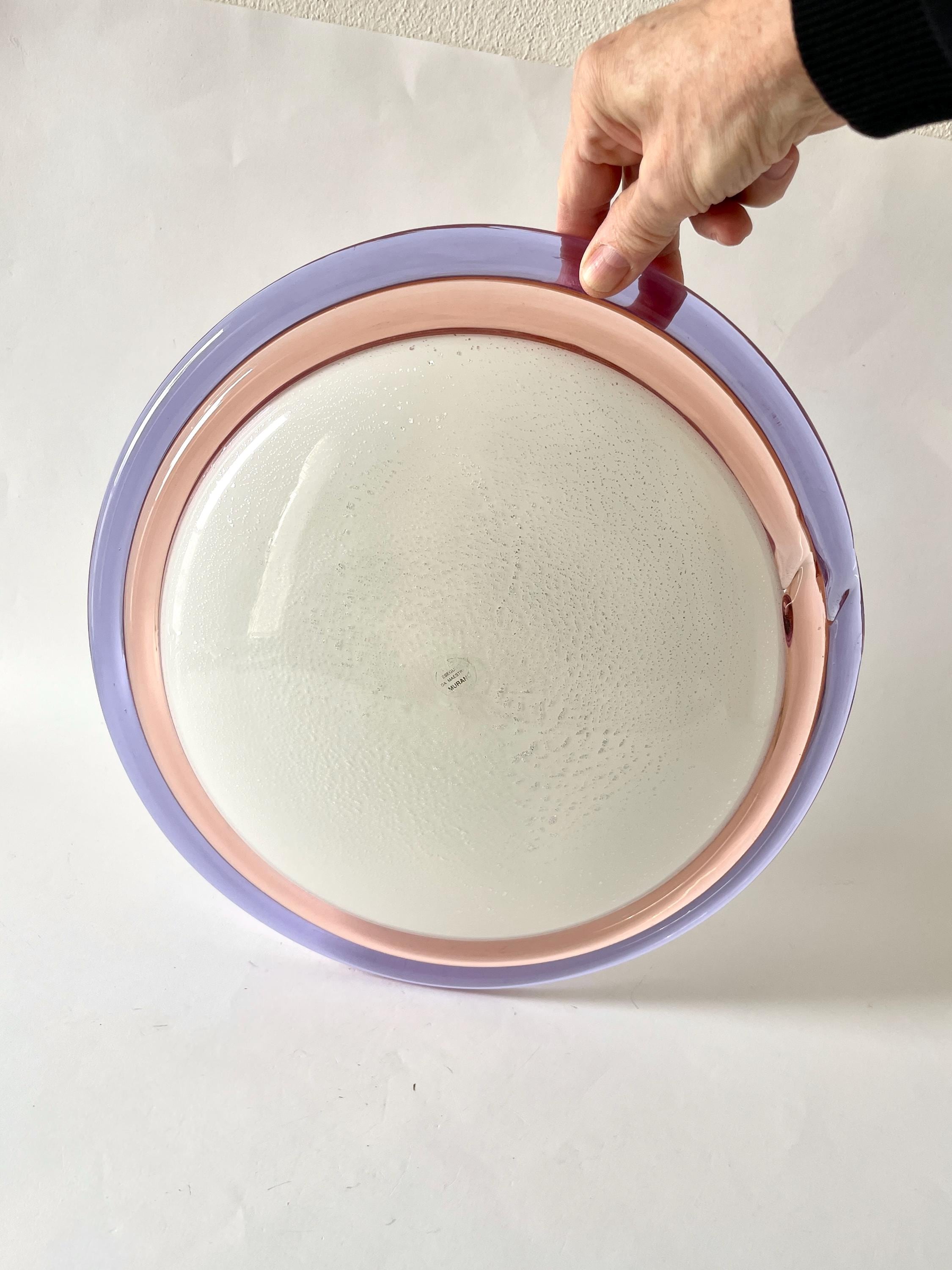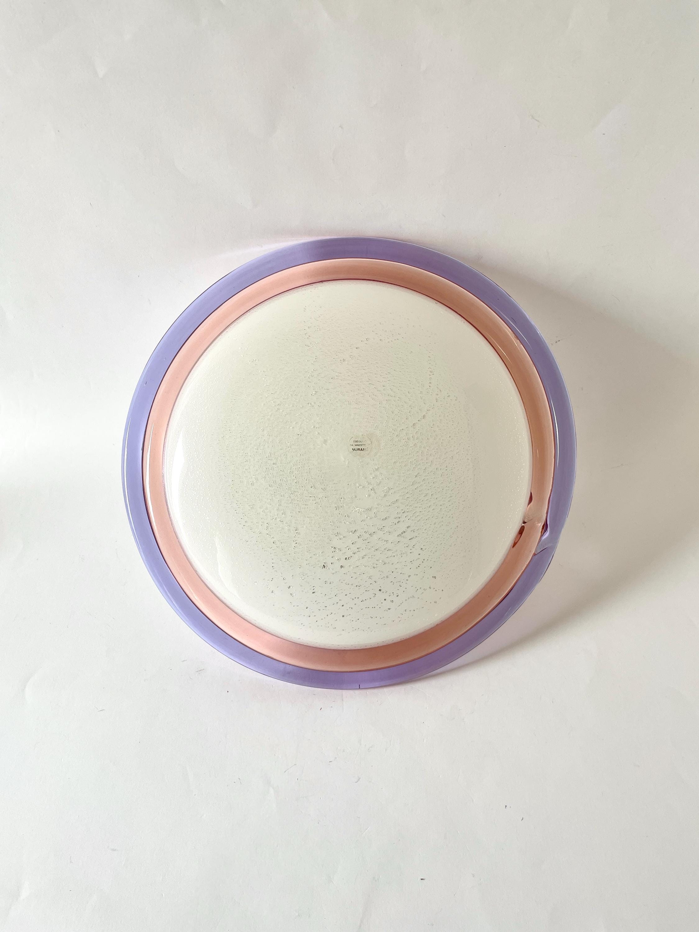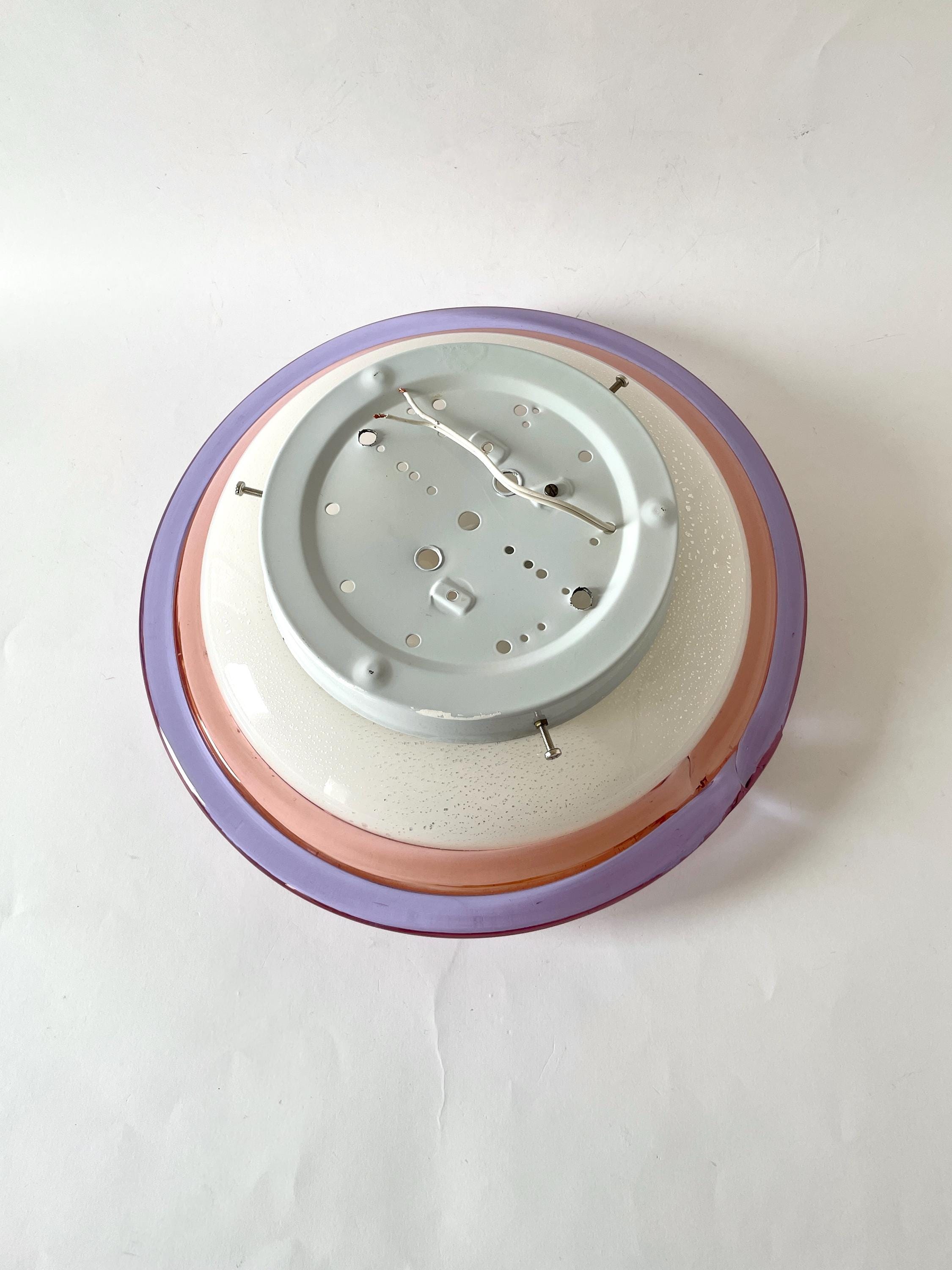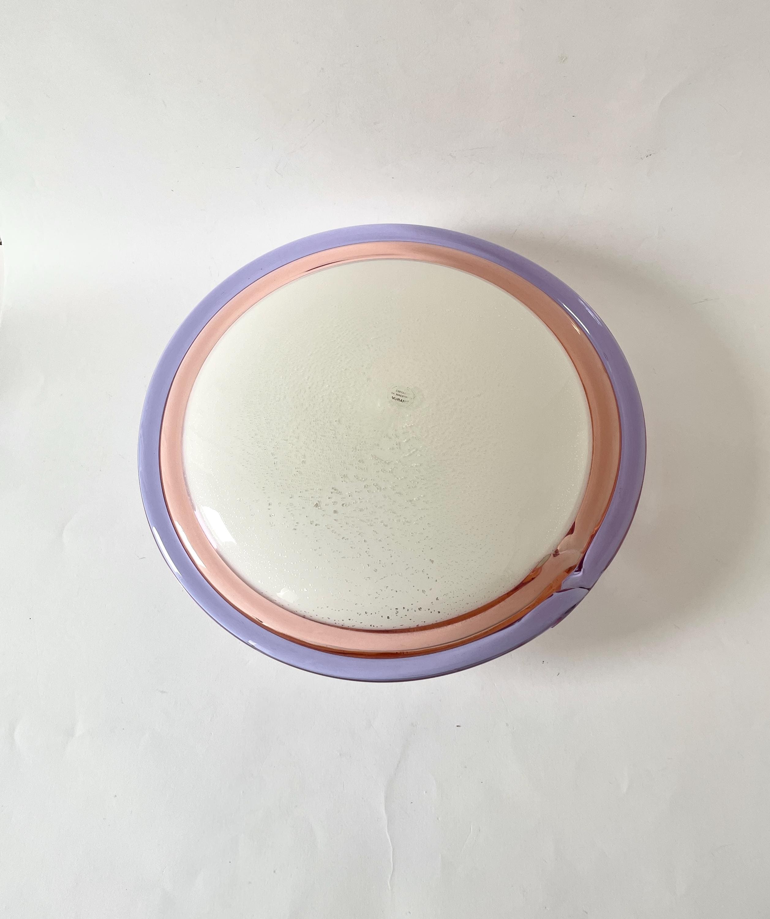 Splendid large vintage wall or ceiling lamp in Murano glass, mouth-blown using the ancient Murano technique of incalmo. In this case, it is made with a double glass edge, one pink and the other purple, and the frame has a white finish.