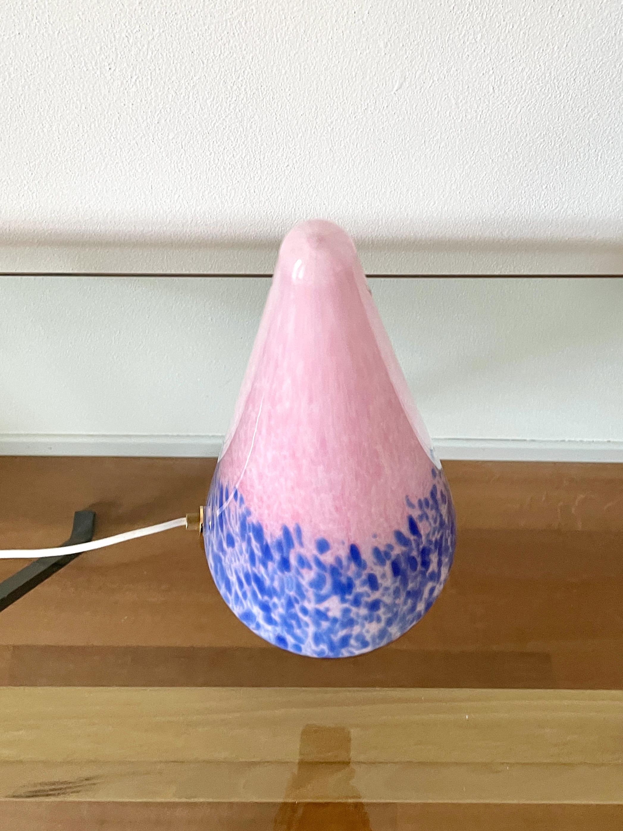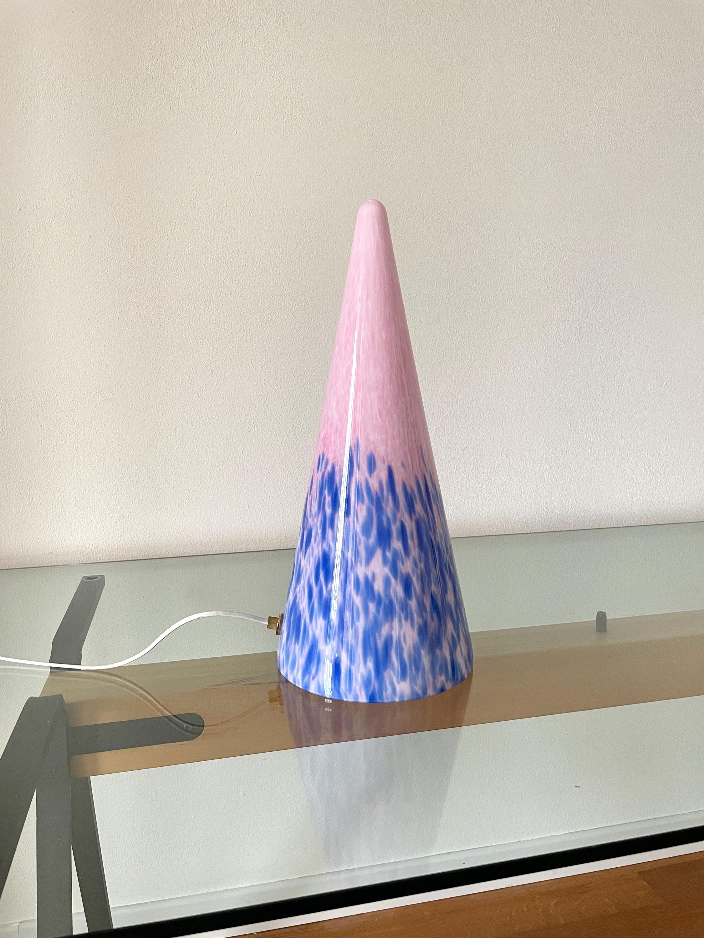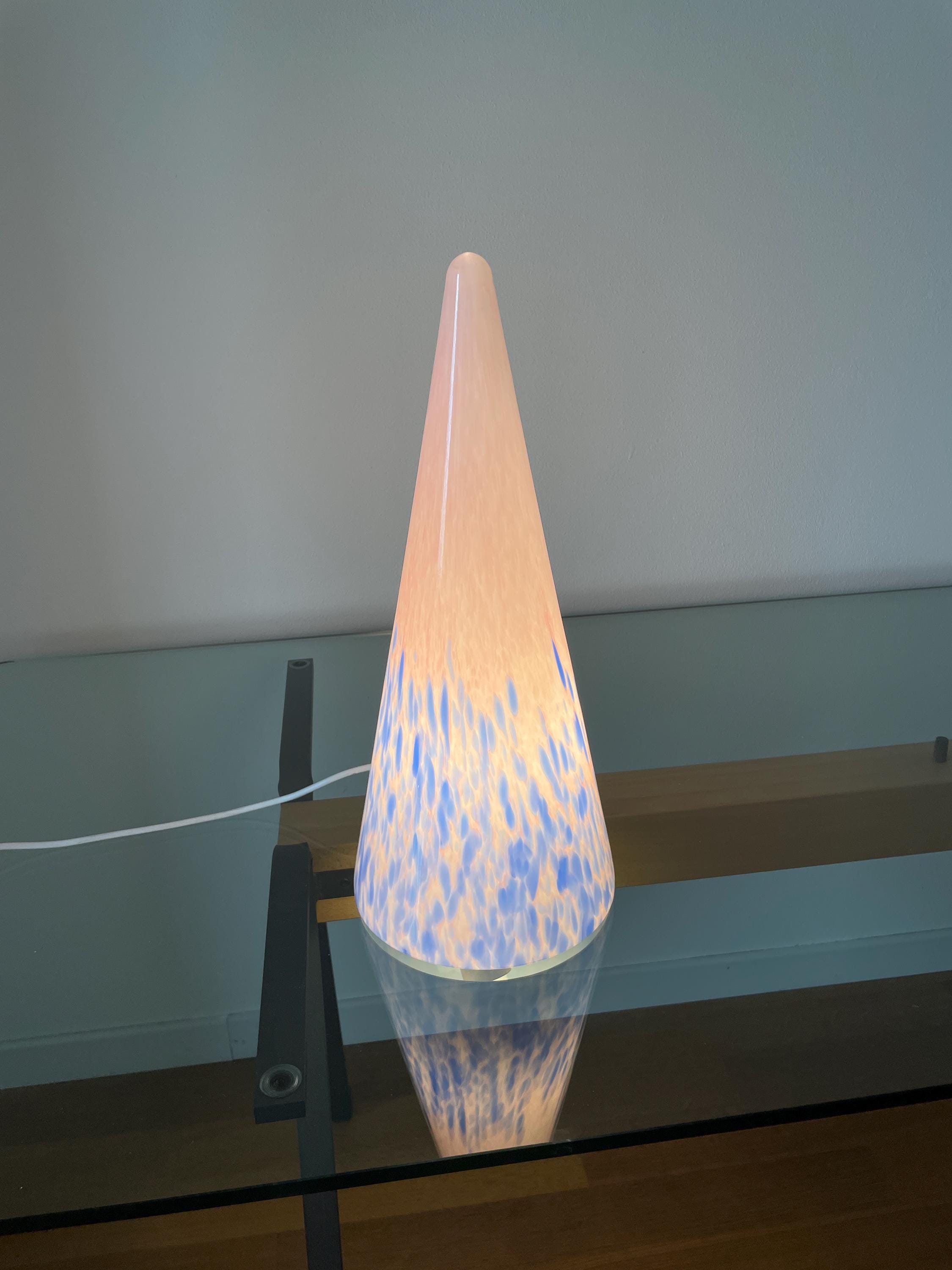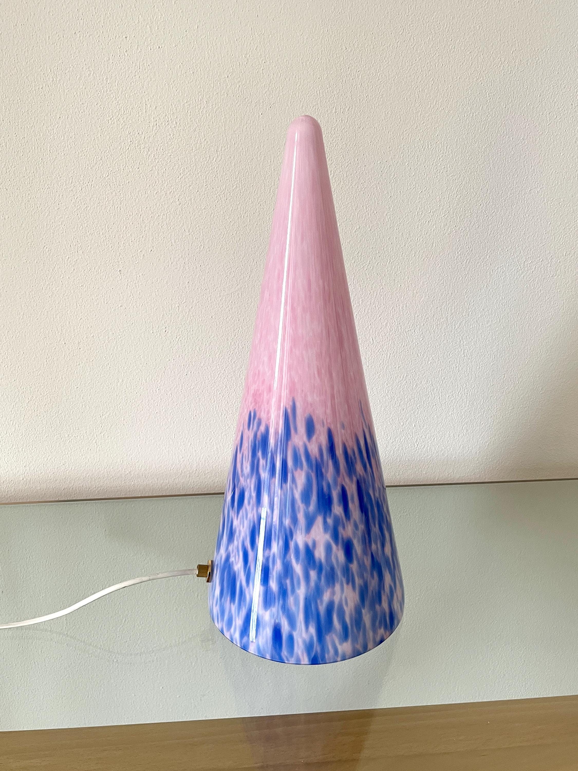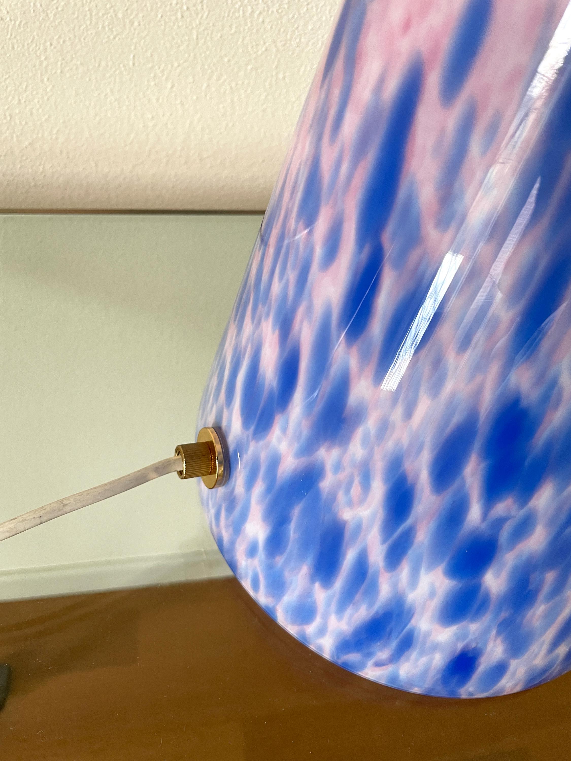 FATA Murano lamp is a precious and large table lamp, conical in shape with splendid Murano glass, expertly mouth-blown and hand-worked by the master glassmaker, mixing infinite pink and blue shades on a base of layered milk glass.