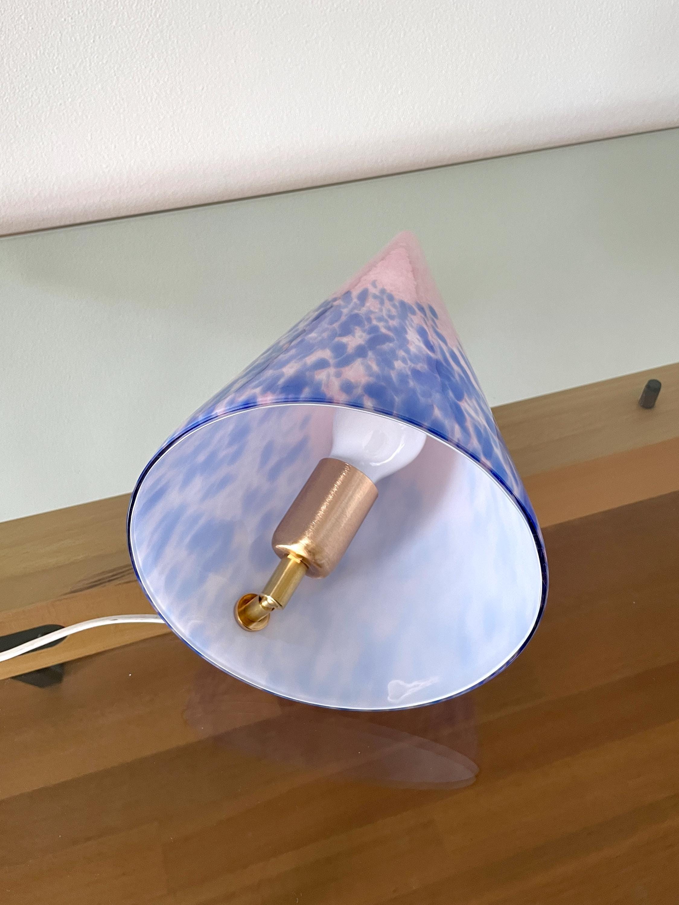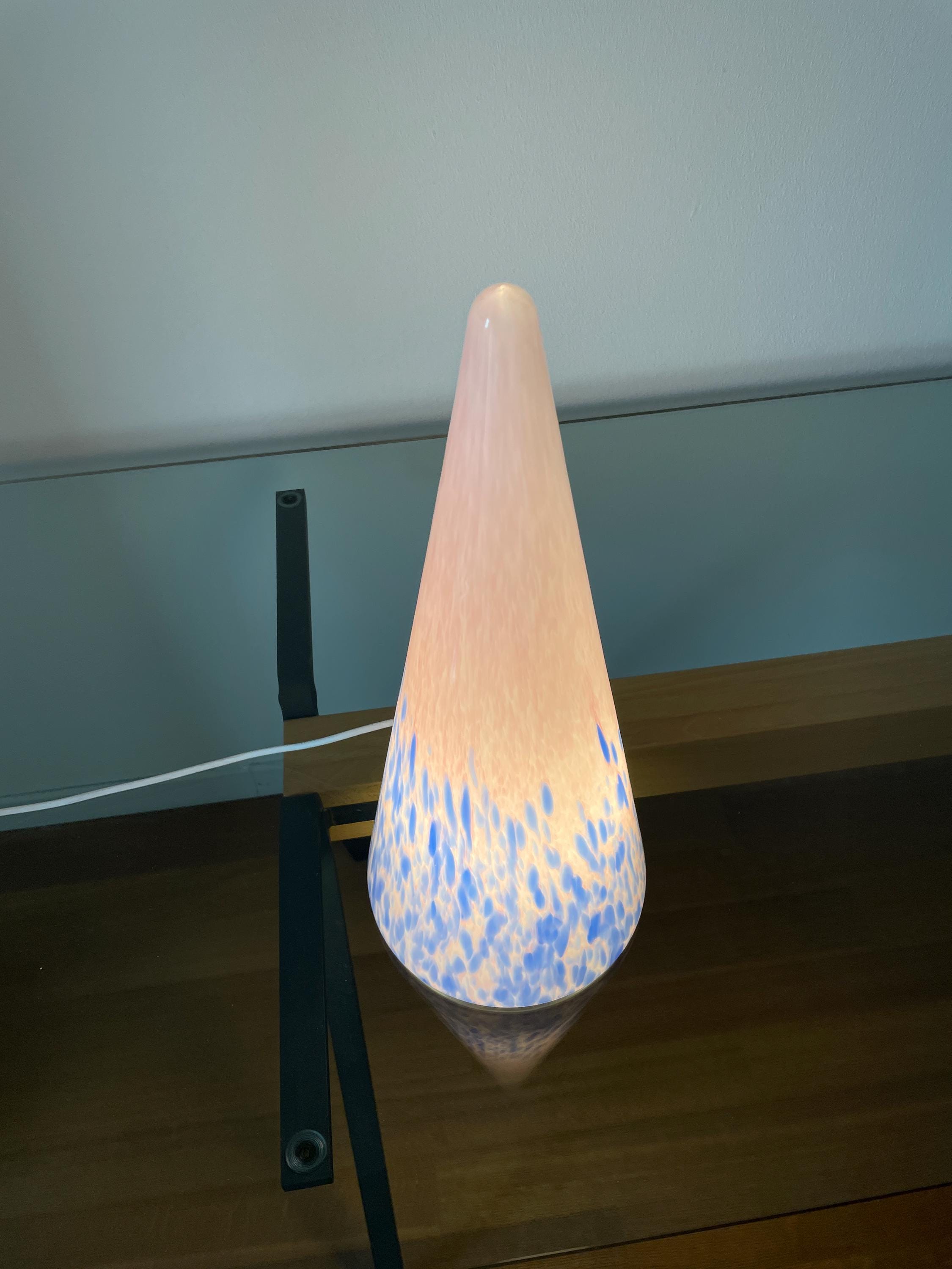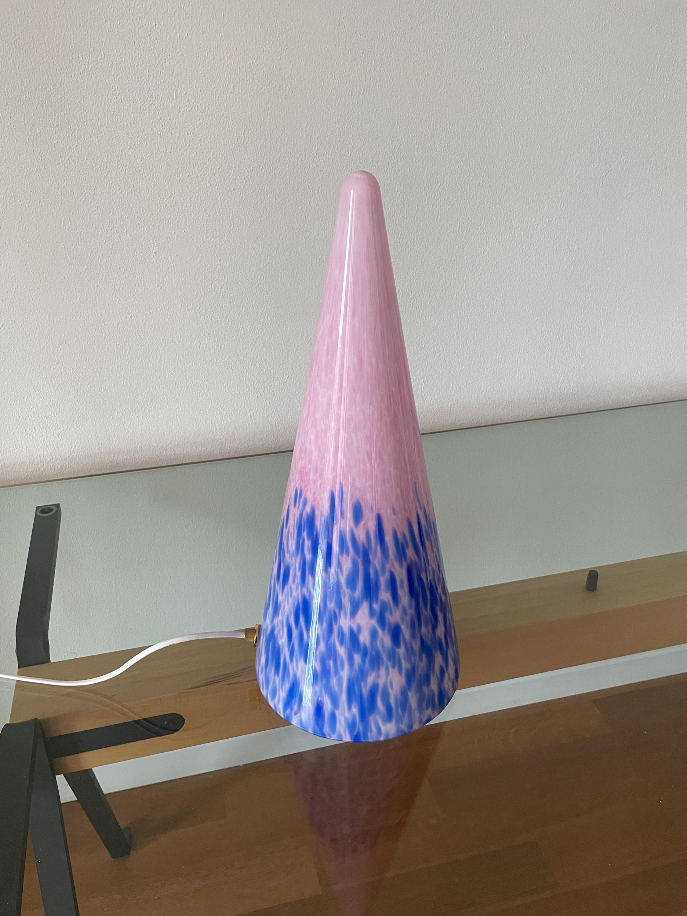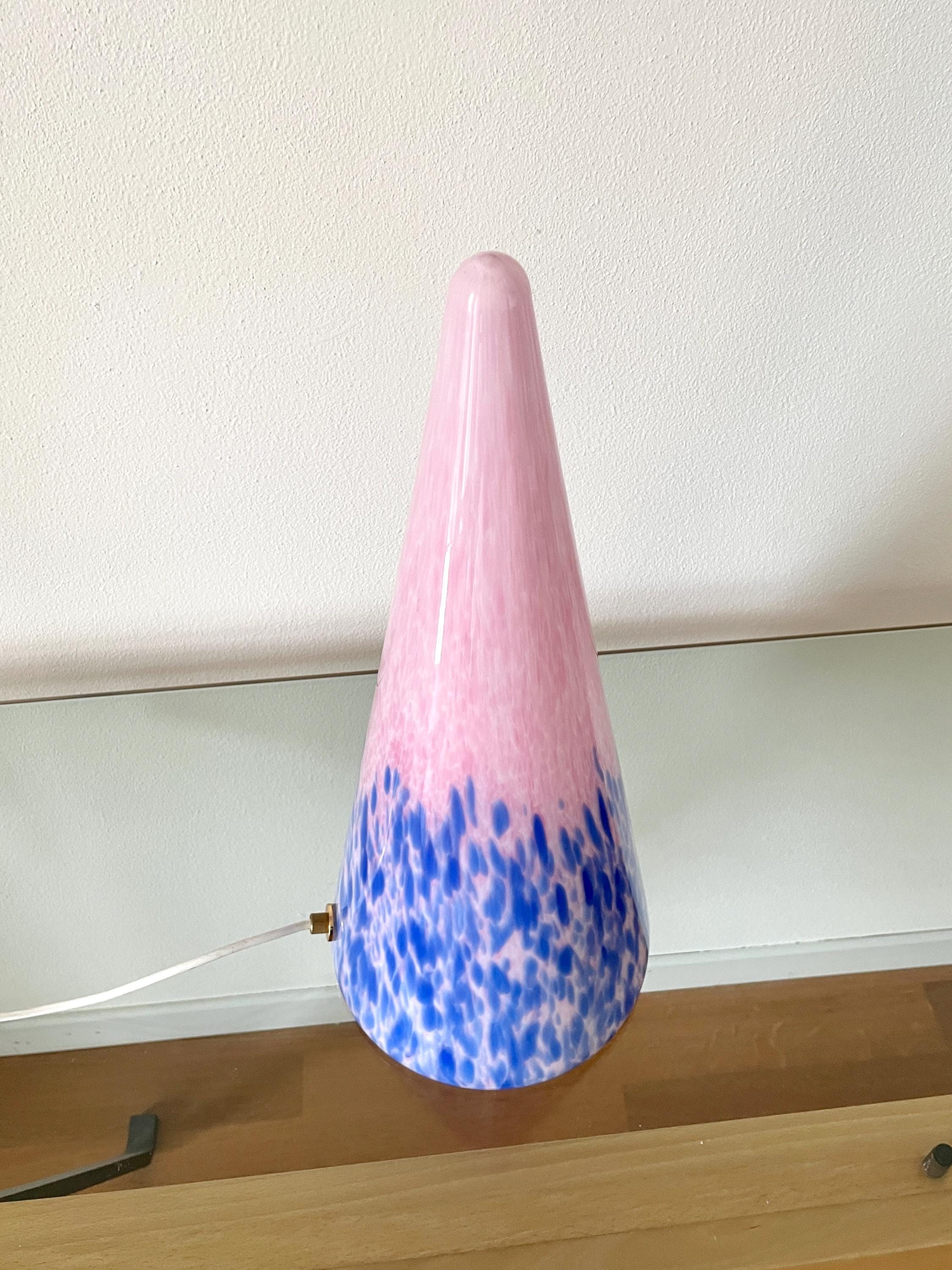 FATA Murano lamp is a precious and large table lamp, conical in shape with splendid Murano glass, expertly mouth-blown and hand-worked by the master glassmaker, mixing infinite pink and blue shades on a base of layered milk glass.