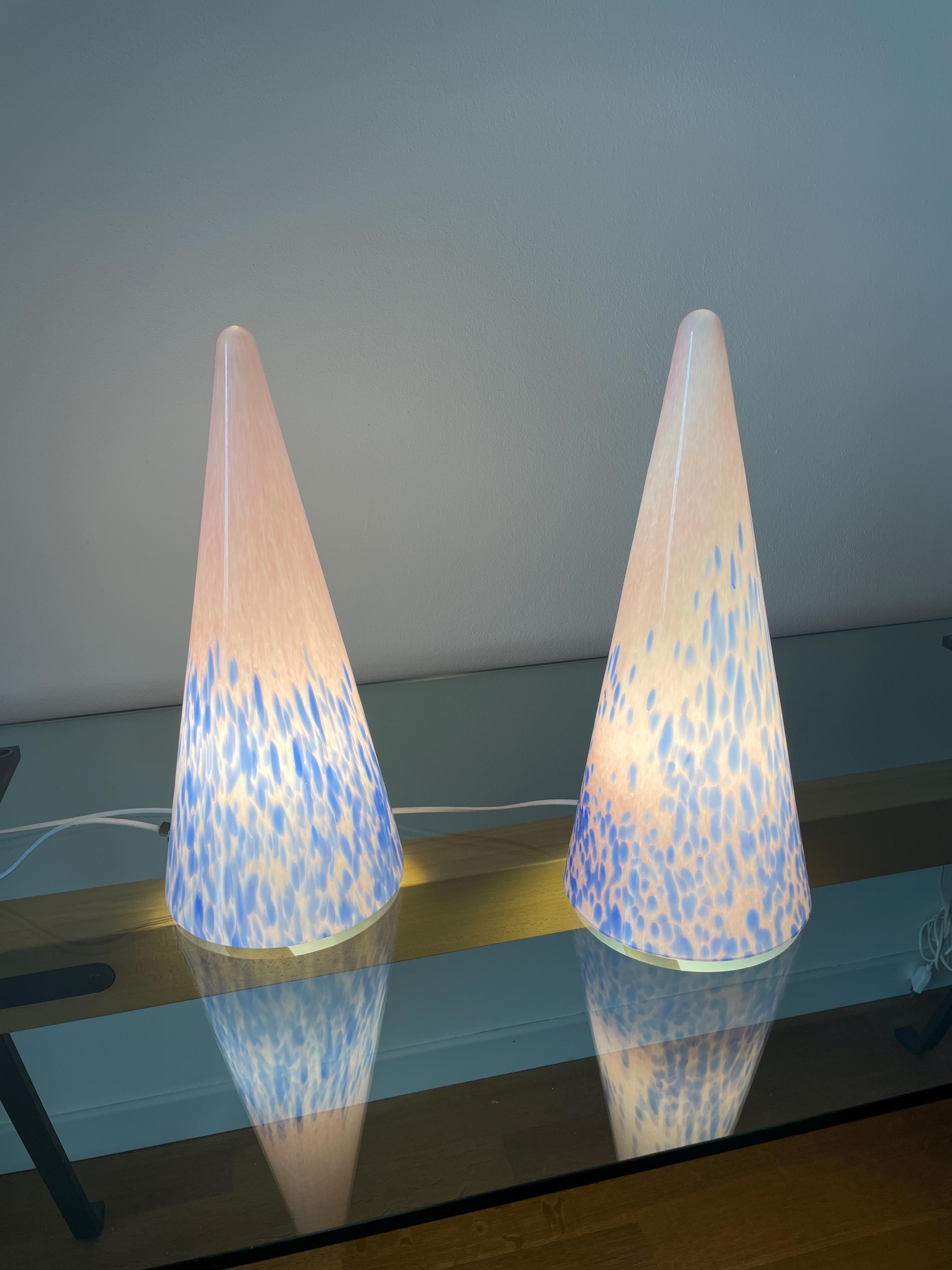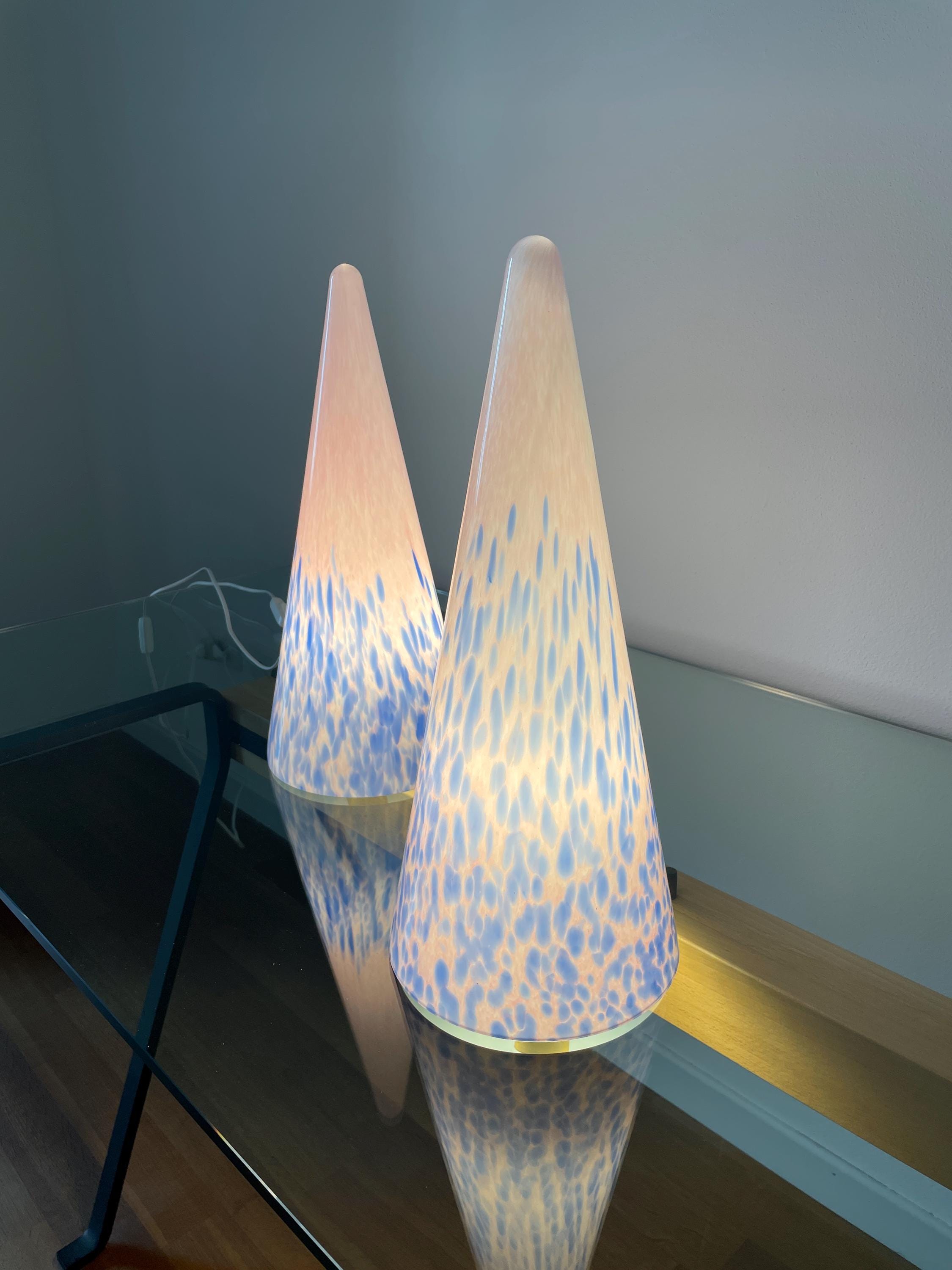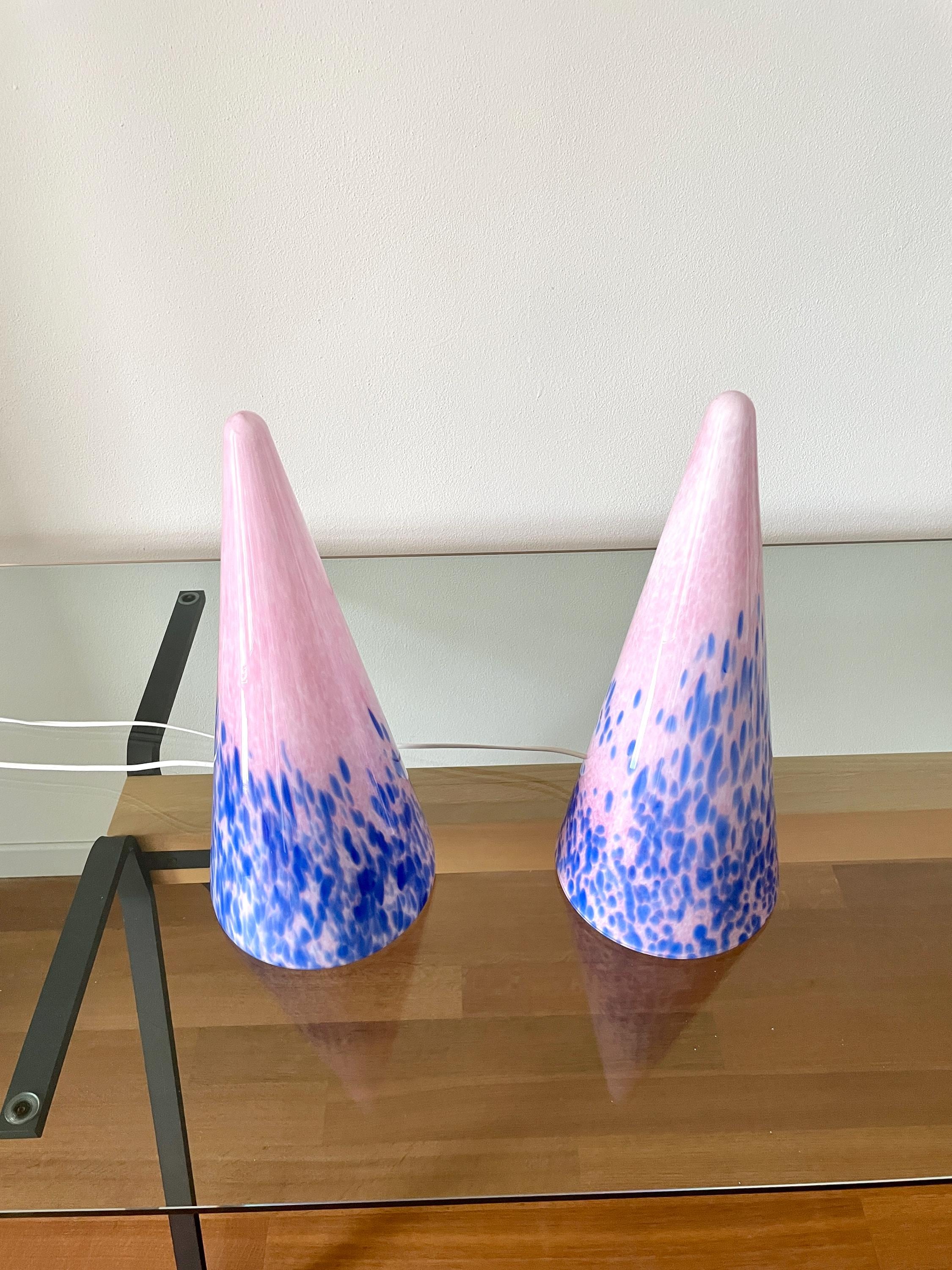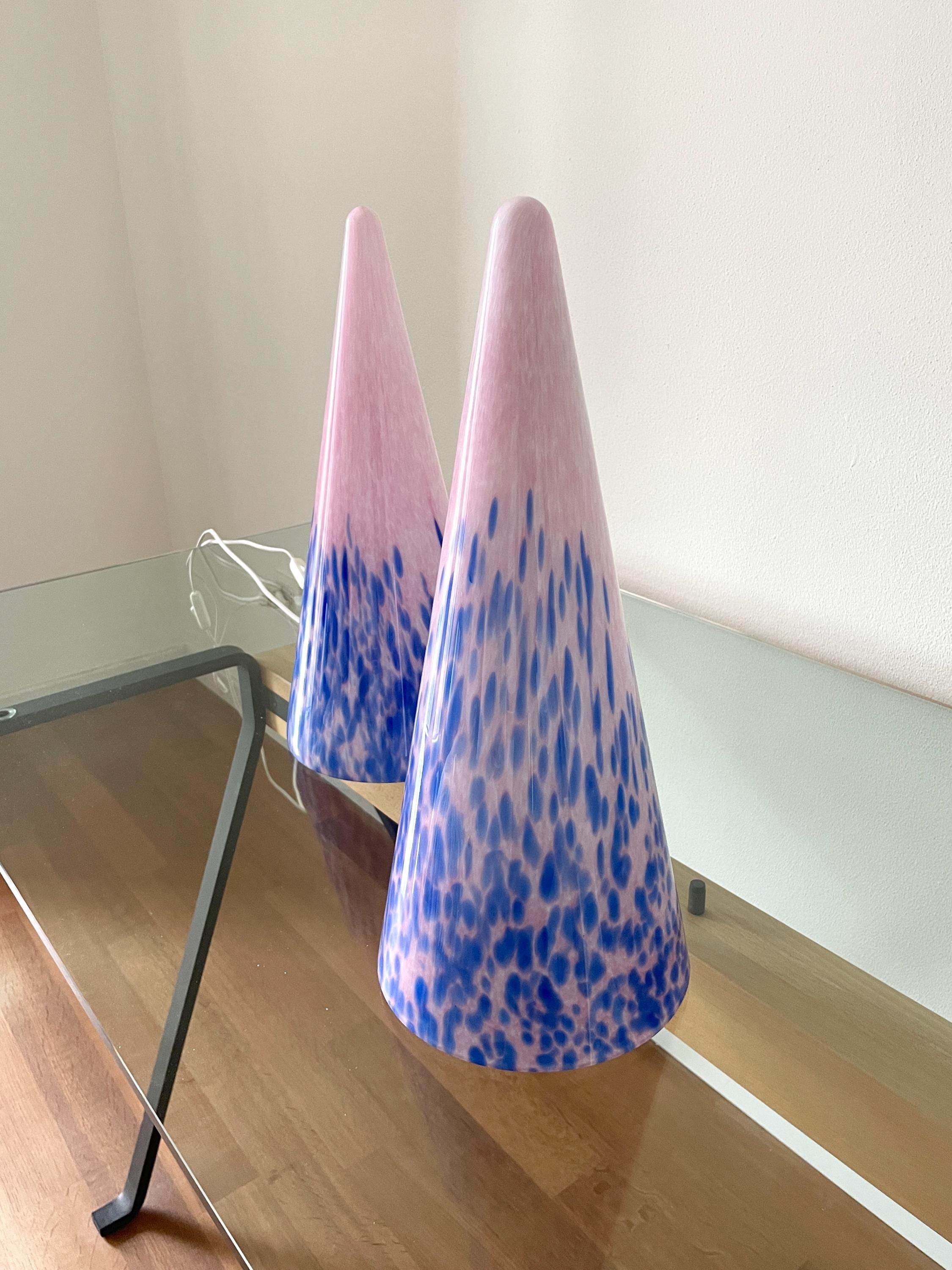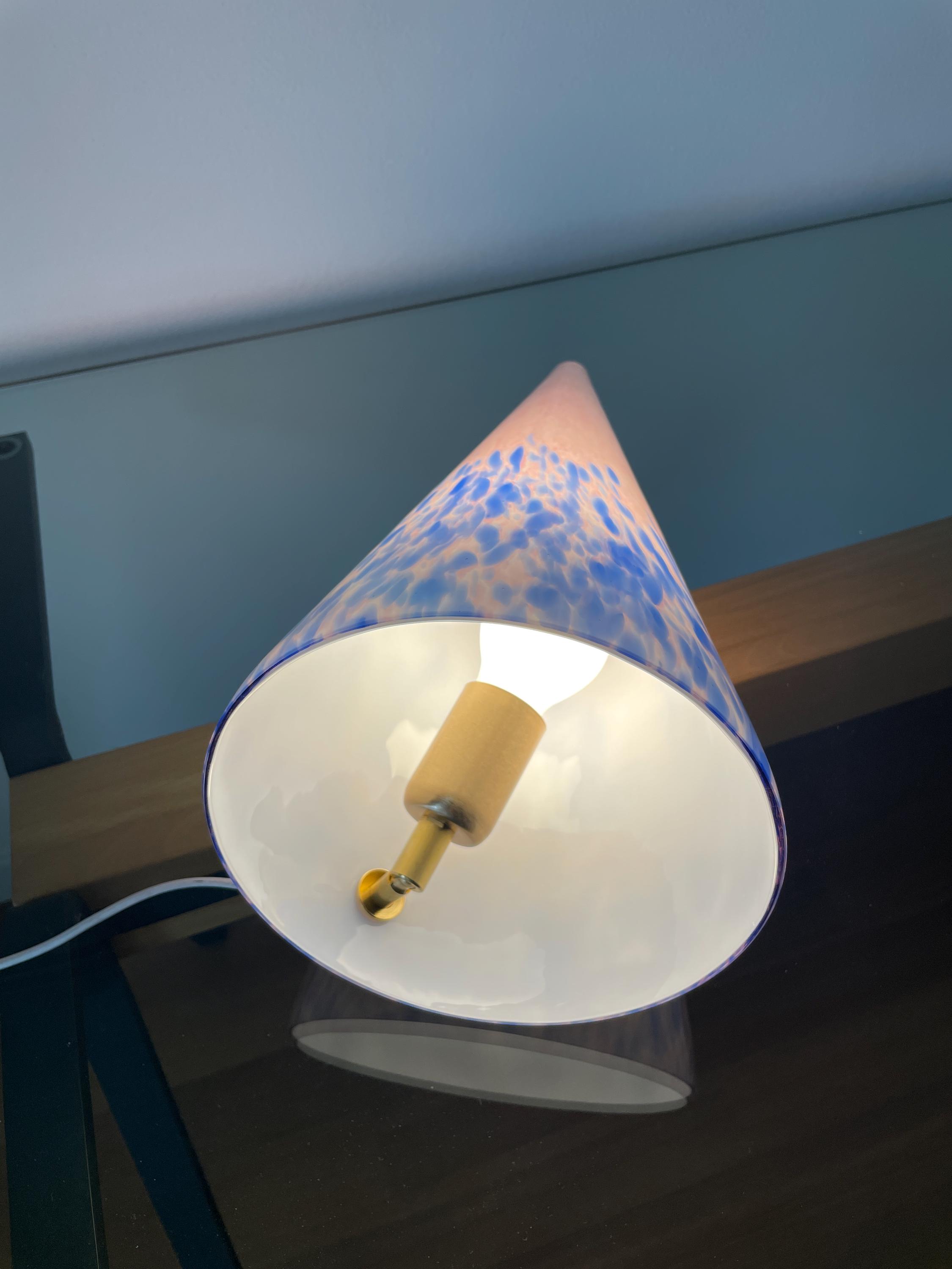 FATA Murano lamp is a precious and large table lamp, conical in shape with splendid Murano glass, expertly mouth-blown and hand-worked by the master glassmaker, mixing infinite pink and blue shades on a base of layered milk glass.