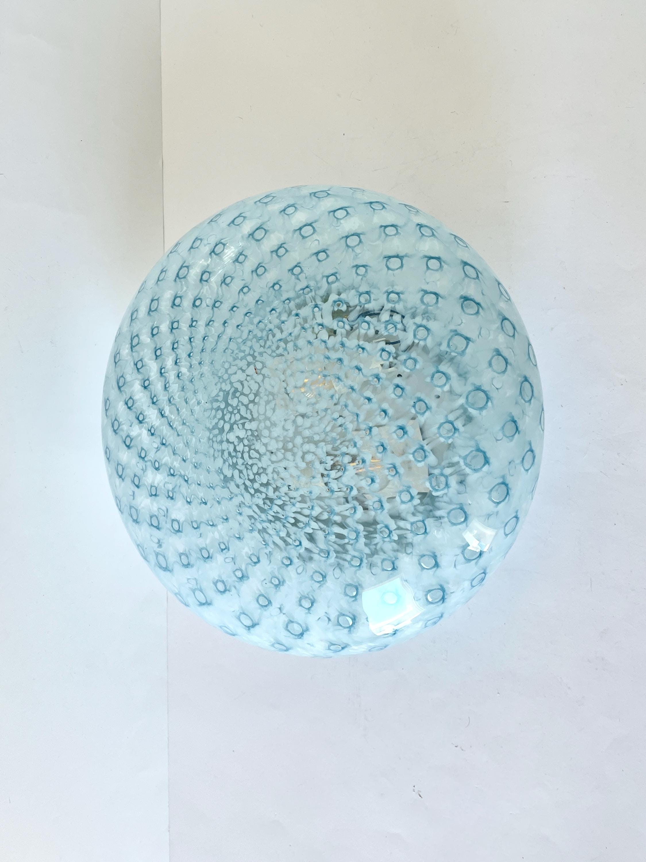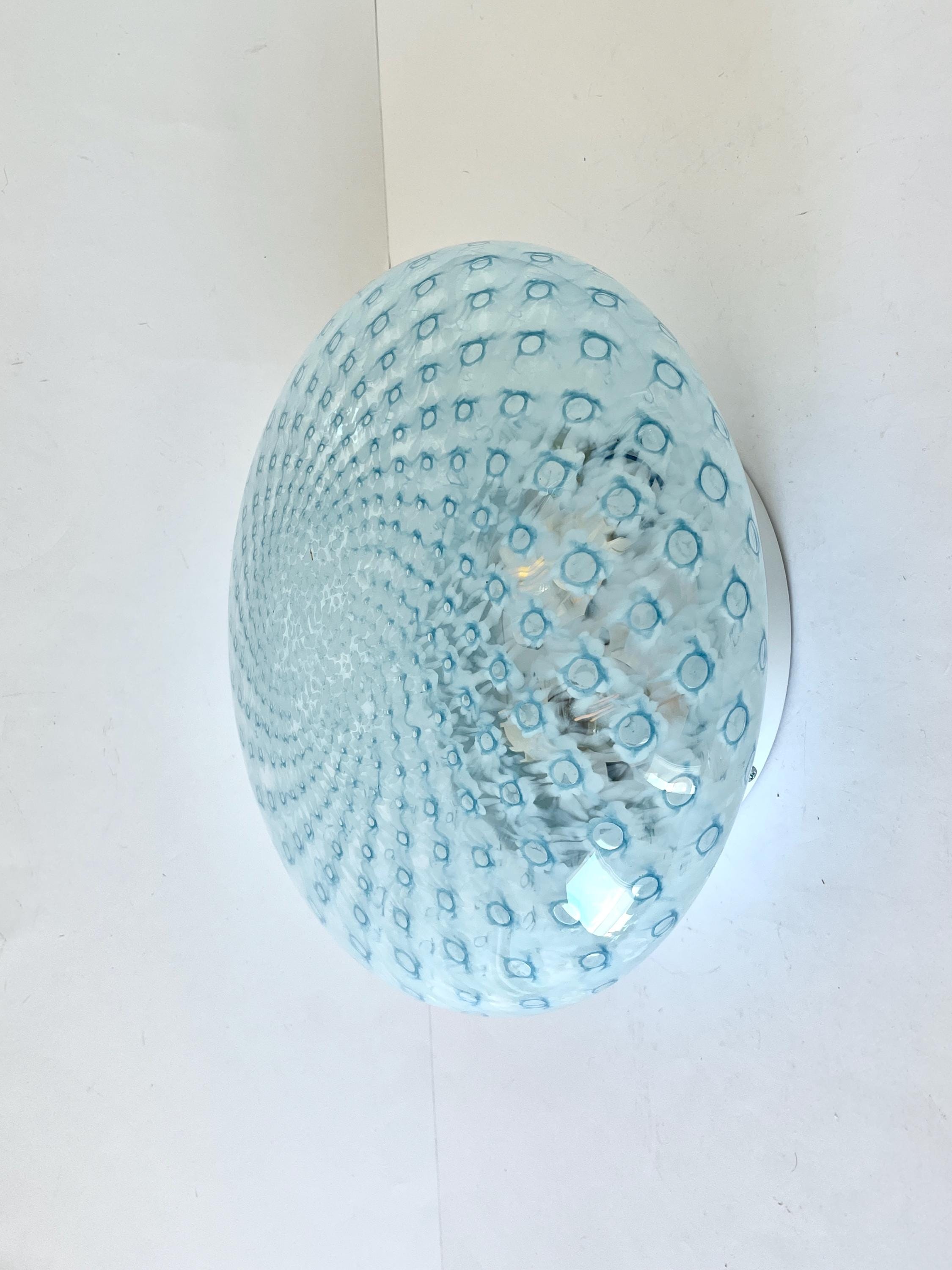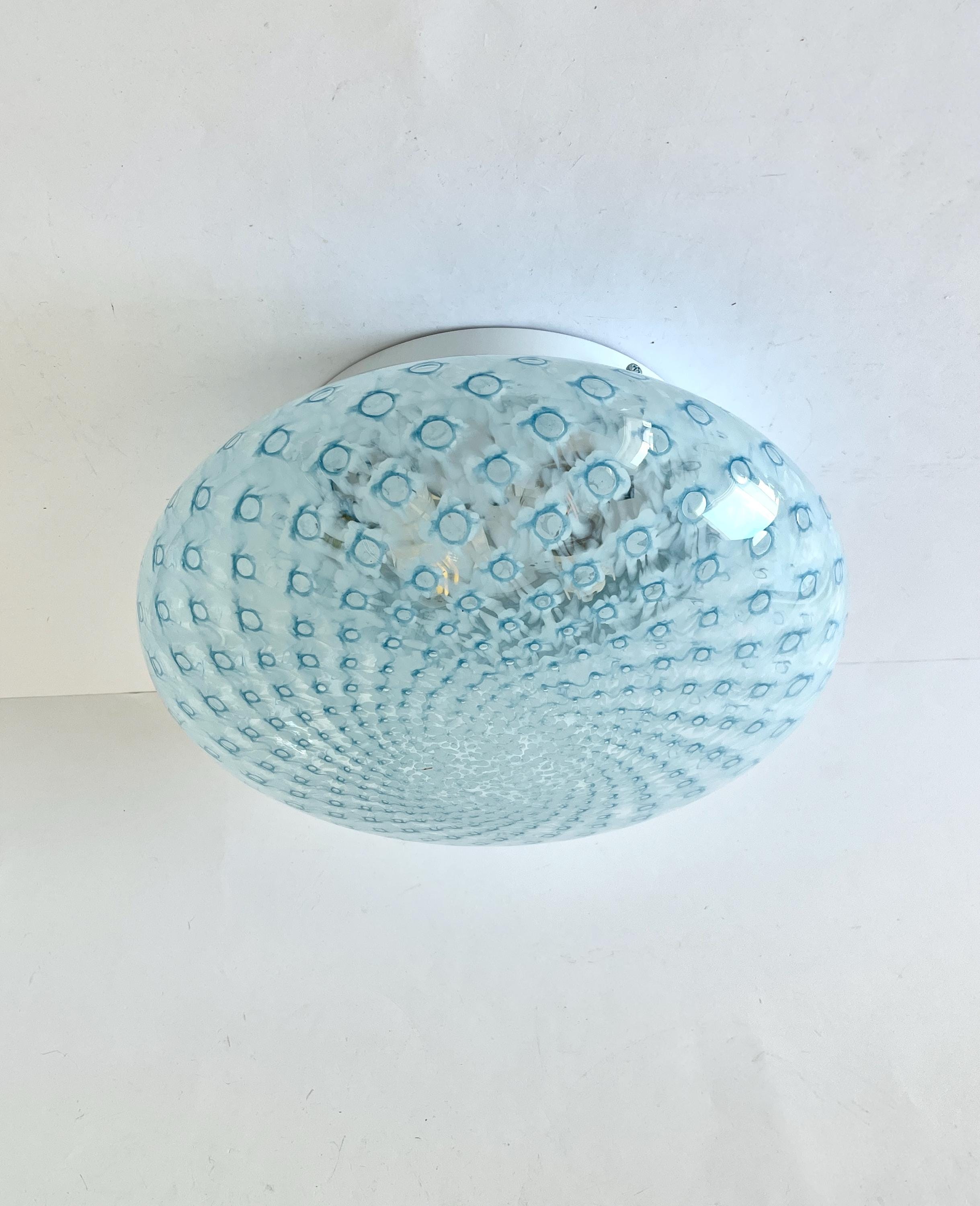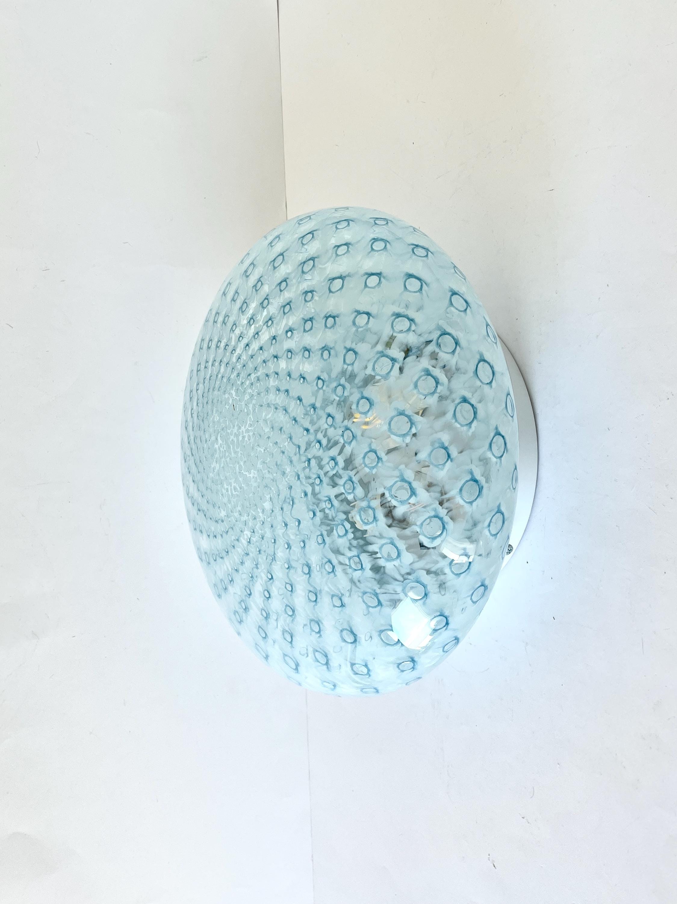 MACRAME' 35 by LA MURRINA is a splendid wall or ceiling lamp, vintage from the 90s, with beautiful Murano glass, mouth-blown and hand-crafted by master glassmakers of Murano, in the peacock polka dot technique, in light blue.