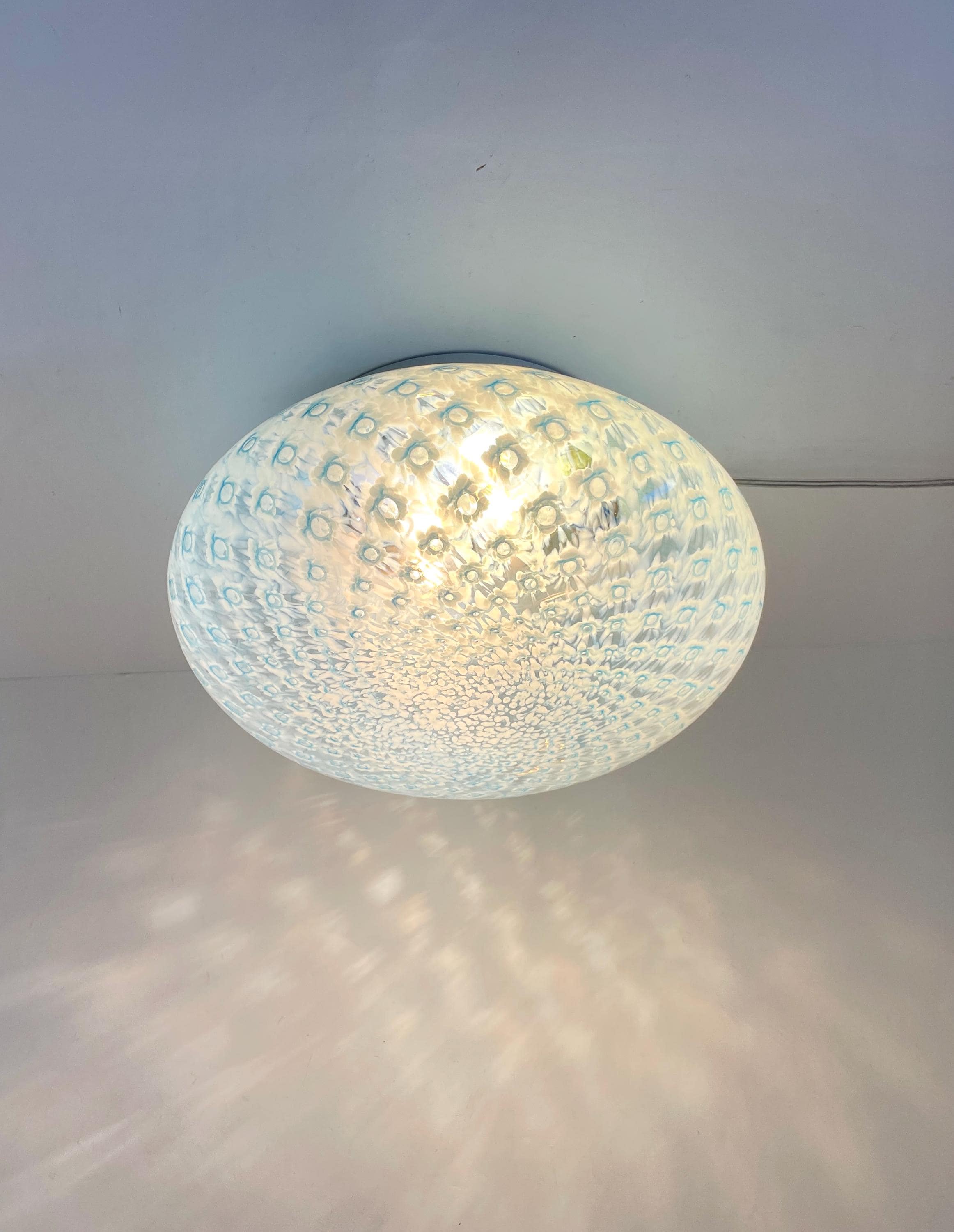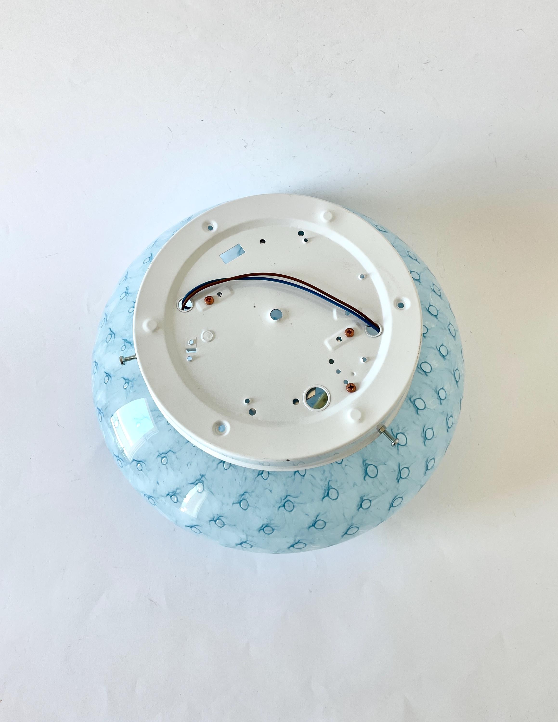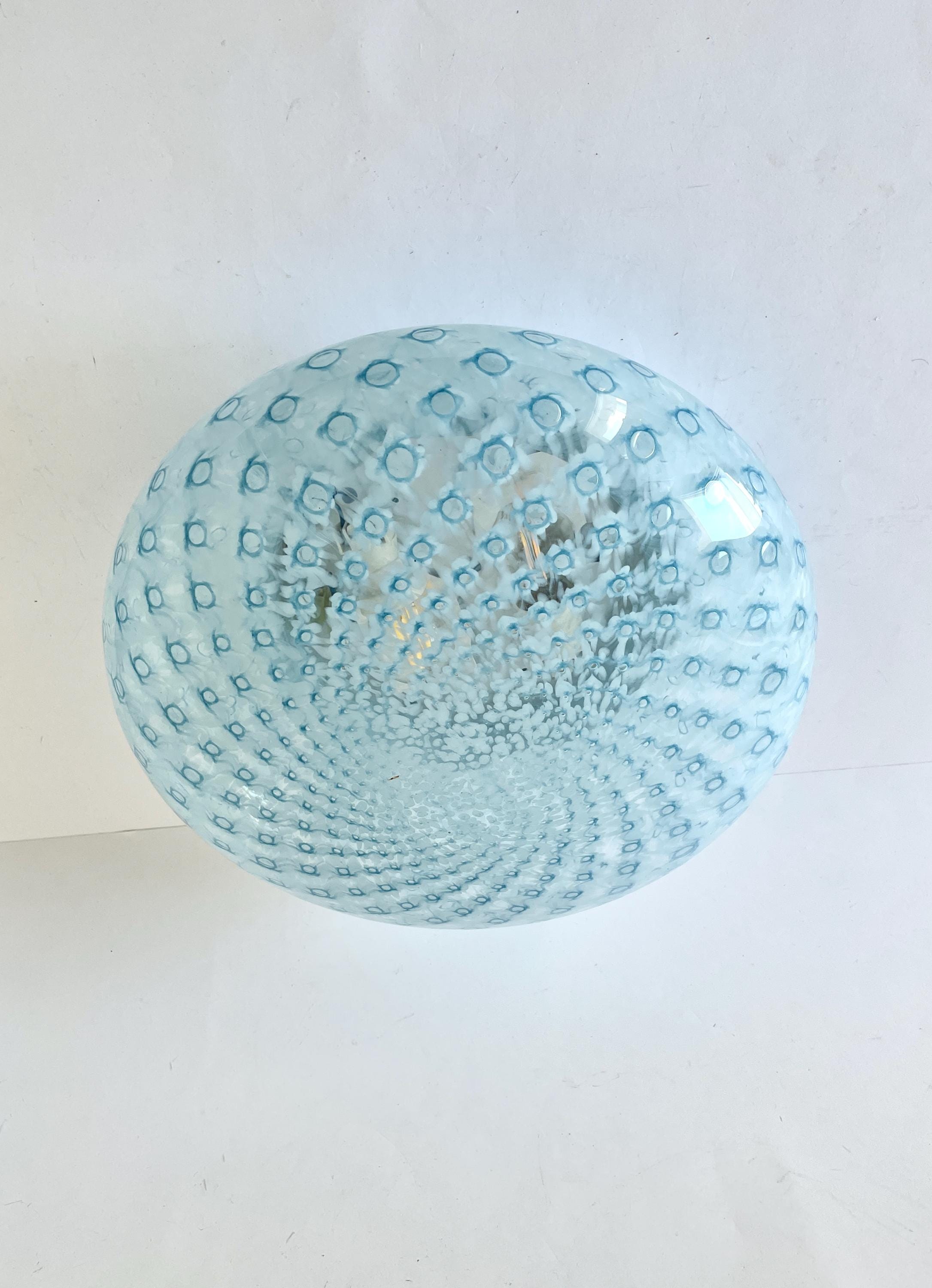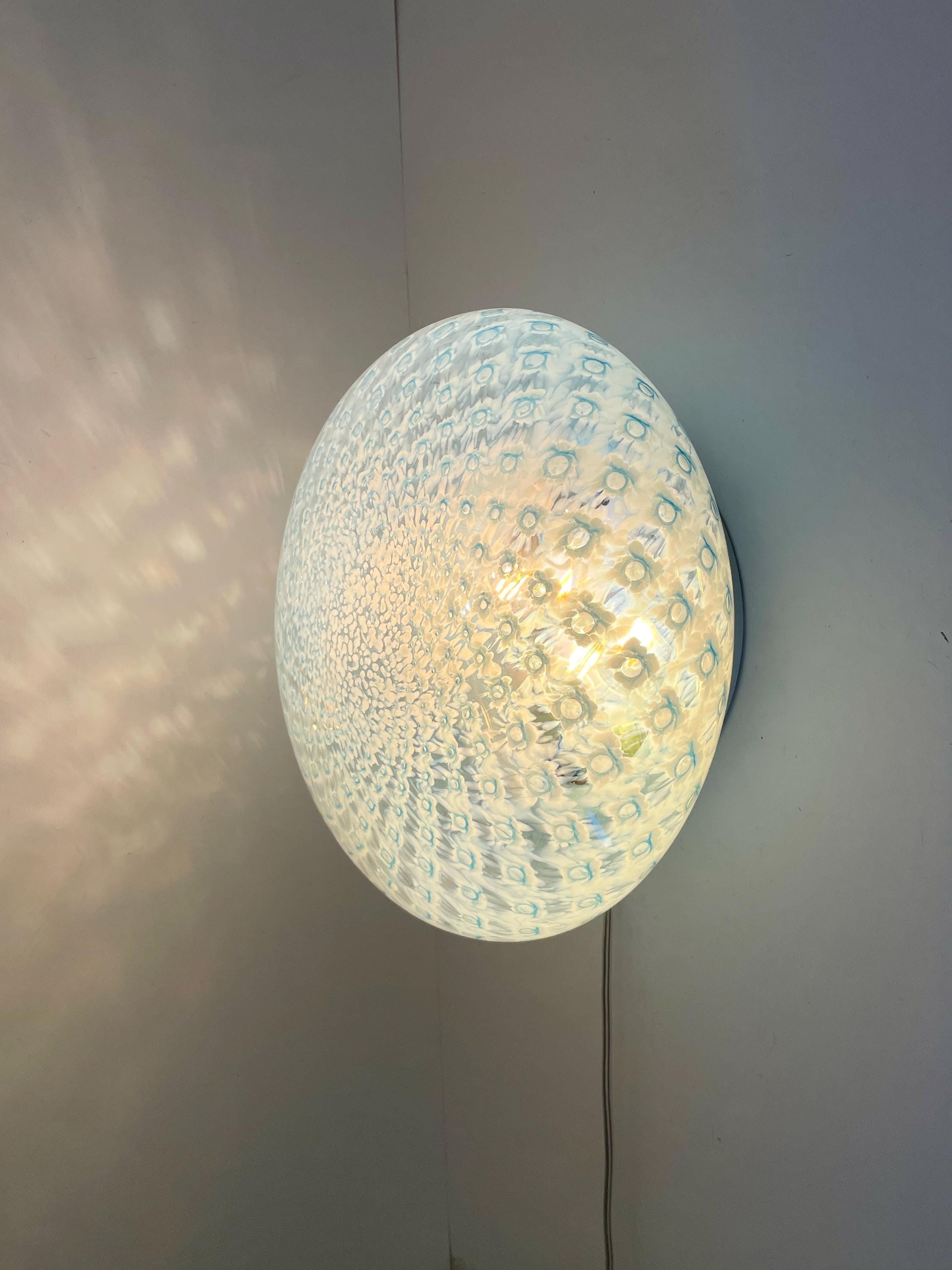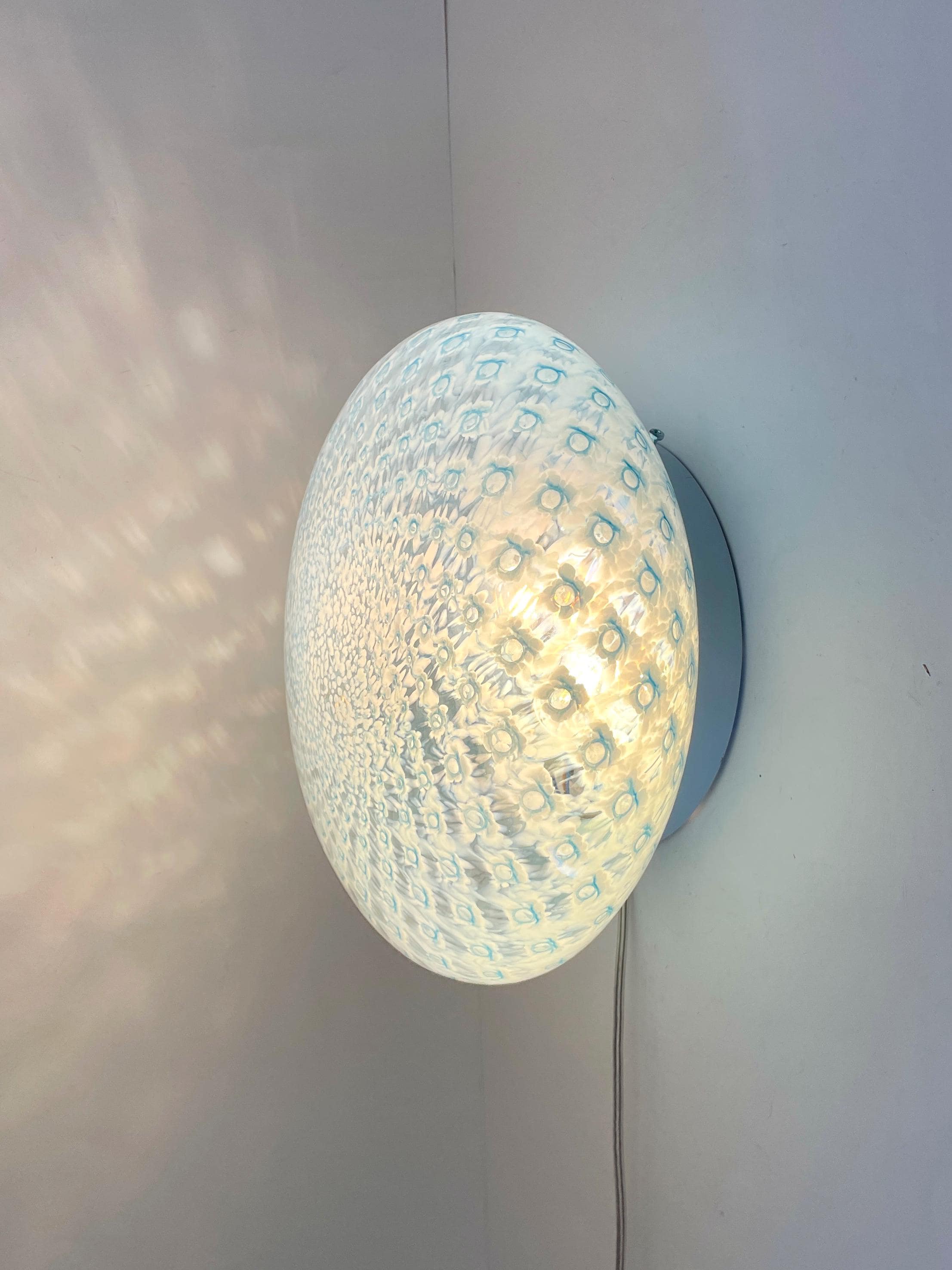 MACRAME' 35 by LA MURRINA is a splendid wall or ceiling lamp, vintage from the 90s, with beautiful Murano glass, mouth-blown and hand-crafted by master glassmakers of Murano, in the peacock polka dot technique, in light blue.